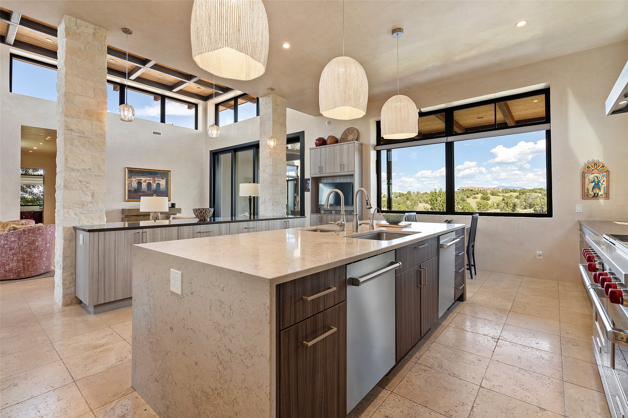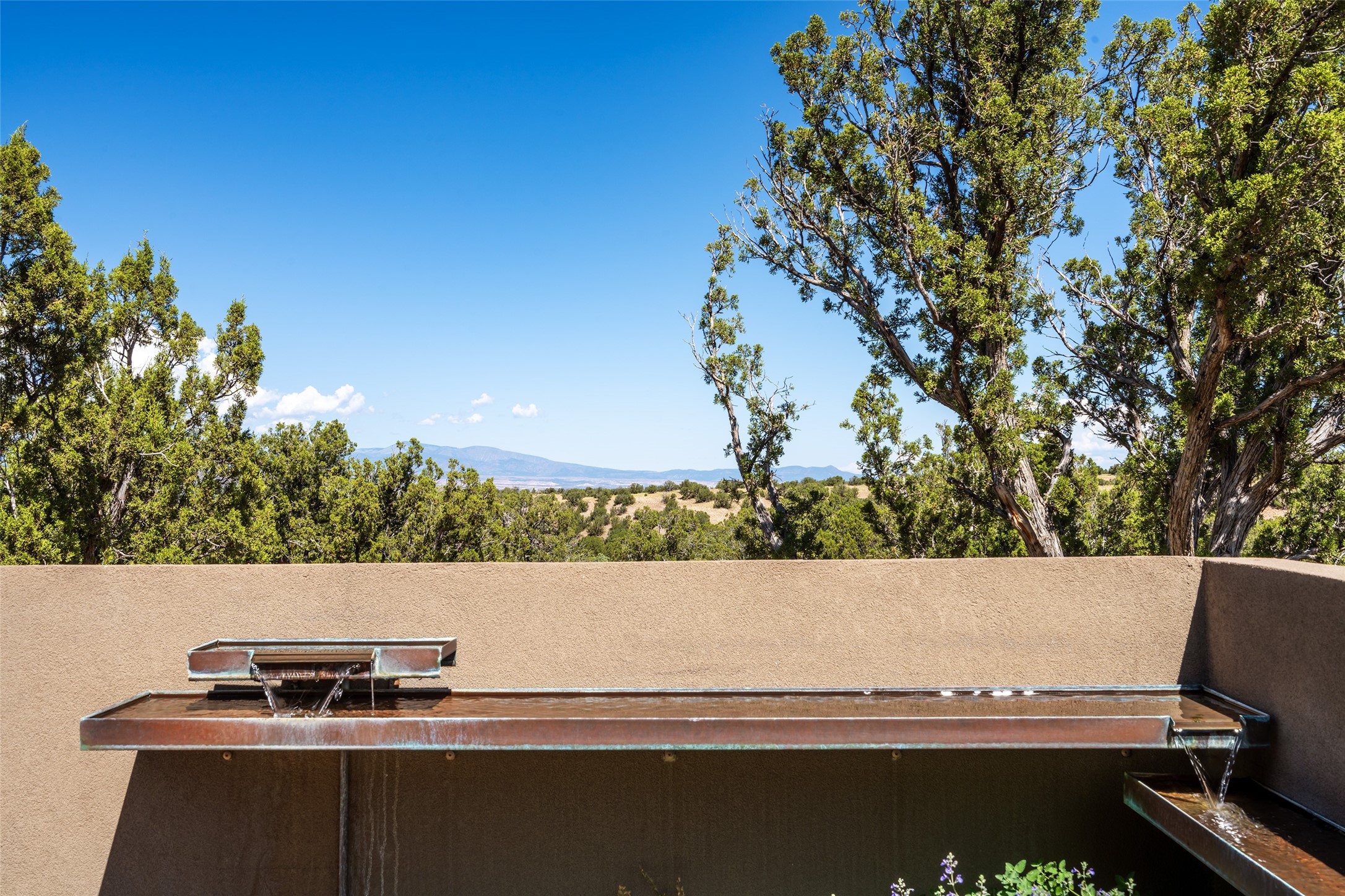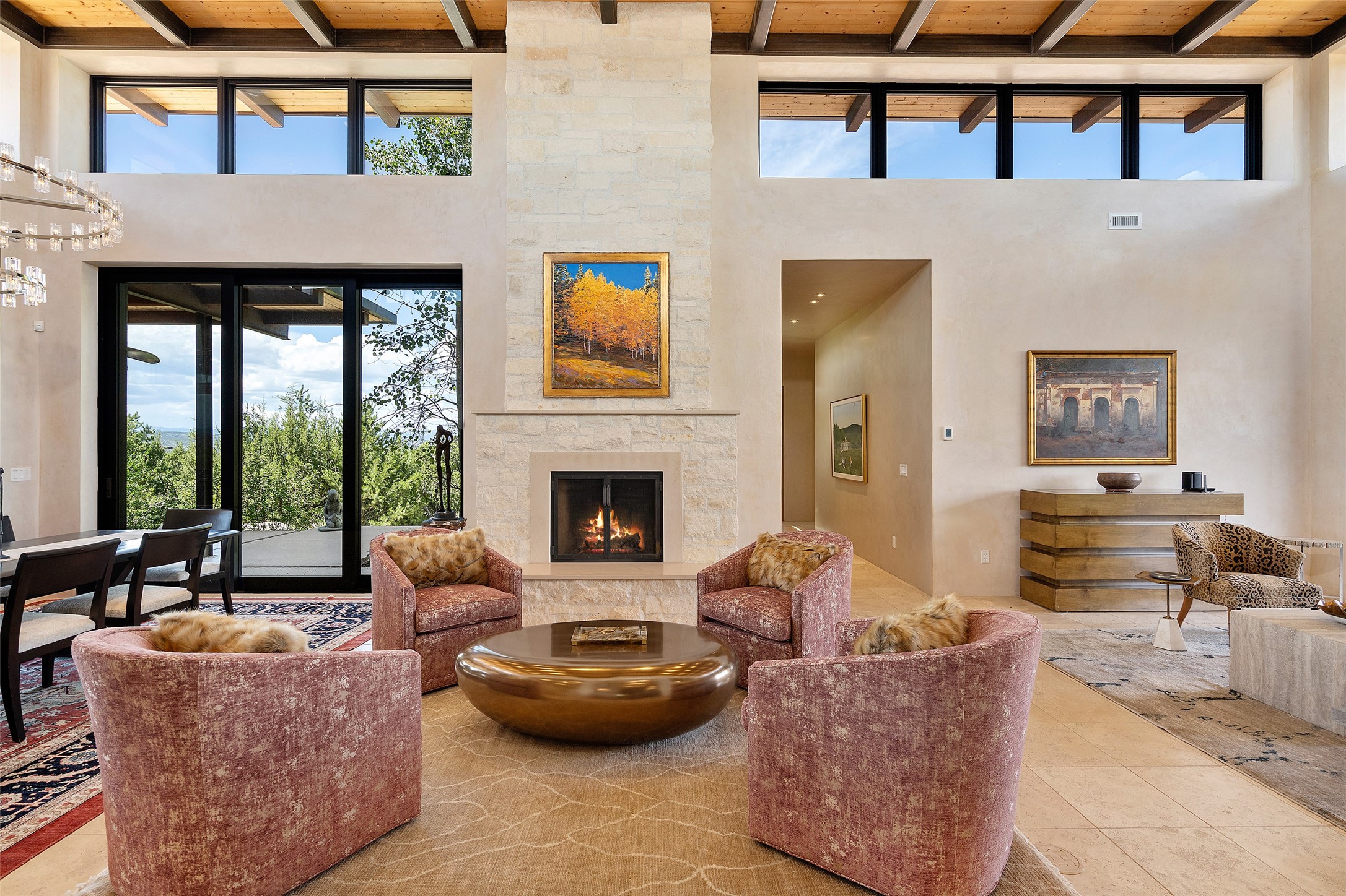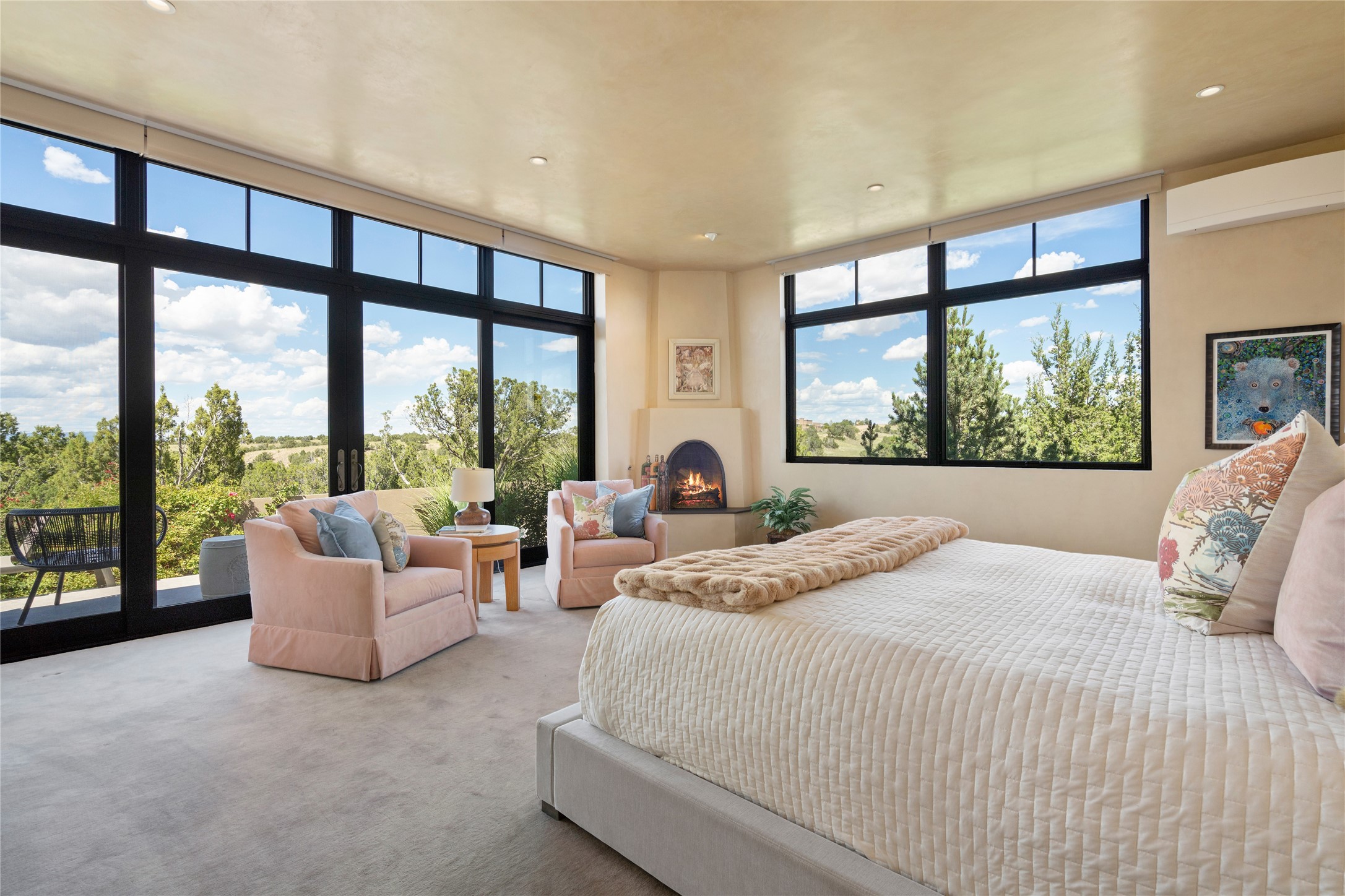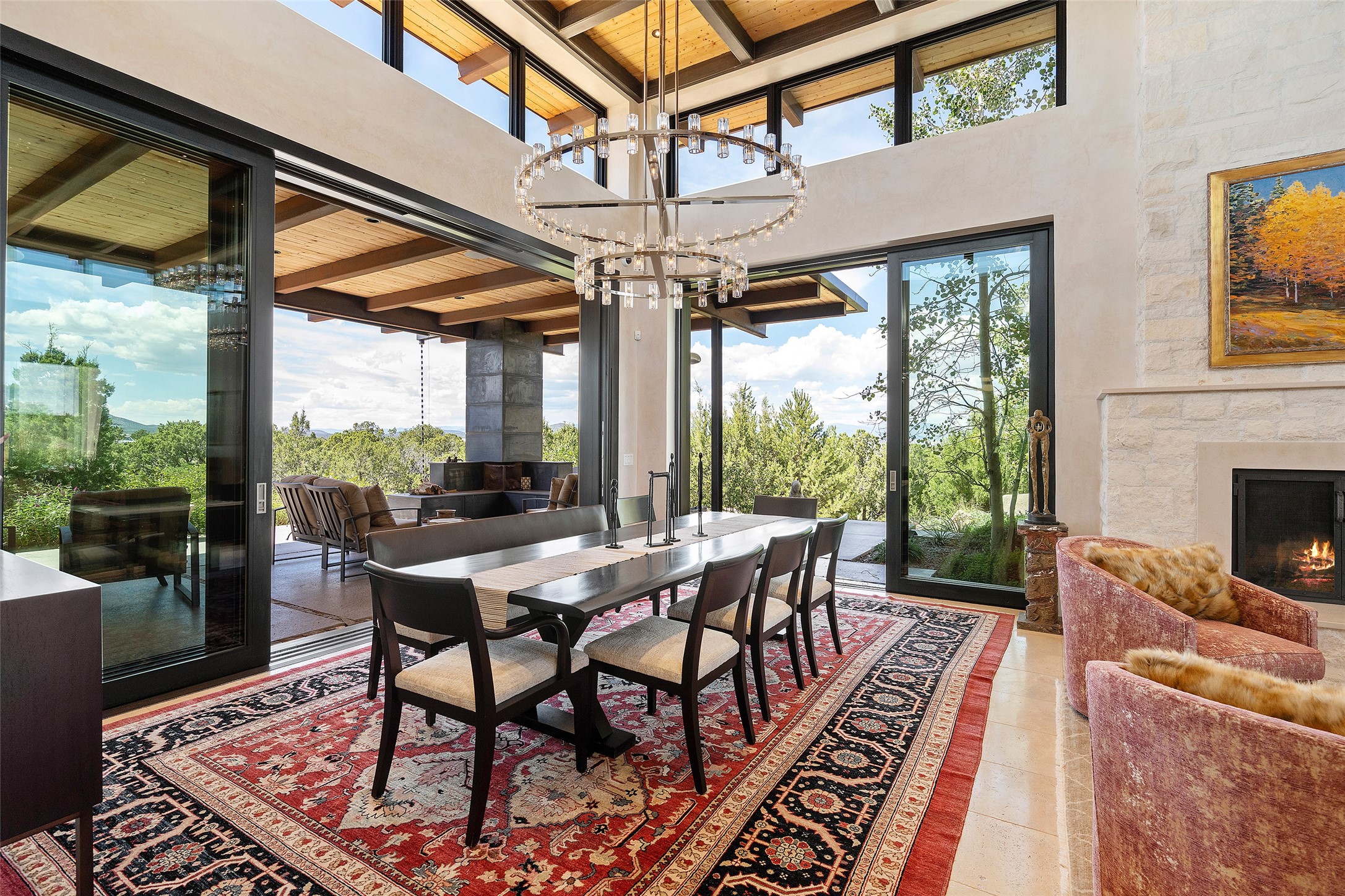 CONTEMPORARY MASTERPIECE IN LAS CAMPANAS WITH UNPARALLELED VIEWS TO BOTH MOUNTAIN RANGES. Bordering Bureau of Land Management Land, this exceptional property offers sweeping Eastern and Western Mountain vistas with uncompromised privacy. The 3,947 sqft main home has plenty of natural light, towering wood and steel ceilings and clerestory windows - designed by noted architect Lorn Tryk and executed by Prull Custom Builders - featuring 1 bedroom, 2 offices, a media room, and gallery-like spaces enhanced by travertine floors, warm stacked-stone masonry walls, custom ironwork, and motorized shades. The Owner's suite looks to the landscape and is a haven of tranquility. A detached guest house provides 2 bedrooms, 2 bathrooms, and a kitchenette - perfect for extended stays of hosting in style. Smart-home systems, a whole-home natural gas generator, and a 3-car garage with an oversized truck bay ensure convenience and peace of mind. Designed for modern living, the chef's kitchen includes Wolf and Sub-Zero appliances, dual dishwashers & ovens, steam oven, large wine fridge, pantry, and striking Spanish woven-metal light fixtures. Outdoor living is extraordinary with patios accessible from nearly every room, 3 fountains, hot tub with outdoor shower, and a custom Agave mural by artist Pam Platt. Four fireplaces add warmth and ambience indoors and out. Phenomenal cross-lighting, gorgeous driveway approach, and refined details throughout complete this contemporary retreat in one of Santa Fe's most prestigious communities.