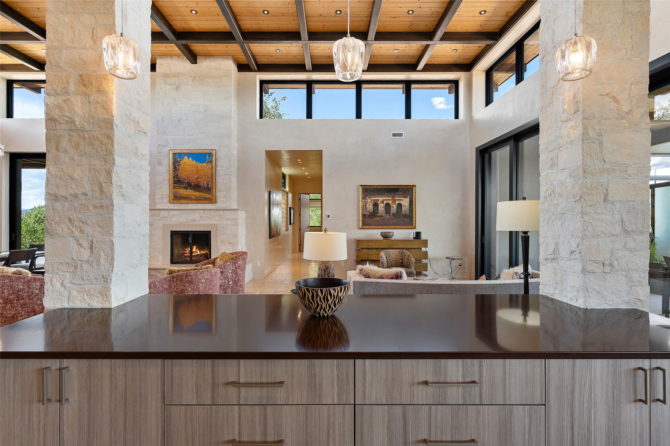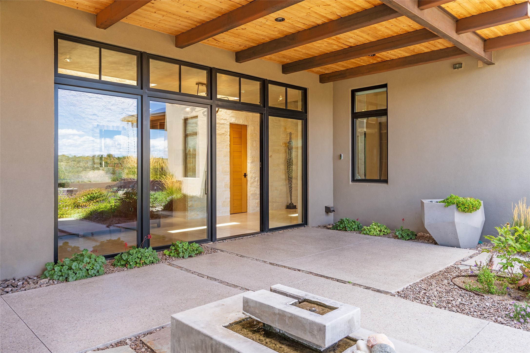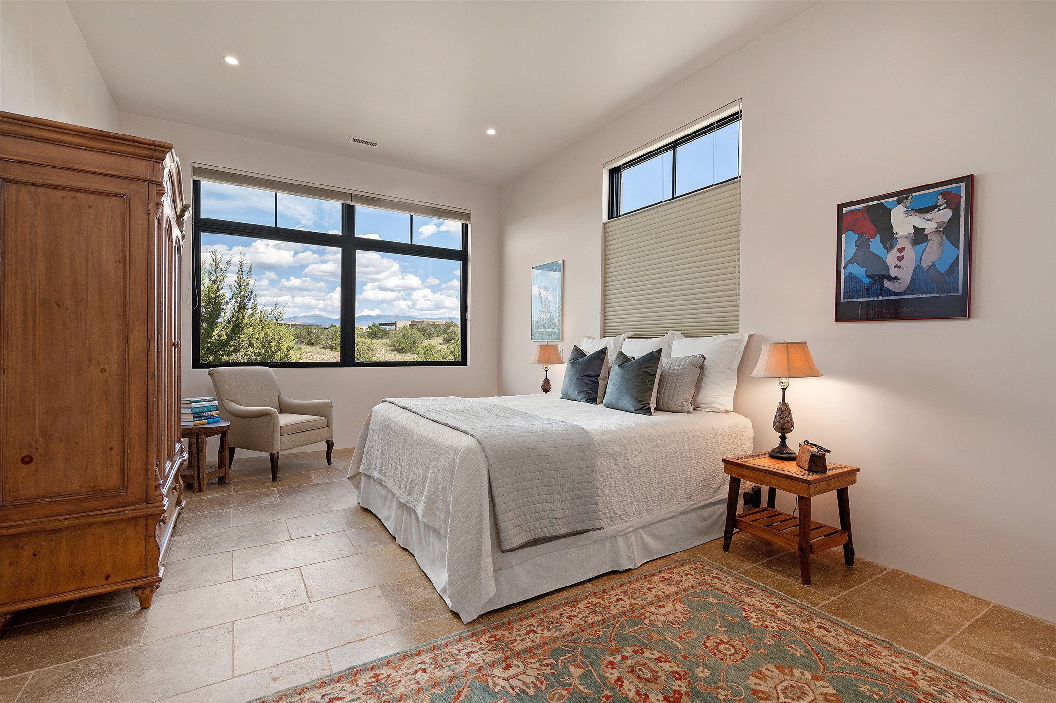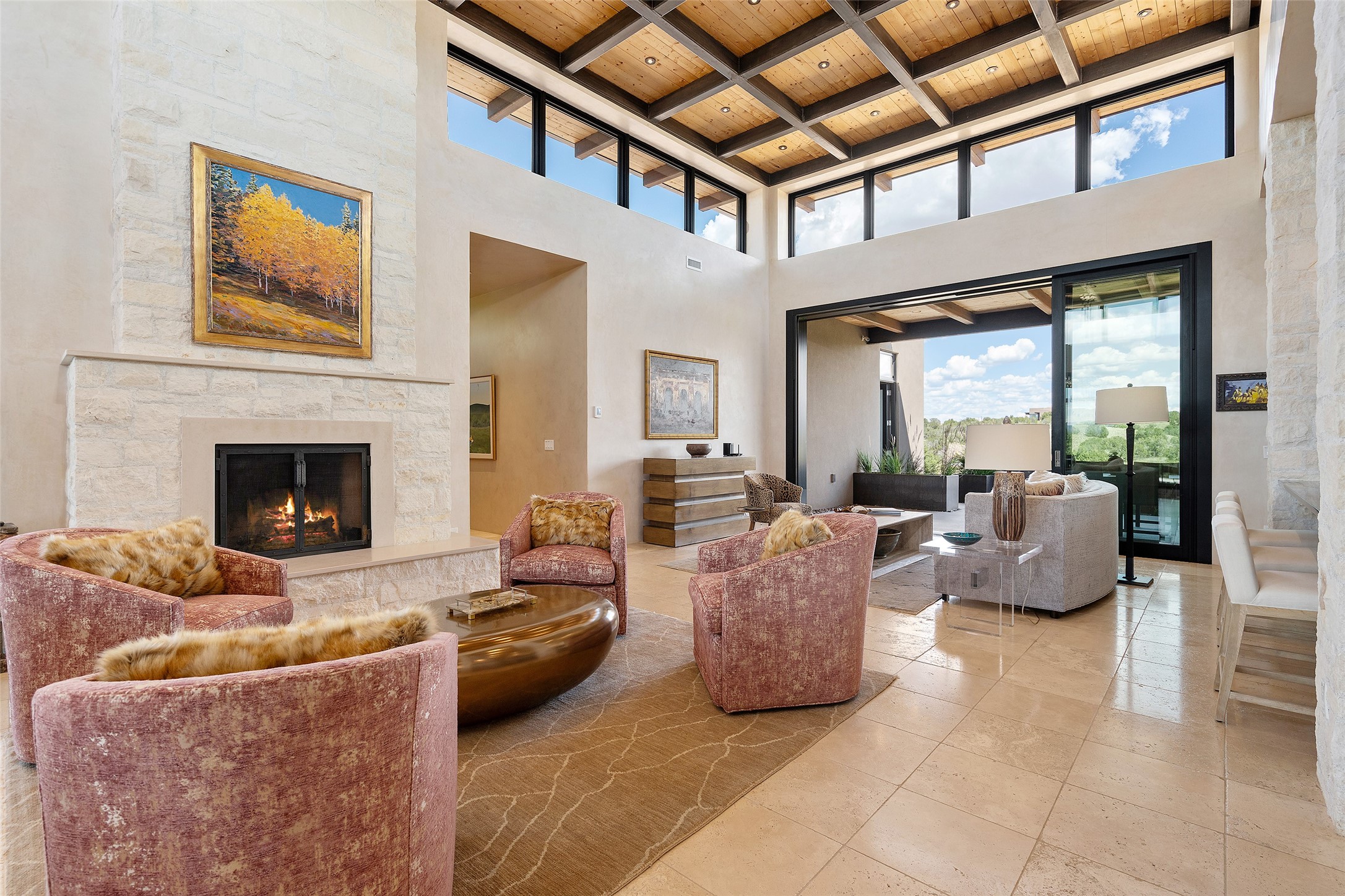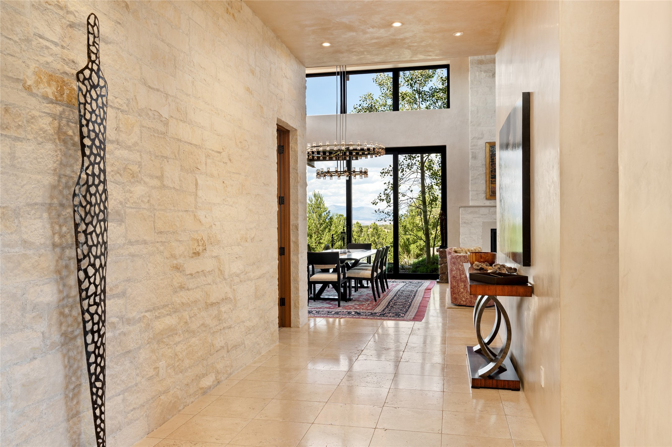 CONTEMPORARY MASTERPIECE IN LAS CAMPANAS WITH UNPARALLELED VIEWS TO BOTH MOUNTAIN RANGES. Bordering Bureau of Land Management Land, this exceptional property offers sweeping Eastern and Western Mountain vistas with uncompromised privacy. The 3,947 sqft main home has plenty of natural light, towering wood and steel ceilings and clerestory windows - designed by noted architect Lorn Tryk and executed by Prull Custom Builders - featuring 1 bedroom, 2 offices, a media room, and gallery-like spaces enhanced by travertine floors, warm stacked-stone masonry walls, custom ironwork, and motorized shades. The Owner's suite looks to the landscape and is a haven of tranquility. A detached guest house provides 2 bedrooms, 2 bathrooms, and a kitchenette - perfect for extended stays of hosting in style. Smart-home systems, a whole-home natural gas generator, and a 3-car garage with an oversized truck bay ensure convenience and peace of mind. Designed for modern living, the chef's kitchen includes Wolf and Sub-Zero appliances, dual dishwashers & ovens, steam oven, large wine fridge, pantry, and striking Spanish woven-metal light fixtures. Outdoor living is extraordinary with patios accessible from nearly every room, 3 fountains, hot tub with outdoor shower, and a custom Agave mural by artist Pam Platt. Four fireplaces add warmth and ambience indoors and out. Phenomenal cross-lighting, gorgeous driveway approach, and refined details throughout complete this contemporary retreat in one of Santa Fe's most prestigious communities.