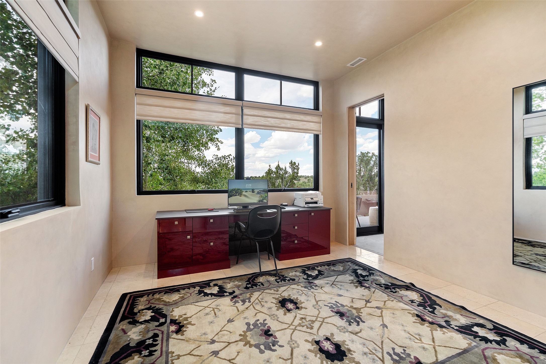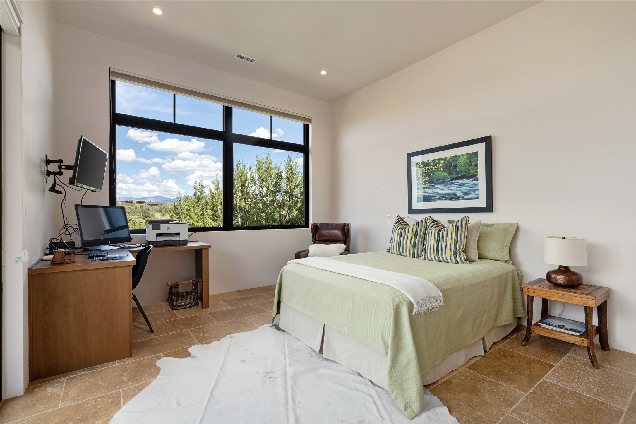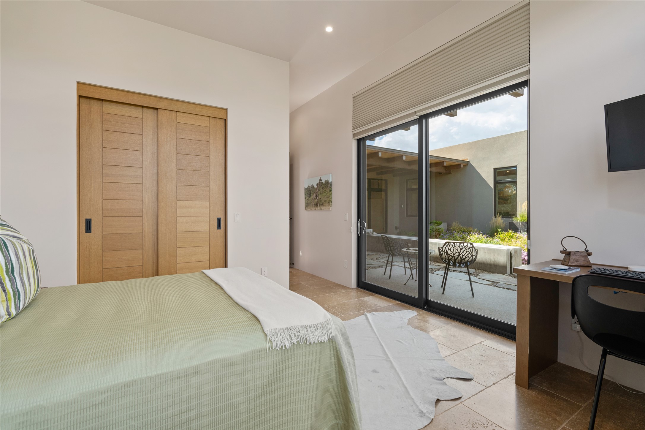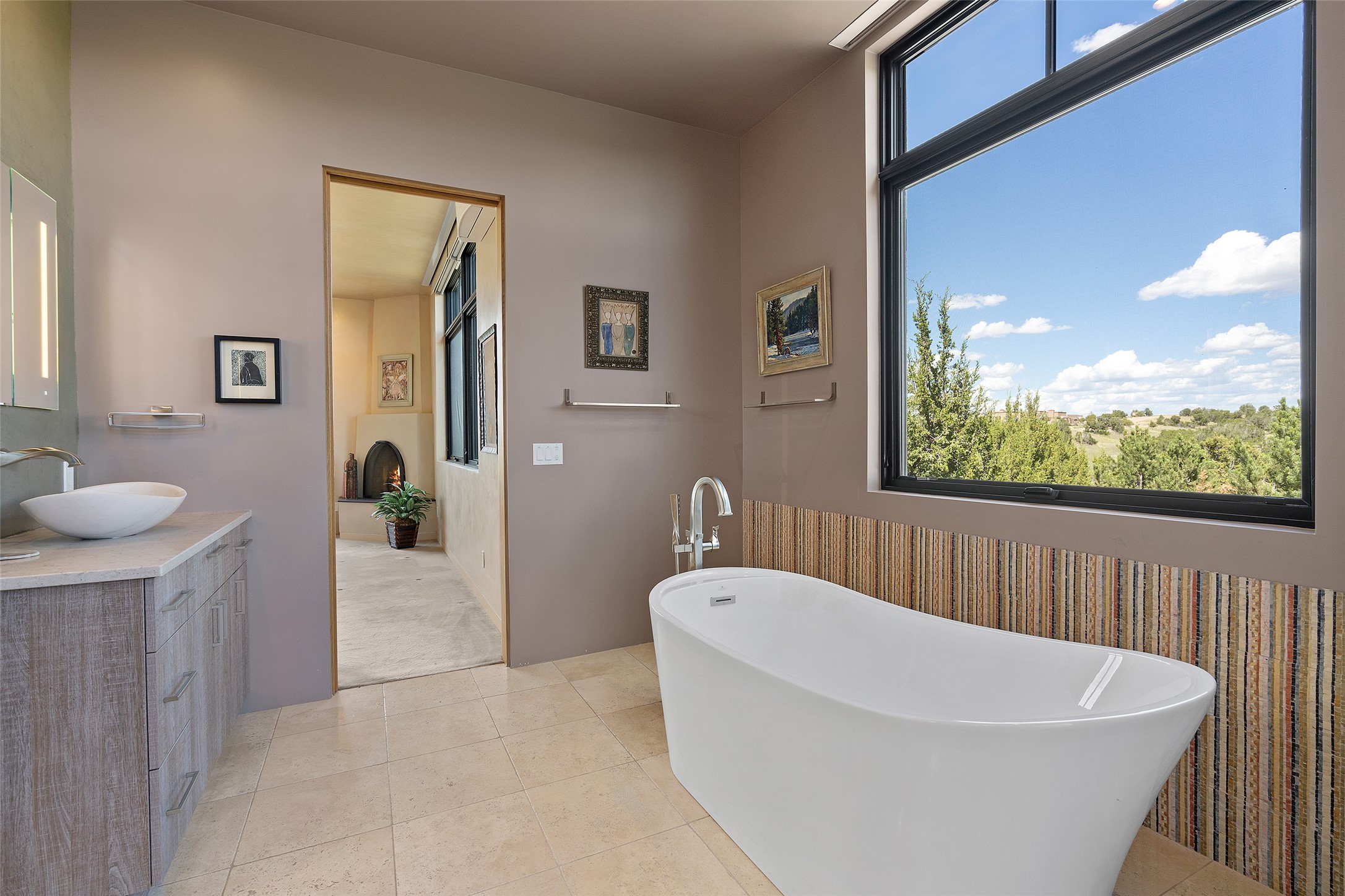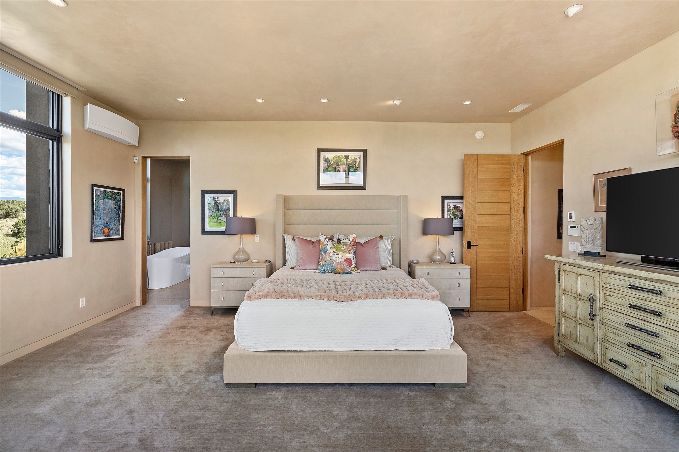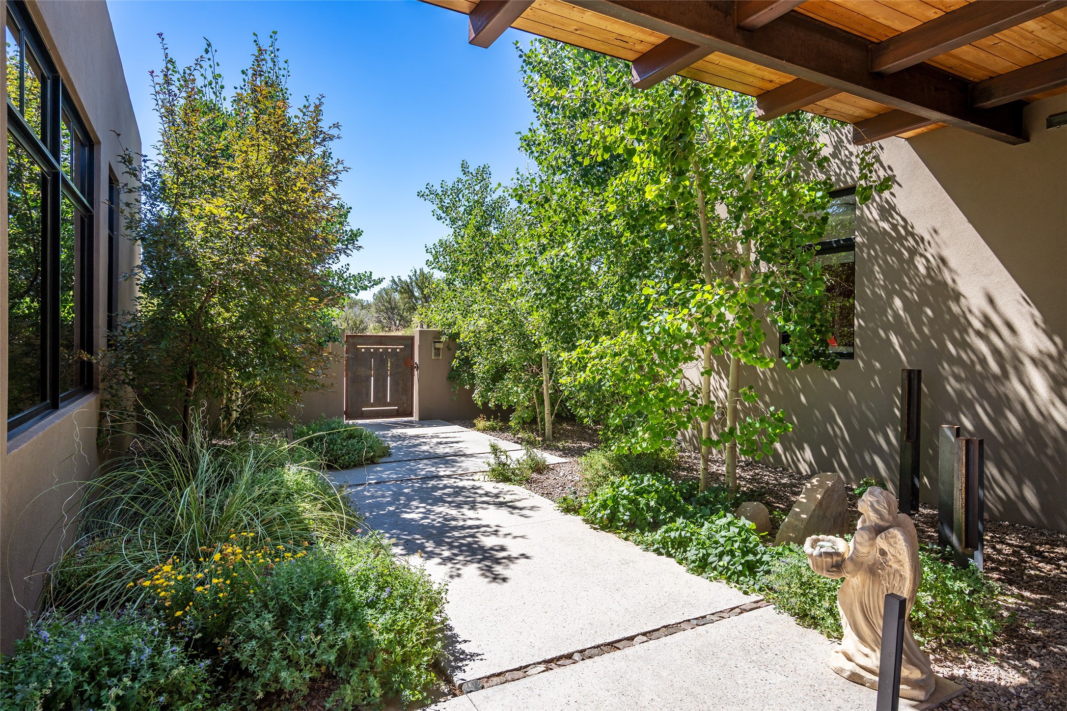 CONTEMPORARY MASTERPIECE IN LAS CAMPANAS WITH UNPARALLELED VIEWS TO BOTH MOUNTAIN RANGES. Bordering Bureau of Land Management Land, this exceptional property offers sweeping Eastern and Western Mountain vistas with uncompromised privacy. The 3,947 sqft main home has plenty of natural light, towering wood and steel ceilings and clerestory windows - designed by noted architect Lorn Tryk and executed by Prull Custom Builders - featuring 1 bedroom, 2 offices, a media room, and gallery-like spaces enhanced by travertine floors, warm stacked-stone masonry walls, custom ironwork, and motorized shades. The Owner's suite looks to the landscape and is a haven of tranquility. A detached guest house provides 2 bedrooms, 2 bathrooms, and a kitchenette - perfect for extended stays of hosting in style. Smart-home systems, a whole-home natural gas generator, and a 3-car garage with an oversized truck bay ensure convenience and peace of mind. Designed for modern living, the chef's kitchen includes Wolf and Sub-Zero appliances, dual dishwashers & ovens, steam oven, large wine fridge, pantry, and striking Spanish woven-metal light fixtures. Outdoor living is extraordinary with patios accessible from nearly every room, 3 fountains, hot tub with outdoor shower, and a custom Agave mural by artist Pam Platt. Four fireplaces add warmth and ambience indoors and out. Phenomenal cross-lighting, gorgeous driveway approach, and refined details throughout complete this contemporary retreat in one of Santa Fe's most prestigious communities.