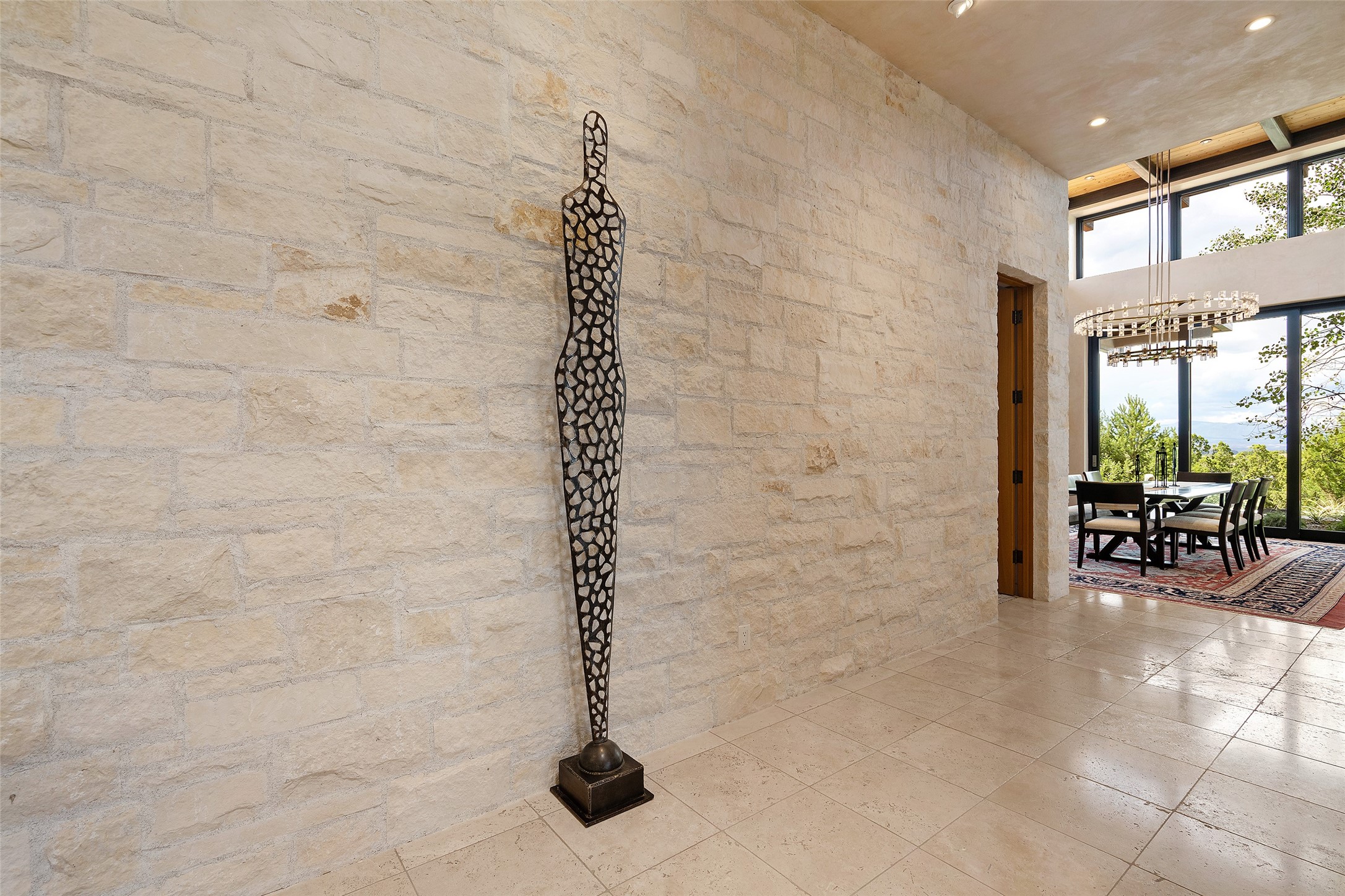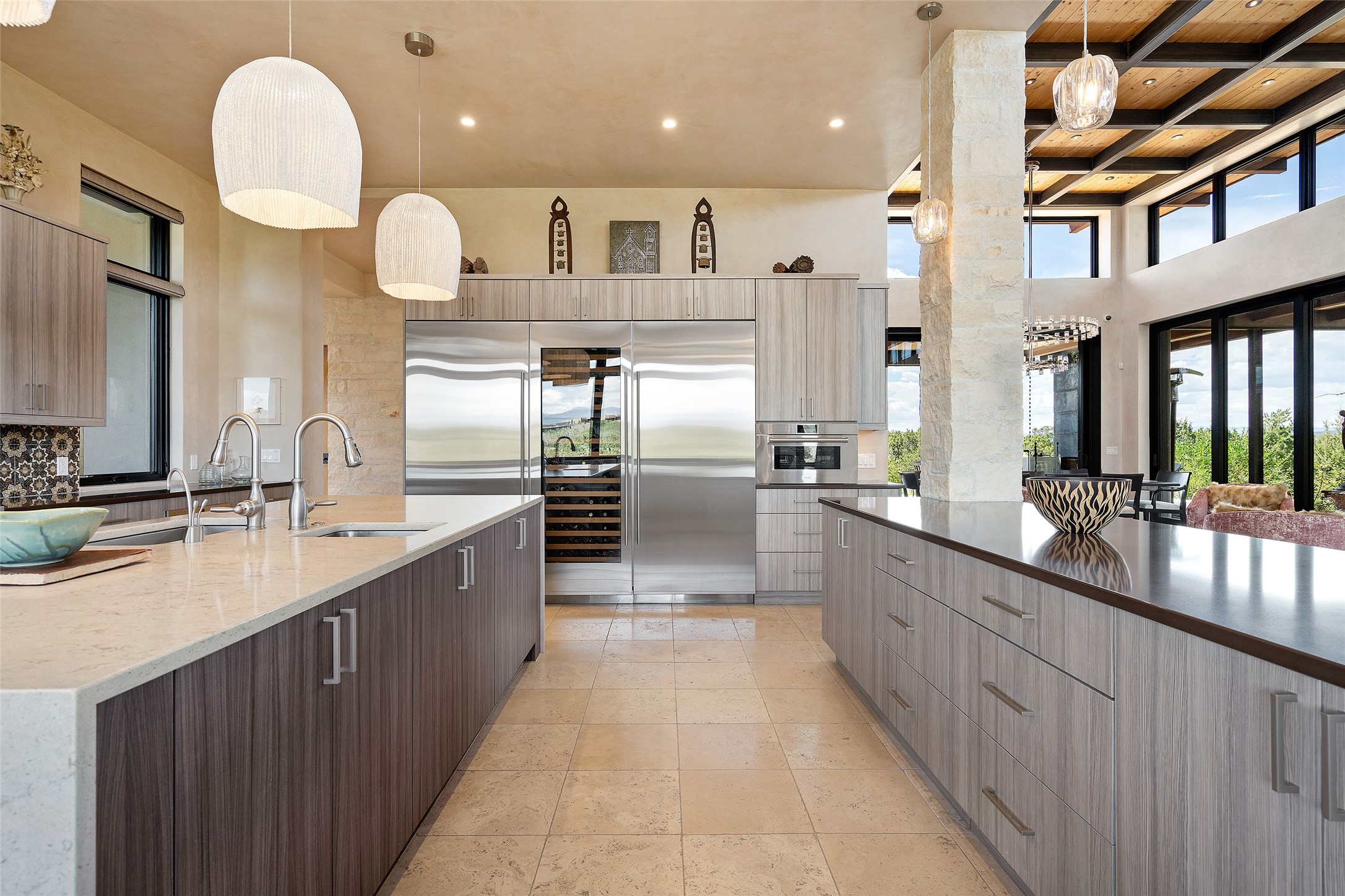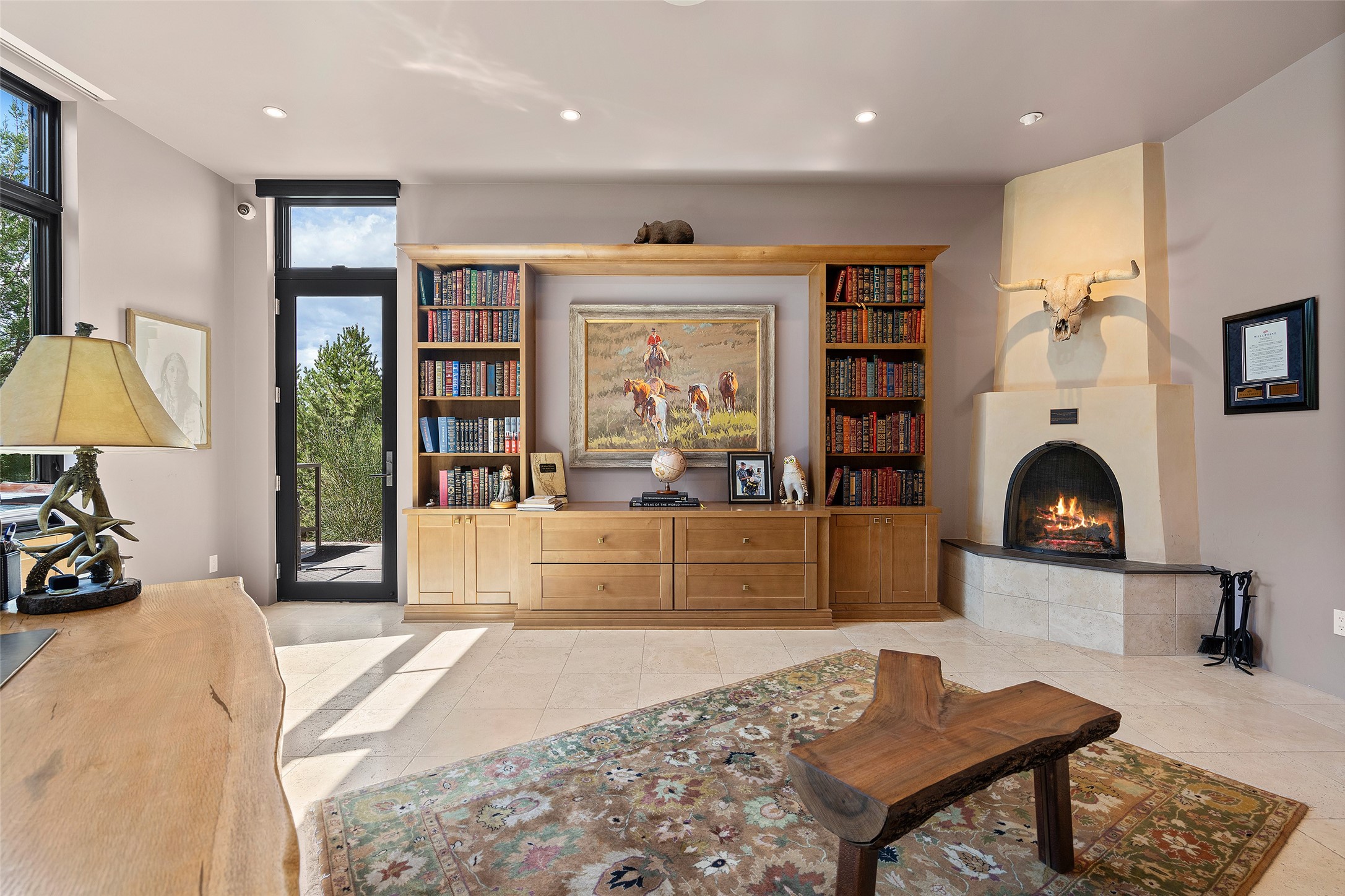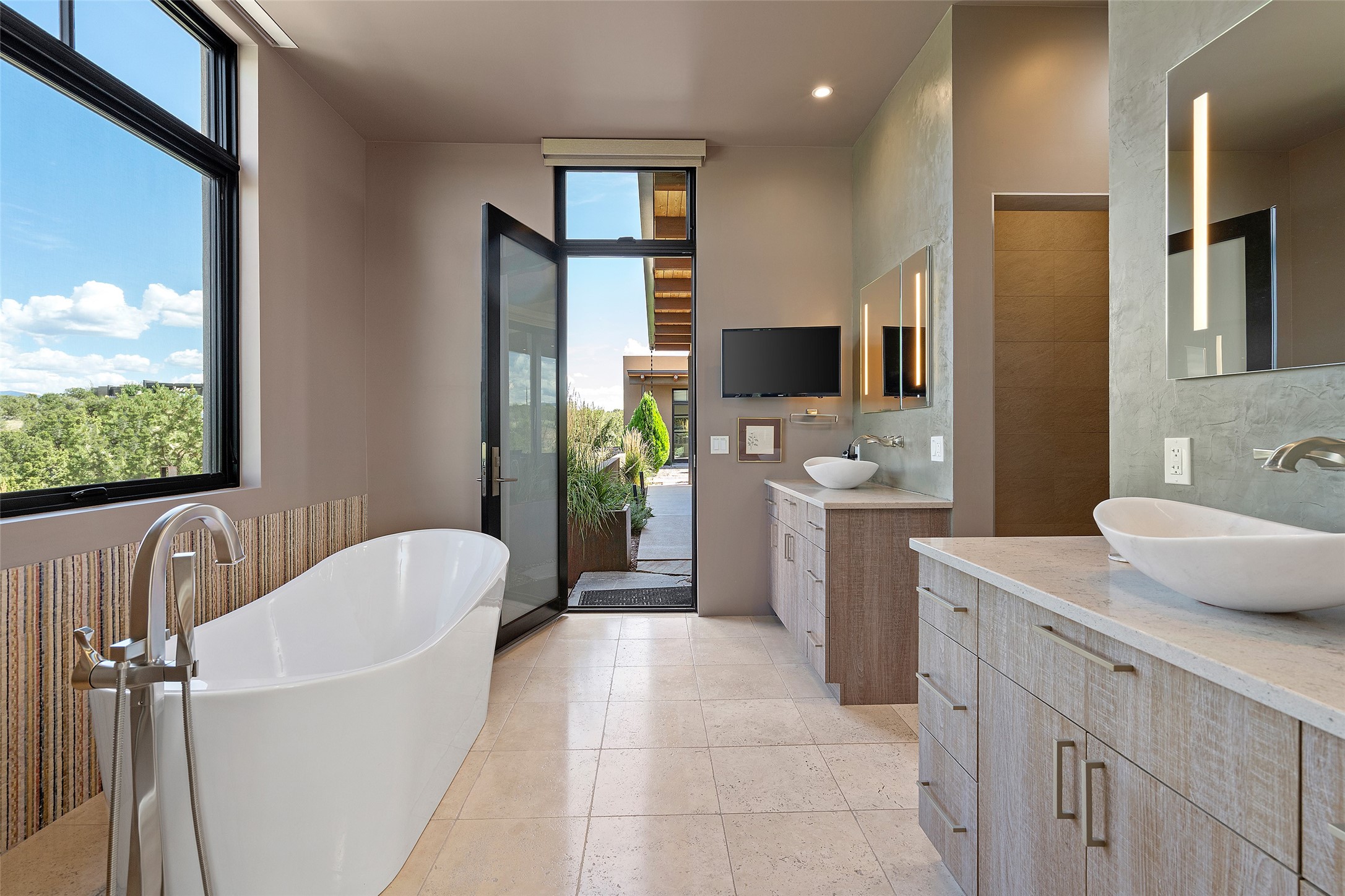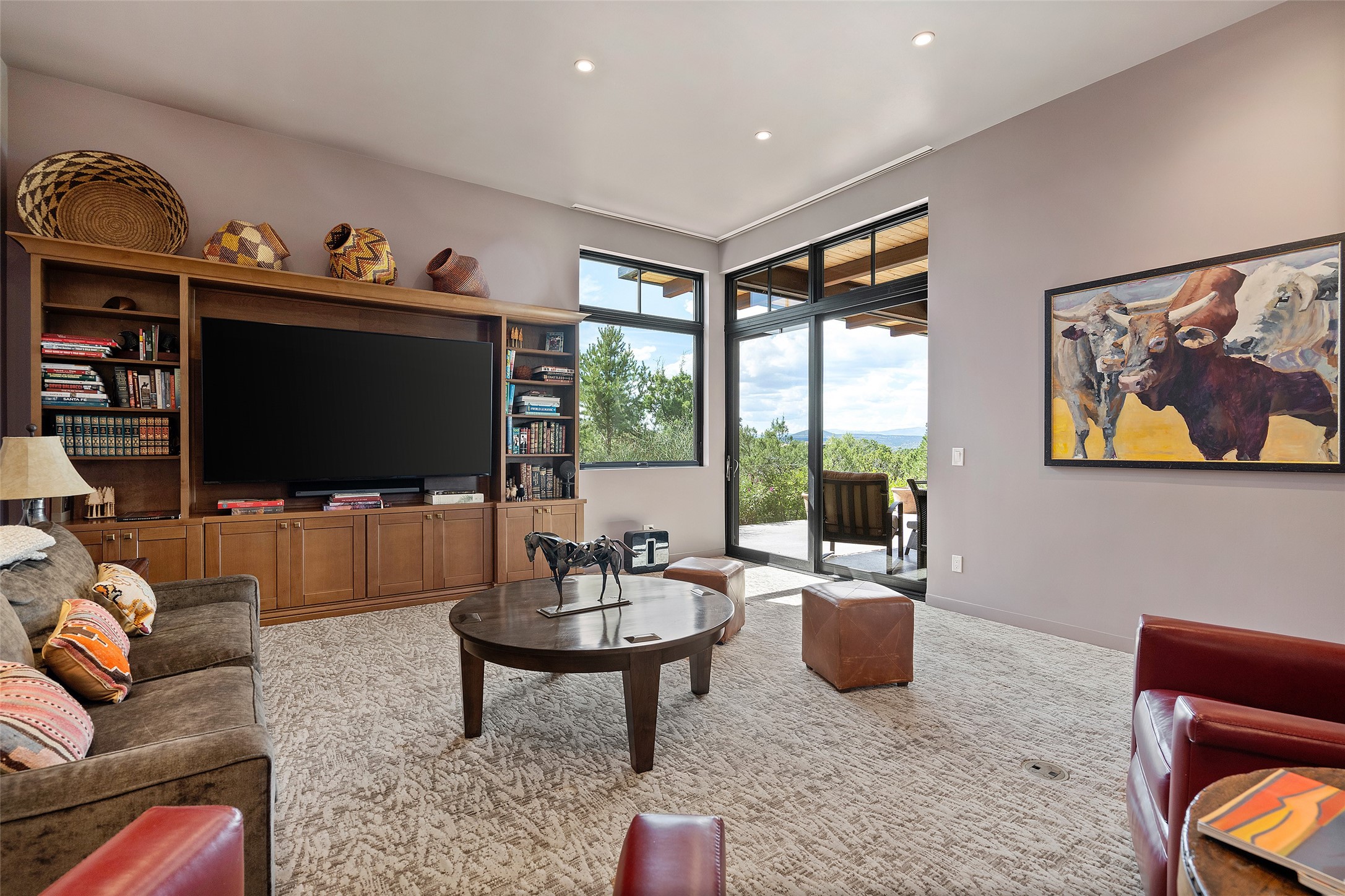 CONTEMPORARY MASTERPIECE IN LAS CAMPANAS WITH UNPARALLELED VIEWS TO BOTH MOUNTAIN RANGES. Bordering Bureau of Land Management Land, this exceptional property offers sweeping Eastern and Western Mountain vistas with uncompromised privacy. The 3,947 sqft main home has plenty of natural light, towering wood and steel ceilings and clerestory windows - designed by noted architect Lorn Tryk and executed by Prull Custom Builders - featuring 1 bedroom, 2 offices, a media room, and gallery-like spaces enhanced by travertine floors, warm stacked-stone masonry walls, custom ironwork, and motorized shades. The Owner's suite looks to the landscape and is a haven of tranquility. A detached guest house provides 2 bedrooms, 2 bathrooms, and a kitchenette - perfect for extended stays of hosting in style. Smart-home systems, a whole-home natural gas generator, and a 3-car garage with an oversized truck bay ensure convenience and peace of mind. Designed for modern living, the chef's kitchen includes Wolf and Sub-Zero appliances, dual dishwashers & ovens, steam oven, large wine fridge, pantry, and striking Spanish woven-metal light fixtures. Outdoor living is extraordinary with patios accessible from nearly every room, 3 fountains, hot tub with outdoor shower, and a custom Agave mural by artist Pam Platt. Four fireplaces add warmth and ambience indoors and out. Phenomenal cross-lighting, gorgeous driveway approach, and refined details throughout complete this contemporary retreat in one of Santa Fe's most prestigious communities.