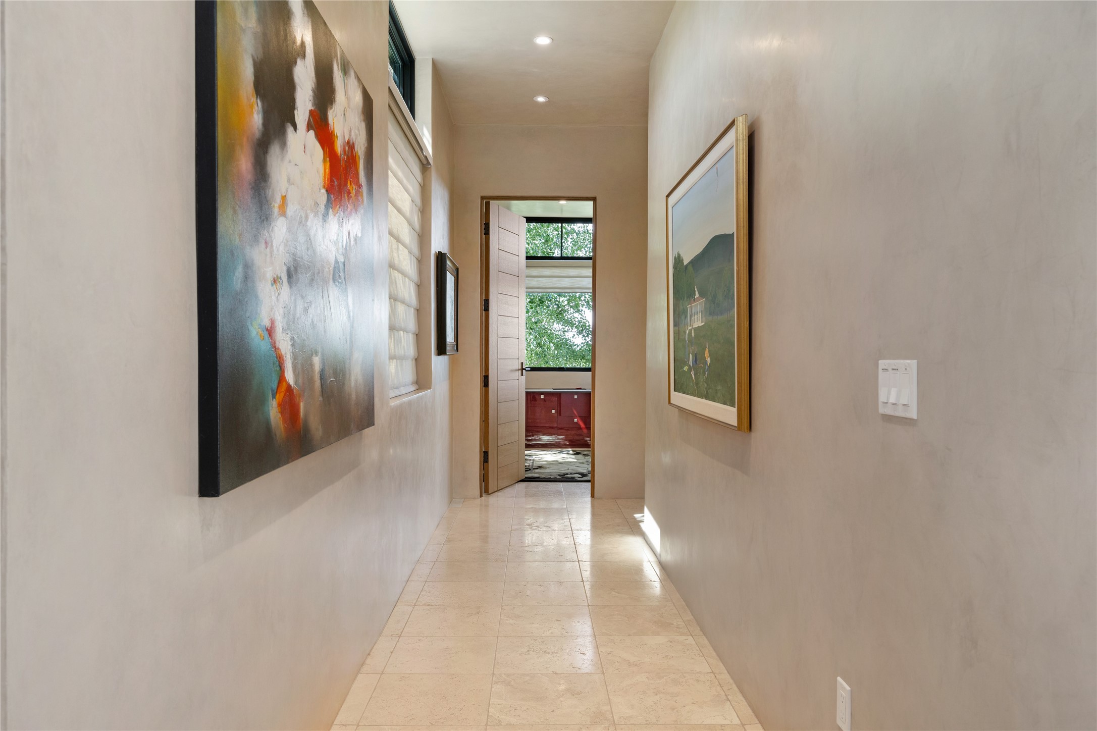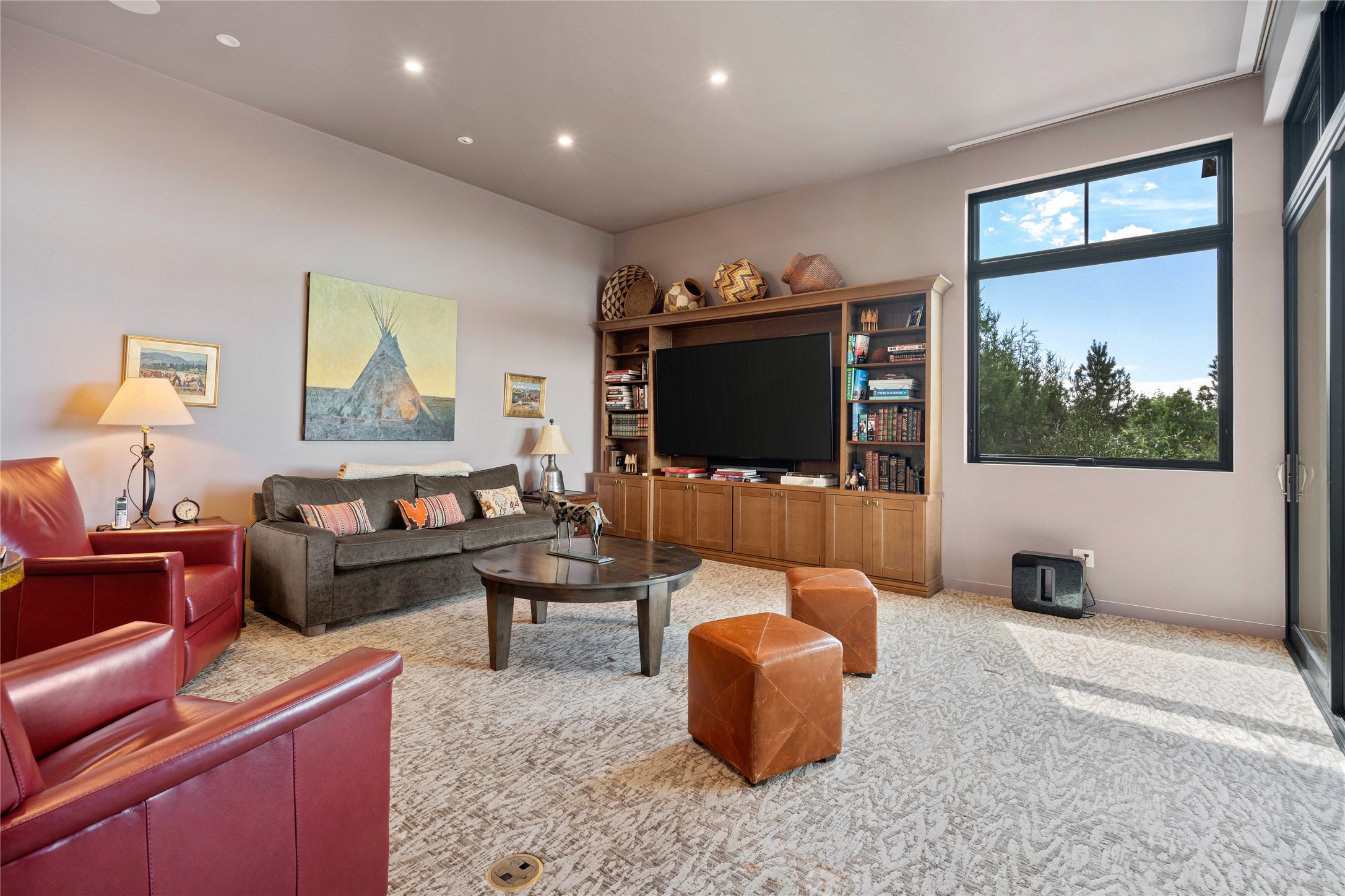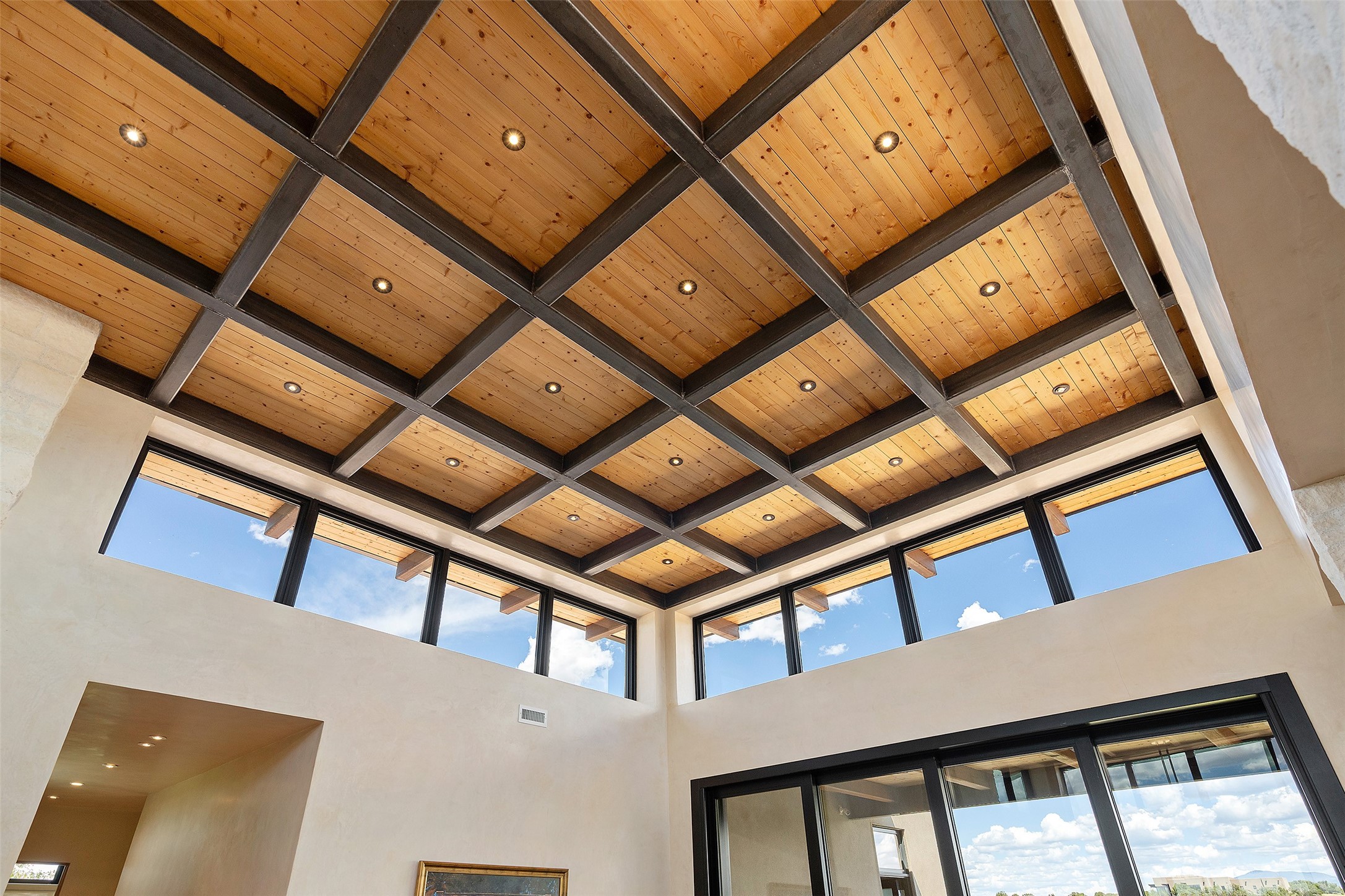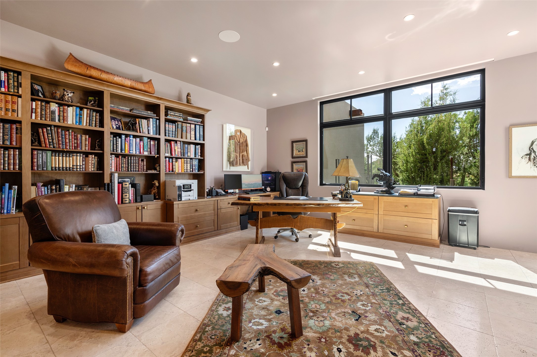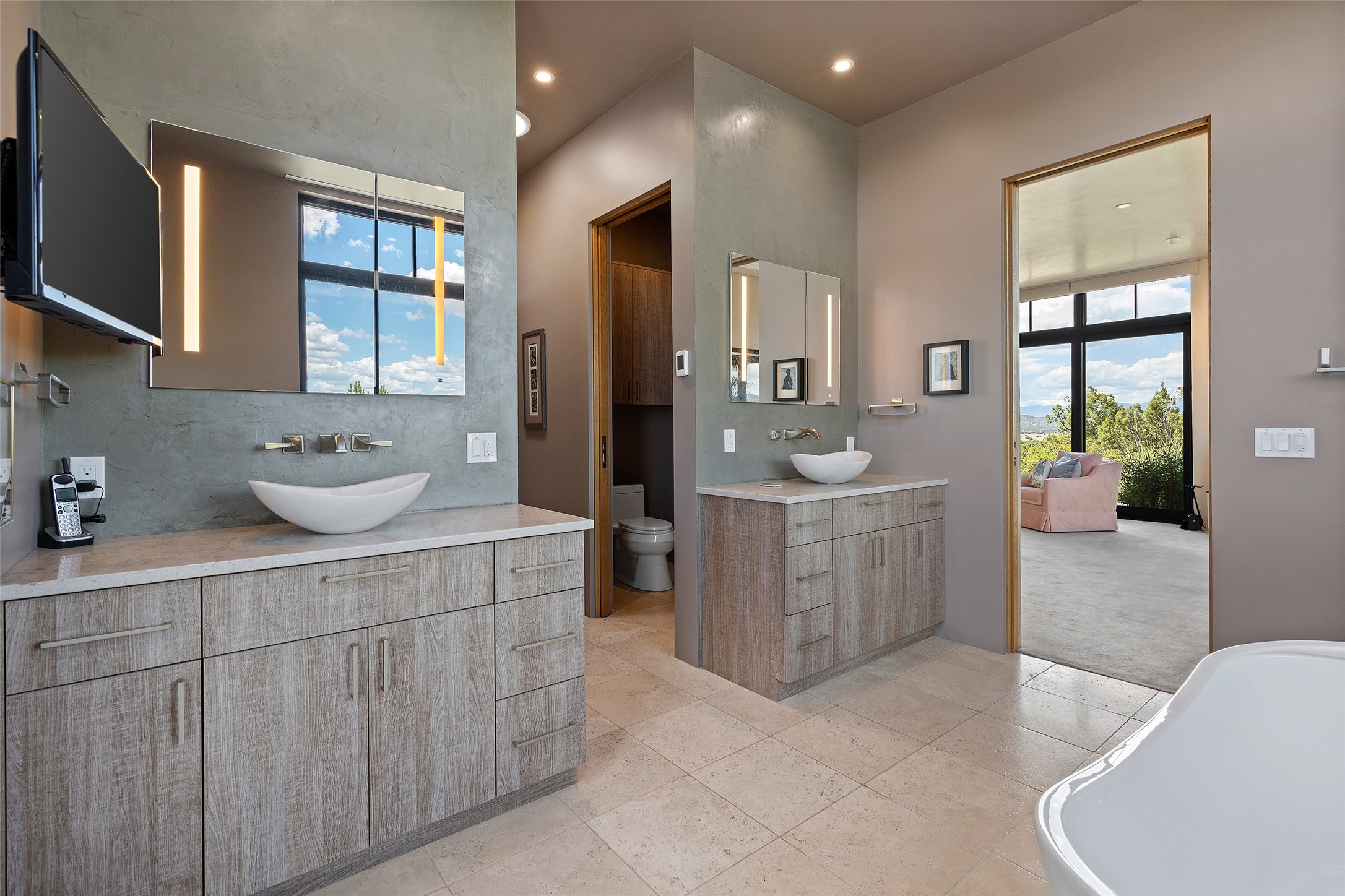 CONTEMPORARY MASTERPIECE IN LAS CAMPANAS WITH UNPARALLELED VIEWS TO BOTH MOUNTAIN RANGES. Bordering Bureau of Land Management Land, this exceptional property offers sweeping Eastern and Western Mountain vistas with uncompromised privacy. The 3,947 sqft main home has plenty of natural light, towering wood and steel ceilings and clerestory windows - designed by noted architect Lorn Tryk and executed by Prull Custom Builders - featuring 1 bedroom, 2 offices, a media room, and gallery-like spaces enhanced by travertine floors, warm stacked-stone masonry walls, custom ironwork, and motorized shades. The Owner's suite looks to the landscape and is a haven of tranquility. A detached guest house provides 2 bedrooms, 2 bathrooms, and a kitchenette - perfect for extended stays of hosting in style. Smart-home systems, a whole-home natural gas generator, and a 3-car garage with an oversized truck bay ensure convenience and peace of mind. Designed for modern living, the chef's kitchen includes Wolf and Sub-Zero appliances, dual dishwashers & ovens, steam oven, large wine fridge, pantry, and striking Spanish woven-metal light fixtures. Outdoor living is extraordinary with patios accessible from nearly every room, 3 fountains, hot tub with outdoor shower, and a custom Agave mural by artist Pam Platt. Four fireplaces add warmth and ambience indoors and out. Phenomenal cross-lighting, gorgeous driveway approach, and refined details throughout complete this contemporary retreat in one of Santa Fe's most prestigious communities.