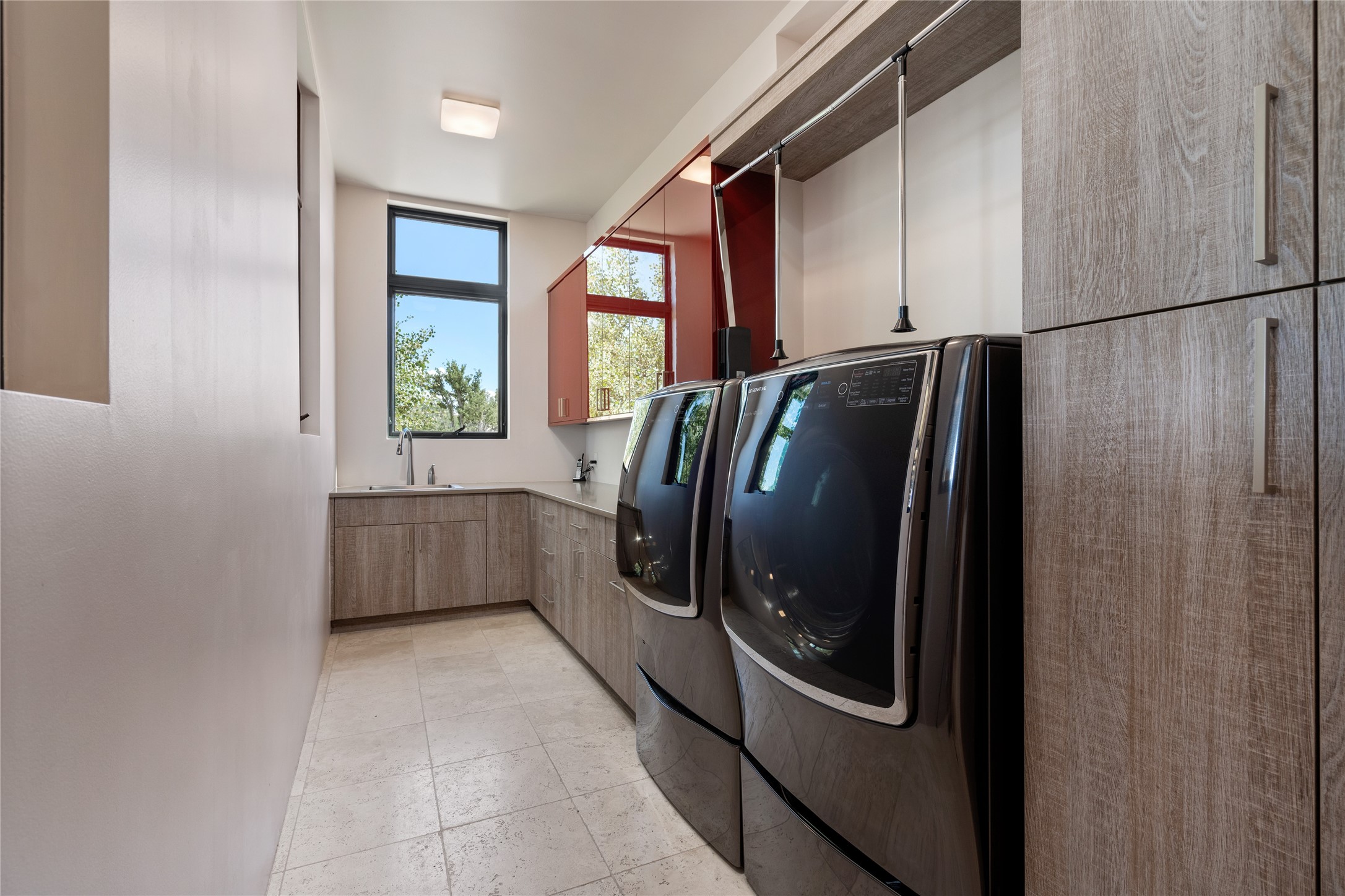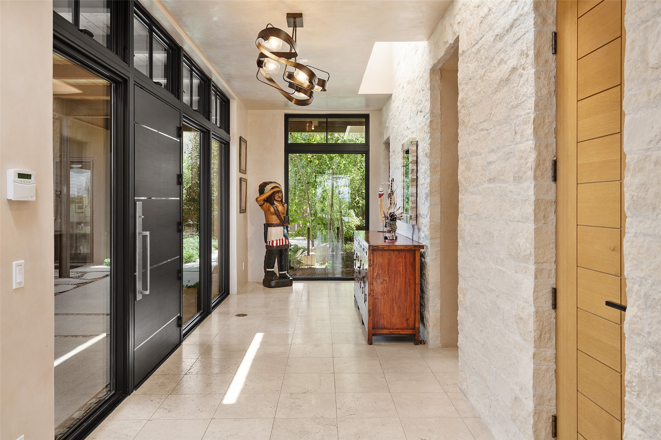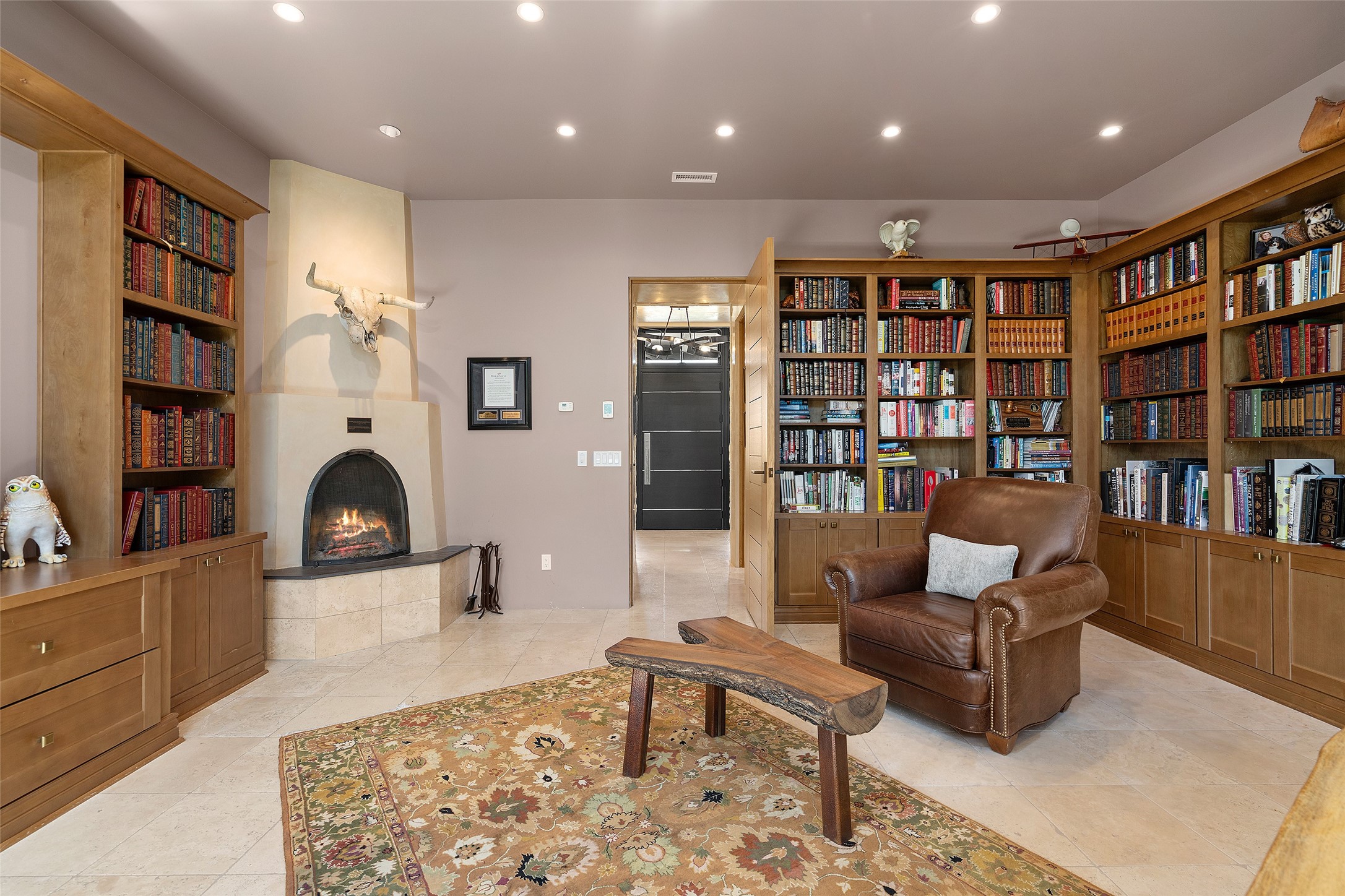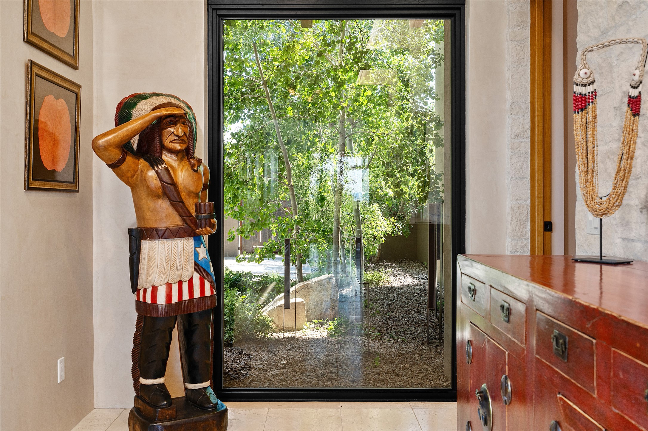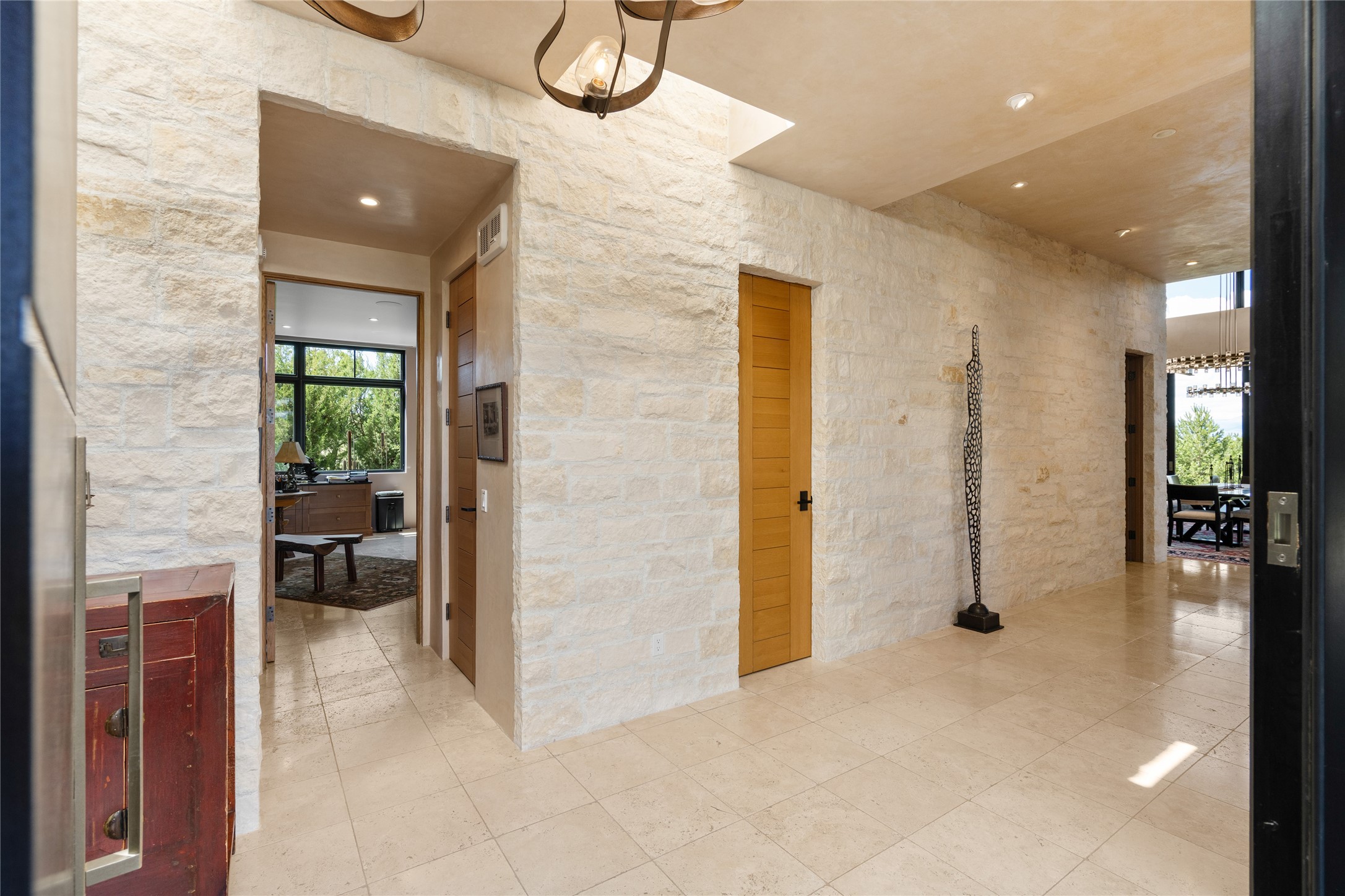 CONTEMPORARY MASTERPIECE IN LAS CAMPANAS WITH UNPARALLELED VIEWS TO BOTH MOUNTAIN RANGES. Bordering Bureau of Land Management Land, this exceptional property offers sweeping Eastern and Western Mountain vistas with uncompromised privacy. The 3,947 sqft main home has plenty of natural light, towering wood and steel ceilings and clerestory windows - designed by noted architect Lorn Tryk and executed by Prull Custom Builders - featuring 1 bedroom, 2 offices, a media room, and gallery-like spaces enhanced by travertine floors, warm stacked-stone masonry walls, custom ironwork, and motorized shades. The Owner's suite looks to the landscape and is a haven of tranquility. A detached guest house provides 2 bedrooms, 2 bathrooms, and a kitchenette - perfect for extended stays of hosting in style. Smart-home systems, a whole-home natural gas generator, and a 3-car garage with an oversized truck bay ensure convenience and peace of mind. Designed for modern living, the chef's kitchen includes Wolf and Sub-Zero appliances, dual dishwashers & ovens, steam oven, large wine fridge, pantry, and striking Spanish woven-metal light fixtures. Outdoor living is extraordinary with patios accessible from nearly every room, 3 fountains, hot tub with outdoor shower, and a custom Agave mural by artist Pam Platt. Four fireplaces add warmth and ambience indoors and out. Phenomenal cross-lighting, gorgeous driveway approach, and refined details throughout complete this contemporary retreat in one of Santa Fe's most prestigious communities.