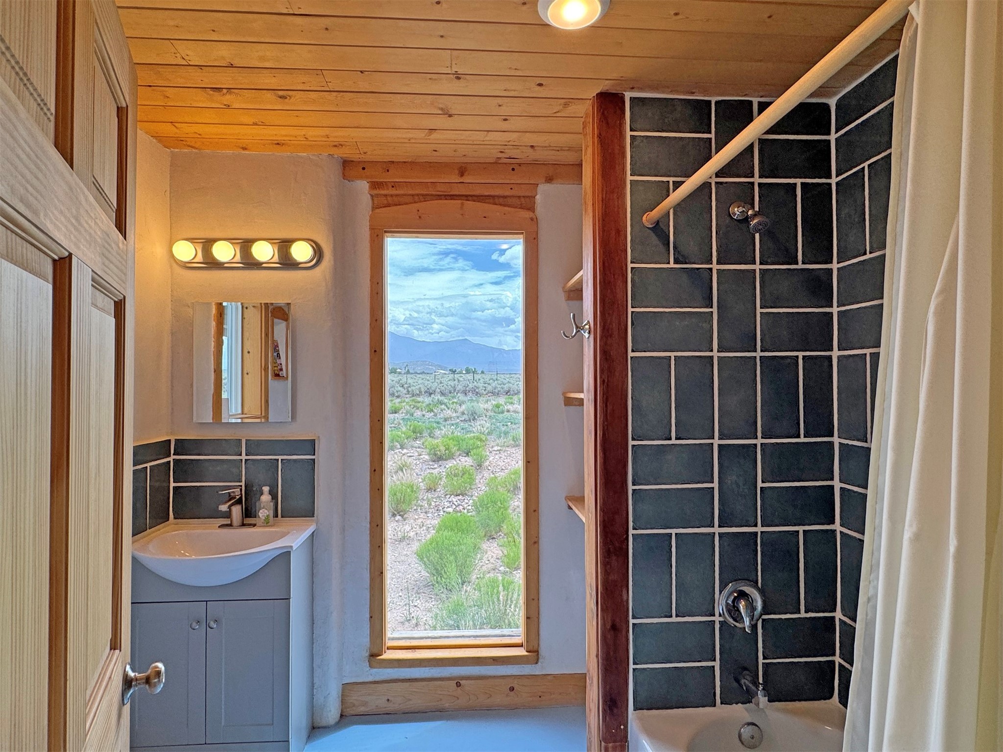 Here's a flexible property featuring two 700 square feet casitas on 2.53 unrestricted acres! Main house constructed in 2017 has entrymud room and open living/dining/kitchen areas with lots of windows framing wrap around views of sunset, Taos Mountain and Sangre deCristo Mountains. Painted concrete floors with in floor radiant heat. Pitched tongue and groove ceiling, ceiling fan and woodstovemaintain comfortable temperatures year round. Easily accessible, finished loft with cabinets provides ample storage. Cook's kitchen hasgranite tile countertops, is wired for under counter lighting, and has a propane gas range and fridge. Comfortable bedroom with T&G andbeams ceiling features a spacious ensuite bathroom with cast iron tub, personal shower and ample linen storage. Mechanical/utility roomincludes a washer which conveys with sale and storage shelving. On the north side is a sweet exposed adobe wall courtyard containinga paver stone patio and latilla ramada, perfect for dining al fresco and star gazing. Pitched Propanel roof delivers water catchment for a1700 gallon buried cistern in lieu of conventional well. Seller typically orders supplemental water 1-2 times a year for a cost ofapproximately $230 each delivery of 1700 gallons. Exterior siding is a combination of stucco and Cape Cod wood siding. Guest houseis 714 square feet of flexible space built in 2023 featuring kitchenette with fridge, full bath, wood stove, exposed adobes, and vaultedT&G ceiling with beams and columns. Comfortable full bathroom with linen storage, tub and shower. This structure is heated and cooledwith a heat pump mini split system. This space could serve as a studio/workshop, studio apartment rental, or additional property livingspace. Painted cement floors and wrap around windows with mountain views. Entertain outside with a latilla ramada over paver stonepatio. Propanel metal shed roof is plumbed for cistern catchment. Landscape berms cradle both structures, adding privacy and providinga canvass for gardeners. Taosnet broadband Internet in both houses (Kit Carson fiber optic in Tune Drive); cell service on site. Locatedon a rise with stellar 360 degree views and easy walk to the Rio Grande Gorge and John Dunn bridge, Mamby/Stagecoach and BlackRock springs. GPS: 36.52508202679919, -05.70209218650817. Approximately one acre around the structures is fully fence with a farmgate at the entrance. Wood board fencing provides additional privacy. Circle drive and ample guest parking. Property could besubdivided into three separate parcels. Electric transformer has been installed in lower part of property for future development. Allconstruction county permitted with C/Os in Associated Documents. Seller has left firewood, Colorado red flagstone, adobe bricks andnew generator in the original box for the buyer. Approximately twenty minutes from Taos Plaza and half an hour from Taos Ski Valley.Only half a mile off the paved road. This quiet, peaceful property could be developed into three residential properties, a family compound, investment rentals, or horse property. So many options for this creative, energy efficient property built with love!