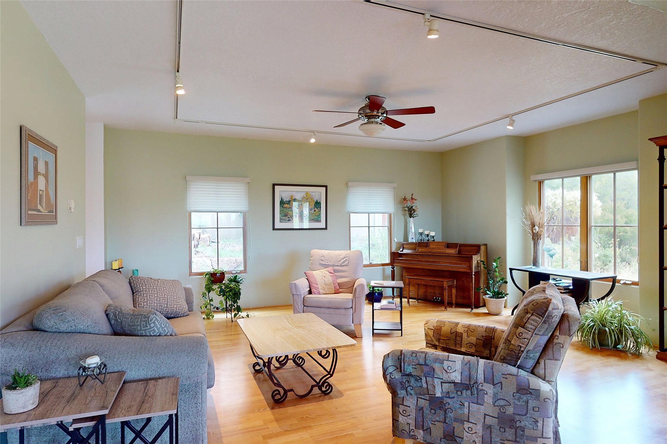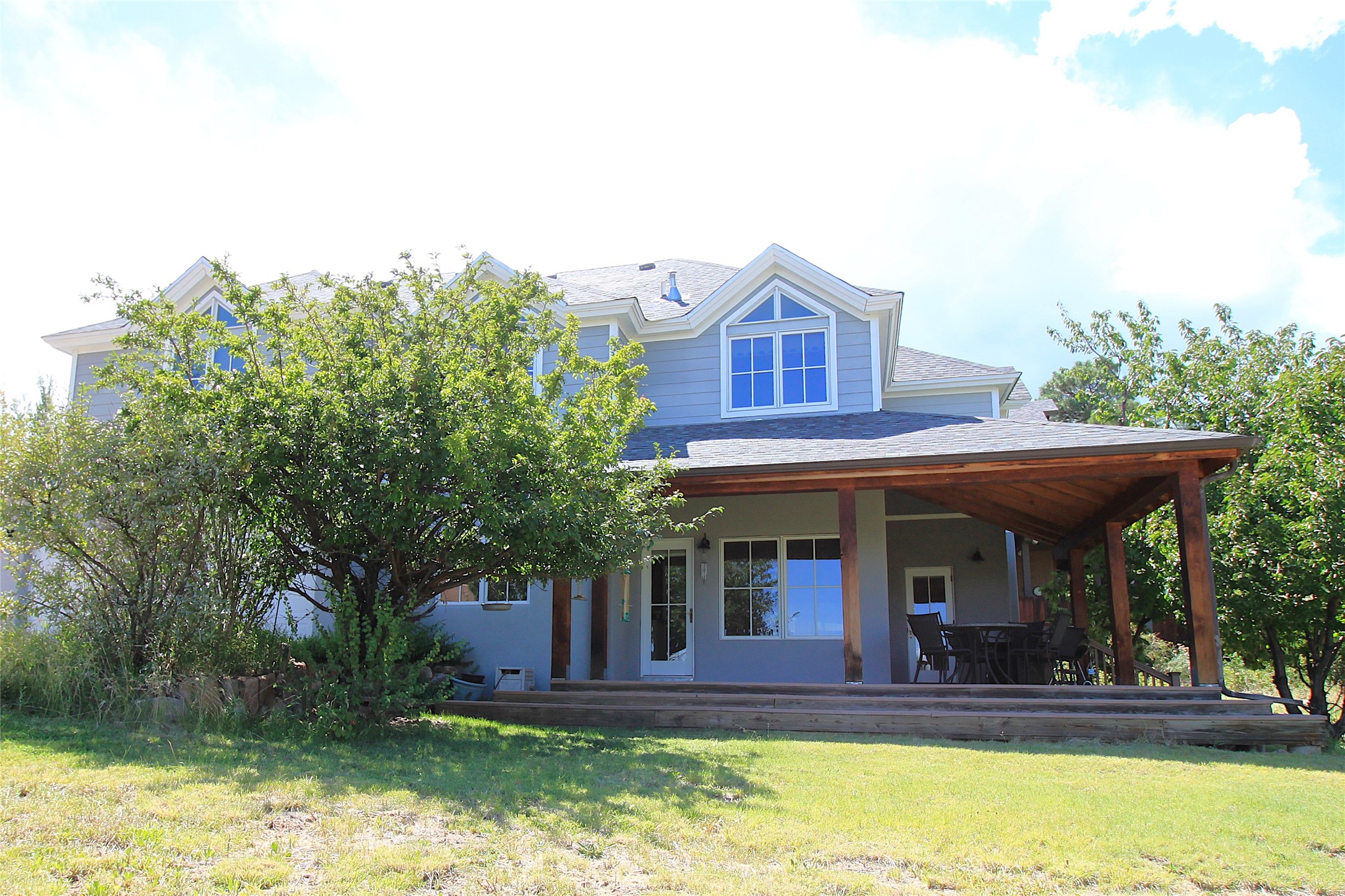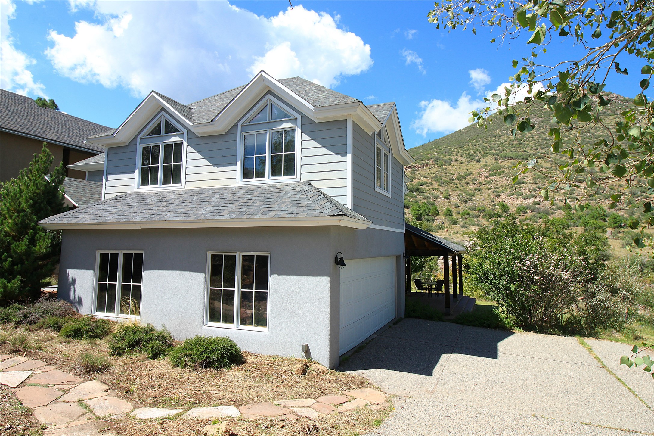 This stunning 4-bedroom, 2.5-bath Quemazon home backs to open space, offering privacy and direct access to the Perimeter Trail. The open floor plan flows seamlessly between the kitchen, dining, and living areas, with easy access to the covered Trex deck--perfect for enjoying mountain and forest views as well as the private backyard. The spacious primary suite includes a private study framed by French doors, dual walk-in closets, and a luxurious en-suite bath with dual sinks and a freestanding tub. Three additional bedrooms and a well-appointed hall bath complete the layout. A walk-out basement with additional living space and a crawl space for storage adds flexibility. Thoughtful details include architectural touches throughout the home, in-floor radiant heat with four zones, WindsorLite windows, six-panel wood doors, ceiling fans in every bedroom and the living room, track lighting, and Kohler fixtures. The kitchen is equipped with a Bosch dishwasher, gas stove/oven, and a newer refrigerator (2022). Major updates include roof replacement in 2009 with a lower-roof update in 2025, and a full stucco renovation in 2019. Outdoors, mature fruit trees--cherry, apple, pear, plum, apricot, nectarine, and peach--along with raspberries, drought-tolerant blue grama grass, and a private front yard with precision-cut stone walls, create a serene retreat. French drains along the west side provide peace of mind. This Quemazon gem blends comfort, thoughtful upgrades, and a premier setting with trails at your doorstep.