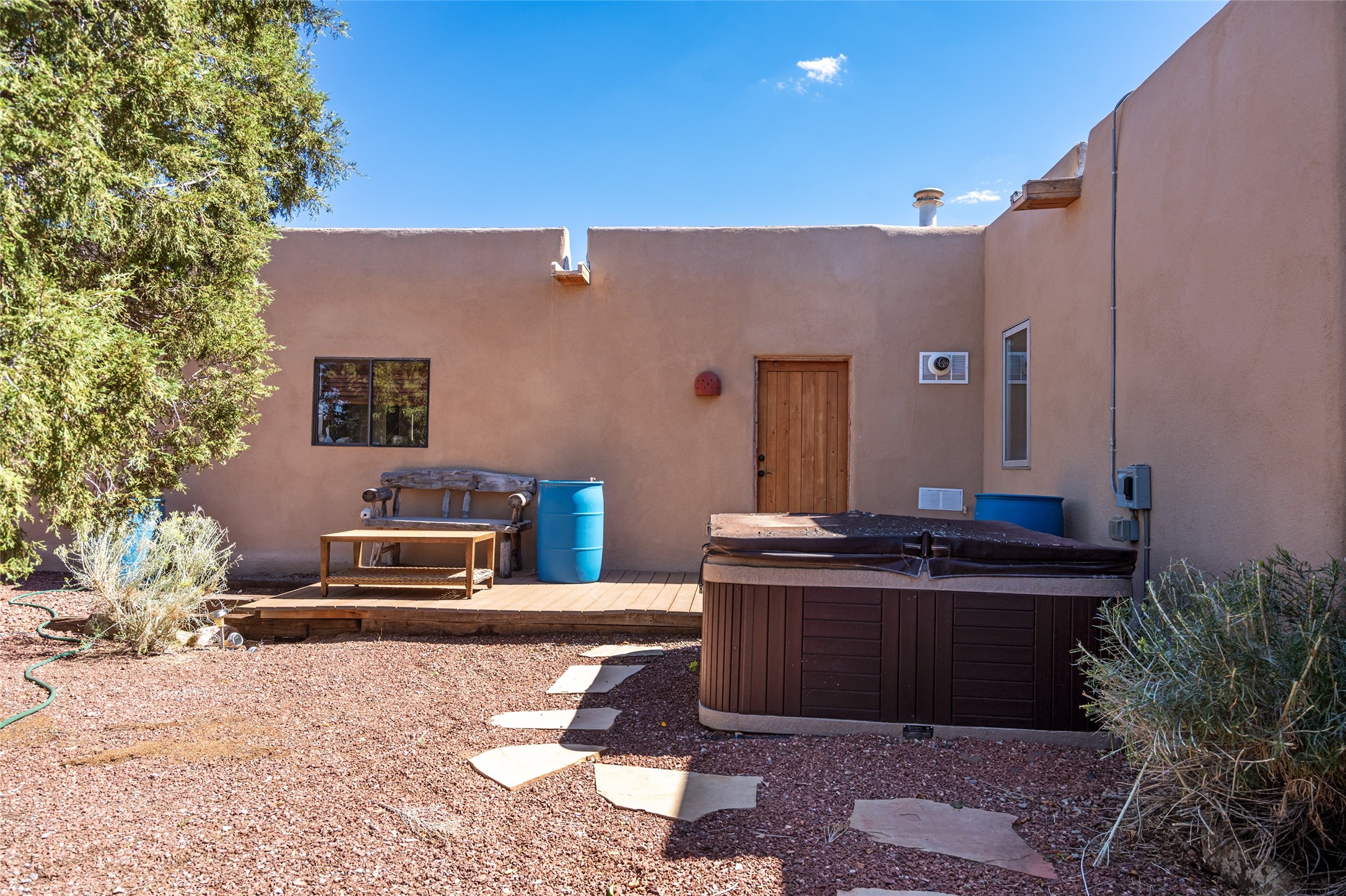 Located in the highly desirable Eldorado community just minutes from Santa Fe, 3-bedroom, 3-bath home perfectly blends classic Santa Fe style with thoughtful modern updates. From its warm Saltillo tile floors to its cork-floored bedrooms--ideal for comfort and allergy sensitivity--every detail invites relaxed, functional living.A standout feature of the home is the nearly 1,100 square feet of versatile flex space with its own private entrance--ideal for a studio, home office, guest suite, or creative retreat.The updated kitchen will impress, featuring a high-end Bluestar gas range, Kenmore Elite refrigerator, and stainless dishwasher. The guest and flex-space bathrooms have also been tastefully renovated, offering both style and comfort. A whole-house water filtration system adds an extra layer of wellness and convenience.Outdoors, mature landscaping frames a private front courtyard and a fully walled backyard oasis, where newly built decks and a relaxing hot tub create the perfect setting for entertaining or unwinding under the stars.For those who value space and storage, the property includes a rare, RV garage--approximately 25' x 40'--in addition to 3 additional car bays, offering ample room for vehicles, projects, or recreational gear.Living in Eldorado means access to miles of scenic walking paths, a welcoming community center, pool, tennis courts, and more--all within a vibrant neighborhood that embodies the best of Santa Fe living.This home is more than just a place to live--it's an inviting canvas for your lifestyle.