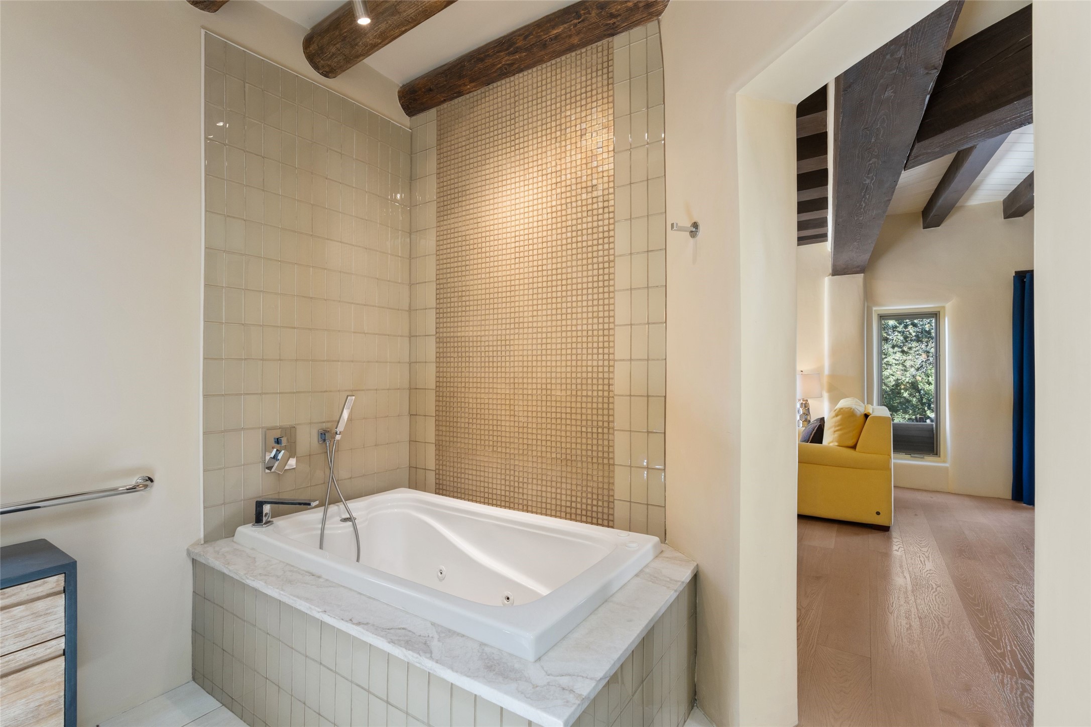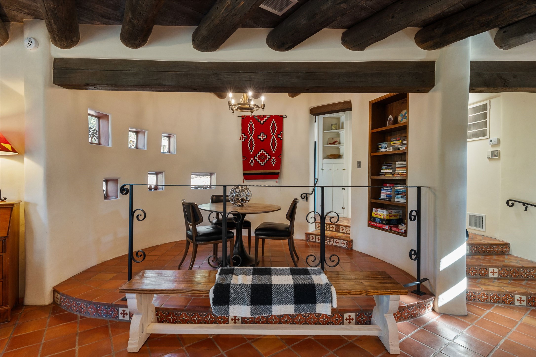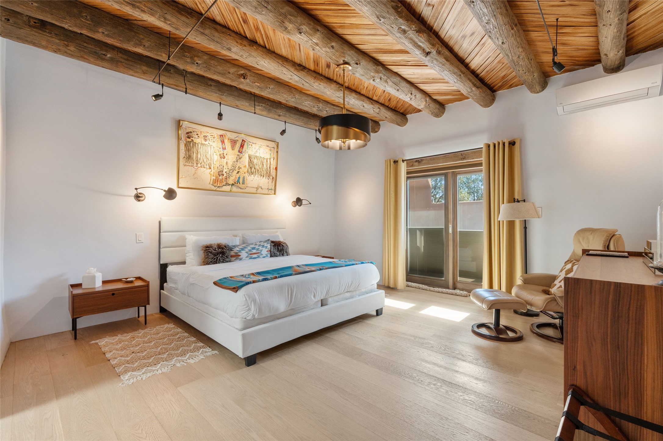 Just a minute off the historic Old Santa Fe Trail in the foothills of the Sangre de Cristo mountains, there resides a spectacular expression of design and architecture. This totally remodeled adobe/frame and stucco home sits upon 1.98 maturely treed and landscaped acres. Exquisitely constructed in a traditional Pueblo design, the 3 bedroom/3 bath, 3,900 +/- sq.ft. main home was designed with a timeless attention to detail, from the siting of the home to the hand plastered walls, vigas with cedar planking, and cascading wood floors throughout. Lovingly upgraded and maintained, the home has several primary suite options with each their own lavish and spa-like bathrooms. An open concept living/dining area is bathed in natural light with a dramatic gas fired fireplace centering the room opposite a wall of disappearing glass doors, ideal for year round entertaining on the deep portal. The large gourmet kitchen area offers a free and easy experience for those looking to entertain or who enjoy an upscale culinary experience. A nearby oversized 2-car garage has additional storage space and shelving. A detached 1 bedroom/1 bath, 1,189 +/- sq.ft. guesthouse is separated from the main house, with its own private outdoor entertaining area and hot tub. The traditional design continues in the guest house, complemented with Saltillo tile floors, vigas and a full kitchen, perfect for guests or an additional rental opportunity. A grand pool room with another hot tub completes the property with its own bathroom, and a separate studio space nearby. A wraparound deck, just off the pool room, has breathtaking western, sunset views, easily viewable while lounging in relaxation from the inside or outside. The property is just a 5 minute drive to the famous Harry's Roadhouse Restaurant or The Club at El Gancho, all on paved and maintained roads. Both the main house and guest house have grossed superlative rental income since ownership with the furnishings available for purchase ideal for those looking for an exceptional investment opportunity property. Function and creativity blend in perfect unison with nature in a fantastic Santa Fe location.