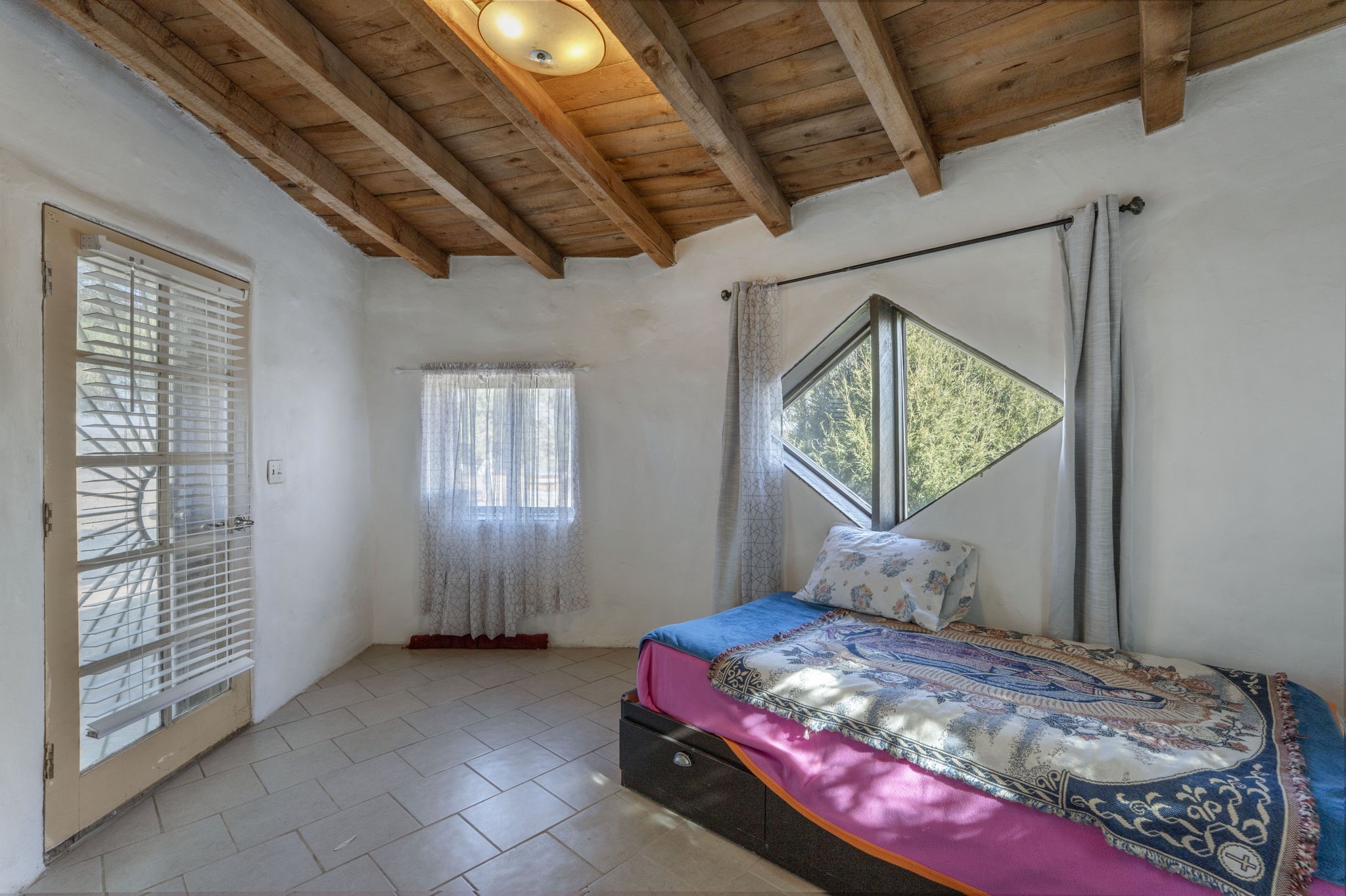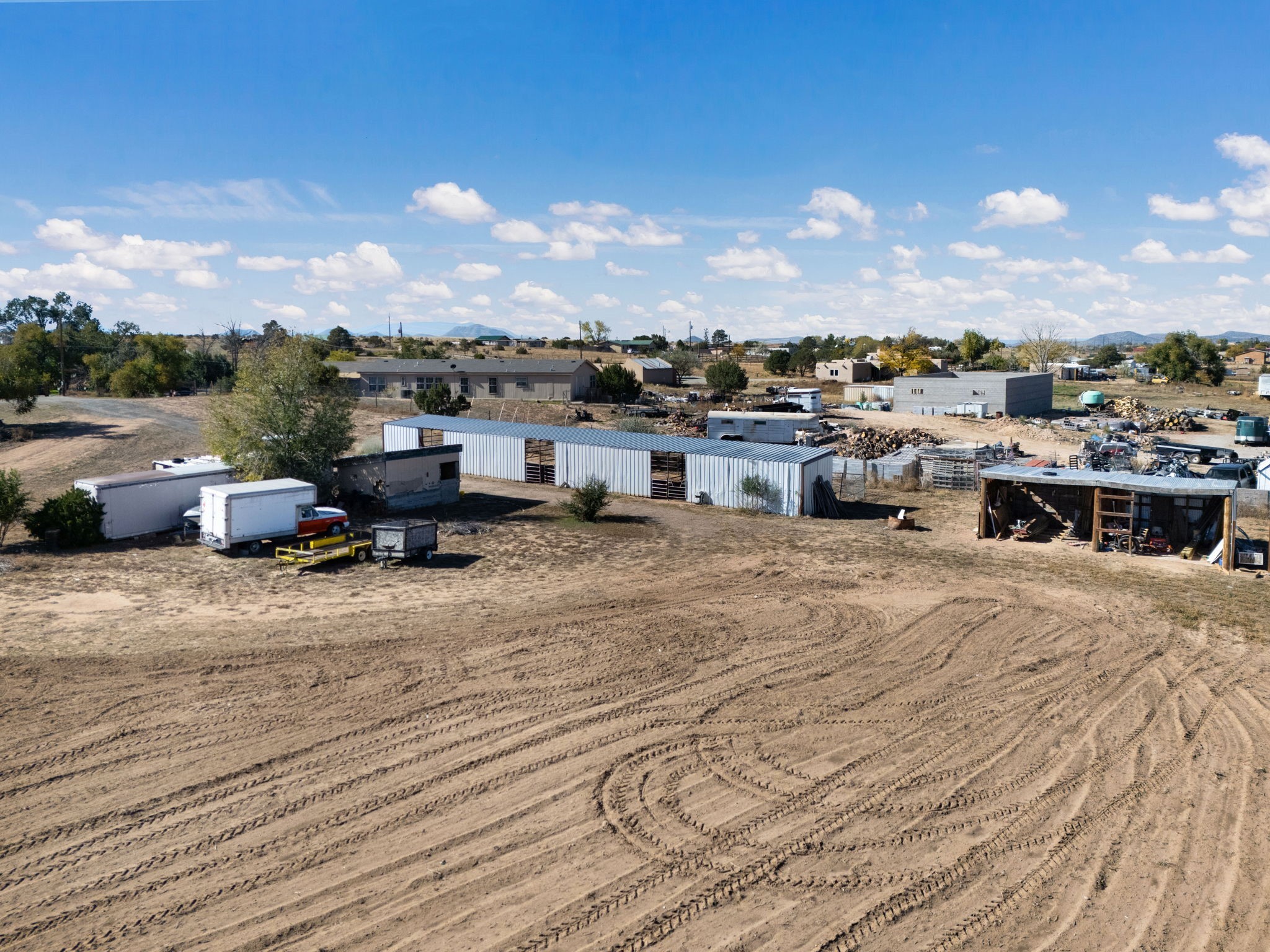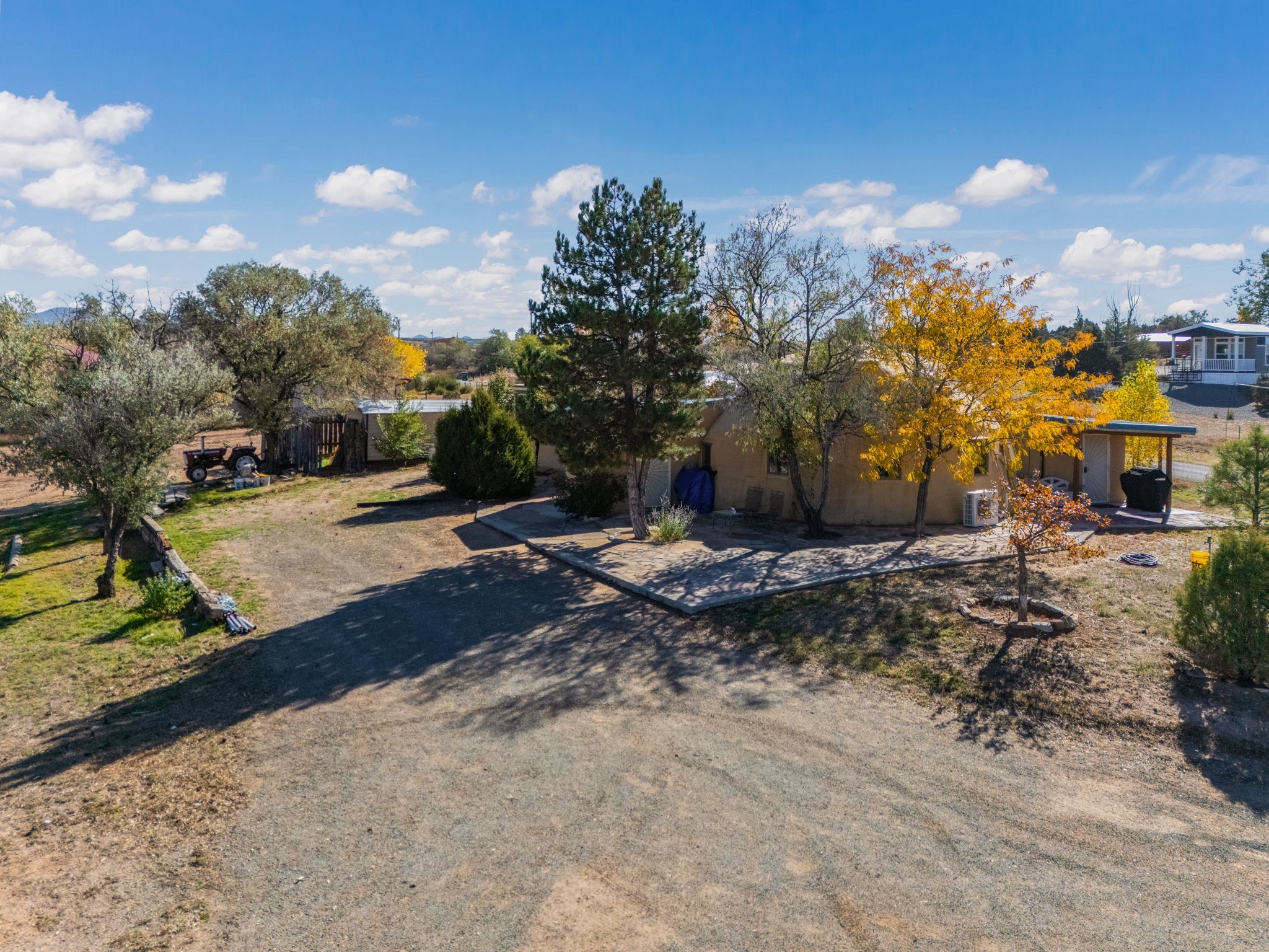 Welcome to your own slice of the Southwest -- a 1,664-square-foot largely adobe home built around a one-of-a-kind geodesic dome, full of character and heart. Set on 2.5 peaceful acres with sweeping Sangre de Cristo mountain views, this property offers the best of rural living, combining comfort, sustainability, and the beauty of the high desert.Step inside and feel the warmth of handcrafted adobe walls, the wooden geodesic dome, exposed vigas, and natural wood and Saltillo tile floors. The primary bedroom features a corner kiva fireplace, creating the perfect cozy retreat on cool evenings. The spacious kitchen is well equipped with stainless steel appliances and plenty of room for gathering, cooking, and sharing meals made from your own garden bounty.The home stays comfortable year-round with a mini-split, woodstove, and solar hot water, while a greywater irrigation system helps nourish your land.Outside, you'll find everything you need for a working mini-ranch or hobby farm -- stables for eight horses with water and electricity, an arena, and ample storage for tack, tools, and feed. The private well ensures reliable water, and there's space to expand your gardens or add more animal pens. Currently, the homestead is happily shared with turkeys, chickens, and mini goats, all thriving under the wide New Mexico sky.This property isn't just a home -- it's a lifestyle. A peaceful haven where you can slow down, breathe deep, and live in rhythm with the land.