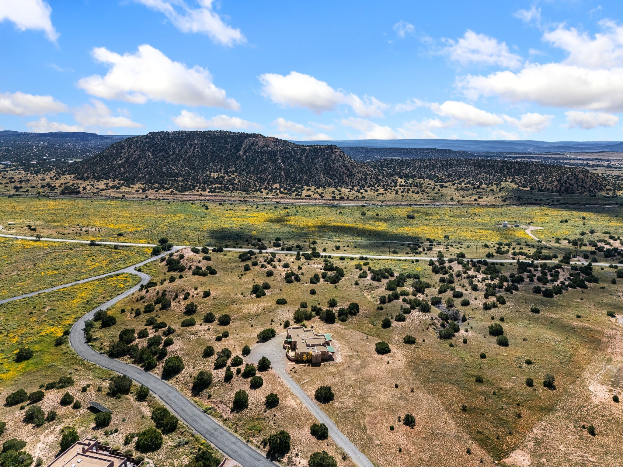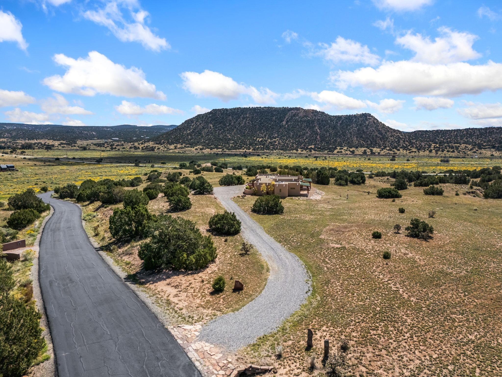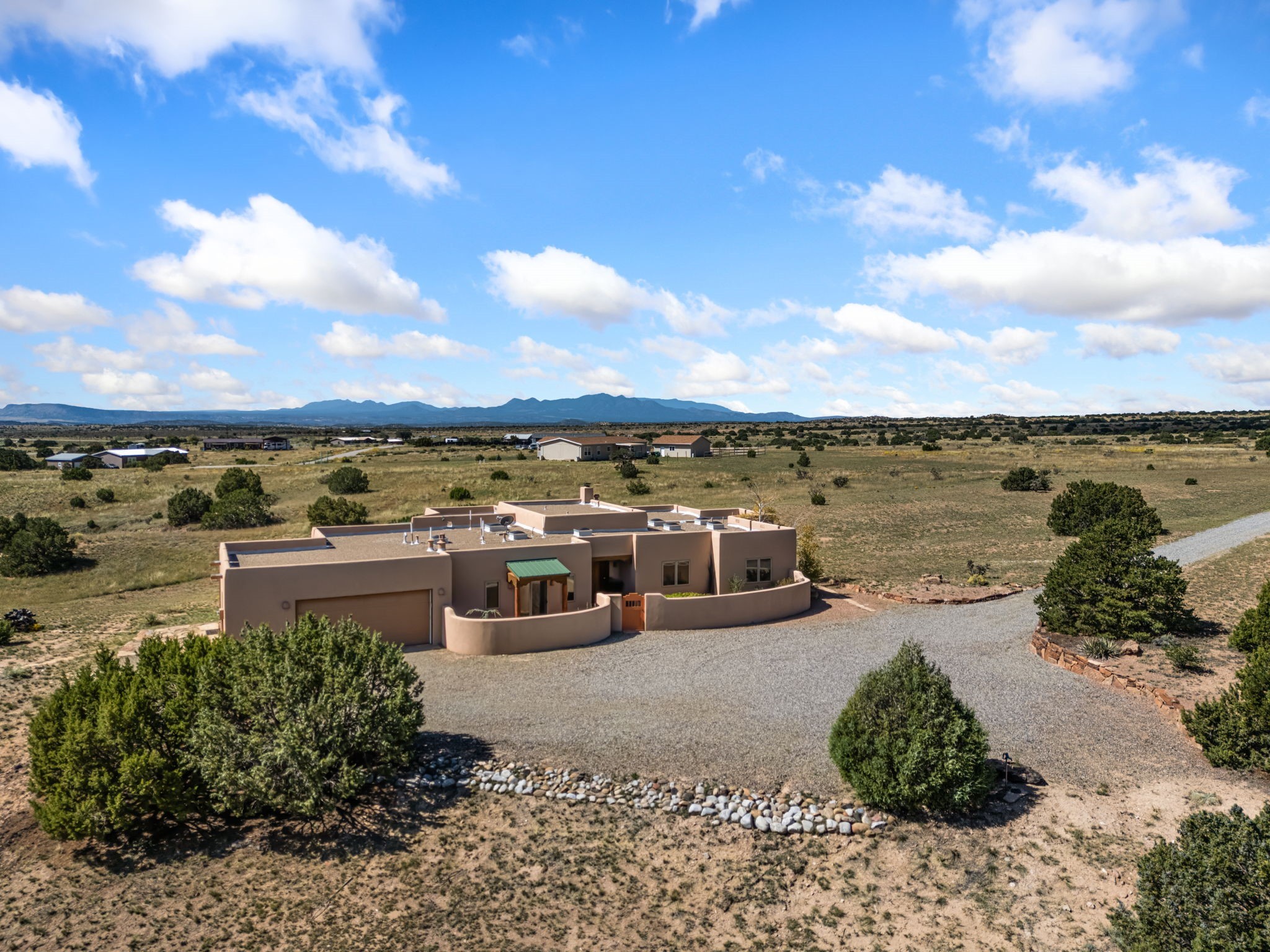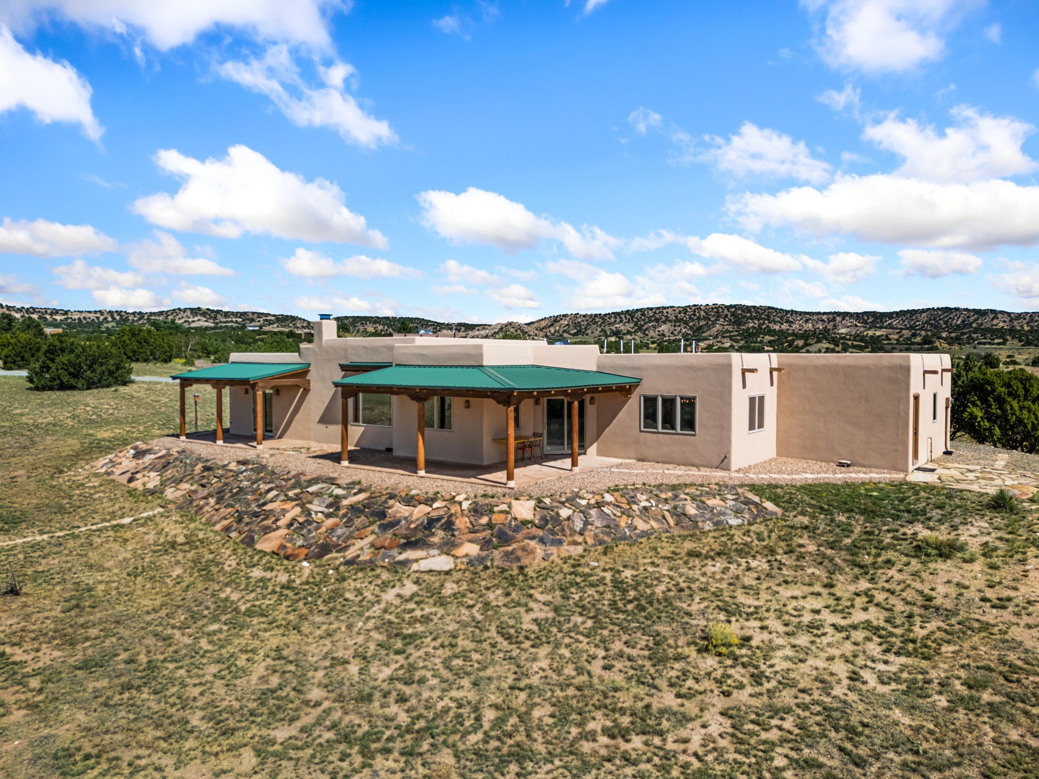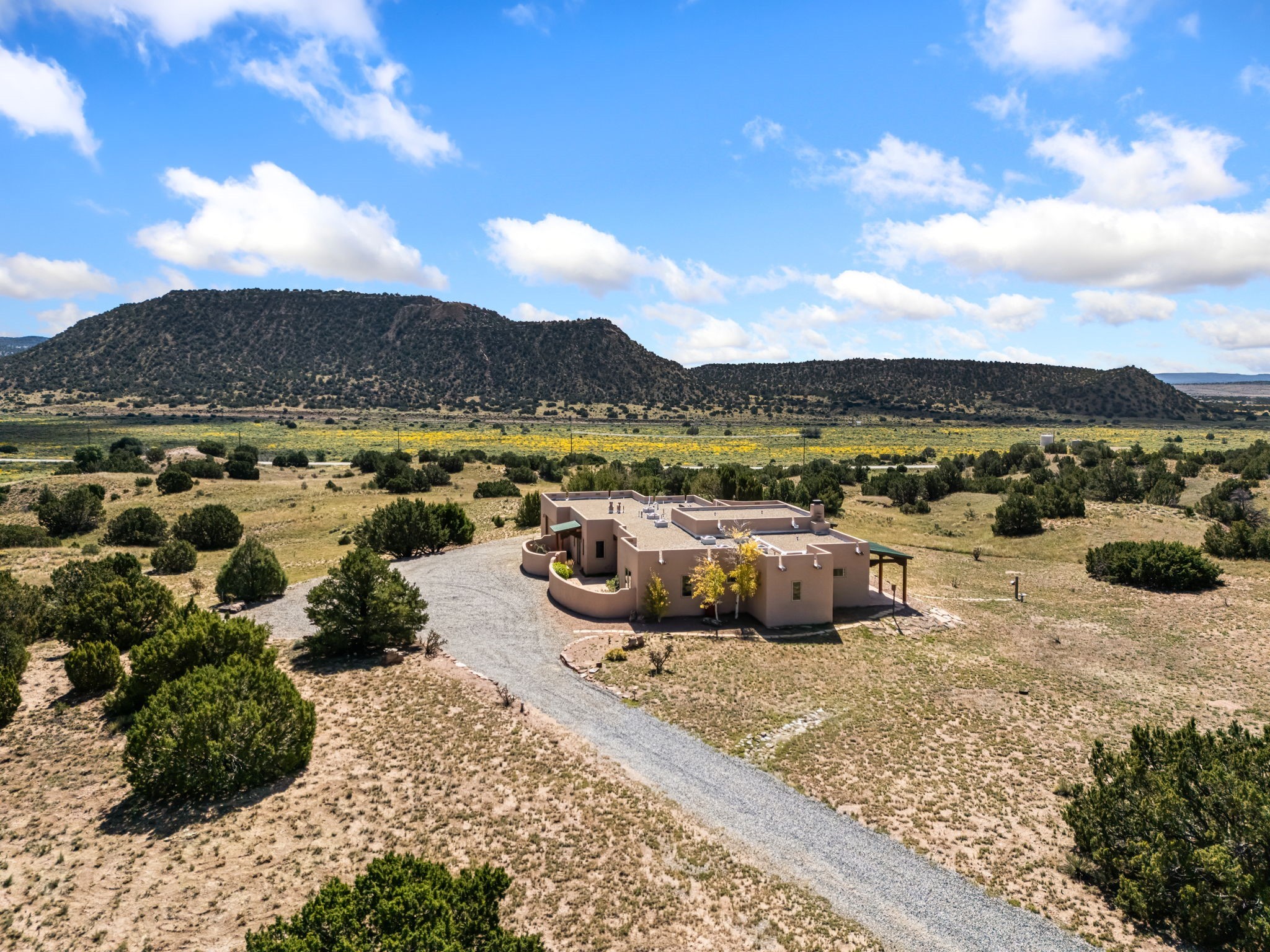 RARE OFFERING IN SPIRIT WIND RANCH! This single-level, passive-solar beauty offers long-range mountain views and privacy. Sited on 5 acres overlooking the Galisteo Basin, Sandia and Ortiz mountains. Radiant heat tubing is WIRSBO. Wonderful kitchen has Taj Mahal counters, bar with seating, two pantries, high-end stainless steel appliances and seating area. Living area has beautiful viga ceilings and wood-burning kiva fireplace. Primary bedroom has a gas fireplace and doors to rear portal. Bath has double sinks, jetted tub, separate shower and walk-in closet. Spacious office/studio space with en-suite 3/4 bath and separate entrance. Property has been pre-inspected and all repairs have been made. Inspection report available on request. Walled front courtyard is on drip with freshly painted gate. Proper laundry with sink and storage. Insulated blinds are all on a remote. Oversized and finished 2-car garage. NO KITEC. NO STEPS. Whole house water filtration - Aguasana. HOA has contract with Farrellgas for reduced rates. Septic has been inspected and lot corners are flagged.