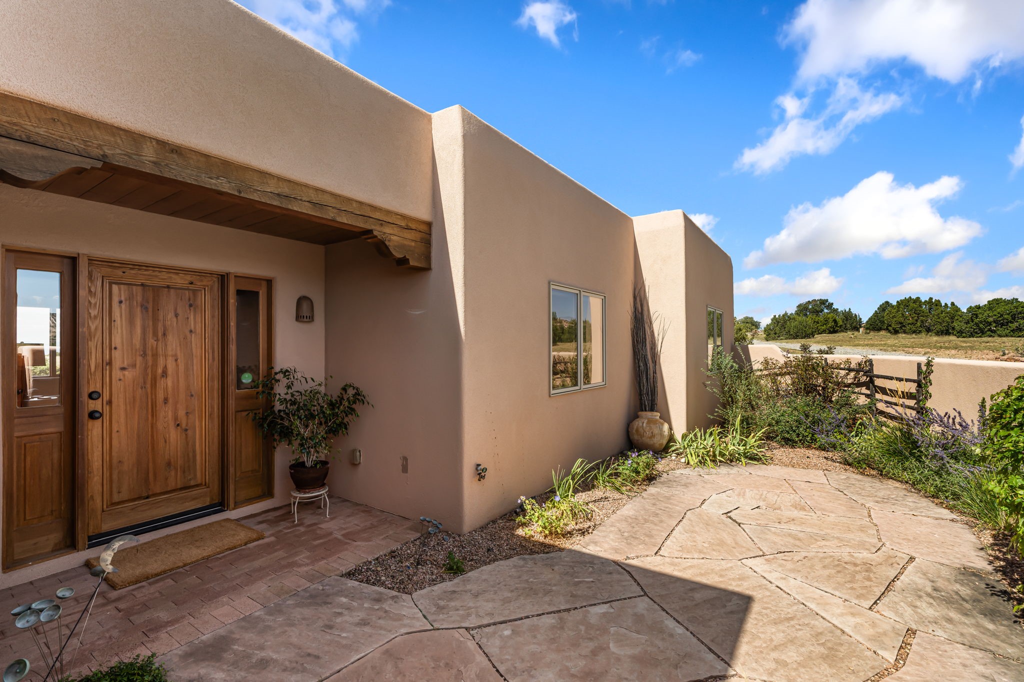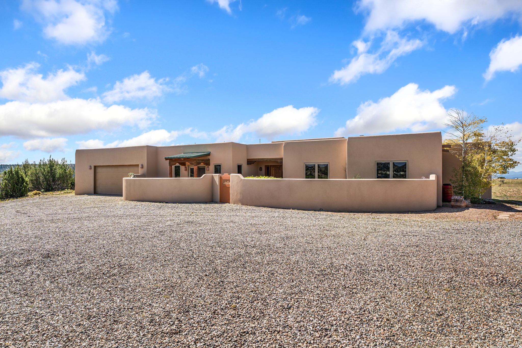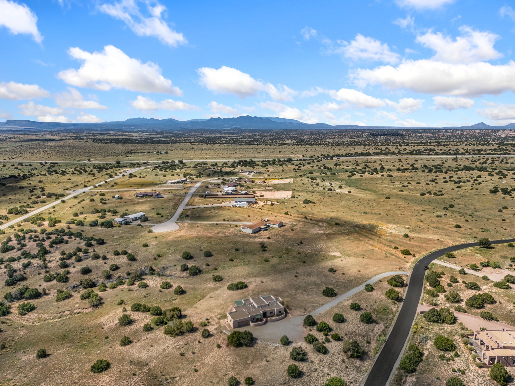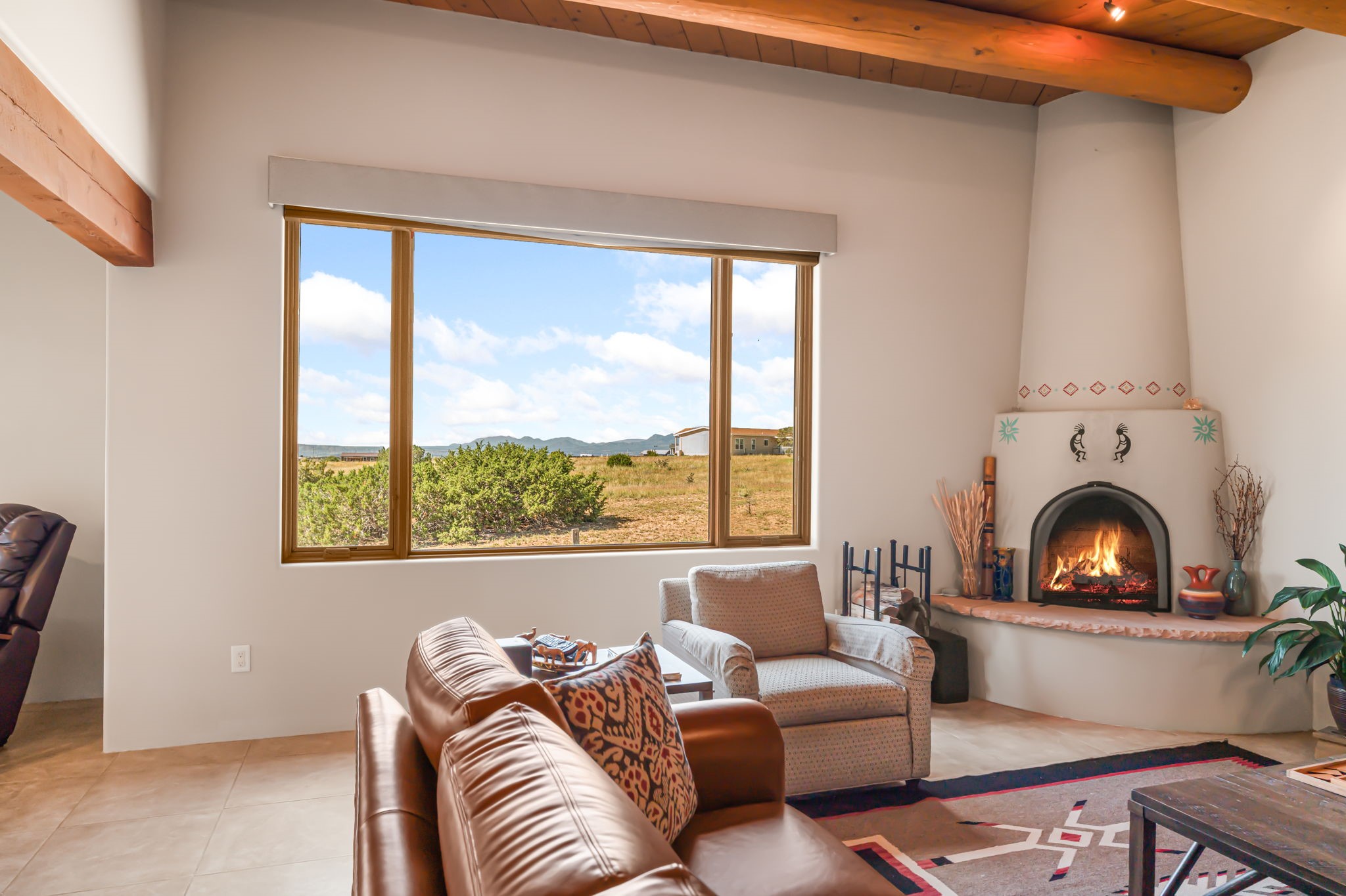 RARE OFFERING IN SPIRIT WIND RANCH! This single-level, passive-solar beauty offers long-range mountain views and privacy. Sited on 5 acres overlooking the Galisteo Basin, Sandia and Ortiz mountains. Radiant heat tubing is WIRSBO. Wonderful kitchen has Taj Mahal counters, bar with seating, two pantries, high-end stainless steel appliances and seating area. Living area has beautiful viga ceilings and wood-burning kiva fireplace. Primary bedroom has a gas fireplace and doors to rear portal. Bath has double sinks, jetted tub, separate shower and walk-in closet. Spacious office/studio space with en-suite 3/4 bath and separate entrance. Property has been pre-inspected and all repairs have been made. Inspection report available on request. Walled front courtyard is on drip with freshly painted gate. Proper laundry with sink and storage. Insulated blinds are all on a remote. Oversized and finished 2-car garage. NO KITEC. NO STEPS. Whole house water filtration - Aguasana. HOA has contract with Farrellgas for reduced rates. Septic has been inspected and lot corners are flagged.