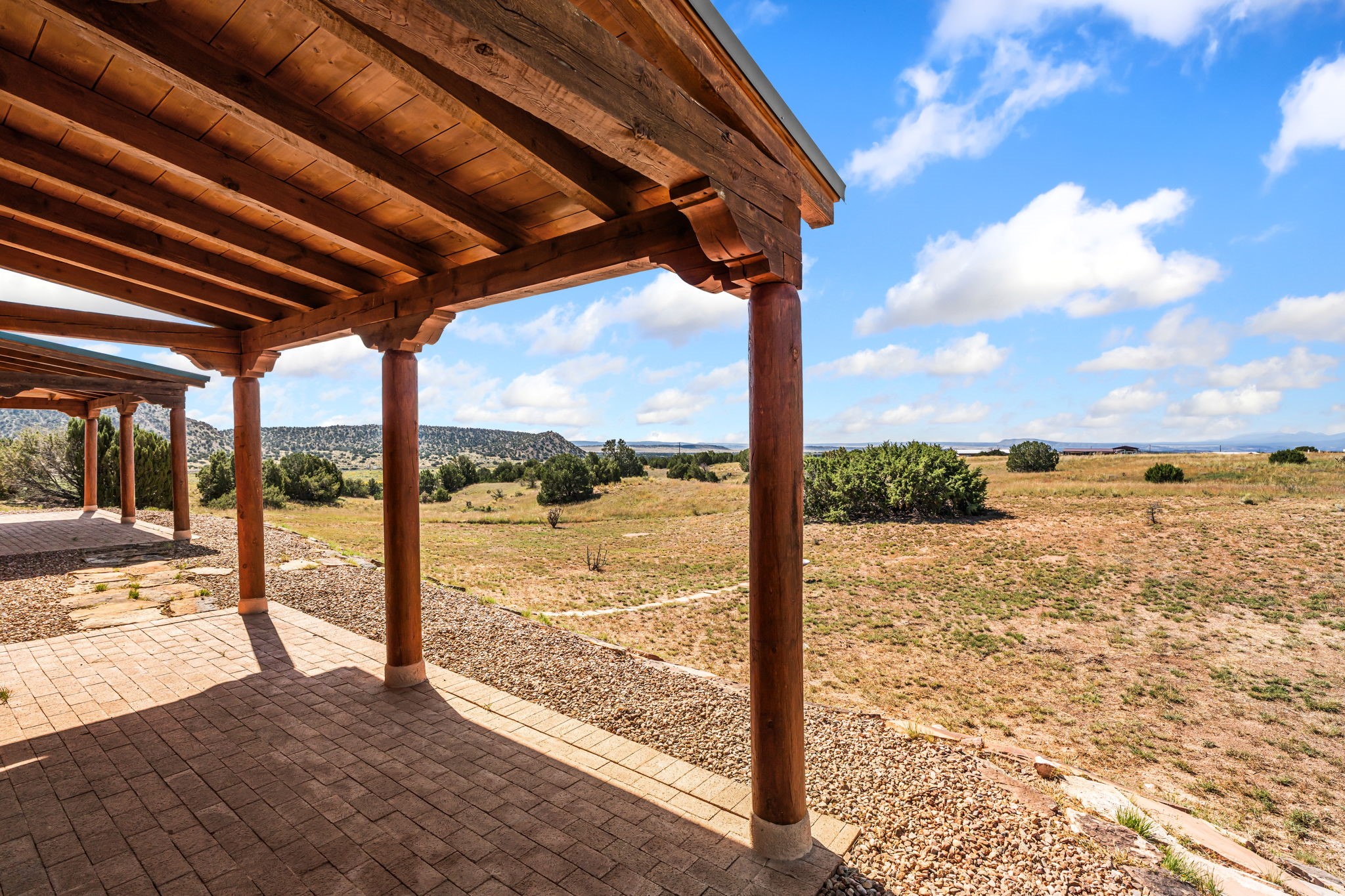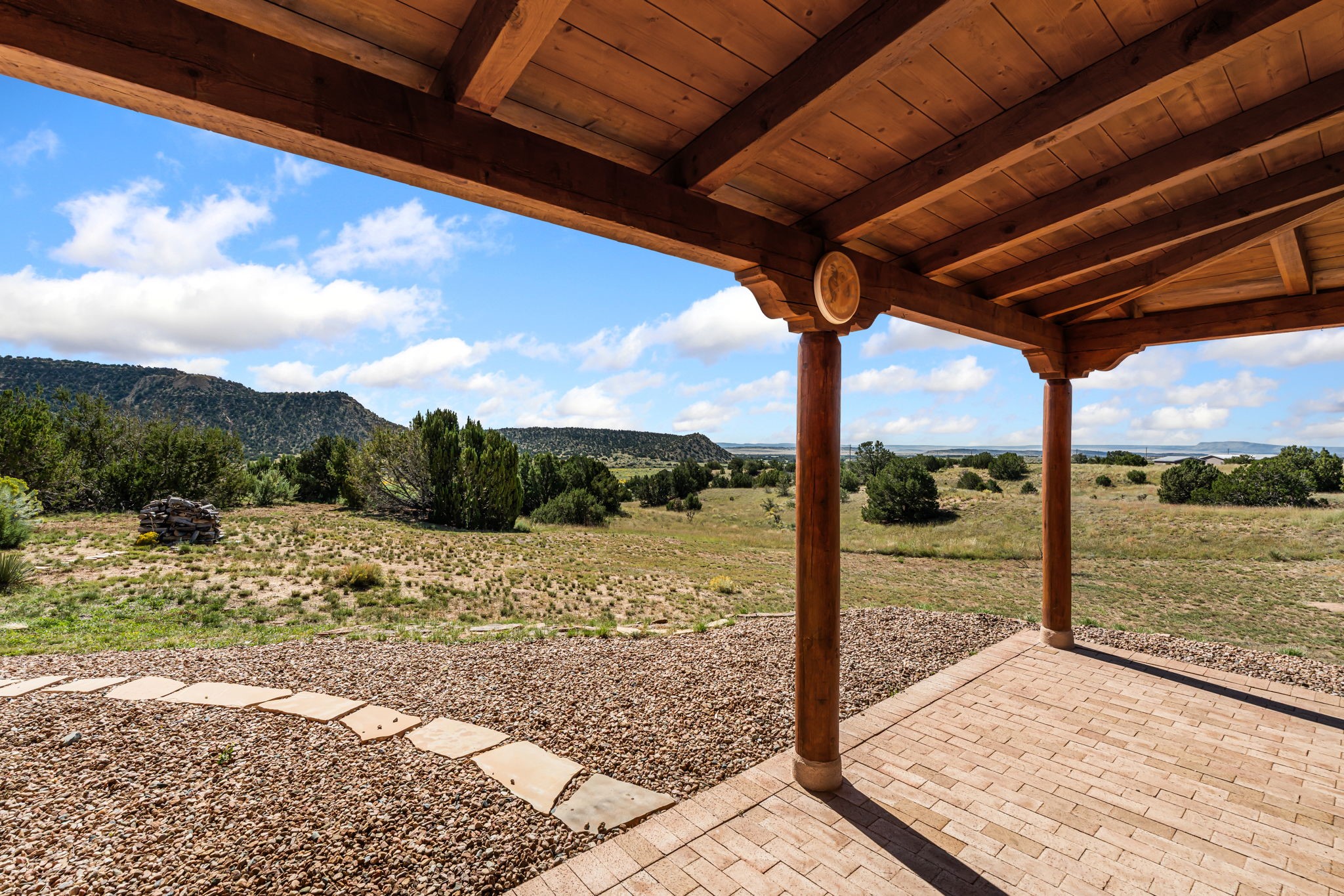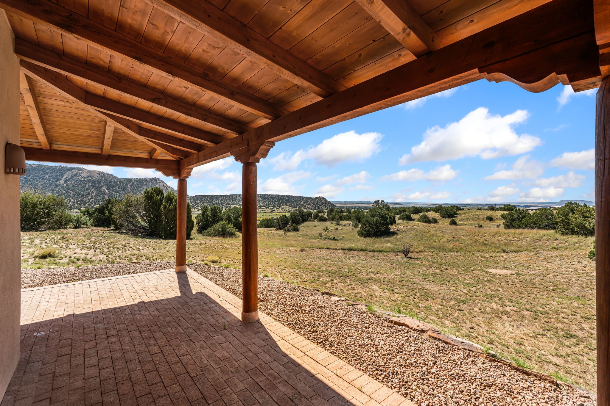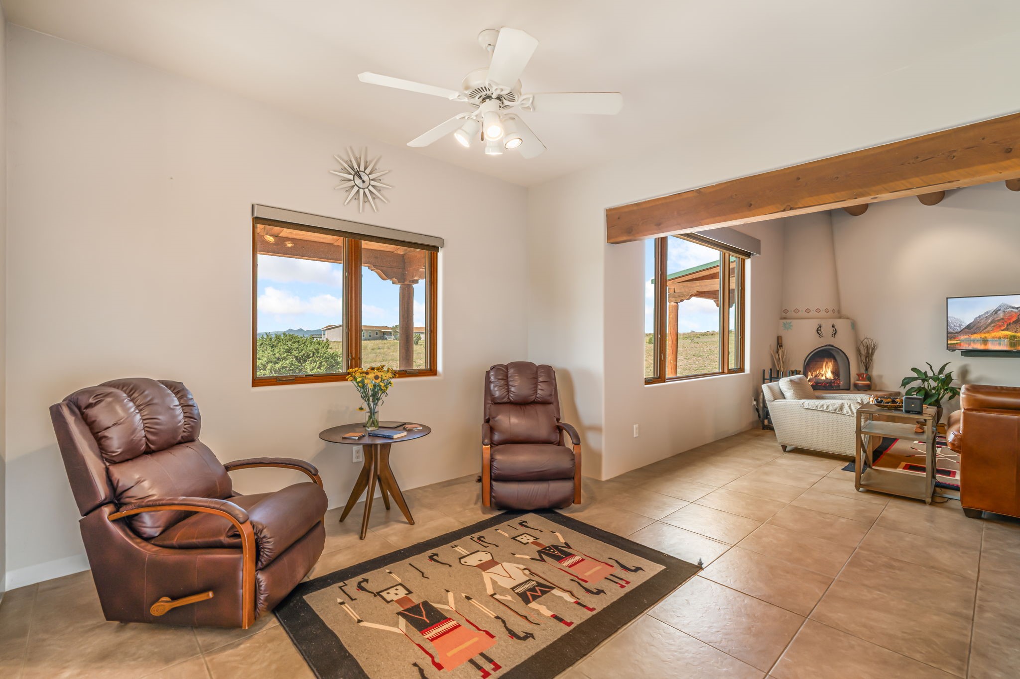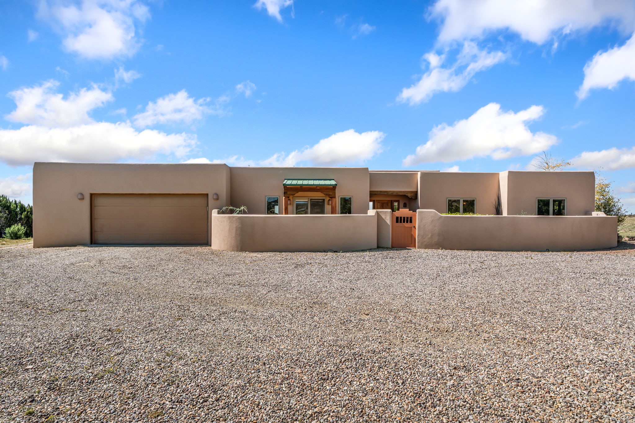 RARE OFFERING IN SPIRIT WIND RANCH! This single-level, passive-solar beauty offers long-range mountain views and privacy. Sited on 5 acres overlooking the Galisteo Basin, Sandia and Ortiz mountains. Radiant heat tubing is WIRSBO. Wonderful kitchen has Taj Mahal counters, bar with seating, two pantries, high-end stainless steel appliances and seating area. Living area has beautiful viga ceilings and wood-burning kiva fireplace. Primary bedroom has a gas fireplace and doors to rear portal. Bath has double sinks, jetted tub, separate shower and walk-in closet. Spacious office/studio space with en-suite 3/4 bath and separate entrance. Property has been pre-inspected and all repairs have been made. Inspection report available on request. Walled front courtyard is on drip with freshly painted gate. Proper laundry with sink and storage. Insulated blinds are all on a remote. Oversized and finished 2-car garage. NO KITEC. NO STEPS. Whole house water filtration - Aguasana. HOA has contract with Farrellgas for reduced rates. Septic has been inspected and lot corners are flagged.