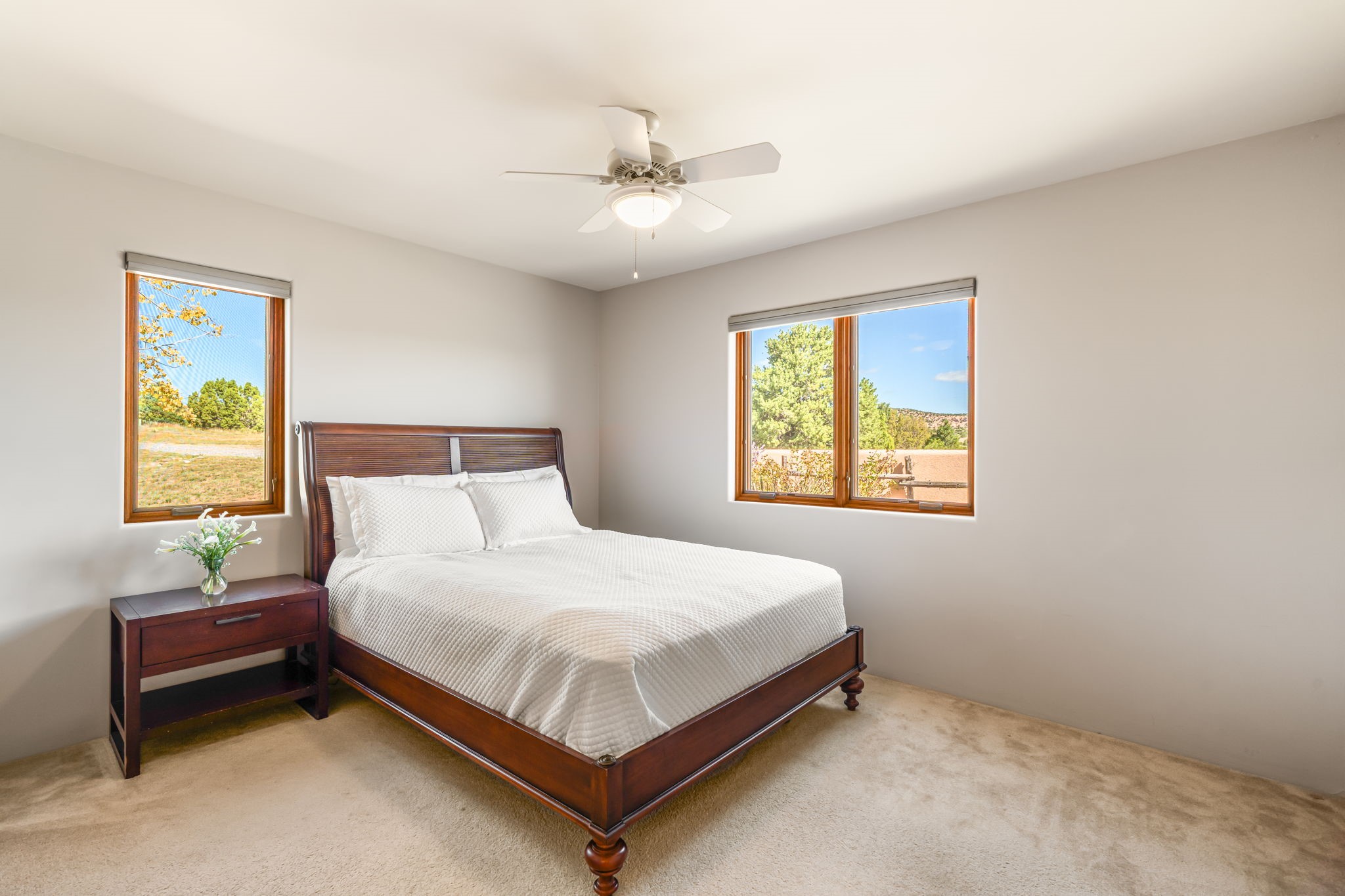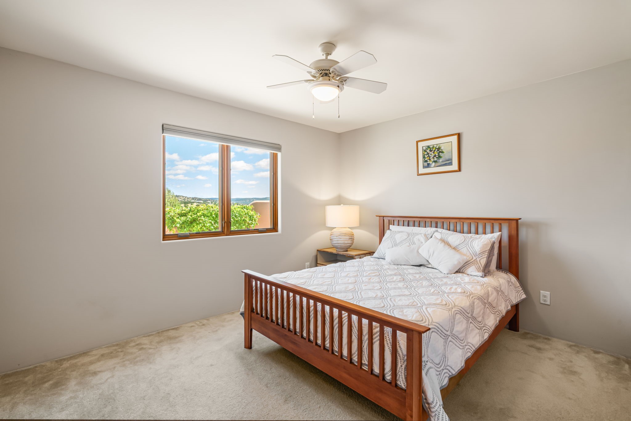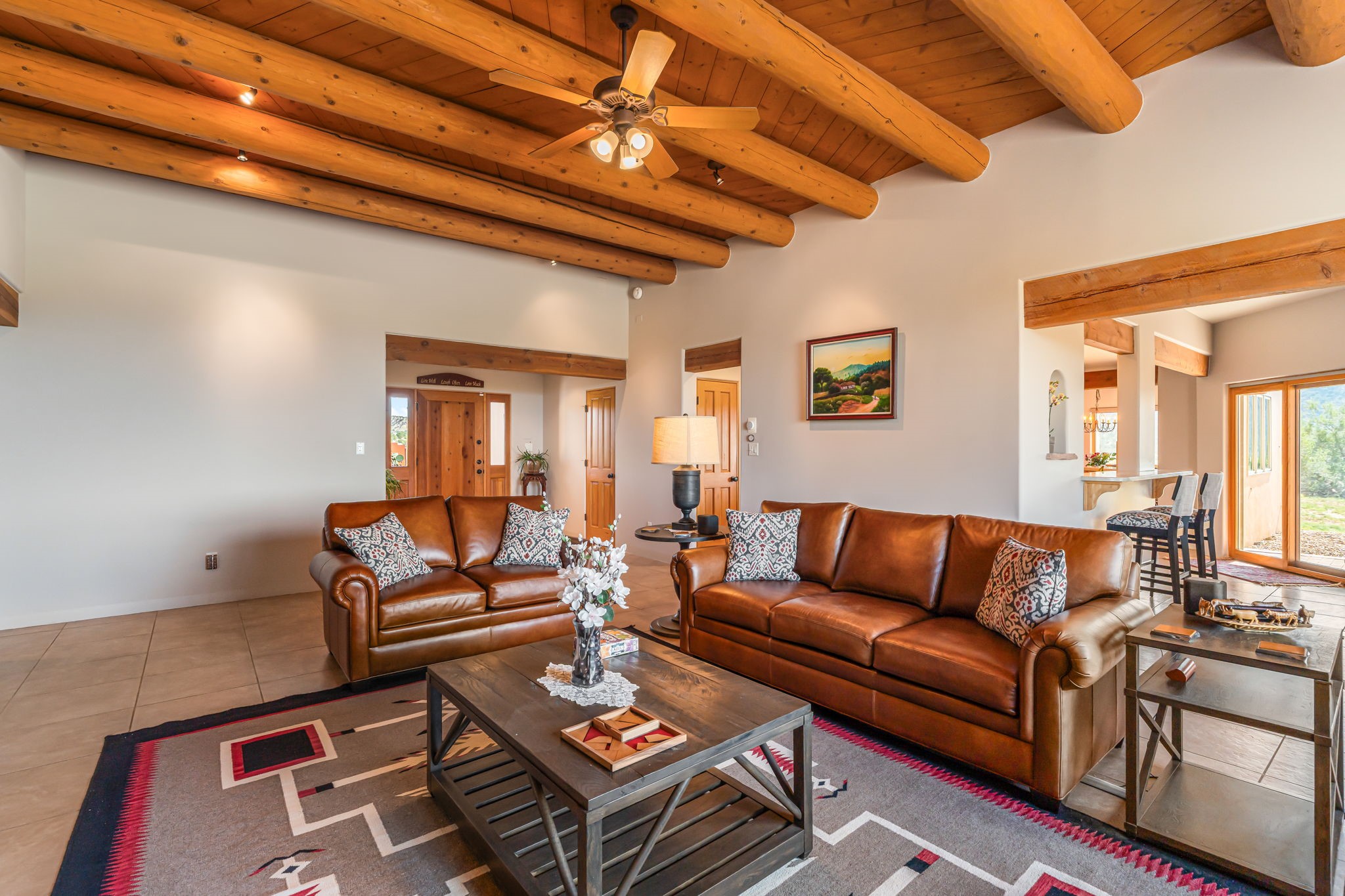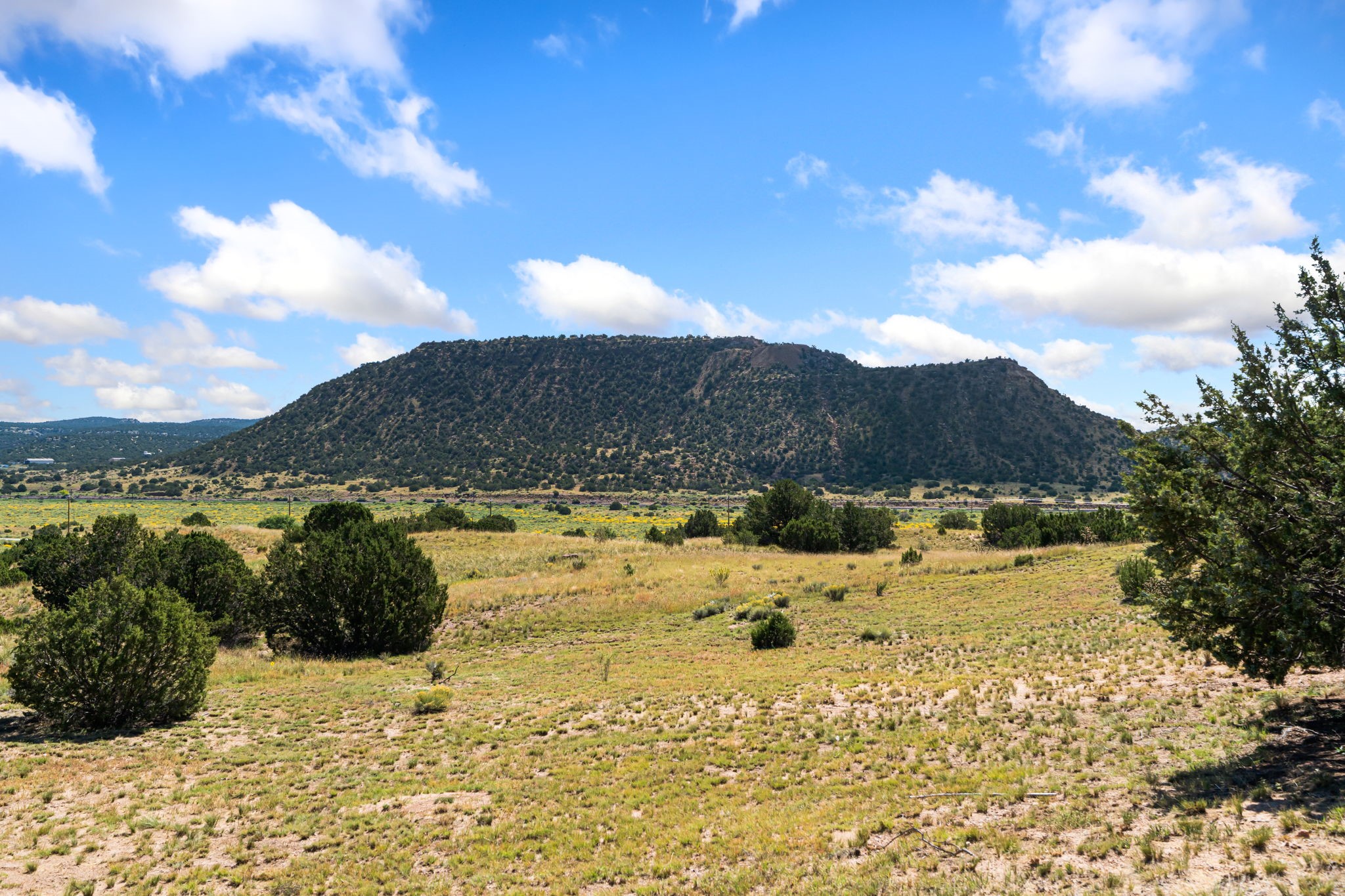 RARE OFFERING IN SPIRIT WIND RANCH! This single-level, passive-solar beauty offers long-range mountain views and privacy. Sited on 5 acres overlooking the Galisteo Basin, Sandia and Ortiz mountains. Radiant heat tubing is WIRSBO. Wonderful kitchen has Taj Mahal counters, bar with seating, two pantries, high-end stainless steel appliances and seating area. Living area has beautiful viga ceilings and wood-burning kiva fireplace. Primary bedroom has a gas fireplace and doors to rear portal. Bath has double sinks, jetted tub, separate shower and walk-in closet. Spacious office/studio space with en-suite 3/4 bath and separate entrance. Property has been pre-inspected and all repairs have been made. Inspection report available on request. Walled front courtyard is on drip with freshly painted gate. Proper laundry with sink and storage. Insulated blinds are all on a remote. Oversized and finished 2-car garage. NO KITEC. NO STEPS. Whole house water filtration - Aguasana. HOA has contract with Farrellgas for reduced rates. Septic has been inspected and lot corners are flagged.