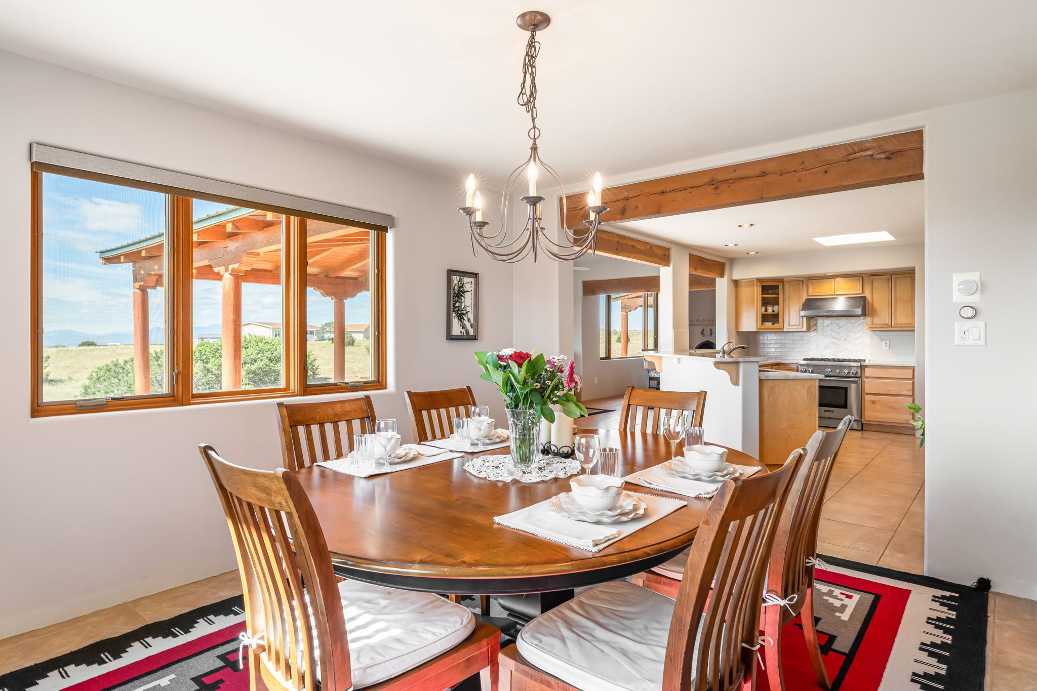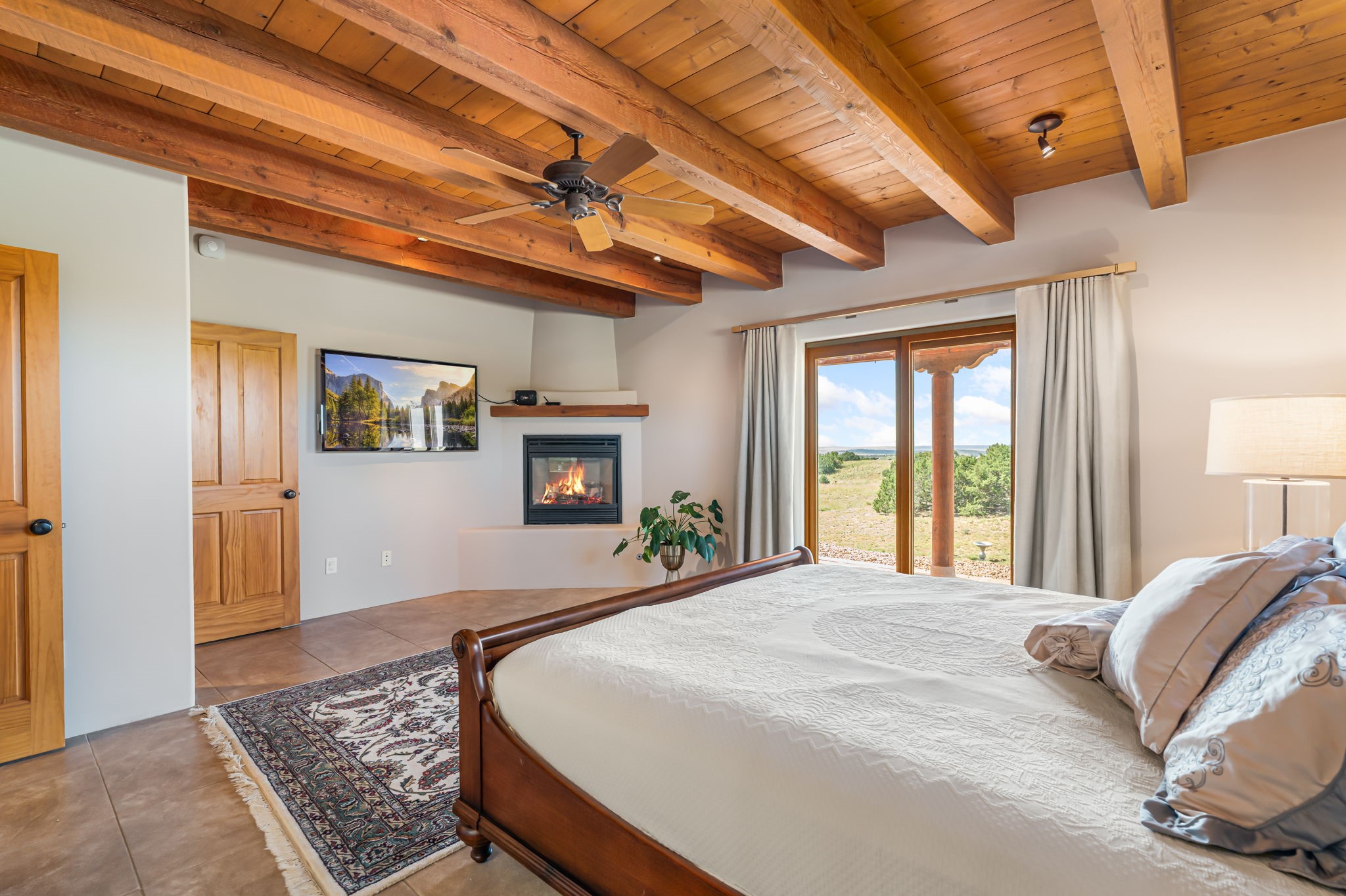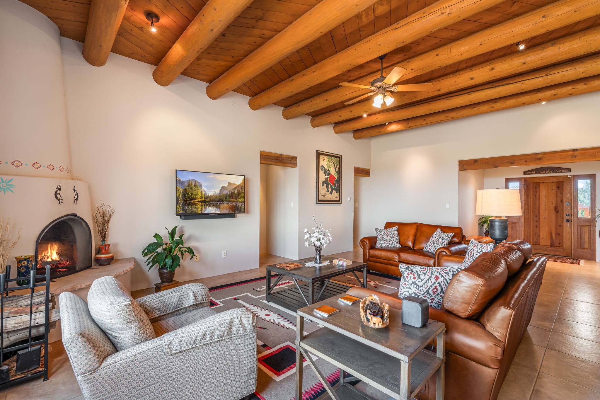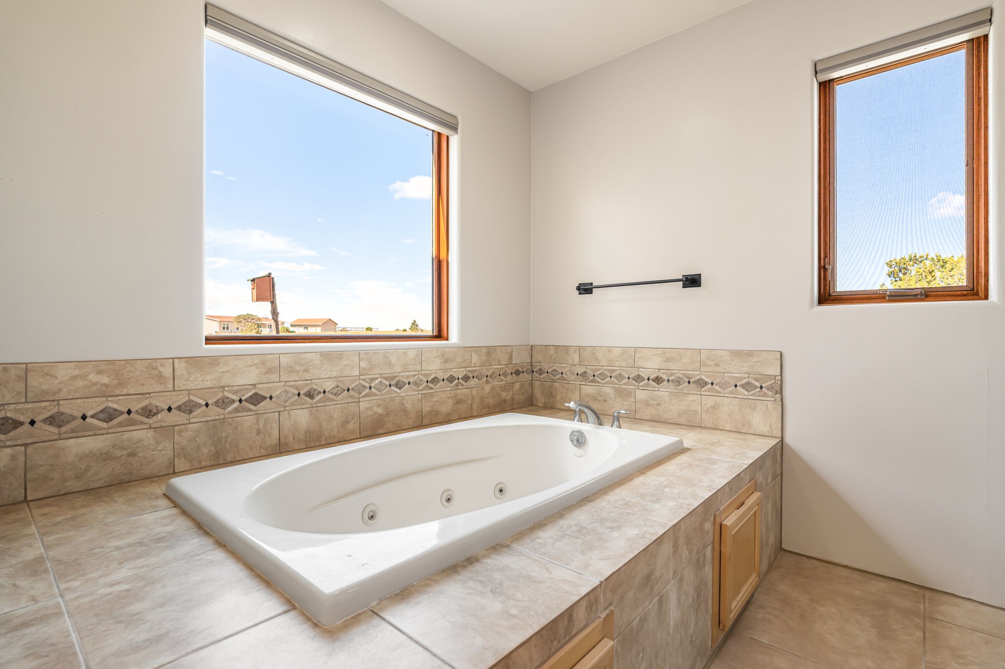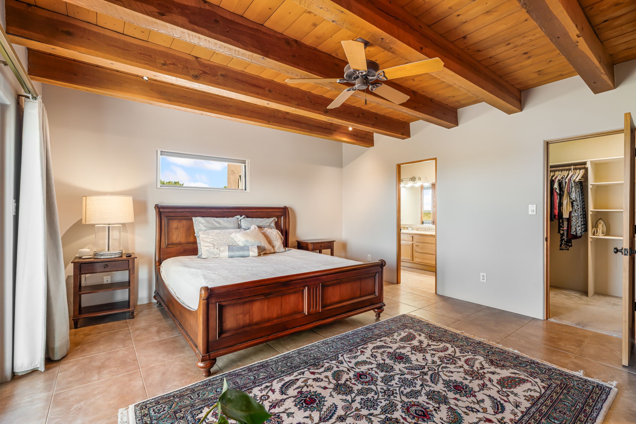 RARE OFFERING IN SPIRIT WIND RANCH! This single-level, passive-solar beauty offers long-range mountain views and privacy. Sited on 5 acres overlooking the Galisteo Basin, Sandia and Ortiz mountains. Radiant heat tubing is WIRSBO. Wonderful kitchen has Taj Mahal counters, bar with seating, two pantries, high-end stainless steel appliances and seating area. Living area has beautiful viga ceilings and wood-burning kiva fireplace. Primary bedroom has a gas fireplace and doors to rear portal. Bath has double sinks, jetted tub, separate shower and walk-in closet. Spacious office/studio space with en-suite 3/4 bath and separate entrance. Property has been pre-inspected and all repairs have been made. Inspection report available on request. Walled front courtyard is on drip with freshly painted gate. Proper laundry with sink and storage. Insulated blinds are all on a remote. Oversized and finished 2-car garage. NO KITEC. NO STEPS. Whole house water filtration - Aguasana. HOA has contract with Farrellgas for reduced rates. Septic has been inspected and lot corners are flagged.