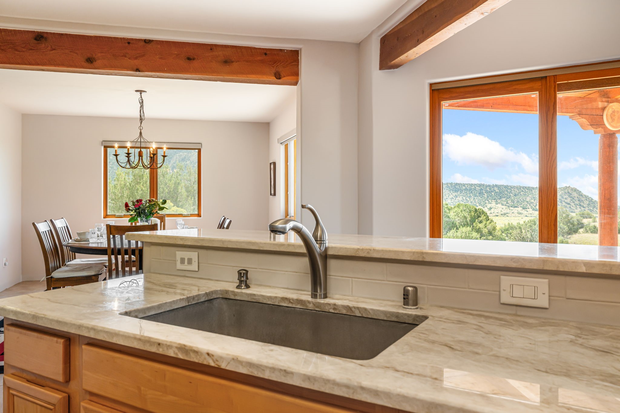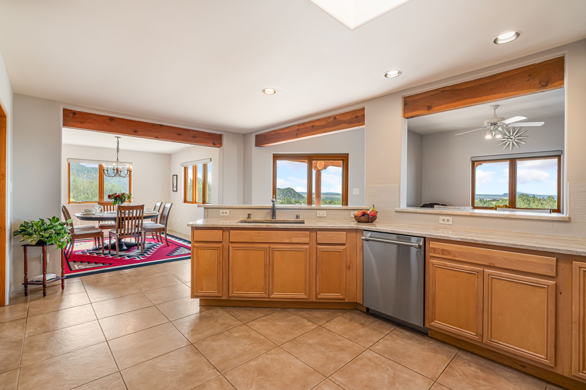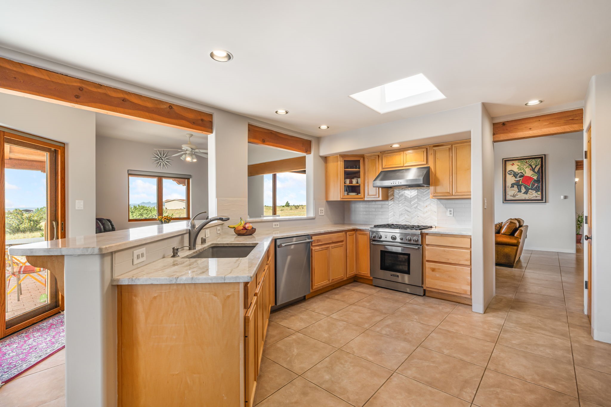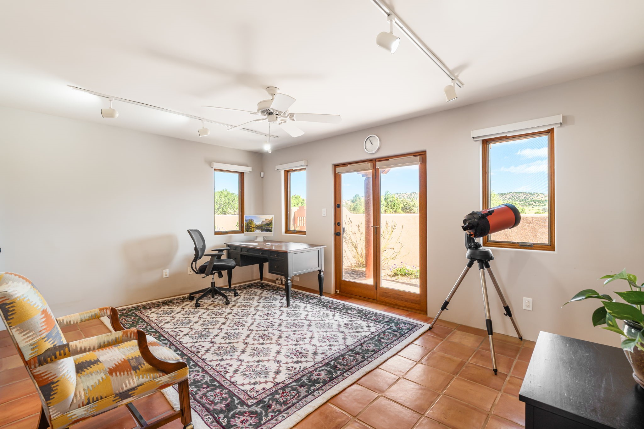 RARE OFFERING IN SPIRIT WIND RANCH! This single-level, passive-solar beauty offers long-range mountain views and privacy. Sited on 5 acres overlooking the Galisteo Basin, Sandia and Ortiz mountains. Radiant heat tubing is WIRSBO. Wonderful kitchen has Taj Mahal counters, bar with seating, two pantries, high-end stainless steel appliances and seating area. Living area has beautiful viga ceilings and wood-burning kiva fireplace. Primary bedroom has a gas fireplace and doors to rear portal. Bath has double sinks, jetted tub, separate shower and walk-in closet. Spacious office/studio space with en-suite 3/4 bath and separate entrance. Property has been pre-inspected and all repairs have been made. Inspection report available on request. Walled front courtyard is on drip with freshly painted gate. Proper laundry with sink and storage. Insulated blinds are all on a remote. Oversized and finished 2-car garage. NO KITEC. NO STEPS. Whole house water filtration - Aguasana. HOA has contract with Farrellgas for reduced rates. Septic has been inspected and lot corners are flagged.