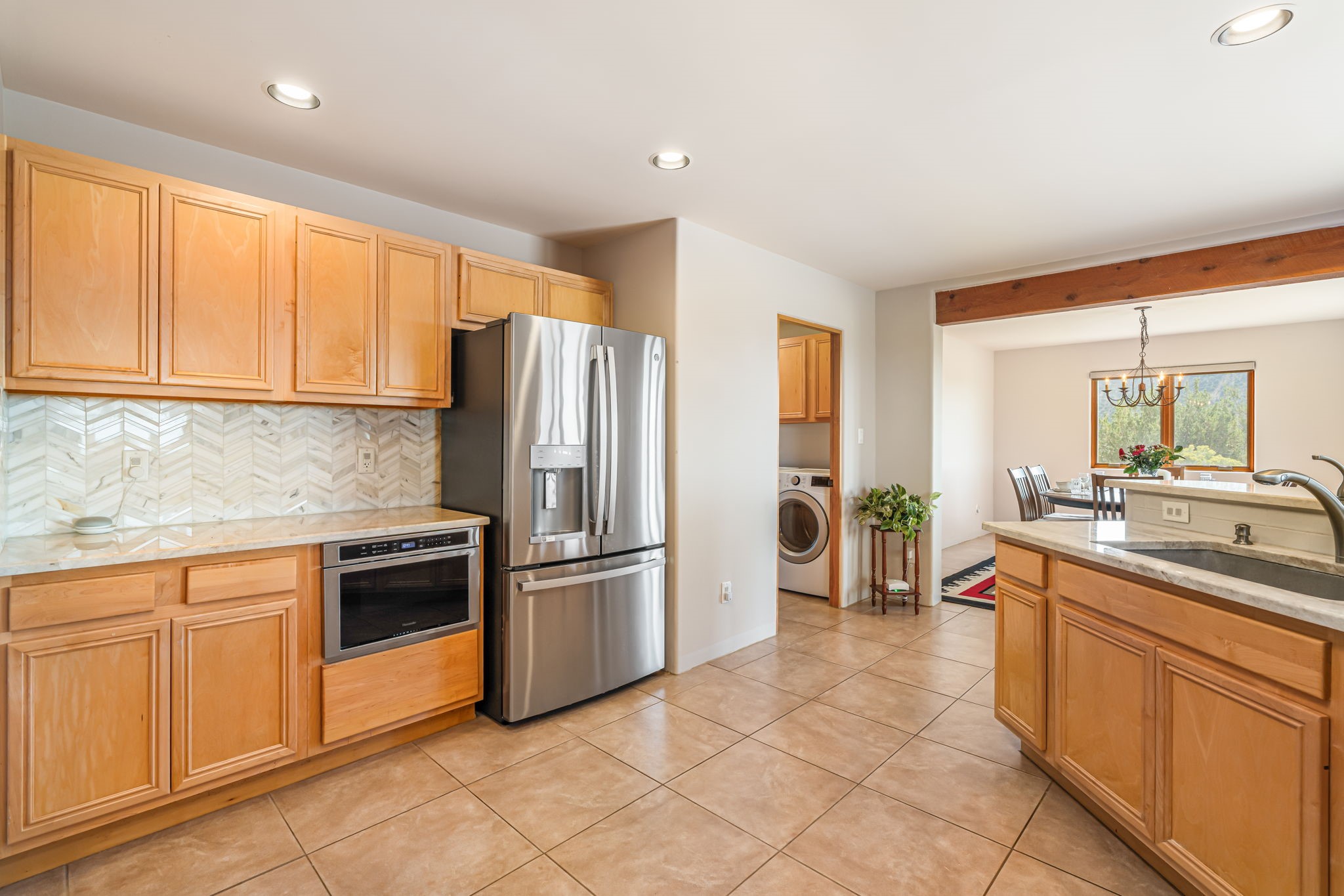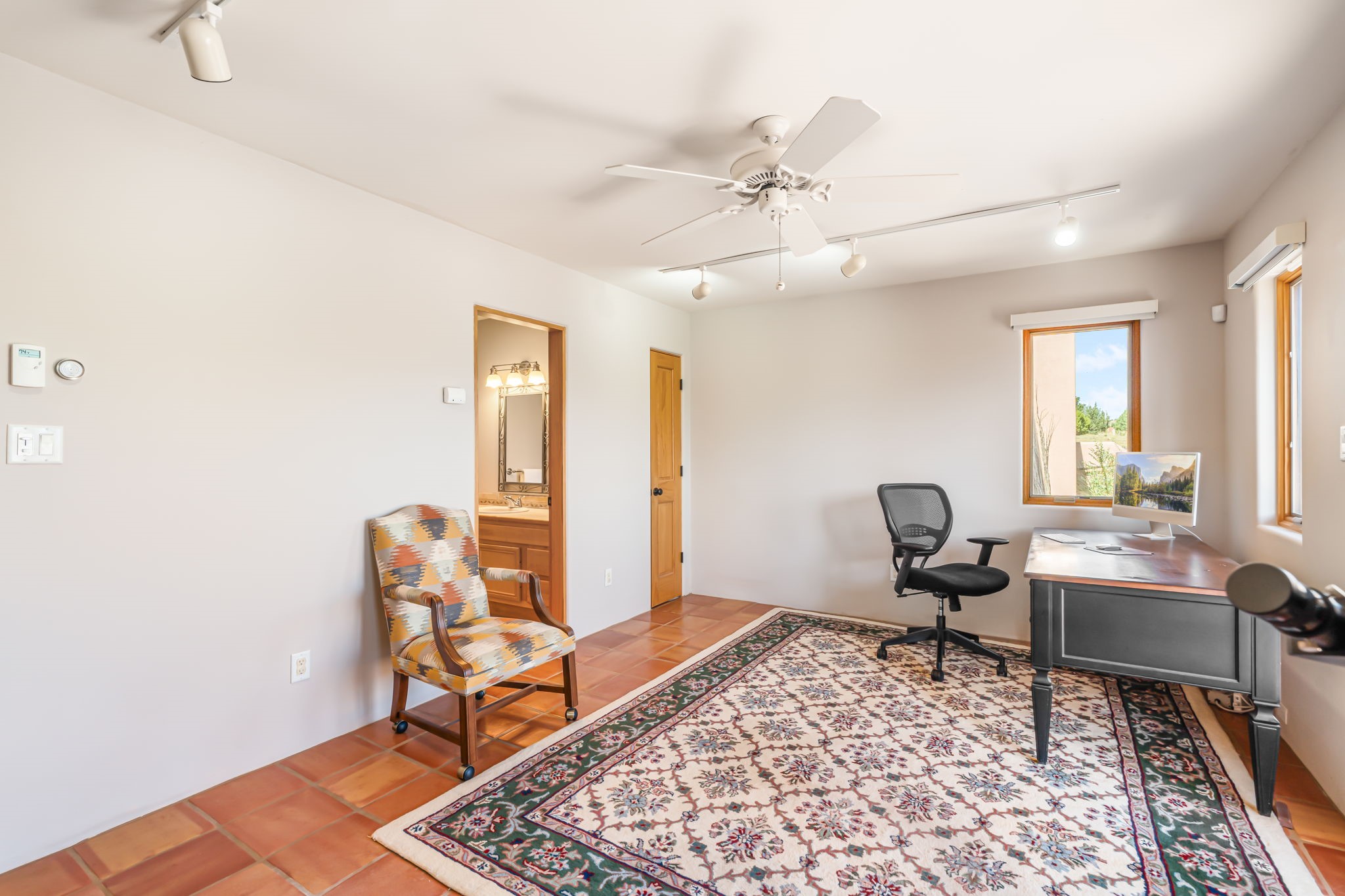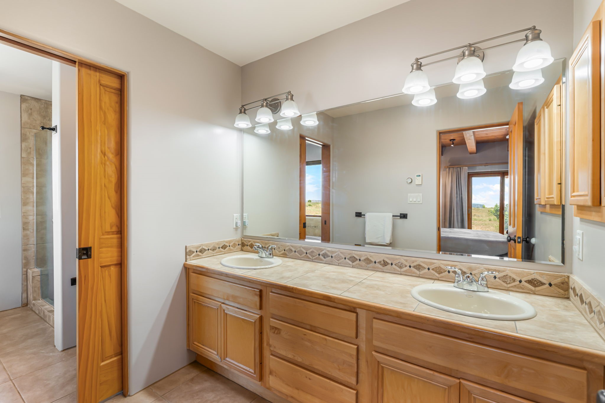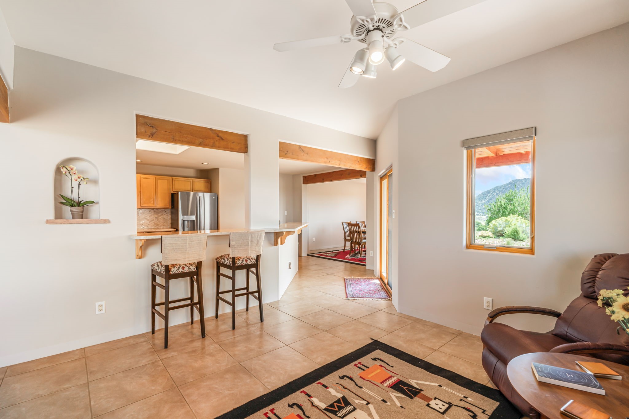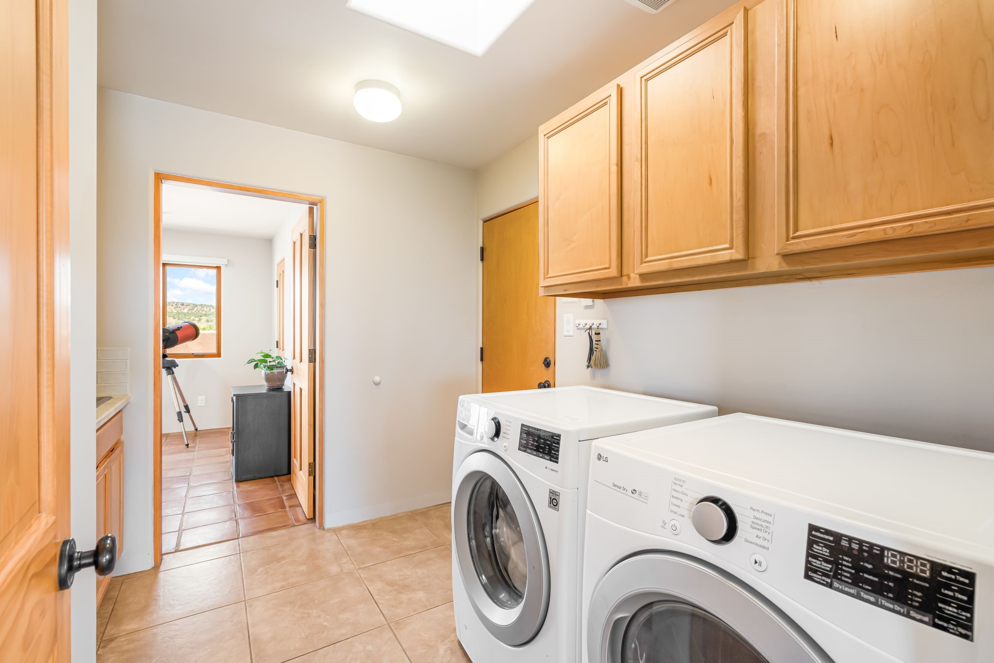 RARE OFFERING IN SPIRIT WIND RANCH! This single-level, passive-solar beauty offers long-range mountain views and privacy. Sited on 5 acres overlooking the Galisteo Basin, Sandia and Ortiz mountains. Radiant heat tubing is WIRSBO. Wonderful kitchen has Taj Mahal counters, bar with seating, two pantries, high-end stainless steel appliances and seating area. Living area has beautiful viga ceilings and wood-burning kiva fireplace. Primary bedroom has a gas fireplace and doors to rear portal. Bath has double sinks, jetted tub, separate shower and walk-in closet. Spacious office/studio space with en-suite 3/4 bath and separate entrance. Property has been pre-inspected and all repairs have been made. Inspection report available on request. Walled front courtyard is on drip with freshly painted gate. Proper laundry with sink and storage. Insulated blinds are all on a remote. Oversized and finished 2-car garage. NO KITEC. NO STEPS. Whole house water filtration - Aguasana. HOA has contract with Farrellgas for reduced rates. Septic has been inspected and lot corners are flagged.