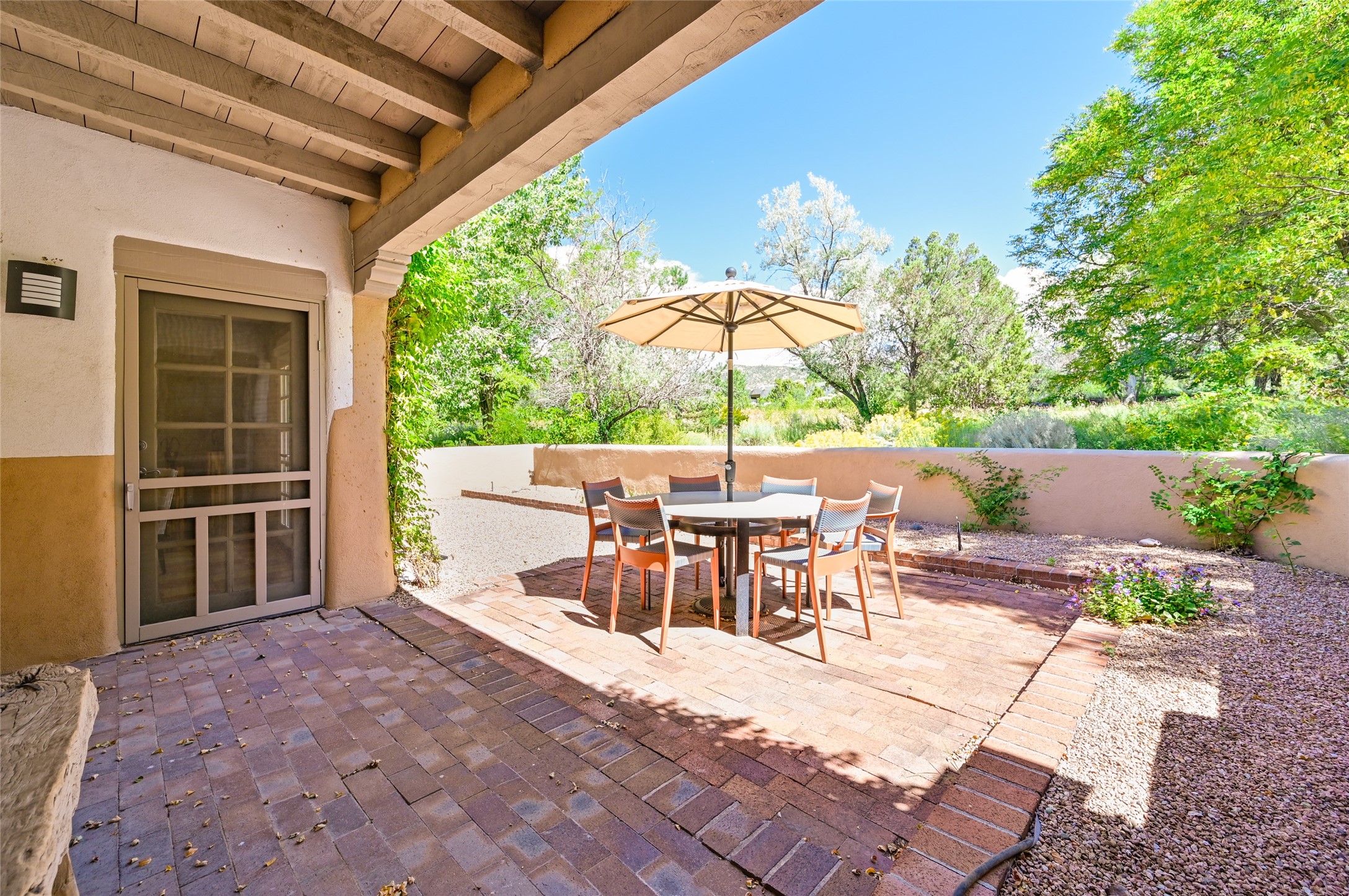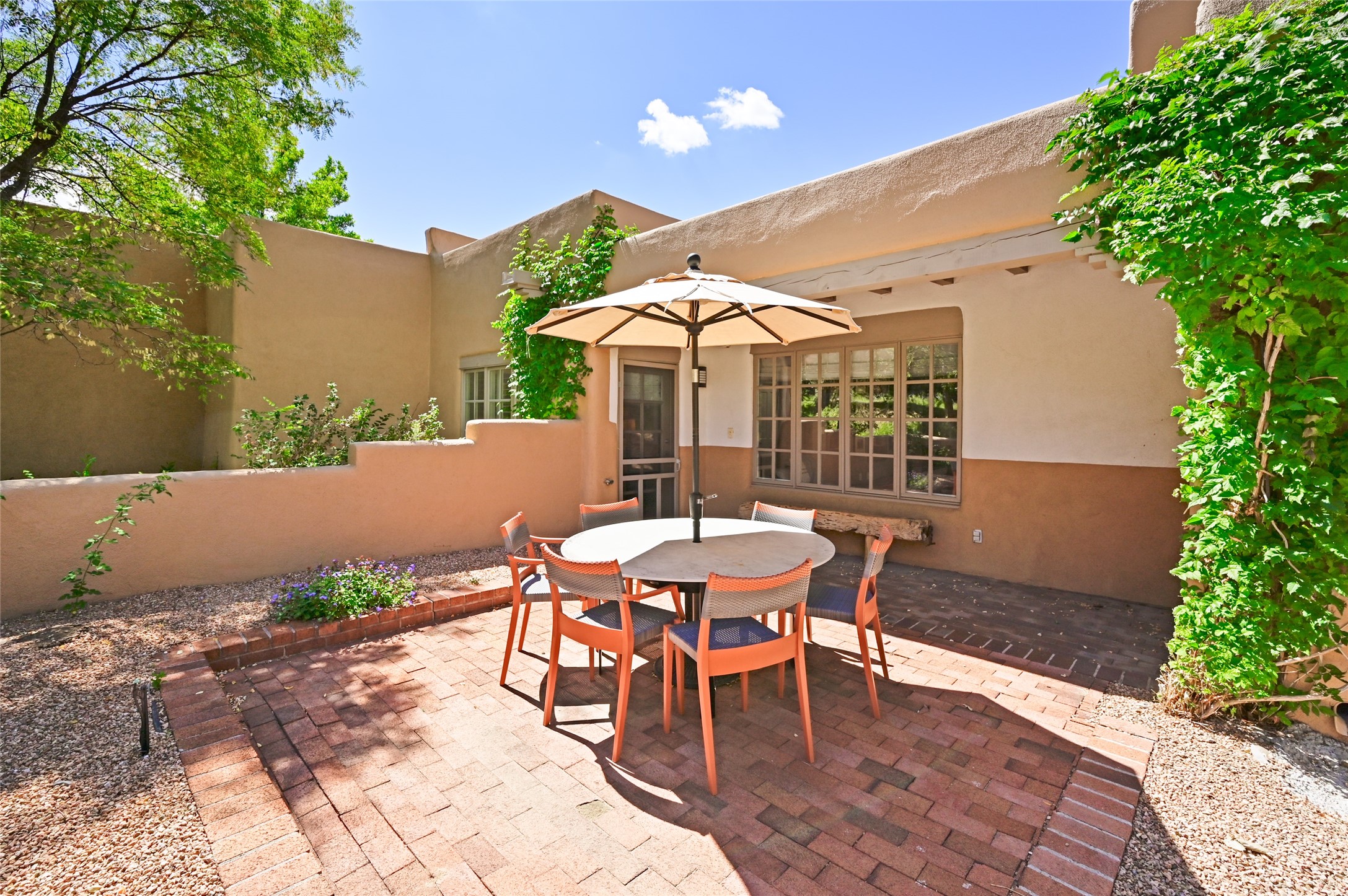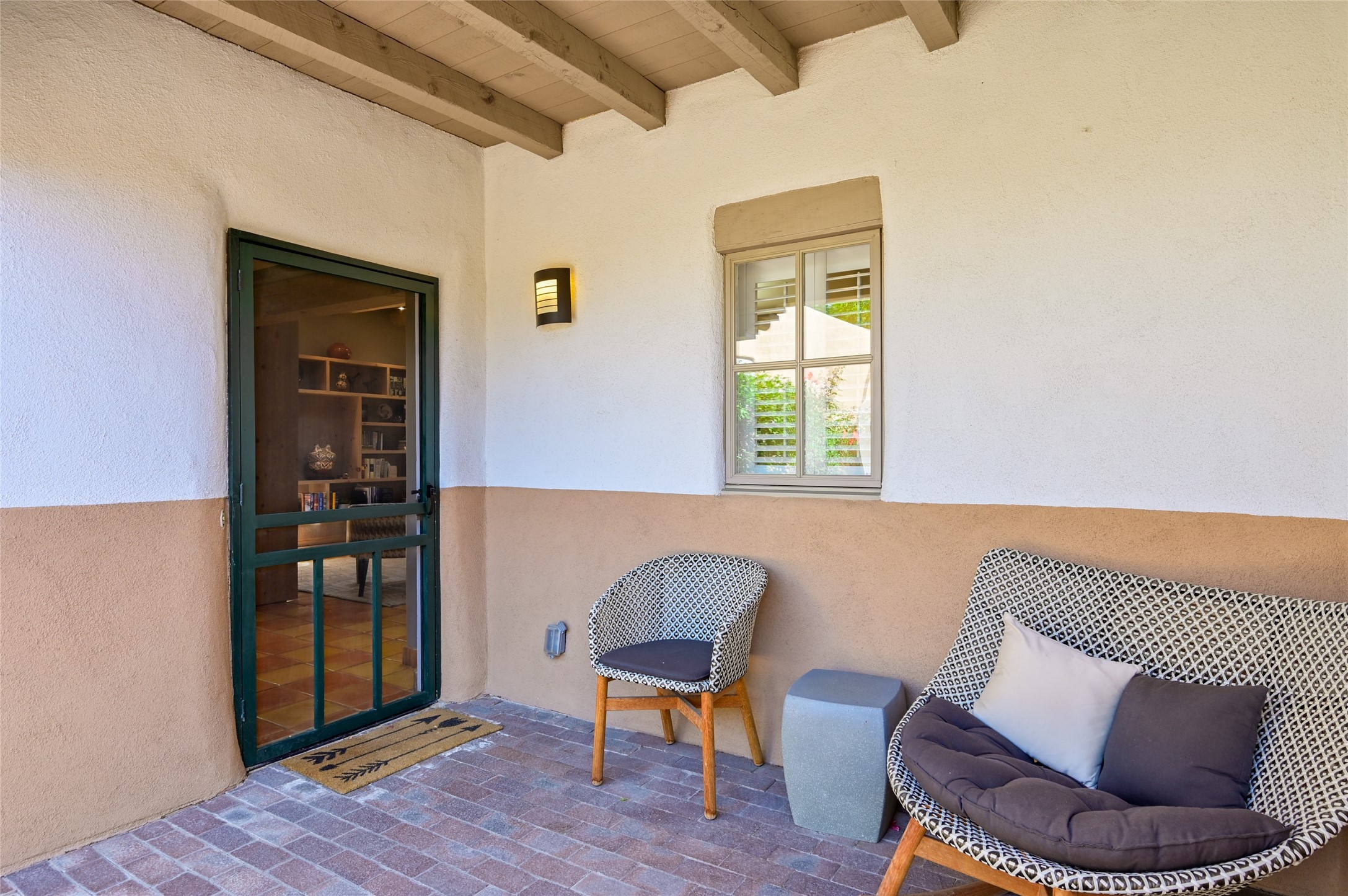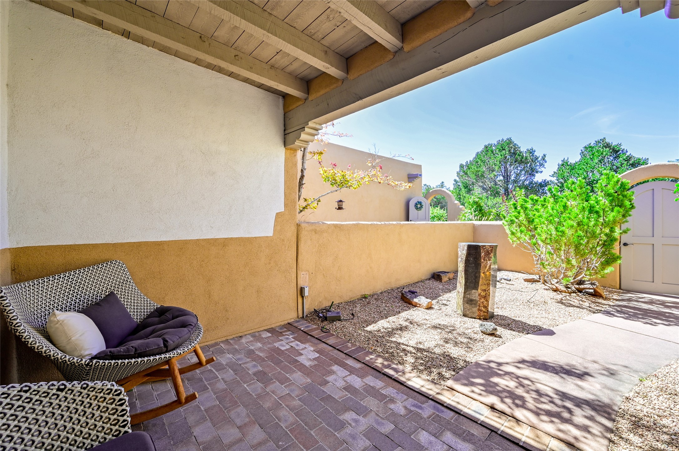 A rare opportunity to own the sought-after Casita floor plan in the Quail Run community! Enter through the gated courtyard, where a gentle water feature, lush landscaping, and a covered seating area create an immediate sense of welcome.Inside, you'll find two bedrooms, two baths, classic Vigas, Saltillo tile floors, and a traditional Kiva fireplace that sets a warm, authentic Santa Fe tone. Skylights fill the home with natural light, and the single-level, no-steps layout enhances comfort and ease of living.The spacious living room features beautifully handcrafted wood built-ins and ample wall space for art. The kitchen includes updated granite counters, a stylish backsplash, stainless steel appliances, a gas stove, and generous cabinetry with copper edging for both storage and character.The primary suite is its own private retreat, offering a custom barn door, window shutters, and access to the back courtyard. The updated adjoining bath features a nicely sized closet and a large vanity. The dining room opens onto a back patio overlooking wide-open green space, with brick detailing, vigas, lush landscaping, and charming corbels -- a private sanctuary for relaxing or entertaining.A spacious two-car garage provides additional storage and convenience.Ownership at Quail Run includes exceptional amenities: 24-hour hosted security, state-of-the-art fitness facilities, a swimming pool, golf, pickleball, fitness classes, social events, and an on-site restaurant. Come see why this special home at Quail Run offers the perfect blend of Santa Fe style and resort-style living.