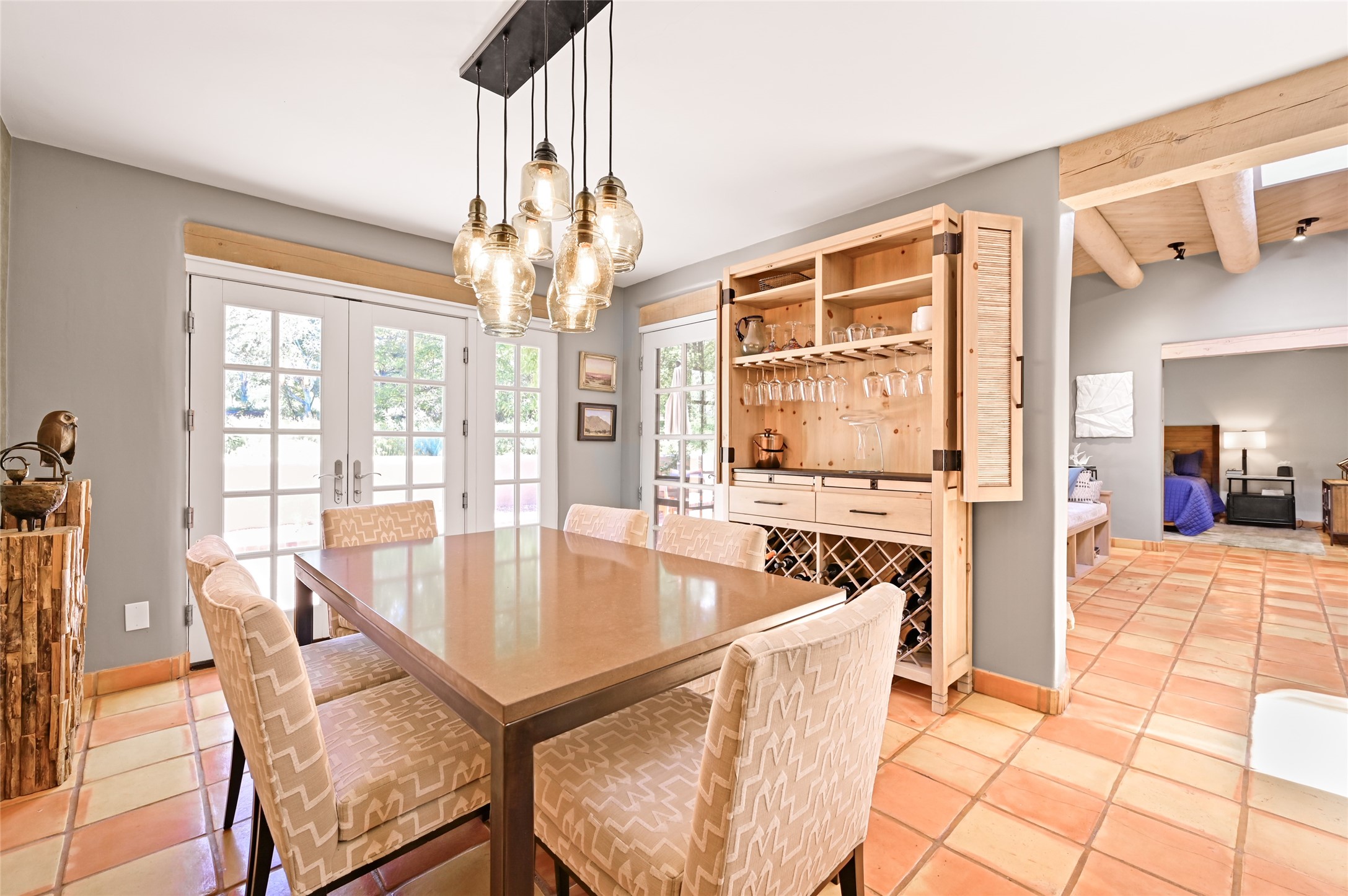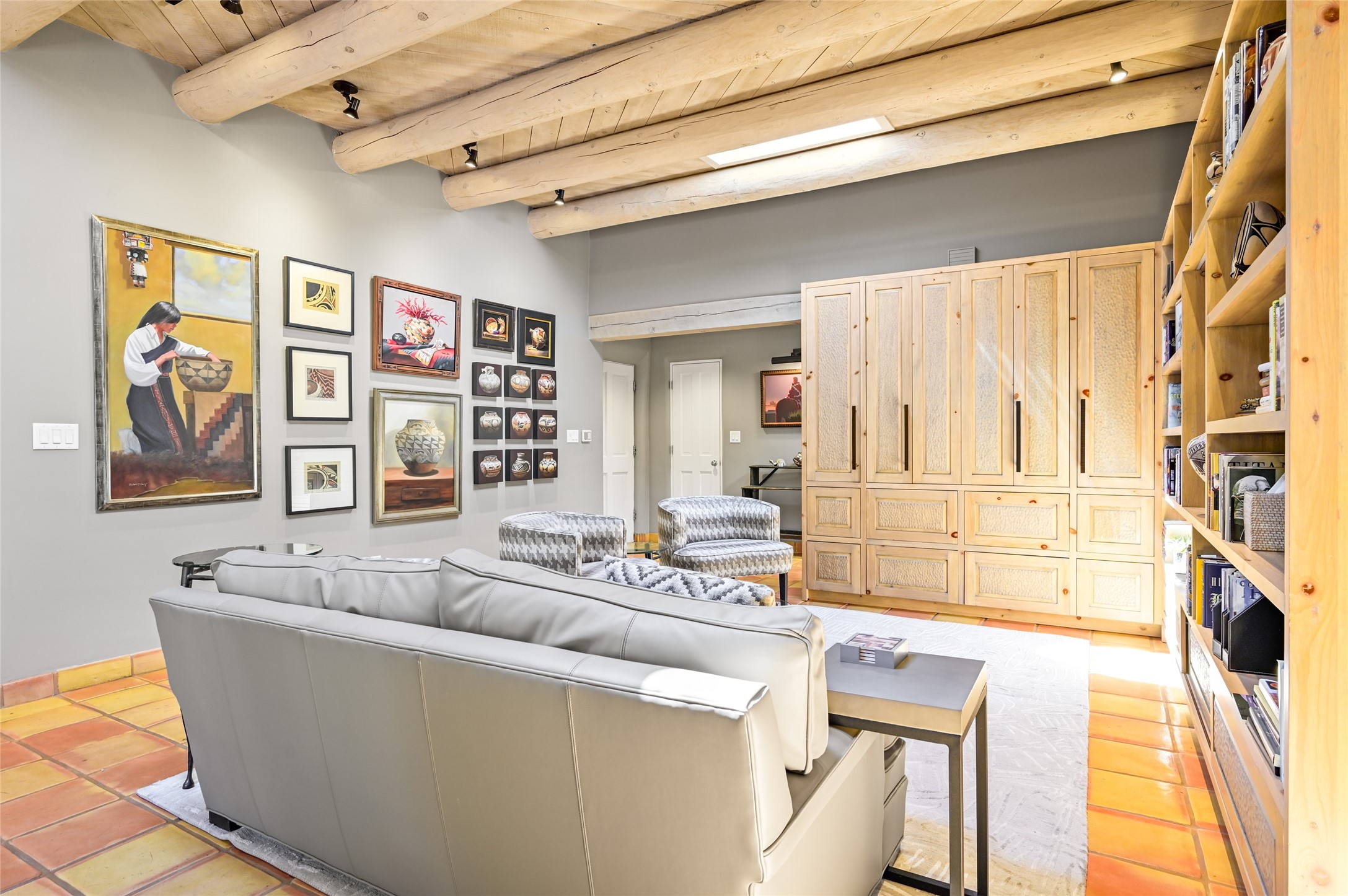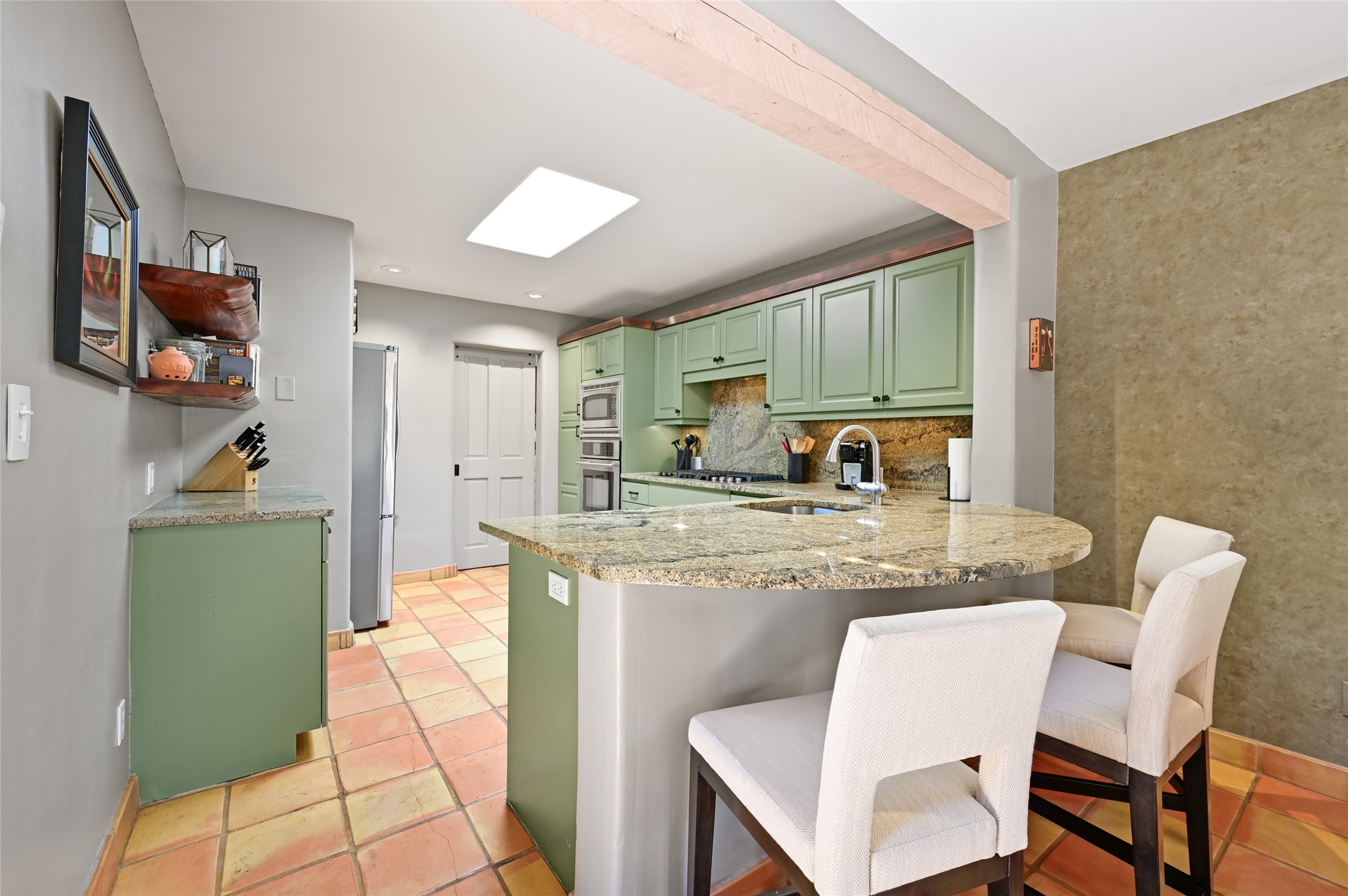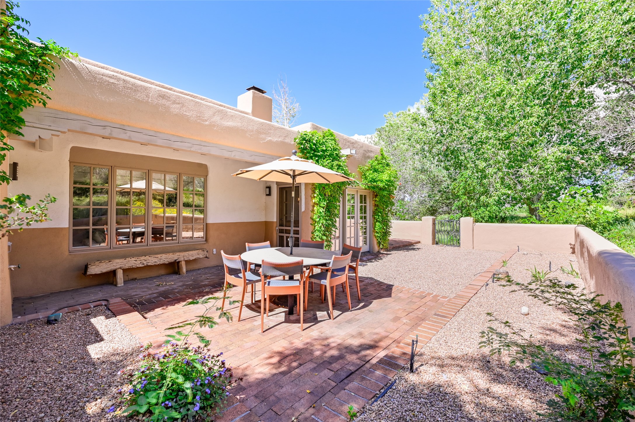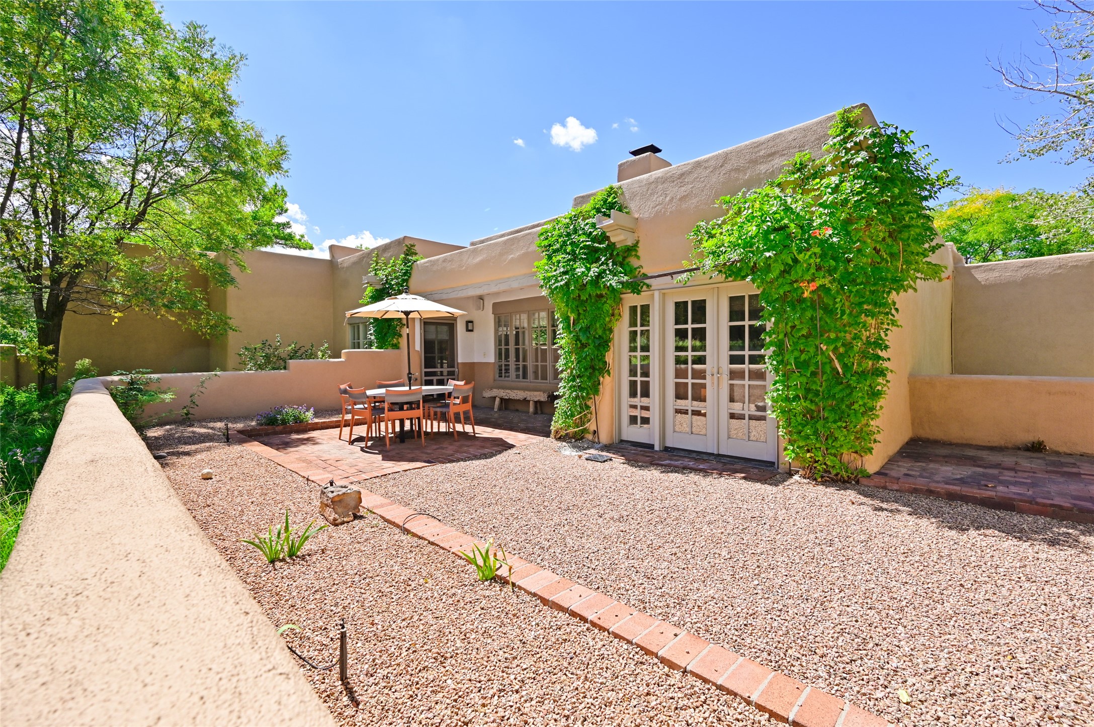 A rare opportunity to own the sought-after Casita floor plan in the Quail Run community! Enter through the gated courtyard, where a gentle water feature, lush landscaping, and a covered seating area create an immediate sense of welcome.Inside, you'll find two bedrooms, two baths, classic Vigas, Saltillo tile floors, and a traditional Kiva fireplace that sets a warm, authentic Santa Fe tone. Skylights fill the home with natural light, and the single-level, no-steps layout enhances comfort and ease of living.The spacious living room features beautifully handcrafted wood built-ins and ample wall space for art. The kitchen includes updated granite counters, a stylish backsplash, stainless steel appliances, a gas stove, and generous cabinetry with copper edging for both storage and character.The primary suite is its own private retreat, offering a custom barn door, window shutters, and access to the back courtyard. The updated adjoining bath features a nicely sized closet and a large vanity. The dining room opens onto a back patio overlooking wide-open green space, with brick detailing, vigas, lush landscaping, and charming corbels -- a private sanctuary for relaxing or entertaining.A spacious two-car garage provides additional storage and convenience.Ownership at Quail Run includes exceptional amenities: 24-hour hosted security, state-of-the-art fitness facilities, a swimming pool, golf, pickleball, fitness classes, social events, and an on-site restaurant. Come see why this special home at Quail Run offers the perfect blend of Santa Fe style and resort-style living.