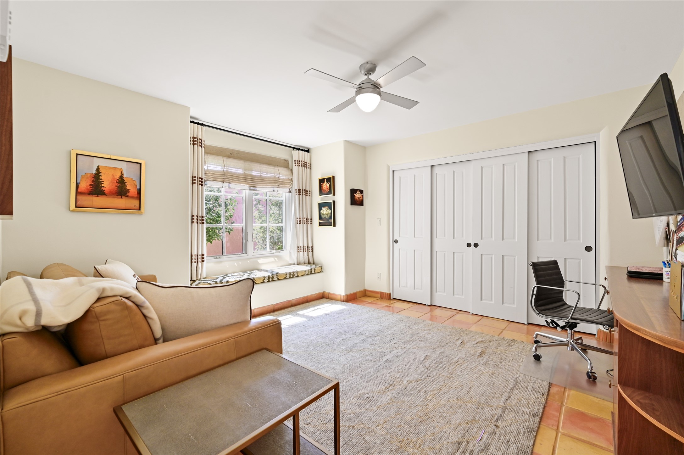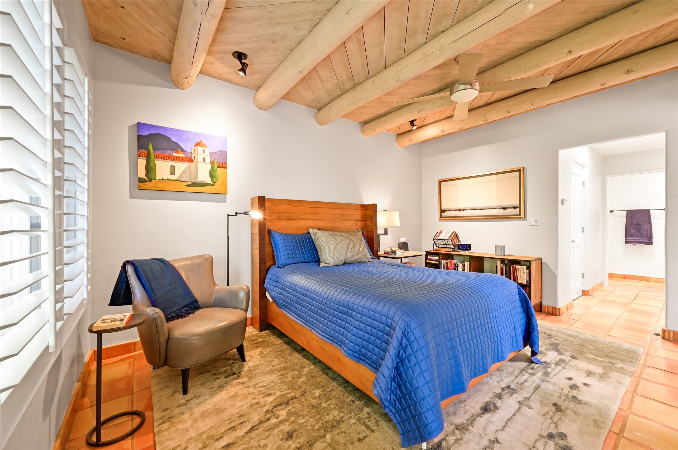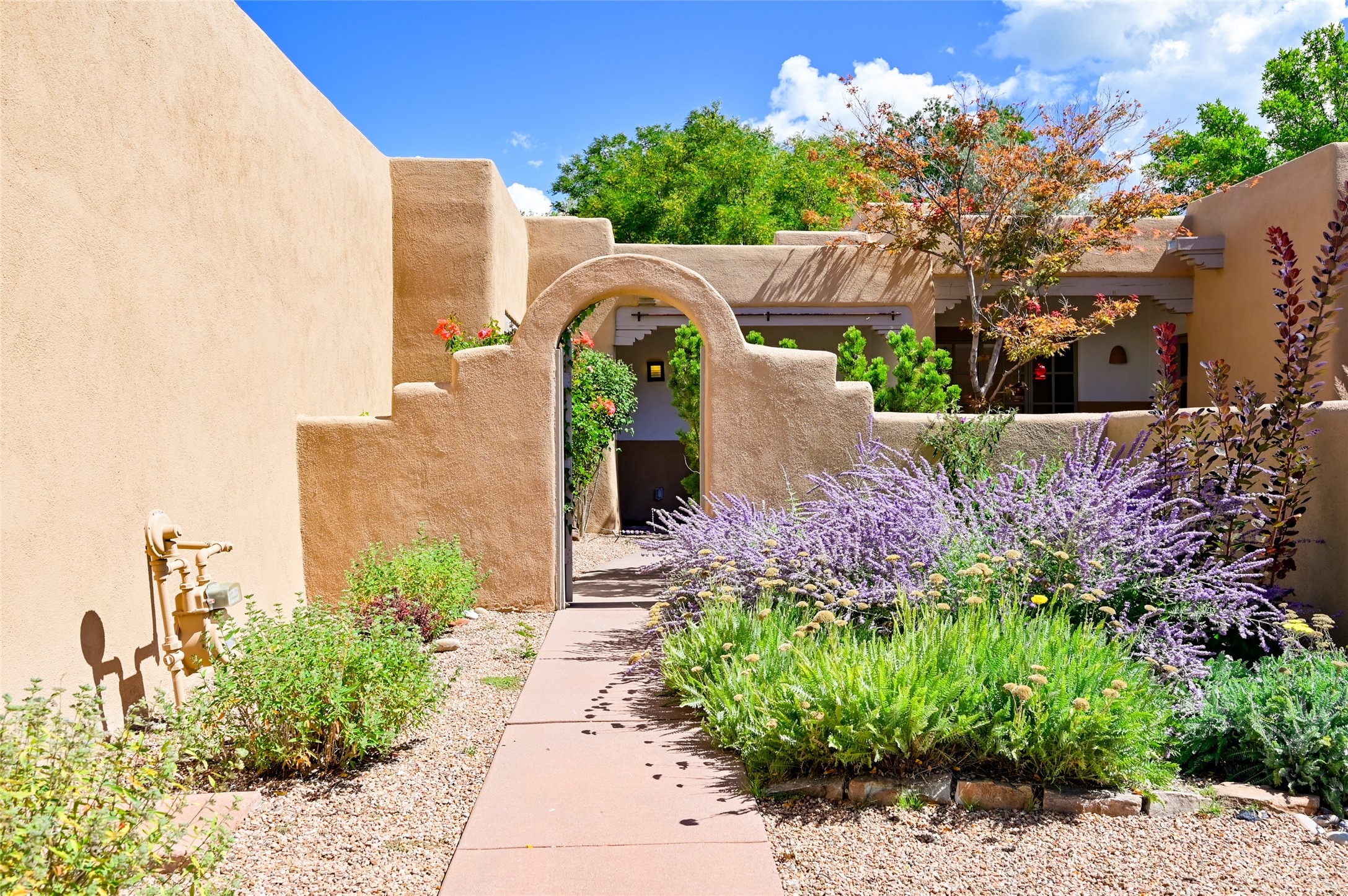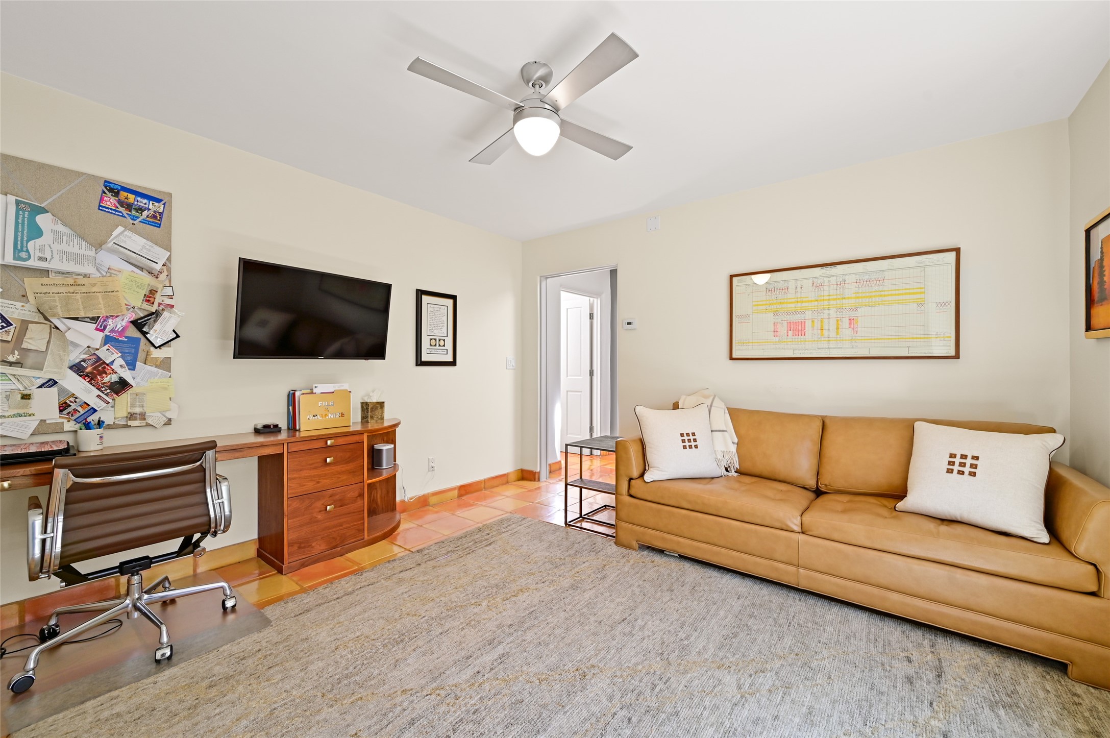 A rare opportunity to own the sought-after Casita floor plan in the Quail Run community! Enter through the gated courtyard, where a gentle water feature, lush landscaping, and a covered seating area create an immediate sense of welcome.Inside, you'll find two bedrooms, two baths, classic Vigas, Saltillo tile floors, and a traditional Kiva fireplace that sets a warm, authentic Santa Fe tone. Skylights fill the home with natural light, and the single-level, no-steps layout enhances comfort and ease of living.The spacious living room features beautifully handcrafted wood built-ins and ample wall space for art. The kitchen includes updated granite counters, a stylish backsplash, stainless steel appliances, a gas stove, and generous cabinetry with copper edging for both storage and character.The primary suite is its own private retreat, offering a custom barn door, window shutters, and access to the back courtyard. The updated adjoining bath features a nicely sized closet and a large vanity. The dining room opens onto a back patio overlooking wide-open green space, with brick detailing, vigas, lush landscaping, and charming corbels -- a private sanctuary for relaxing or entertaining.A spacious two-car garage provides additional storage and convenience.Ownership at Quail Run includes exceptional amenities: 24-hour hosted security, state-of-the-art fitness facilities, a swimming pool, golf, pickleball, fitness classes, social events, and an on-site restaurant. Come see why this special home at Quail Run offers the perfect blend of Santa Fe style and resort-style living.