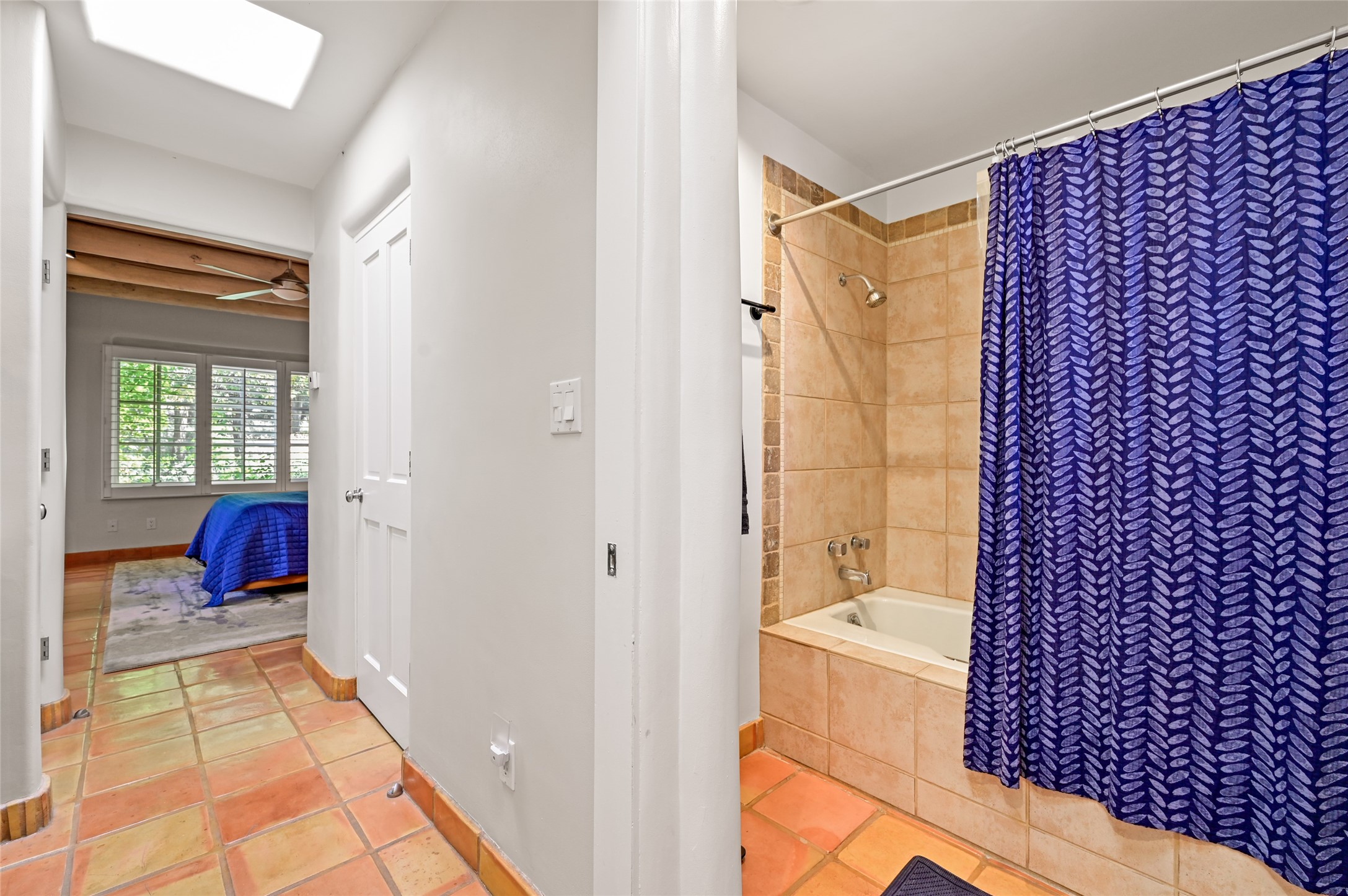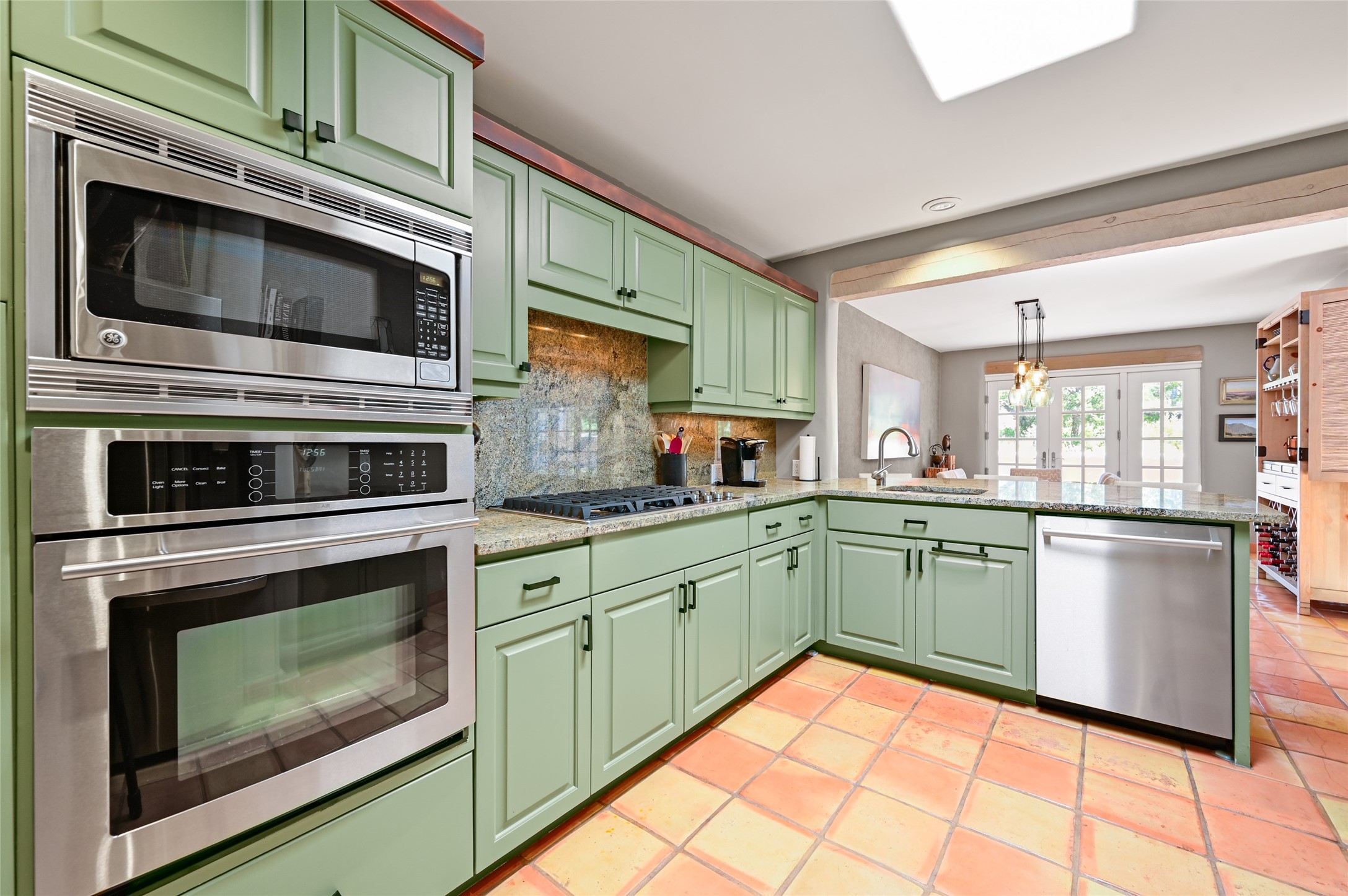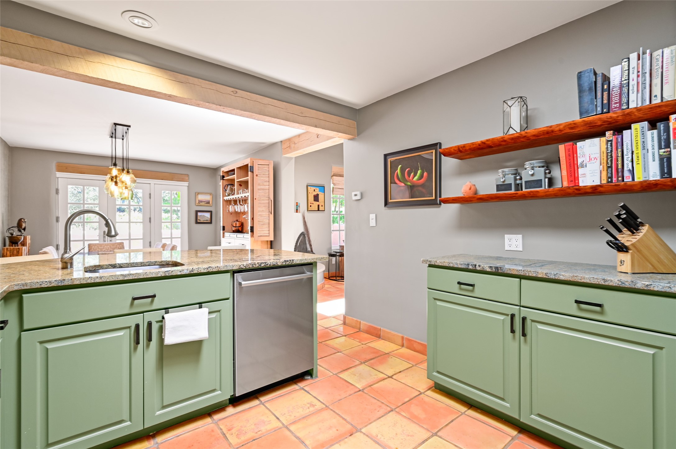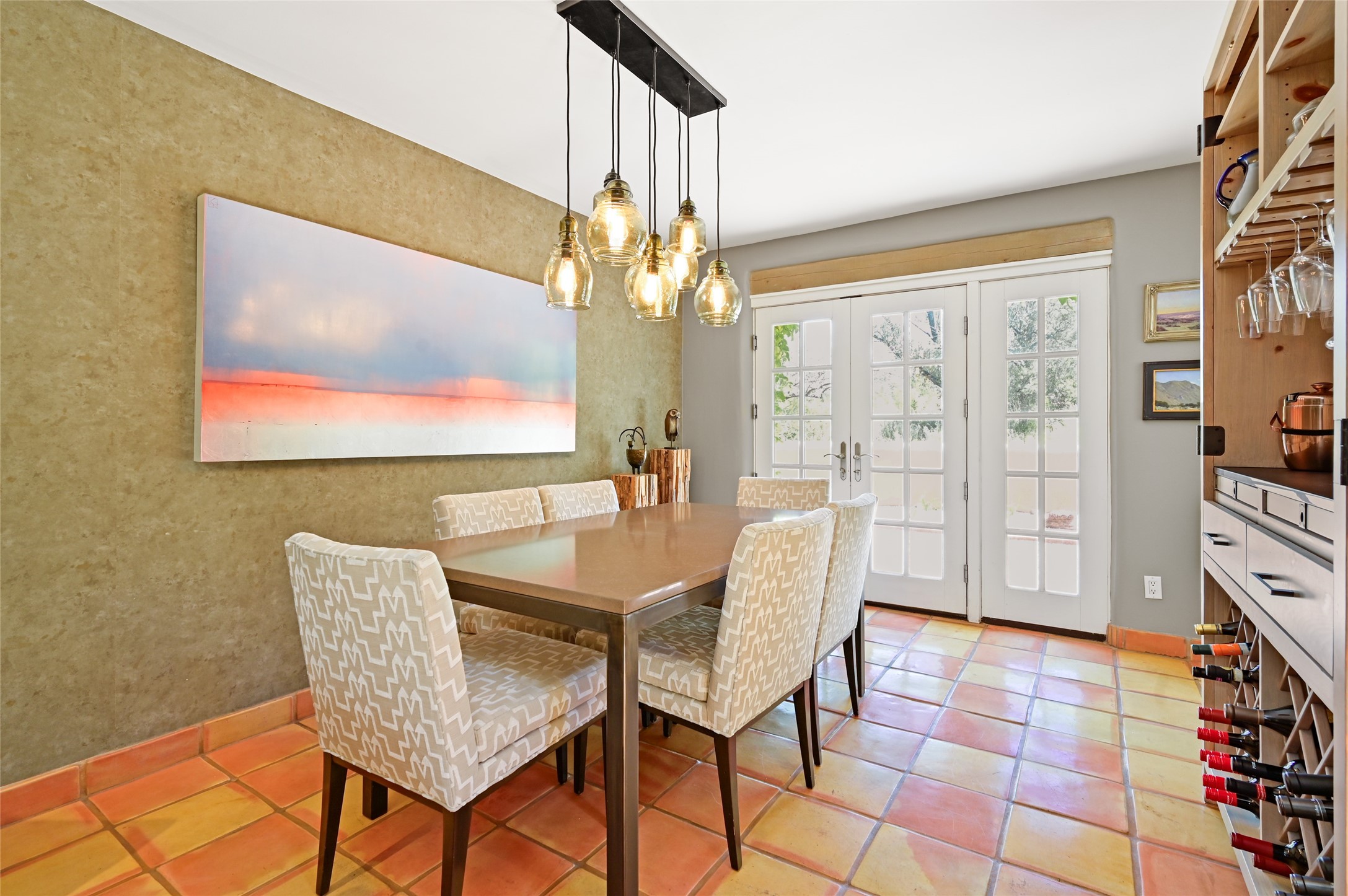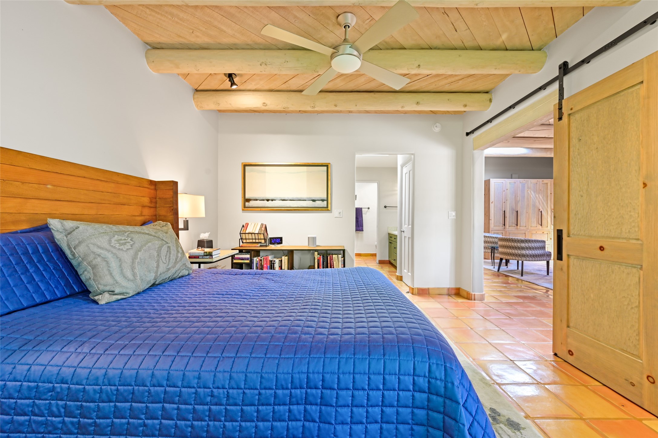 A rare opportunity to own the sought-after Casita floor plan in the Quail Run community! Enter through the gated courtyard, where a gentle water feature, lush landscaping, and a covered seating area create an immediate sense of welcome.Inside, you'll find two bedrooms, two baths, classic Vigas, Saltillo tile floors, and a traditional Kiva fireplace that sets a warm, authentic Santa Fe tone. Skylights fill the home with natural light, and the single-level, no-steps layout enhances comfort and ease of living.The spacious living room features beautifully handcrafted wood built-ins and ample wall space for art. The kitchen includes updated granite counters, a stylish backsplash, stainless steel appliances, a gas stove, and generous cabinetry with copper edging for both storage and character.The primary suite is its own private retreat, offering a custom barn door, window shutters, and access to the back courtyard. The updated adjoining bath features a nicely sized closet and a large vanity. The dining room opens onto a back patio overlooking wide-open green space, with brick detailing, vigas, lush landscaping, and charming corbels -- a private sanctuary for relaxing or entertaining.A spacious two-car garage provides additional storage and convenience.Ownership at Quail Run includes exceptional amenities: 24-hour hosted security, state-of-the-art fitness facilities, a swimming pool, golf, pickleball, fitness classes, social events, and an on-site restaurant. Come see why this special home at Quail Run offers the perfect blend of Santa Fe style and resort-style living.