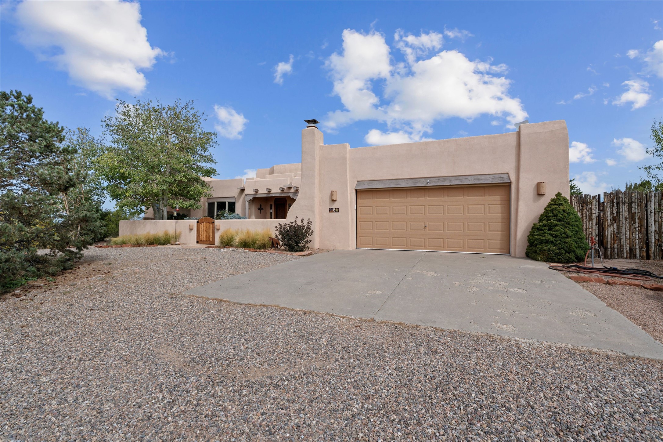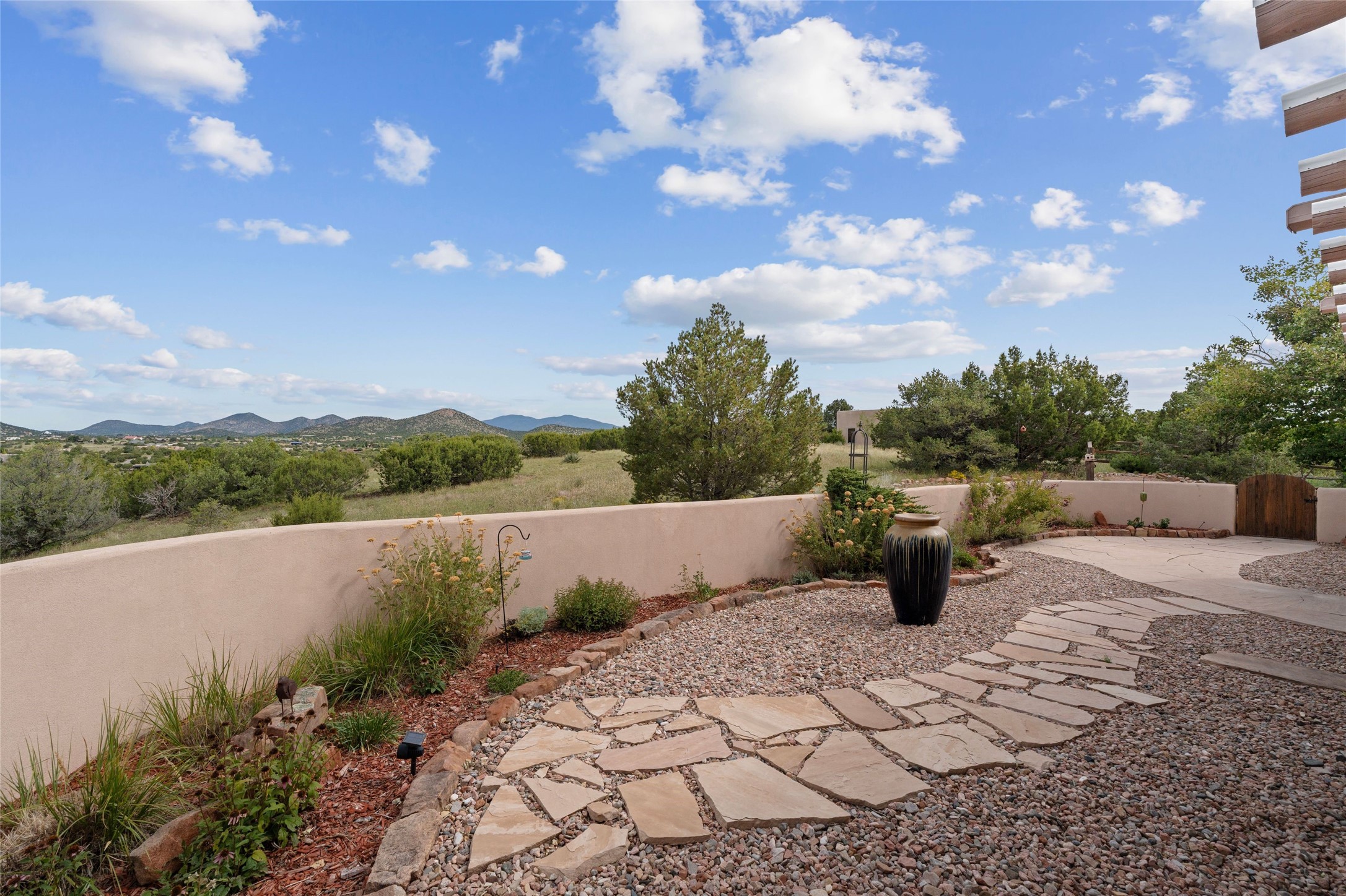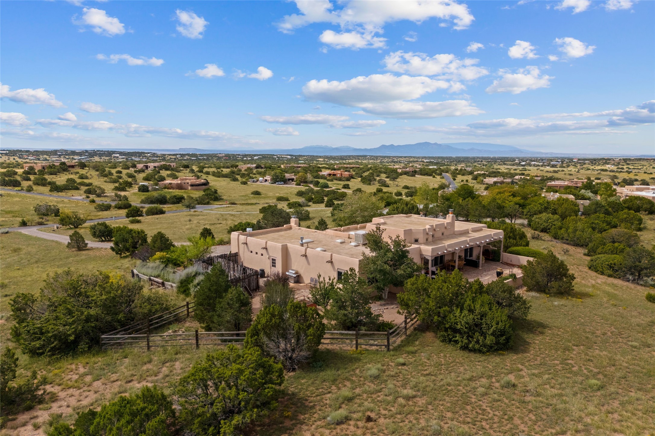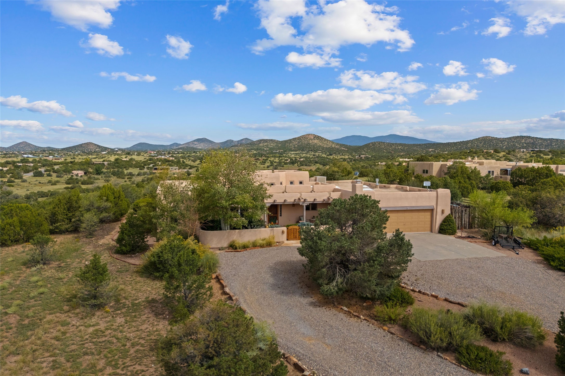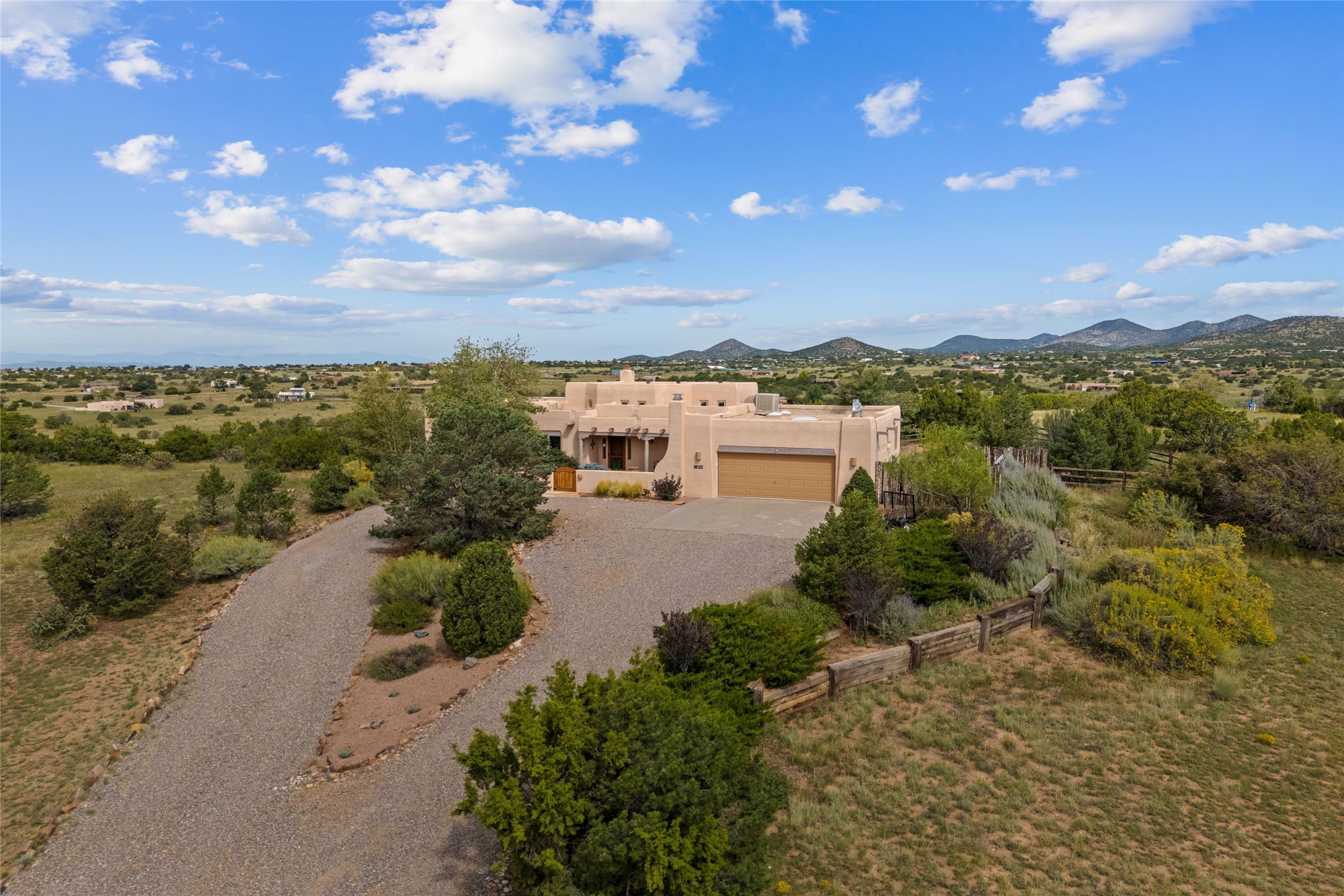 Private 3-bedroom, 2-bath home with panoramic mountain views on elevated 2.5-acres. Located on a cul-de-sac lot in the community of Cielo Colorado. Step inside to find an expansive split floor plan, featuring soaring 18-20 ft. ceilings that create an open and airy atmosphere. Design features include Venetian plaster walls, hickory cabinets, kiva fireplace, and vigas and beams, giving the home an authentic Southwestern charm. Pine plank ceilings add warmth and character, while clerestory windows and several skylights flood the space with natural light. The kitchen is appointed with solid granite countertops, center island with breakfast bar and stainless-steel appliances. The primary suite includes an ensuite bath featuring a jetted tub and a spacious walk-in closet. Two additional bedrooms are strategically situated in a guest wing. In addition, there is a separate den/office, equipped with bookshelves that convey with the sale. Spacious large laundry area. The walled entry courtyard with kiva provides a serene outdoor oasis, complemented by an outdoor irrigation system to maintain the lush landscaping. Back portal and patio expand dining and entertaining opportunities. Close to The Agora Shopping Center in Eldorado with easy access to 285 and downtown Santa Fe.