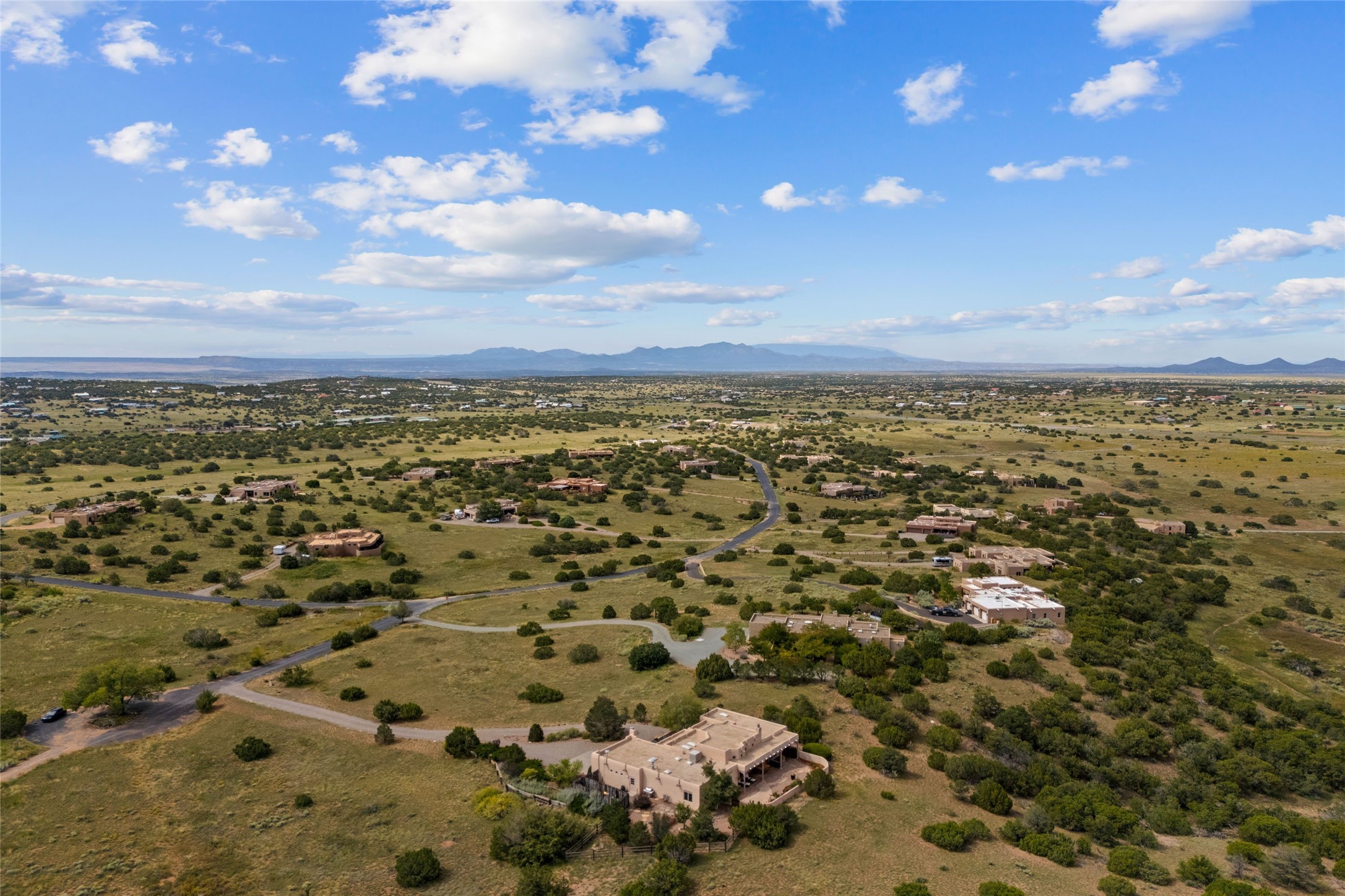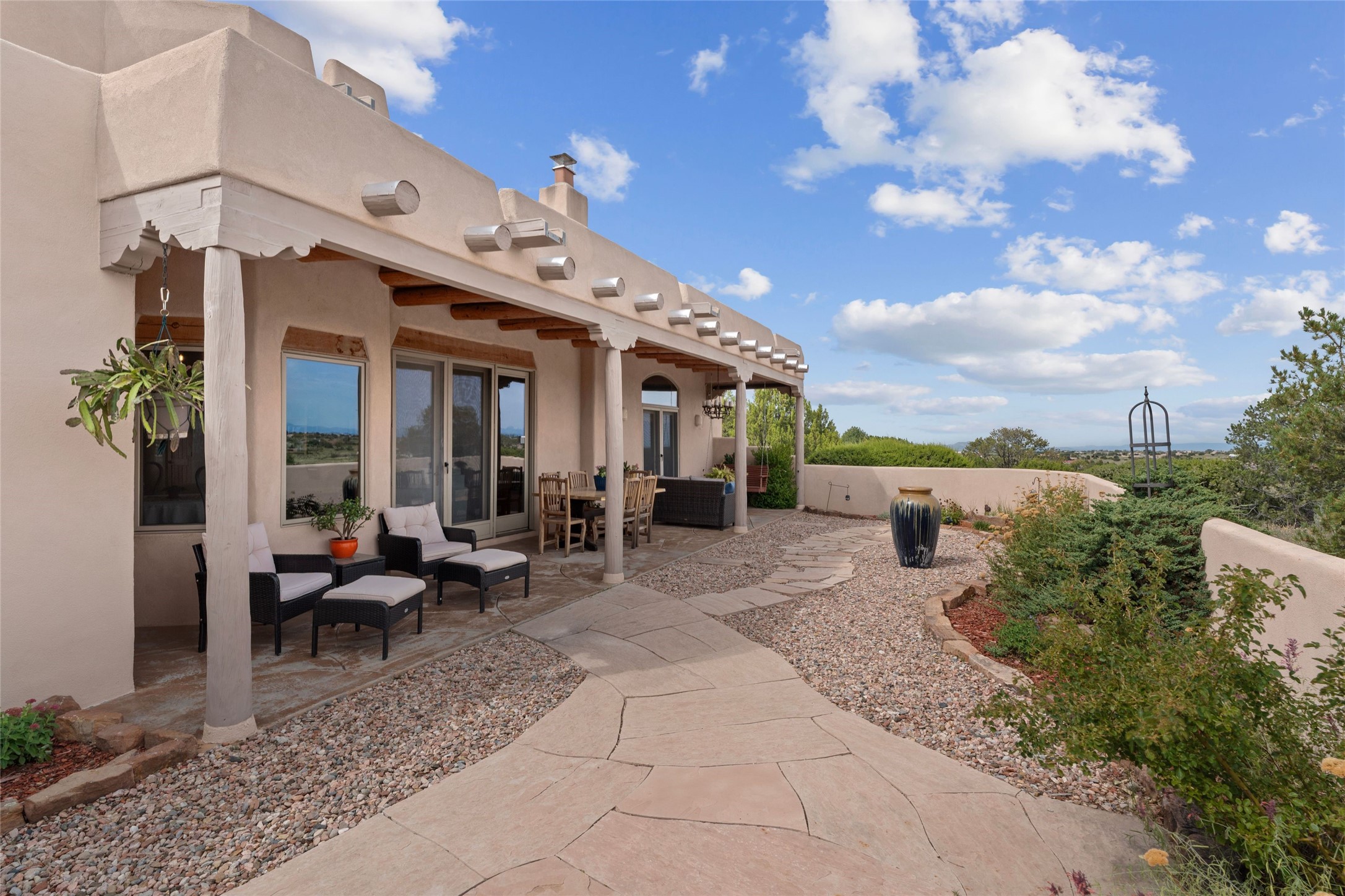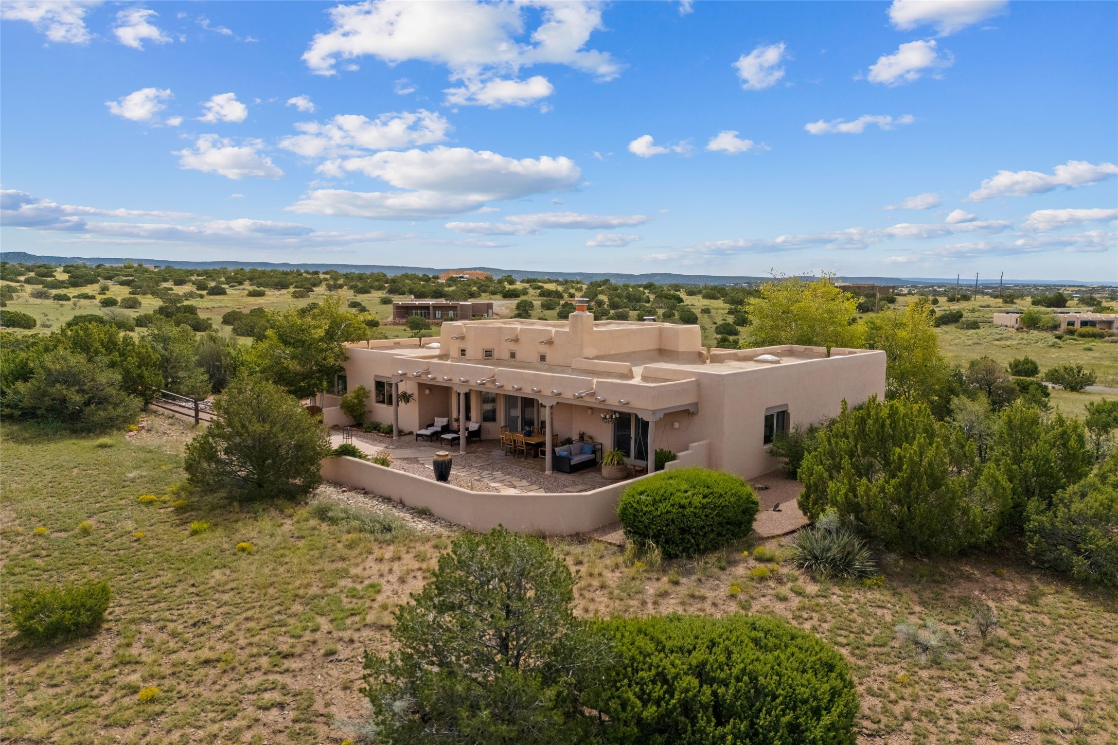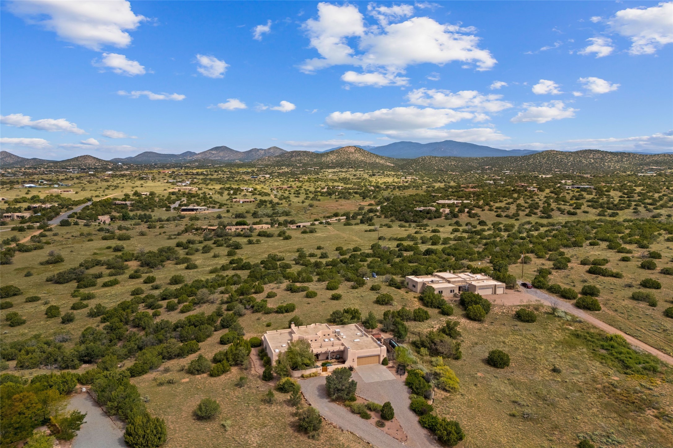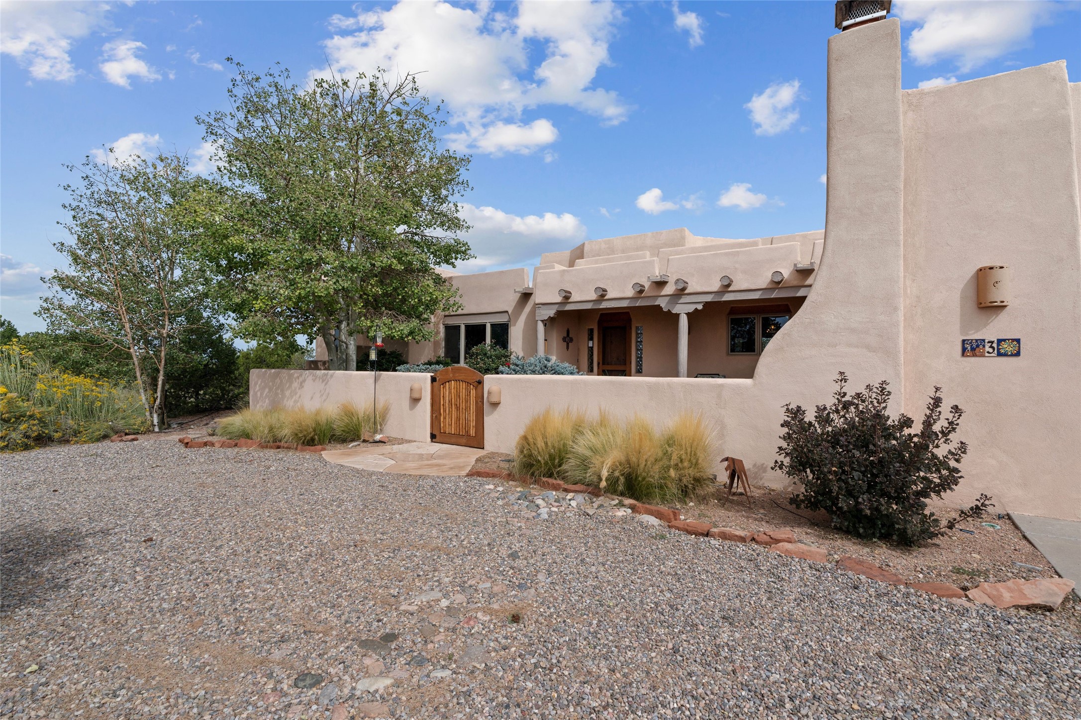 Private 3-bedroom, 2-bath home with panoramic mountain views on elevated 2.5-acres. Located on a cul-de-sac lot in the community of Cielo Colorado. Step inside to find an expansive split floor plan, featuring soaring 18-20 ft. ceilings that create an open and airy atmosphere. Design features include Venetian plaster walls, hickory cabinets, kiva fireplace, and vigas and beams, giving the home an authentic Southwestern charm. Pine plank ceilings add warmth and character, while clerestory windows and several skylights flood the space with natural light. The kitchen is appointed with solid granite countertops, center island with breakfast bar and stainless-steel appliances. The primary suite includes an ensuite bath featuring a jetted tub and a spacious walk-in closet. Two additional bedrooms are strategically situated in a guest wing. In addition, there is a separate den/office, equipped with bookshelves that convey with the sale. Spacious large laundry area. The walled entry courtyard with kiva provides a serene outdoor oasis, complemented by an outdoor irrigation system to maintain the lush landscaping. Back portal and patio expand dining and entertaining opportunities. Close to The Agora Shopping Center in Eldorado with easy access to 285 and downtown Santa Fe.