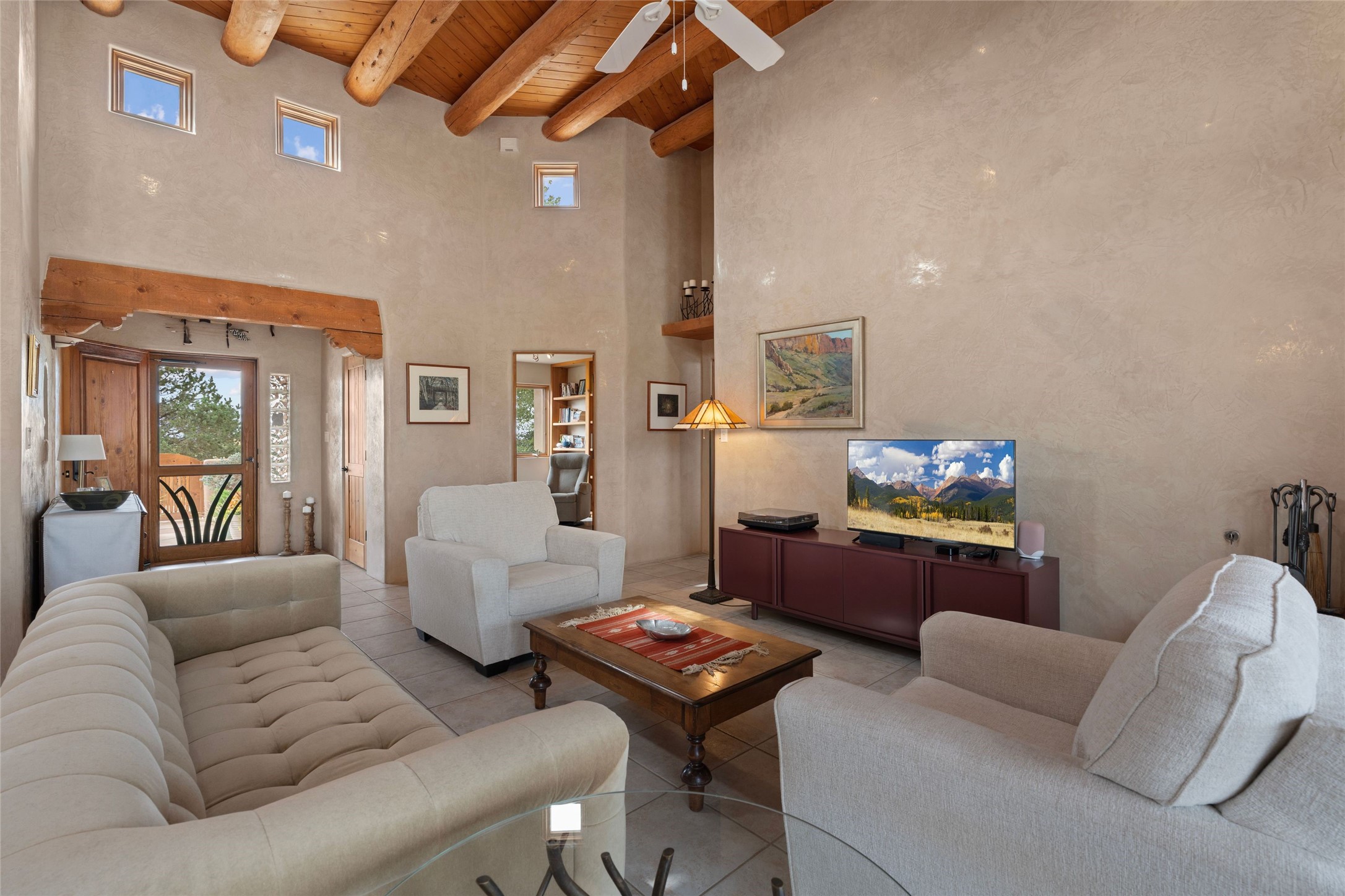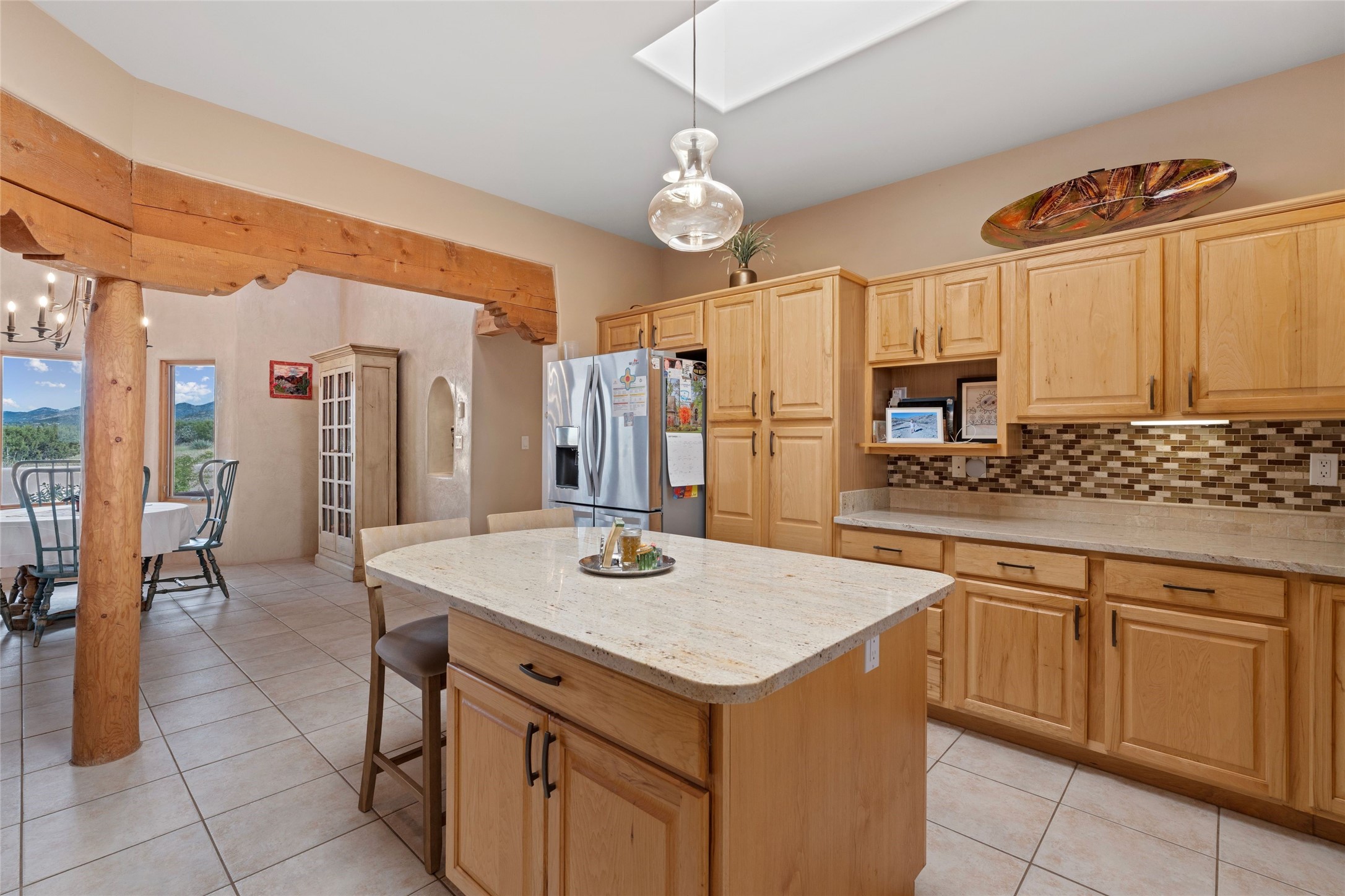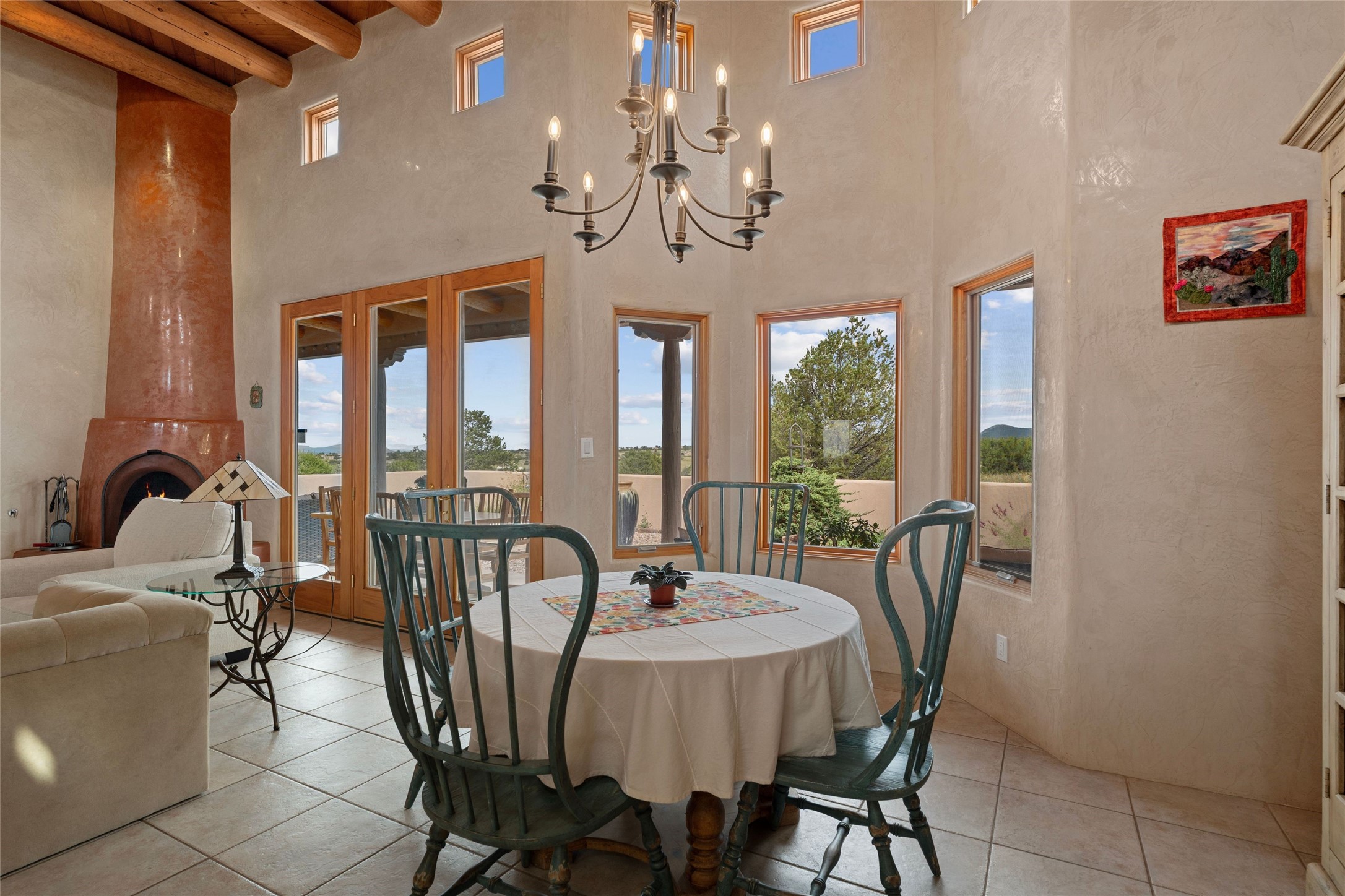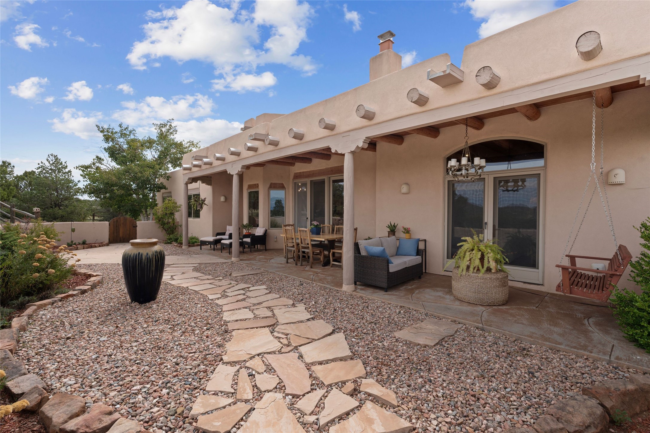 Private 3-bedroom, 2-bath home with panoramic mountain views on elevated 2.5-acres. Located on a cul-de-sac lot in the community of Cielo Colorado. Step inside to find an expansive split floor plan, featuring soaring 18-20 ft. ceilings that create an open and airy atmosphere. Design features include Venetian plaster walls, hickory cabinets, kiva fireplace, and vigas and beams, giving the home an authentic Southwestern charm. Pine plank ceilings add warmth and character, while clerestory windows and several skylights flood the space with natural light. The kitchen is appointed with solid granite countertops, center island with breakfast bar and stainless-steel appliances. The primary suite includes an ensuite bath featuring a jetted tub and a spacious walk-in closet. Two additional bedrooms are strategically situated in a guest wing. In addition, there is a separate den/office, equipped with bookshelves that convey with the sale. Spacious large laundry area. The walled entry courtyard with kiva provides a serene outdoor oasis, complemented by an outdoor irrigation system to maintain the lush landscaping. Back portal and patio expand dining and entertaining opportunities. Close to The Agora Shopping Center in Eldorado with easy access to 285 and downtown Santa Fe.