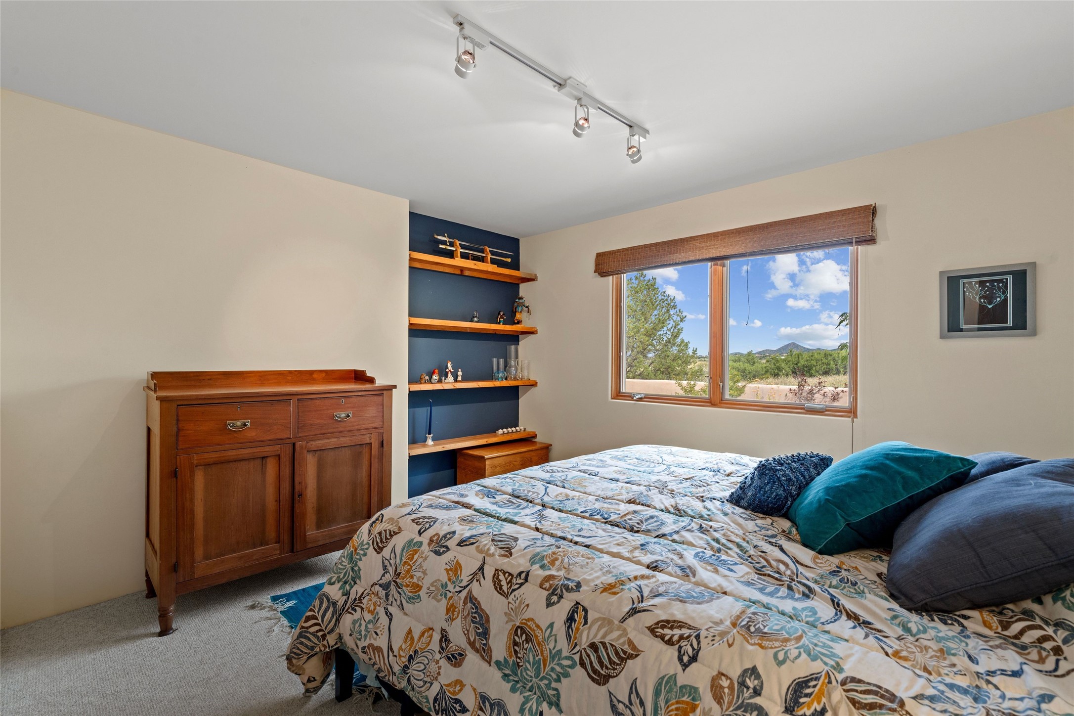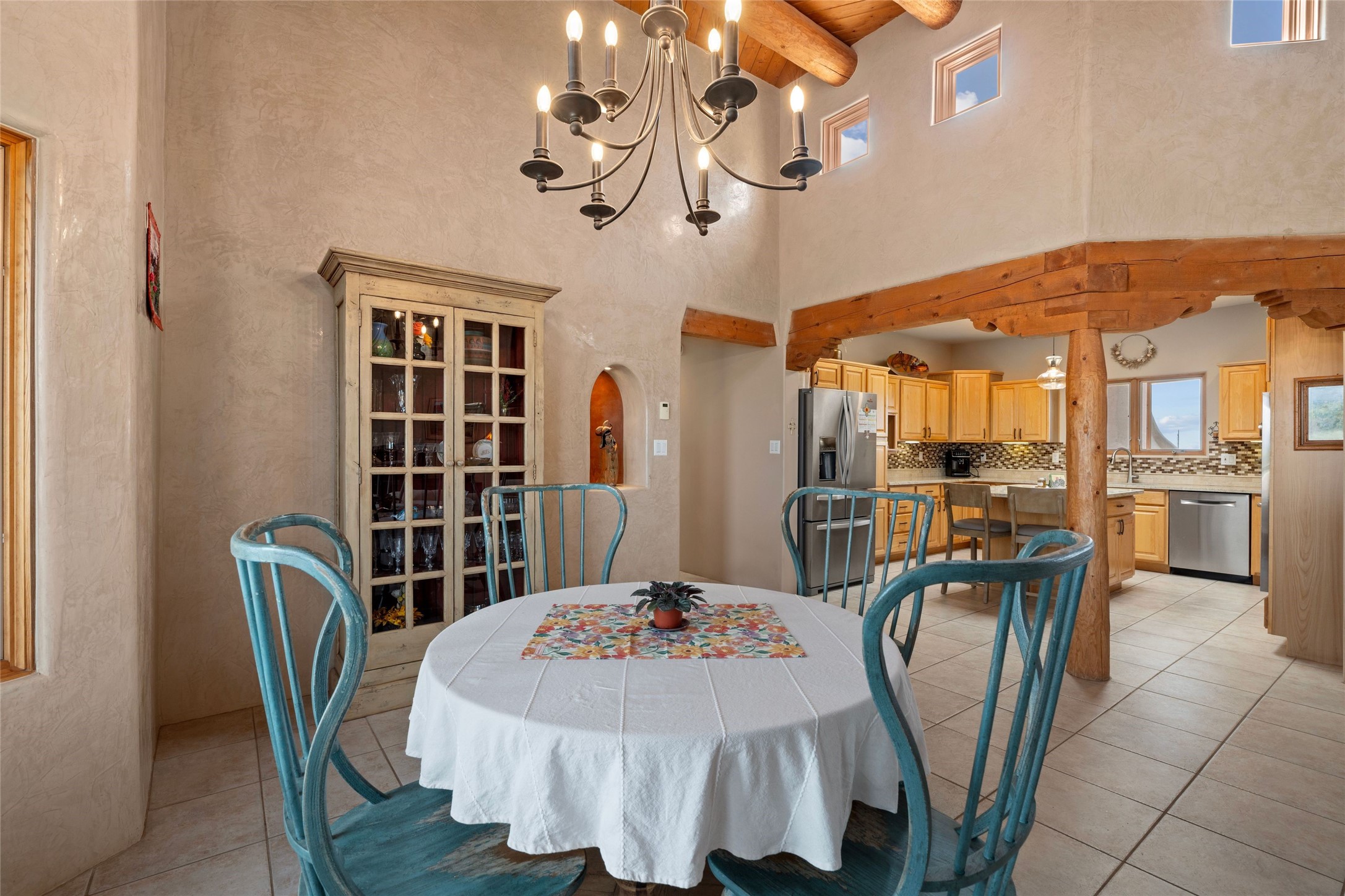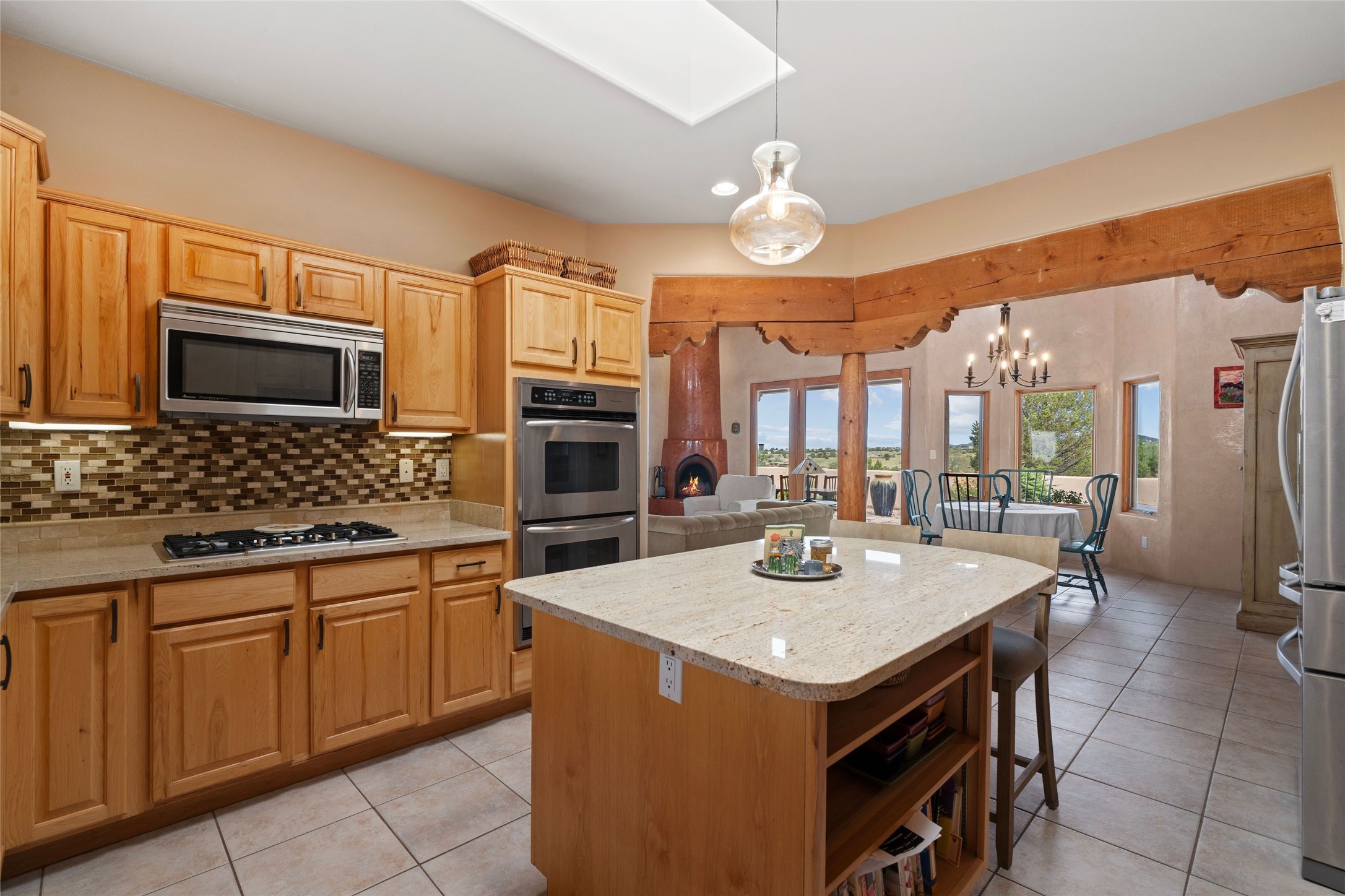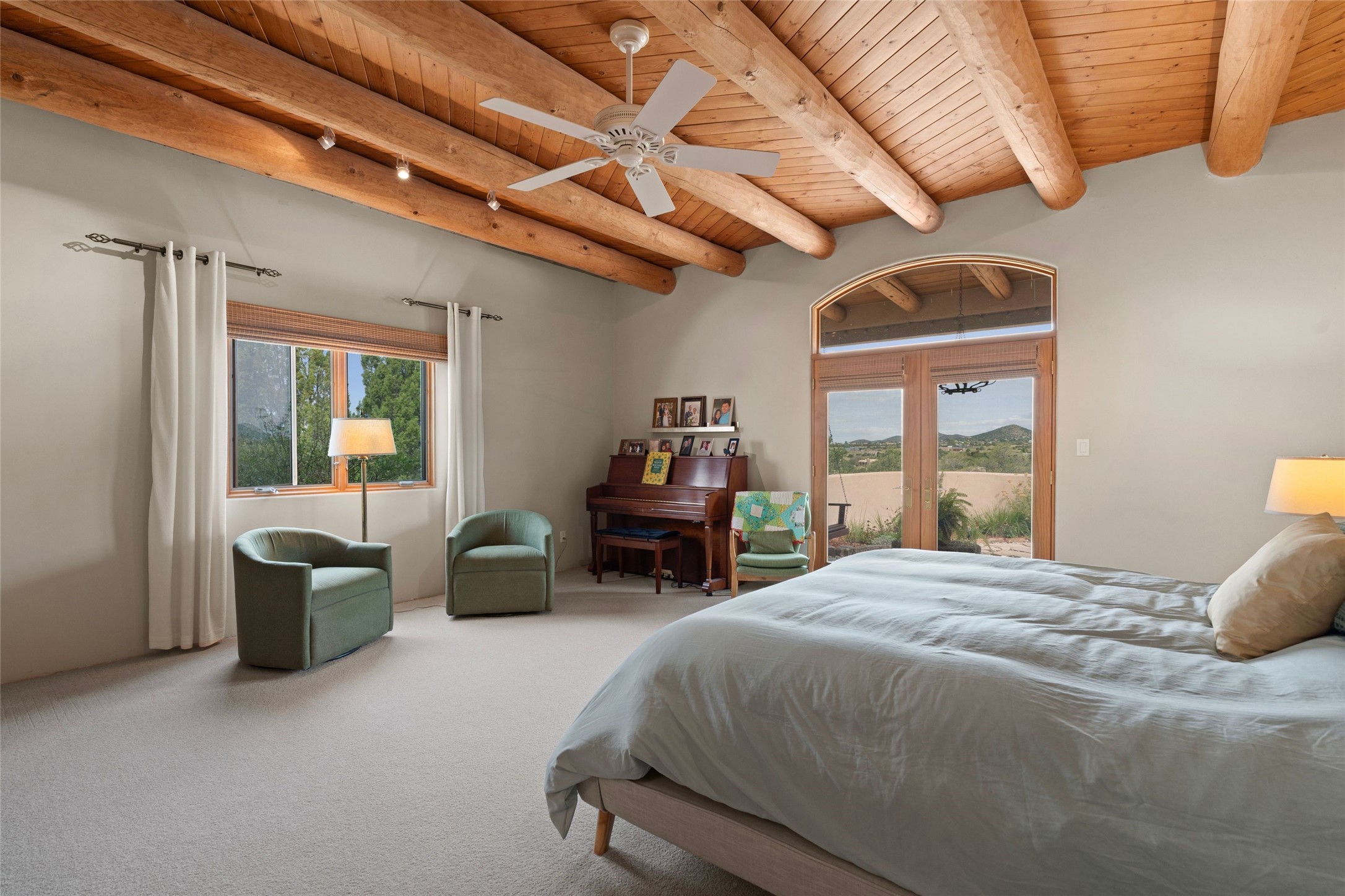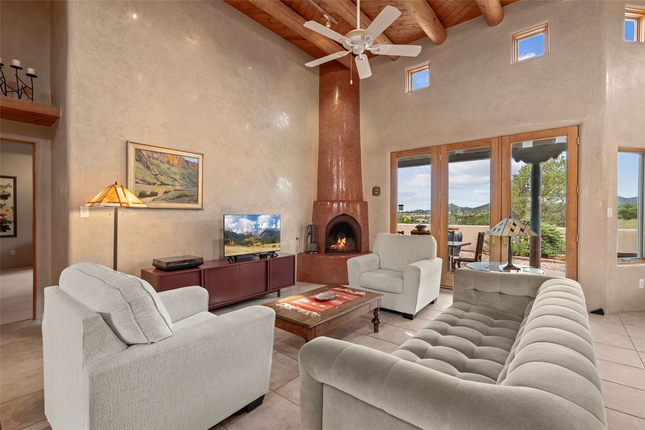 Private 3-bedroom, 2-bath home with panoramic mountain views on elevated 2.5-acres. Located on a cul-de-sac lot in the community of Cielo Colorado. Step inside to find an expansive split floor plan, featuring soaring 18-20 ft. ceilings that create an open and airy atmosphere. Design features include Venetian plaster walls, hickory cabinets, kiva fireplace, and vigas and beams, giving the home an authentic Southwestern charm. Pine plank ceilings add warmth and character, while clerestory windows and several skylights flood the space with natural light. The kitchen is appointed with solid granite countertops, center island with breakfast bar and stainless-steel appliances. The primary suite includes an ensuite bath featuring a jetted tub and a spacious walk-in closet. Two additional bedrooms are strategically situated in a guest wing. In addition, there is a separate den/office, equipped with bookshelves that convey with the sale. Spacious large laundry area. The walled entry courtyard with kiva provides a serene outdoor oasis, complemented by an outdoor irrigation system to maintain the lush landscaping. Back portal and patio expand dining and entertaining opportunities. Close to The Agora Shopping Center in Eldorado with easy access to 285 and downtown Santa Fe.