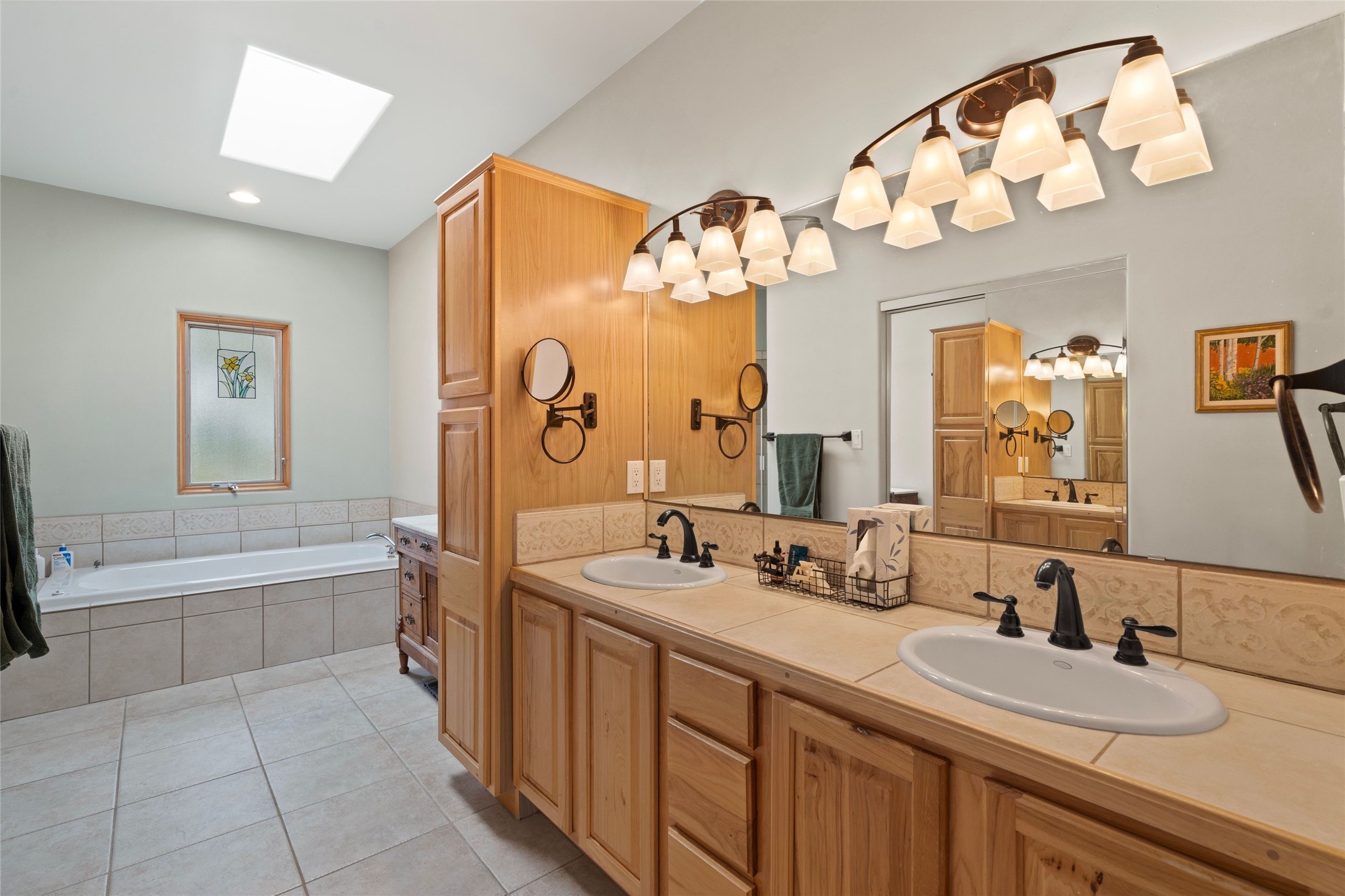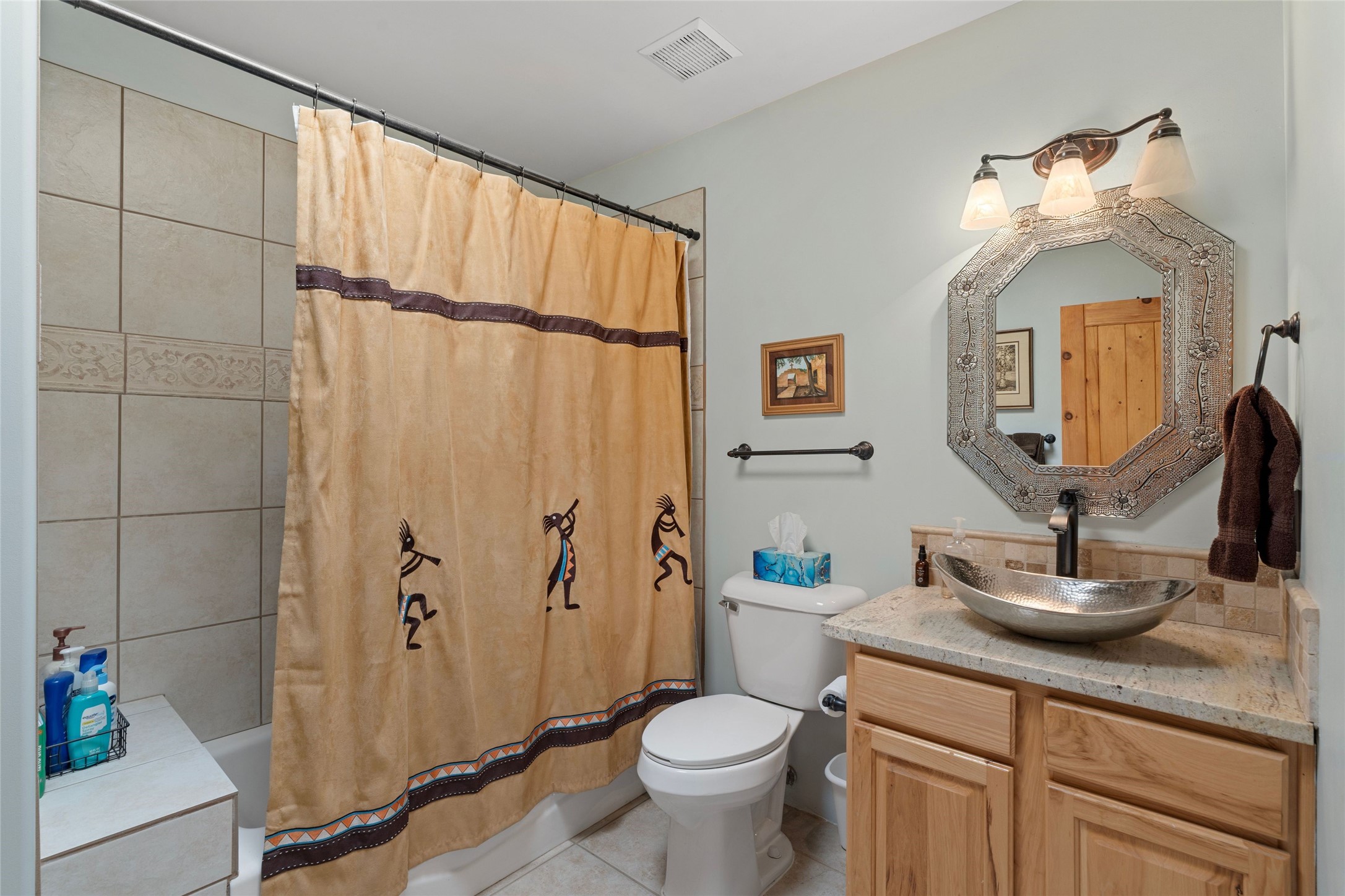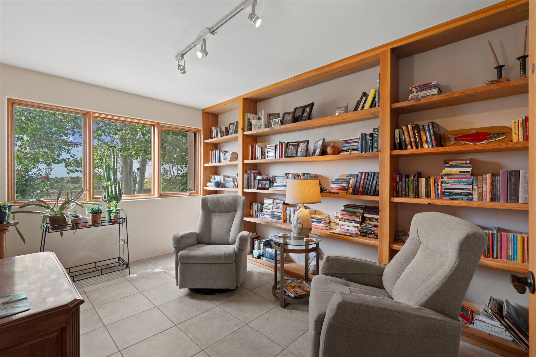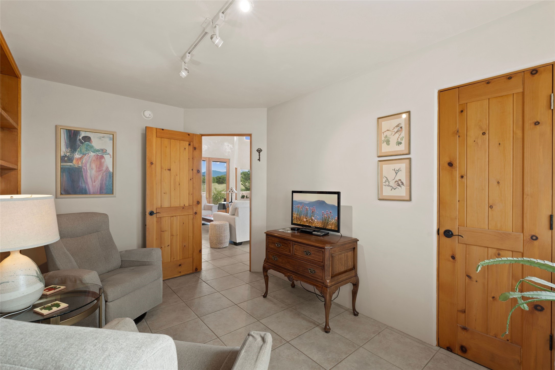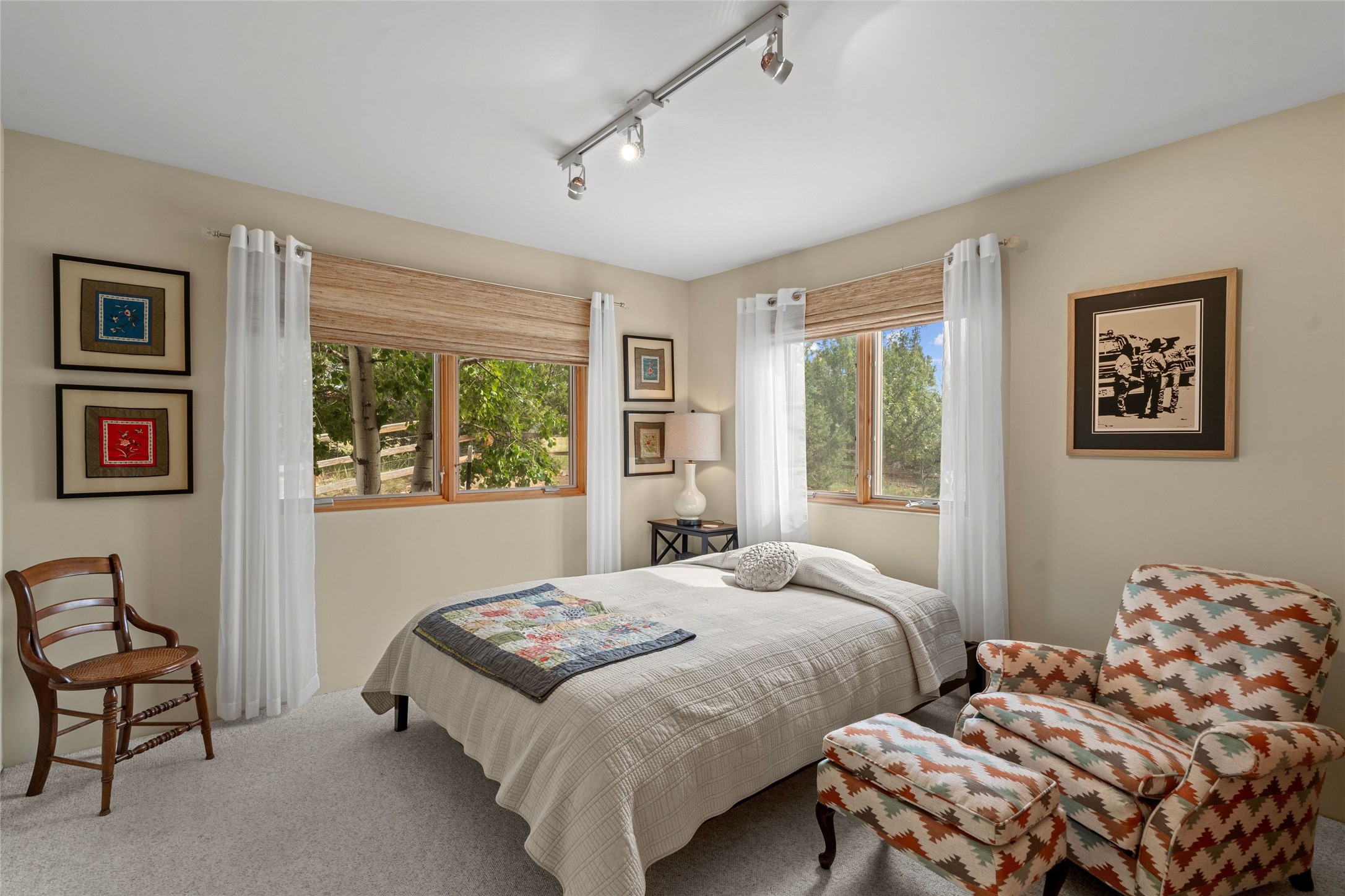 Private 3-bedroom, 2-bath home with panoramic mountain views on elevated 2.5-acres. Located on a cul-de-sac lot in the community of Cielo Colorado. Step inside to find an expansive split floor plan, featuring soaring 18-20 ft. ceilings that create an open and airy atmosphere. Design features include Venetian plaster walls, hickory cabinets, kiva fireplace, and vigas and beams, giving the home an authentic Southwestern charm. Pine plank ceilings add warmth and character, while clerestory windows and several skylights flood the space with natural light. The kitchen is appointed with solid granite countertops, center island with breakfast bar and stainless-steel appliances. The primary suite includes an ensuite bath featuring a jetted tub and a spacious walk-in closet. Two additional bedrooms are strategically situated in a guest wing. In addition, there is a separate den/office, equipped with bookshelves that convey with the sale. Spacious large laundry area. The walled entry courtyard with kiva provides a serene outdoor oasis, complemented by an outdoor irrigation system to maintain the lush landscaping. Back portal and patio expand dining and entertaining opportunities. Close to The Agora Shopping Center in Eldorado with easy access to 285 and downtown Santa Fe.