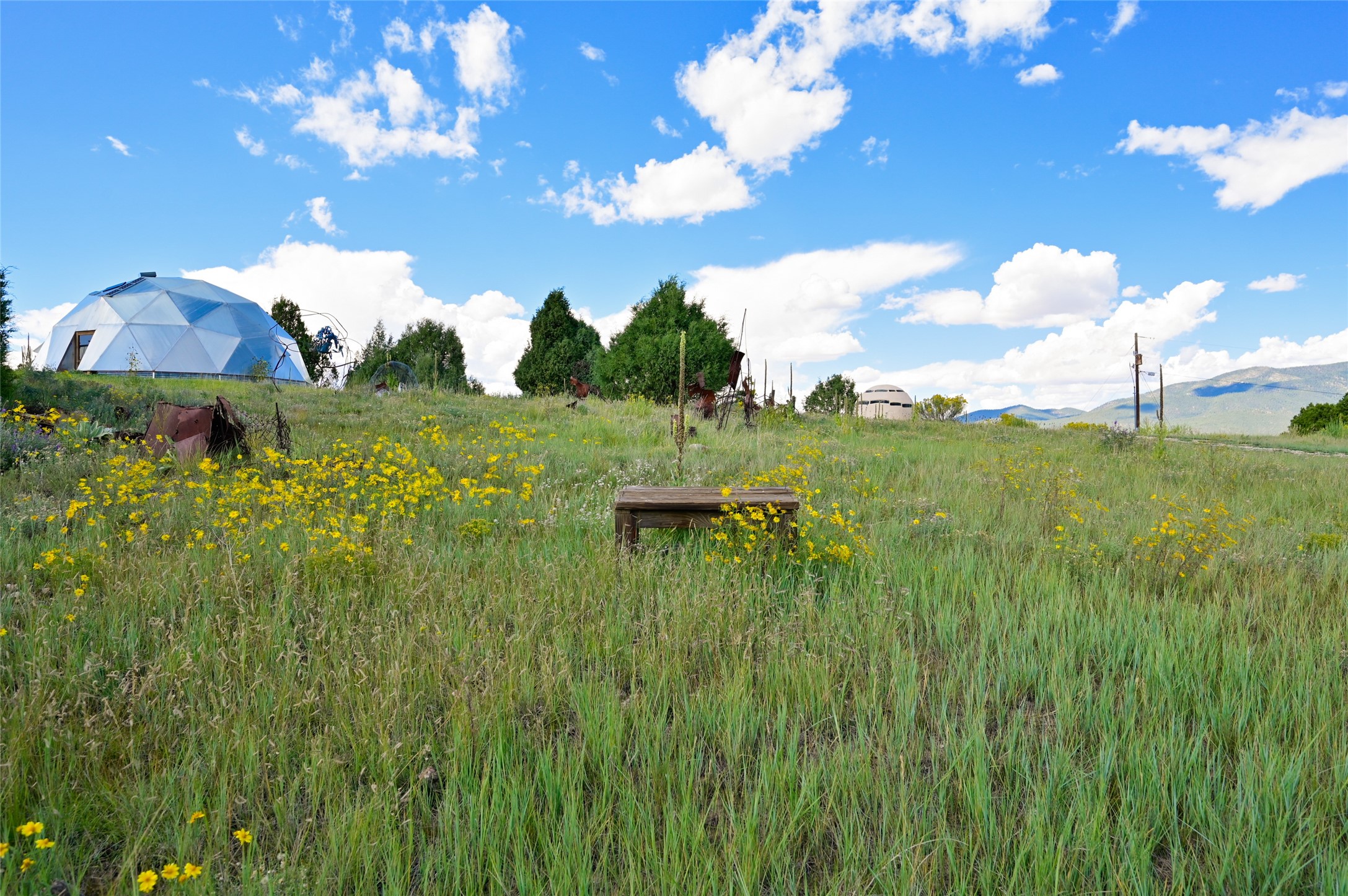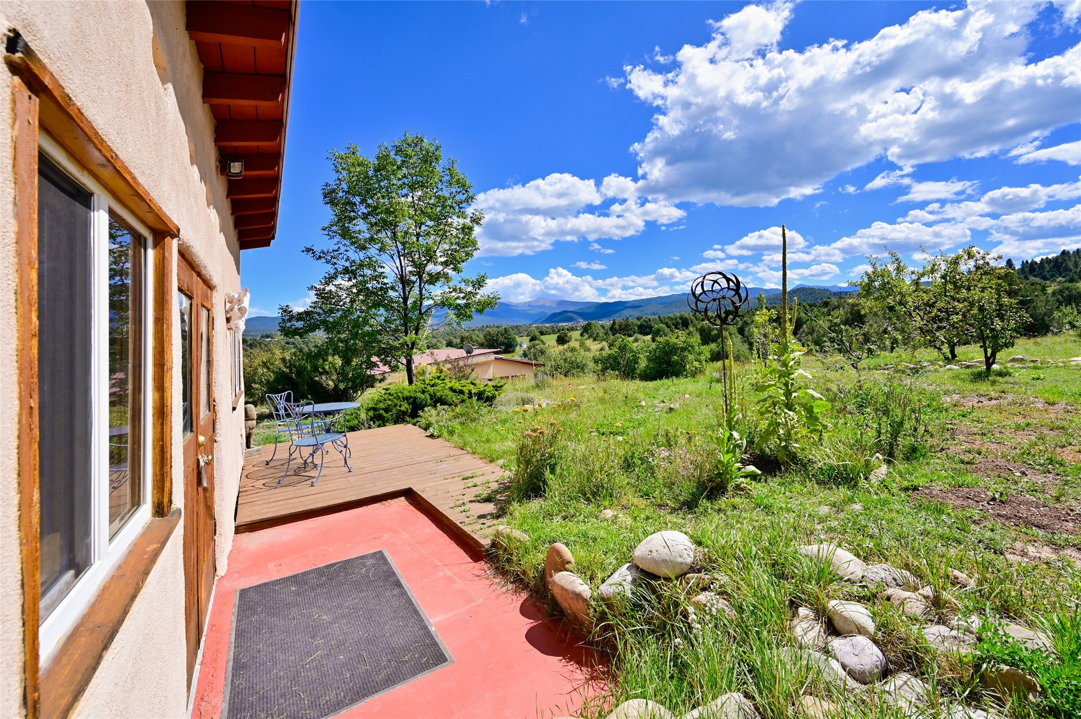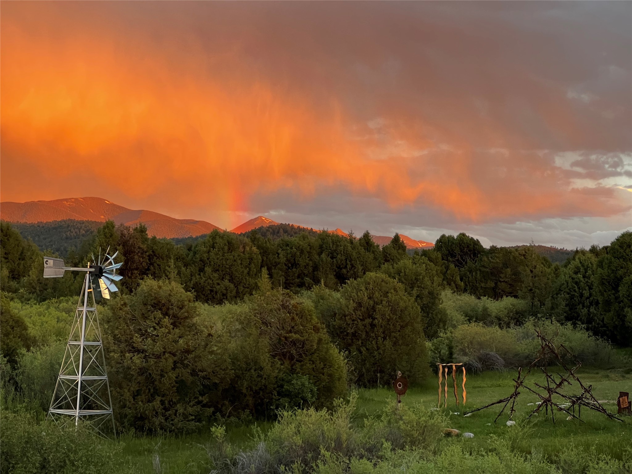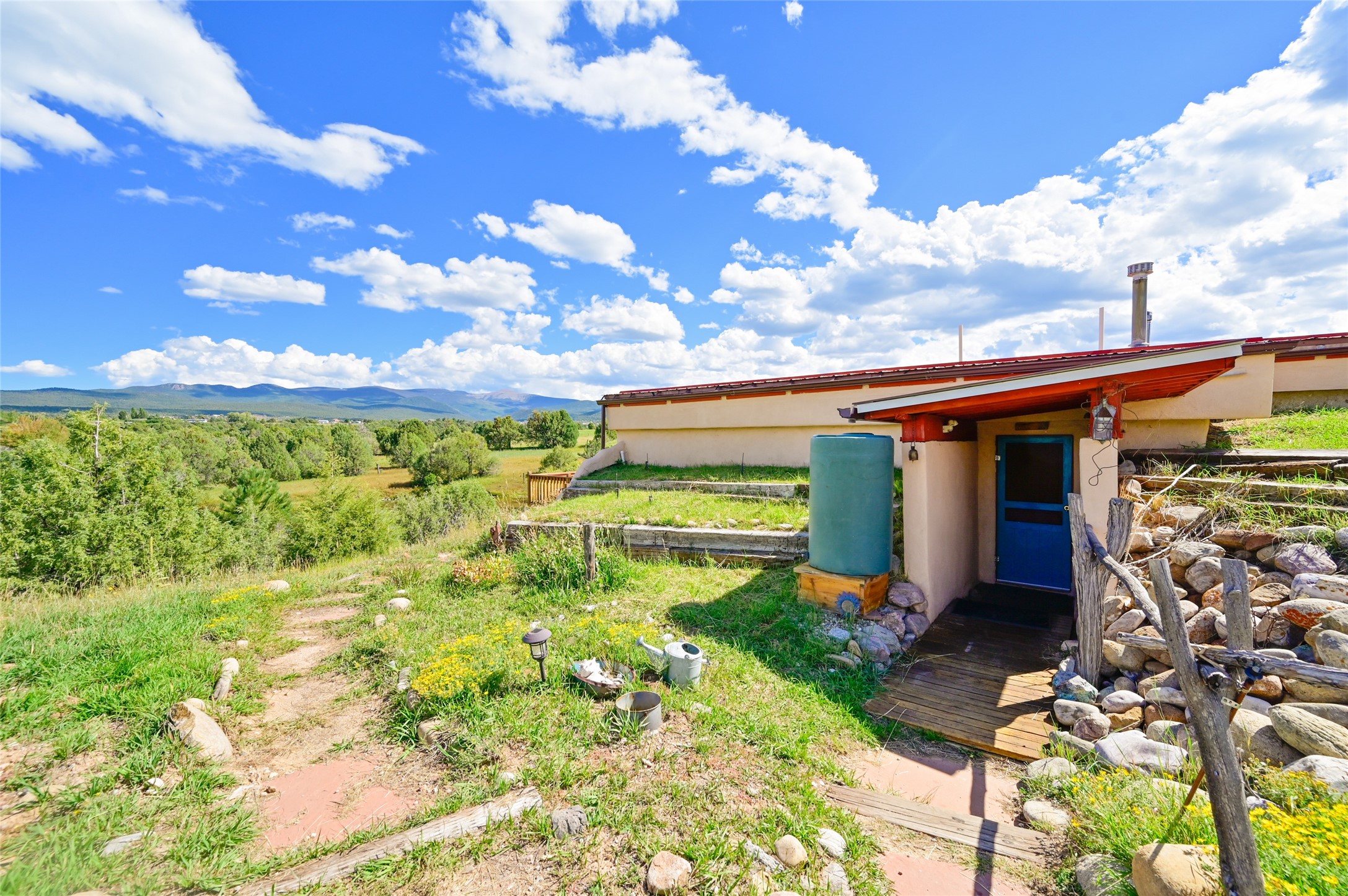 A truly rare 34-acre mountain retreat awaits, nestled in the Sangre de Cristo Mountains with stunning views of Jicarita Peak and Truchas Peaks. This exceptional, self-sufficient, and sustainably developed property is perfect for a small family business, equestrian estate, or serene retreat center.The total living space of 4,100 sq ft includes a charming 1,600 sq ft earth-bermed 2-bedroom home featuring custom stone floors, vigas, radiant in-floor heat in the kitchen and master suite, and an updated kitchen with a Wolf Stove and granite countertops. The home is designed for energy efficiency, maximizing solar gain, and has a wrap-around deck with captivating pond and mountain views.The property also boasts a 2,225 sq ft office/mixed-use building (zoned for cottage industry, previously a successful institute), a 275 sq ft studio/guest house with a half-bath, and a 30' insulated yurt with off-grid solar, ideal for meditation or a classroom--offering immense flexibility and separate spaces for living, working, and gathering.Outside, find unparalleled amenities dedicated to Earth Stewardship and conservation: 10 irrigated acres with water rights for farming or grazing. Rustic 3-stall horse barn and tack room, horse fencing throughout property. 33' geodesic Growing Dome for year-round production. A comprehensive water catchment system utilizing heavy-duty roof guttering on all buildings and multiple cisterns. A quarter-acre pond with a Trex deck, fed by wetlands and springs, and aerated by a windmill. A vast network of maintained trails on forested acres (thinned and managed), offering direct access to the Carson National Forest.Additional features include an owned grid-tied solar array, a root cellar, a 40' cargo container, and extensive landscaping with drip irrigation. This property is a rare gem, beautifully developed, and ready for its next steward.