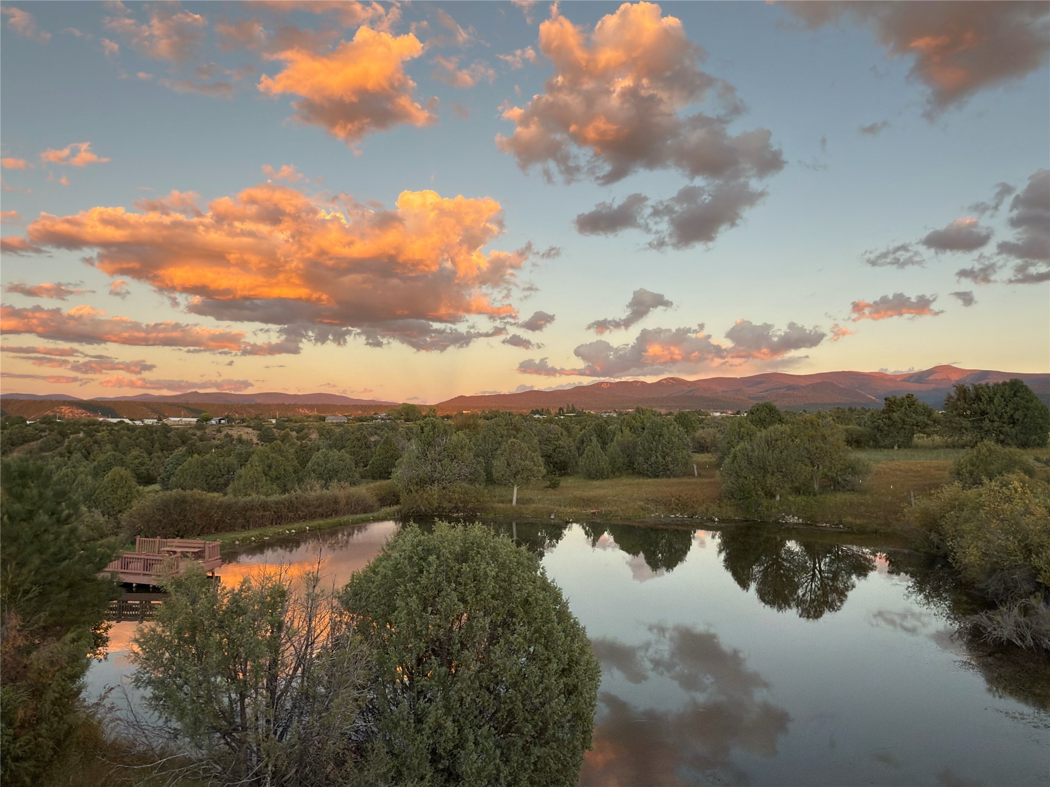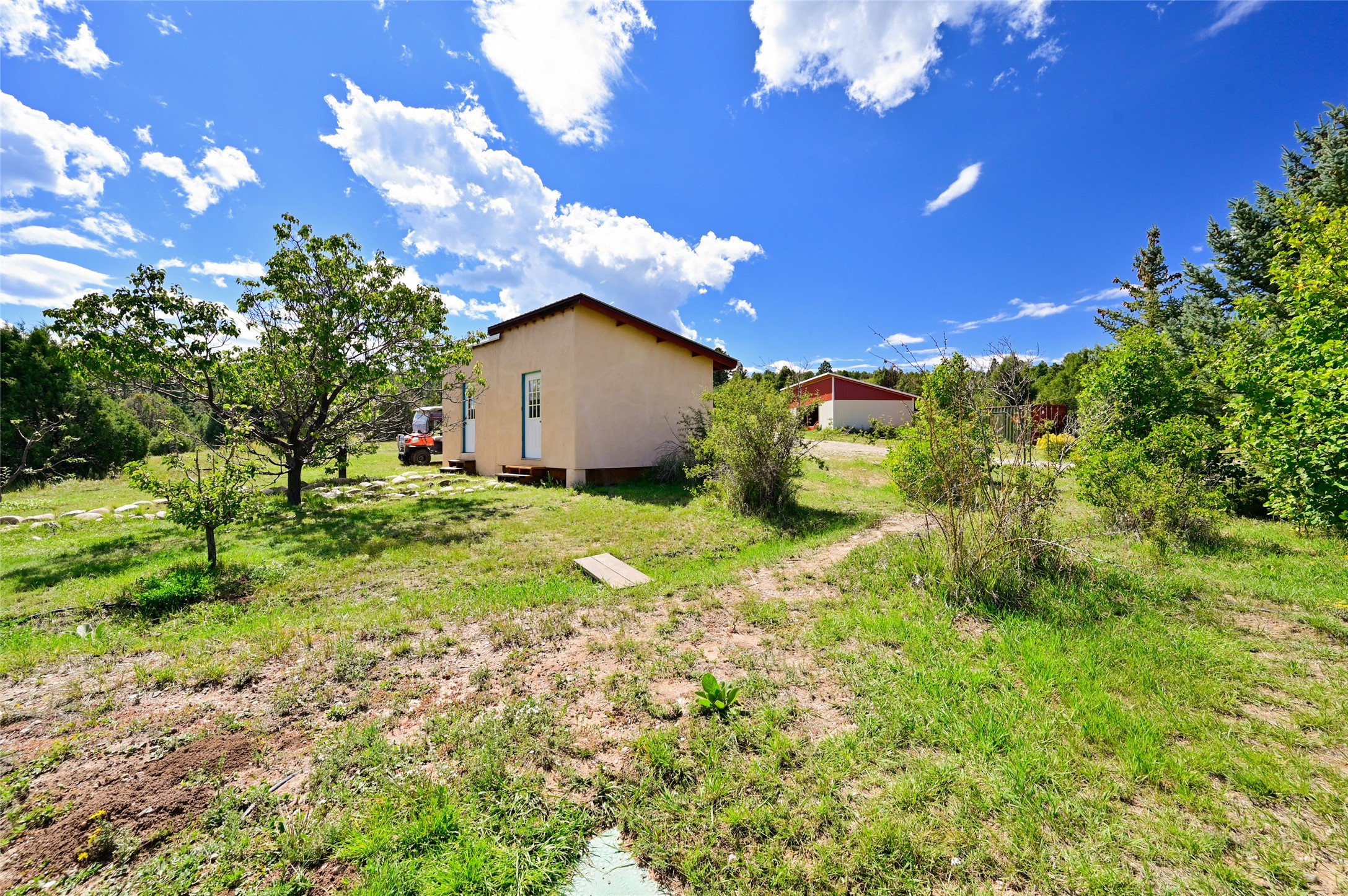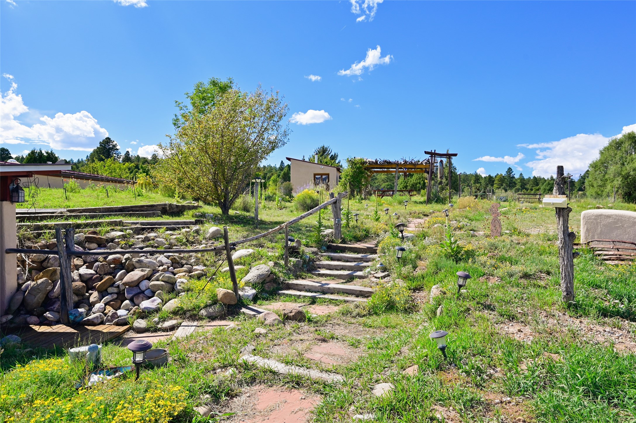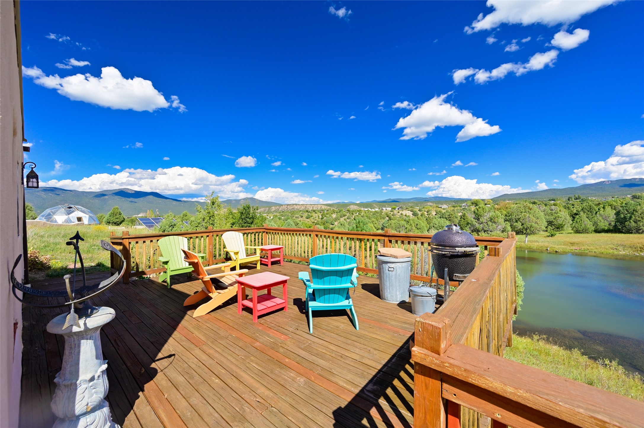 A truly rare 34-acre mountain retreat awaits, nestled in the Sangre de Cristo Mountains with stunning views of Jicarita Peak and Truchas Peaks. This exceptional, self-sufficient, and sustainably developed property is perfect for a small family business, equestrian estate, or serene retreat center.The total living space of 4,100 sq ft includes a charming 1,600 sq ft earth-bermed 2-bedroom home featuring custom stone floors, vigas, radiant in-floor heat in the kitchen and master suite, and an updated kitchen with a Wolf Stove and granite countertops. The home is designed for energy efficiency, maximizing solar gain, and has a wrap-around deck with captivating pond and mountain views.The property also boasts a 2,225 sq ft office/mixed-use building (zoned for cottage industry, previously a successful institute), a 275 sq ft studio/guest house with a half-bath, and a 30' insulated yurt with off-grid solar, ideal for meditation or a classroom--offering immense flexibility and separate spaces for living, working, and gathering.Outside, find unparalleled amenities dedicated to Earth Stewardship and conservation: 10 irrigated acres with water rights for farming or grazing. Rustic 3-stall horse barn and tack room, horse fencing throughout property. 33' geodesic Growing Dome for year-round production. A comprehensive water catchment system utilizing heavy-duty roof guttering on all buildings and multiple cisterns. A quarter-acre pond with a Trex deck, fed by wetlands and springs, and aerated by a windmill. A vast network of maintained trails on forested acres (thinned and managed), offering direct access to the Carson National Forest.Additional features include an owned grid-tied solar array, a root cellar, a 40' cargo container, and extensive landscaping with drip irrigation. This property is a rare gem, beautifully developed, and ready for its next steward.