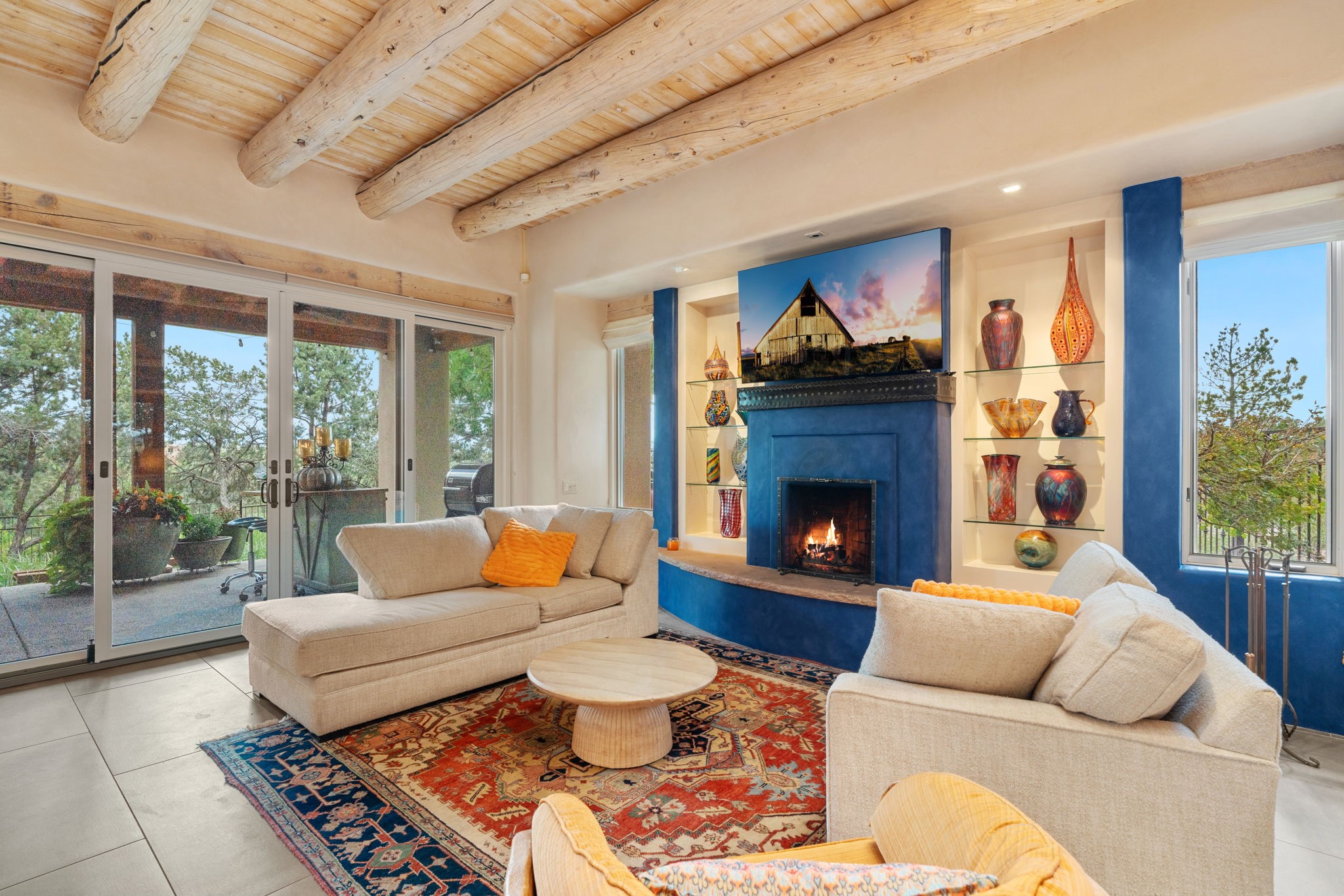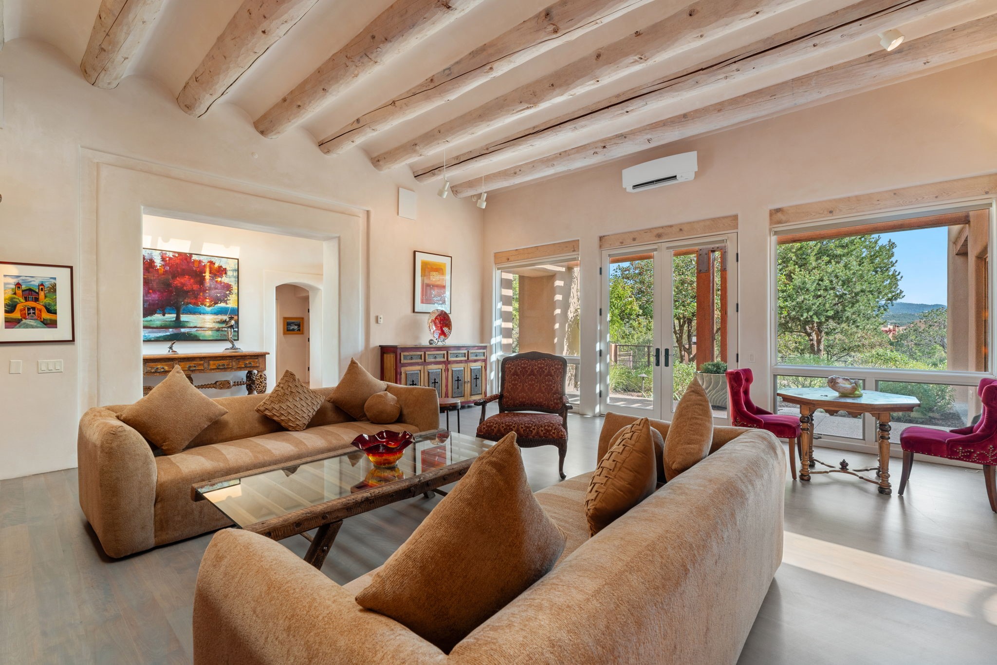 Tucked just a mile from the historic Santa Fe Plaza, this exceptional adobe estate blends classic Northern New Mexico architecture with modern sophistication. Set on a wooded, private property, it features a 3,263 sq. ft. main house and a 1,340 sq. ft. detached casita--ideal for guests or extended family.Handcrafted details abound: viga beams, tile and hardwood floors, and softly curved adobe walls that invite natural light. The great room offers tall ceilings, a grand fireplace, and picture windows framing mountain views. Double doors open to a covered portal with outdoor fireplace and seating for year-round entertaining.Remodeled in 2024, the chef's kitchen includes a six-burner range, convection oven, oversized island, premium appliances, built-in bar, and coffee station--perfect for gatherings large or small.The primary suite is a serene retreat with fireplace, private portal, and spa-style bath with dual closets, double vanities, soaking tub, and glass-enclosed shower. A guest suite, radiant heating, skylights, and seven mini-splits enhance comfort throughout.The detached casita echoes the main home's charm, offering two bedrooms, two baths, a kiva fireplace, wet bar, breakfast nook, and office area--an ideal guest or studio space.Outdoors, multiple patios and sitting areas blend seamlessly with the landscape. A 3,000-gallon cistern supports irrigation, and an EV-ready outlet adds modern convenience.With timeless adobe design, curated upgrades, and proximity to downtown Santa Fe, 1085 Camino Maana captures the essence of refined Southwestern living.