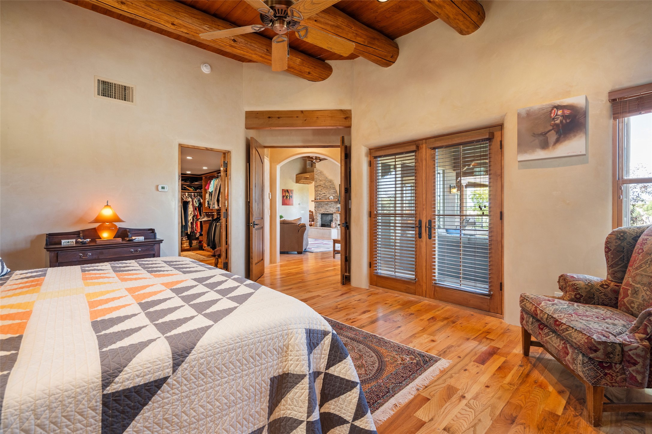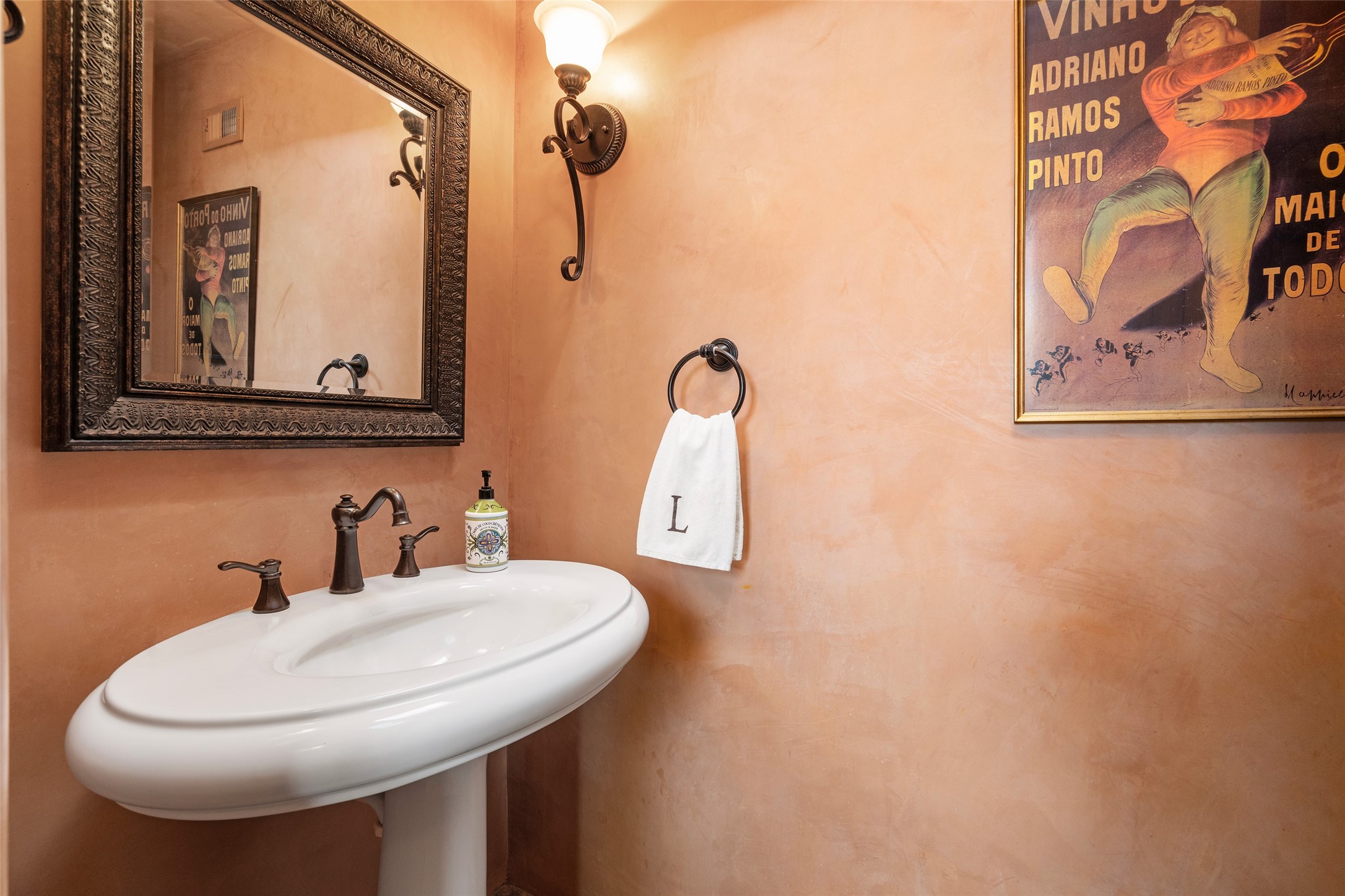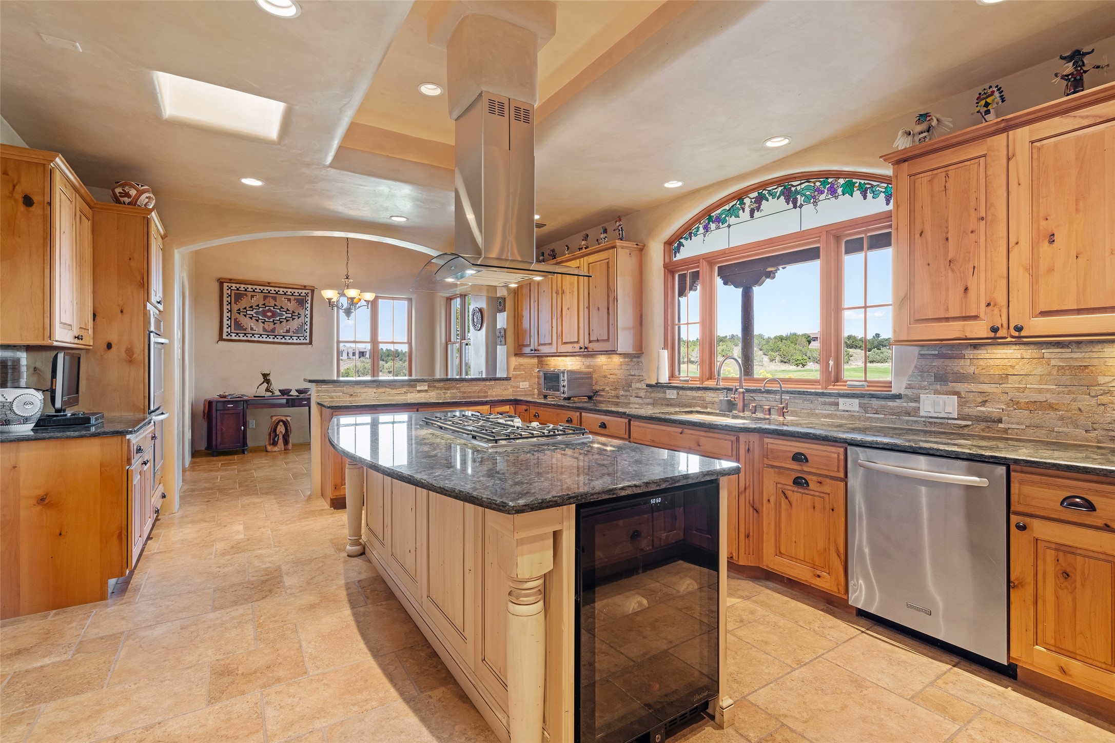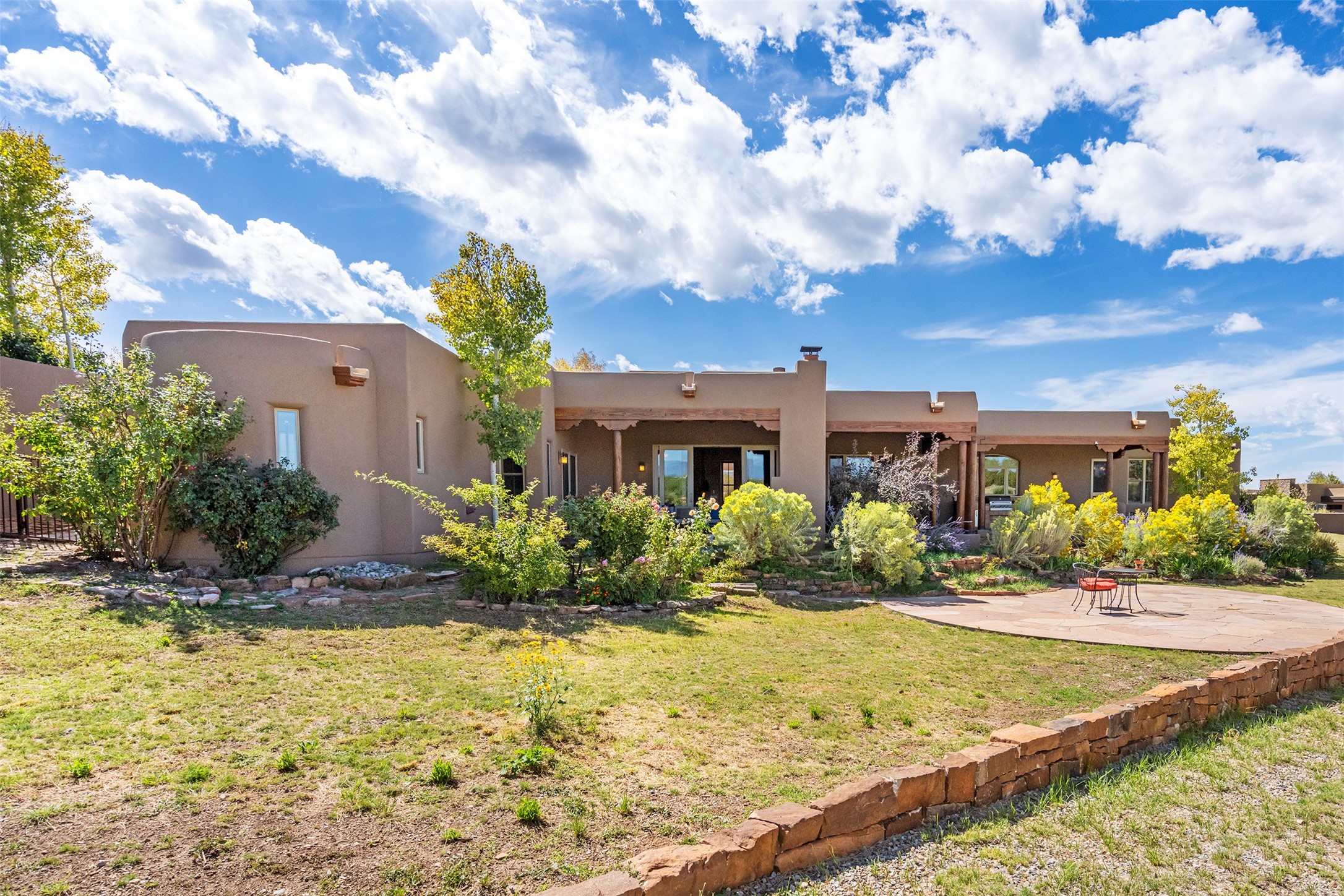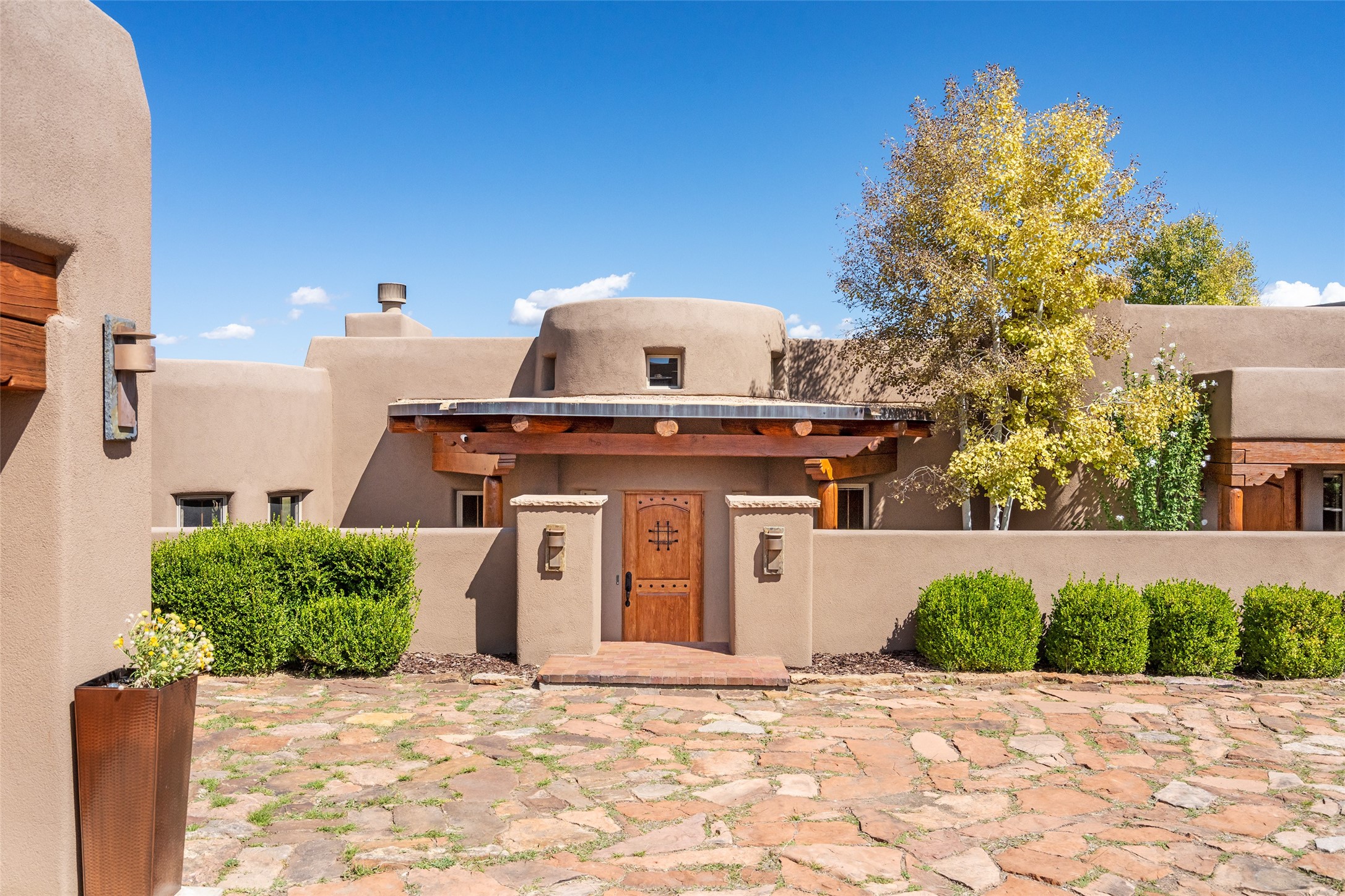 The Grand Trifecta of Santa Fe Living!! This exceptional Las Campanas residence delivers the ultimate blend of golf course living, panoramic mountain vistas, and timeless Santa Fe design. Perfectly sited on a quiet cul-de-sac overlooking the 8th hole of the Sunset Golf Course, the home showcases sweeping views of both the Sangre de Cristo and Jemez mountain ranges--truly some of the finest in Santa Fe. From the hand-laid stone driveway to the beautifully landscaped entry, the curb appeal sets the tone for what awaits inside. Rich Santa Fe character abounds with richly hued, hand-troweled plaster walls, an Anasazi stacked stone dual-sided fireplace, magnificent ceiling treatments including massive beams, vigas and wood ceilings, beautifully carved corbels, and elegant recessed ceiling details. Flagstone accents and custom craftsmanship flow seamlessly throughout. The thoughtfully designed floor plan encompasses three spacious ensuite bedrooms, each distinctly private. The primary suite is a retreat of its own, complete with a spa-like bath featuring dual vanities, a soaking tub, and French doors leading to the expansive portals. At the heart of the home, the chef's kitchen combines modern function with rustic warmth--offering custom cabinetry, granite counters, professional-grade appliances, a center island with five-burner cooktop, and a large pantry. The adjacent dining area captures both views and intimacy, anchored by the stone-trimmed two-sided fireplace. Outdoor living is elevated with a wrap-around portal, built-in grill, and unobstructed vistas of the golf course and surrounding mountains. From sunrise over the Sangres to sunsets over the Jemez, every moment here is a masterpiece. Whether as a perfect lock-and-leave getaway or a full-time residence, this rare offering blends masterful design, luxury, and location--Santa Fe living at its very best.