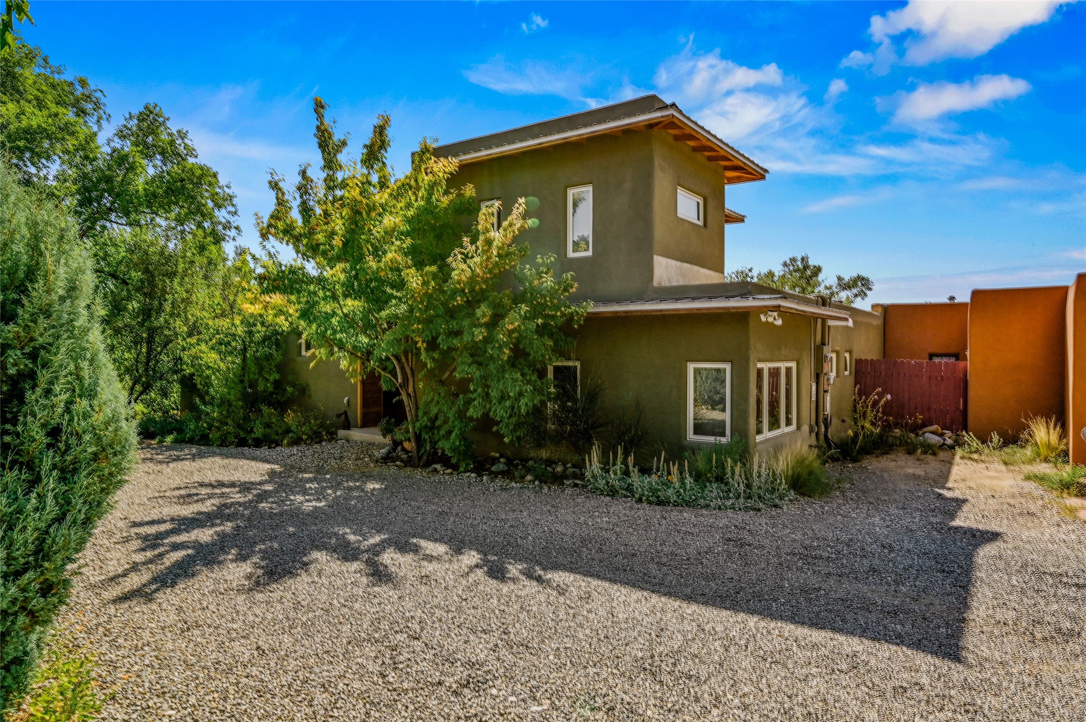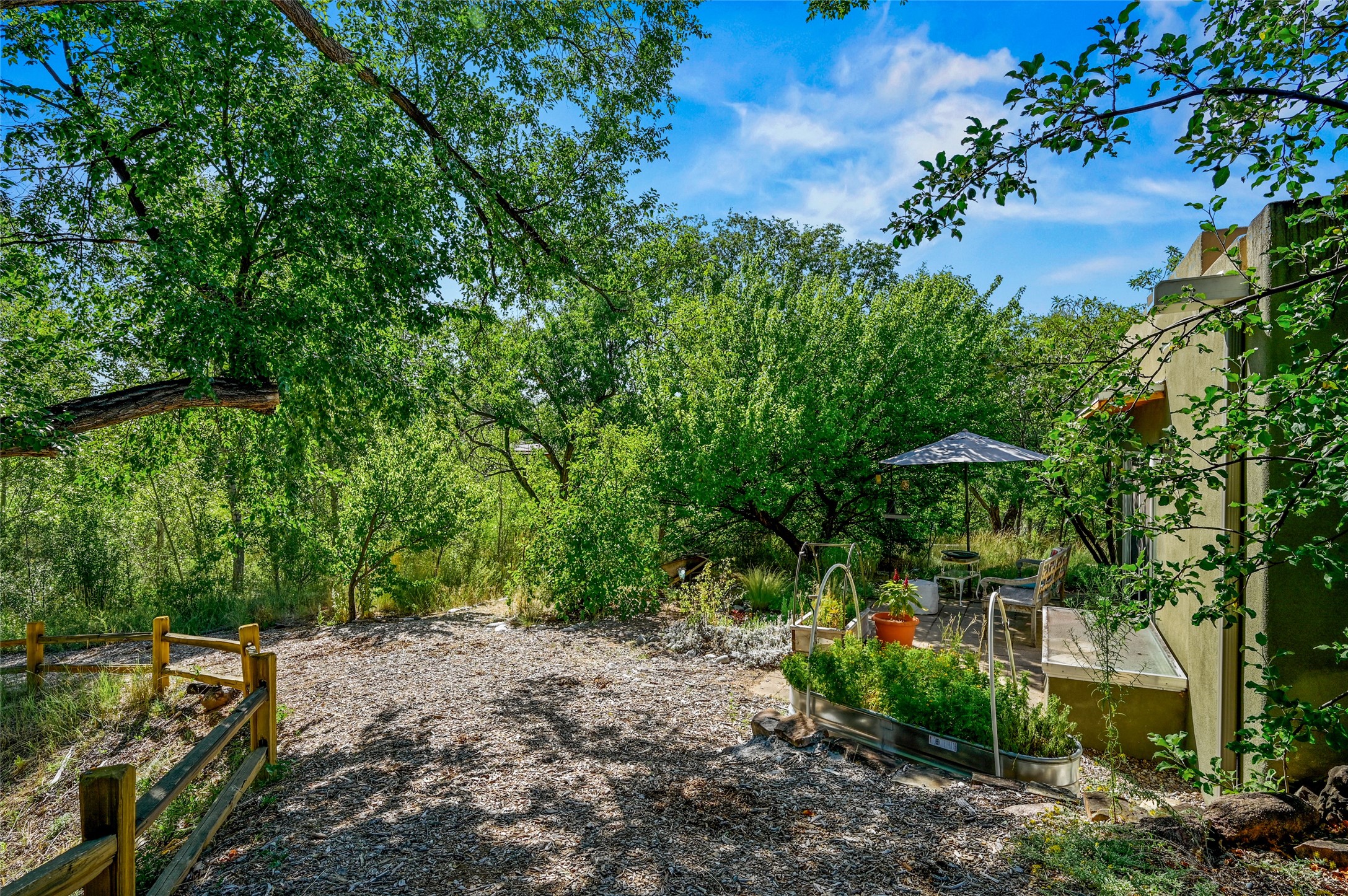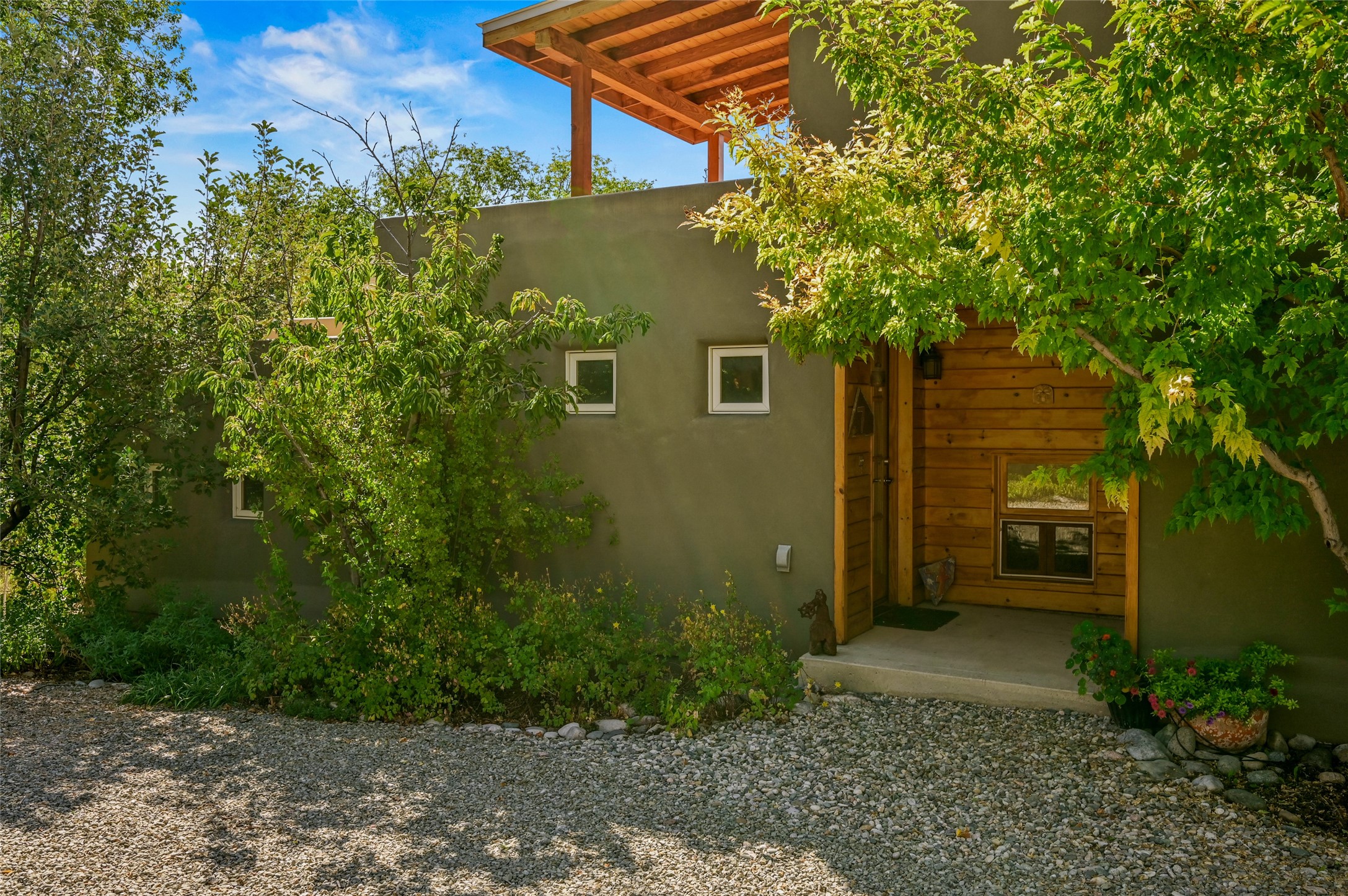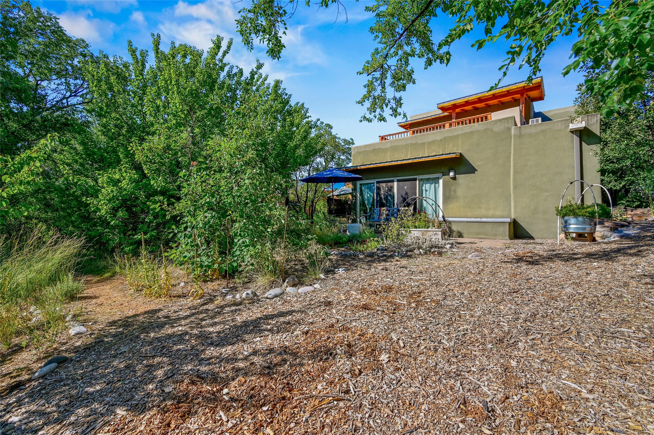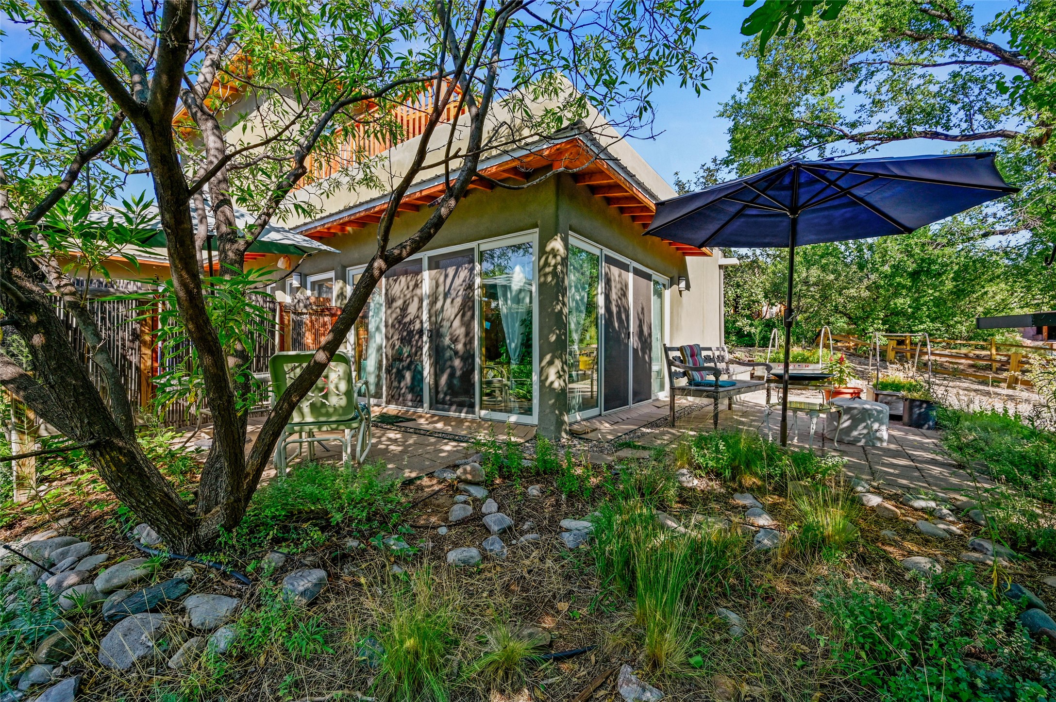 Nestled in the serene Tres Placitas del Rio Co-housing, an intimate enclave of only 11 homes on 2.5 acres. This 3 bedroom, 3 bath residence offers a rare blend of ecological living and artistic inspiration. Set along the Western banks of the Santa Fe River, this unique community is designed for those who cherish nature, creativity and connection.The home itself provides comfortable light filled spaces with a warm, inviting character. Ideal for families, gardeners or artists seeking both privacy and a sense of belonging. Solar panels on the roof provide energy efficiency, while a spacious basement awaits your creativity, perfect for a studio, workshop or additional living space. Beyond the private residence, residents share access to beautifully landscaped common areas featuring terraces, walking paths, an outdoor dining pavilion, an organic garden, fruit trees and a charming barn with goats and chickens.More than a home, this is a sustainable sanctuary where community and nature harmonize. Just minutes from all the cultural and culinary delights of downtown Santa Fe.