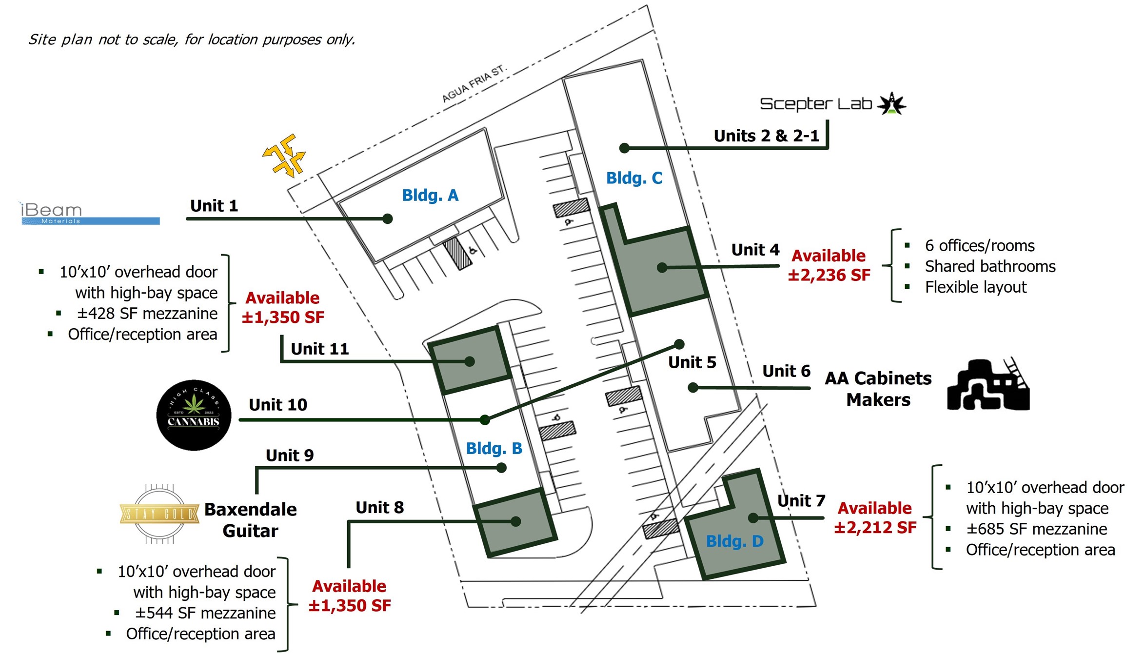 AVAILABLE: Unit 4: 2,236 SF, Unit 7: 2,212 SF, Unit 8: 1,350 SF, Unit 11: 1,350 SF | LEASE RATE: $20.00/SF + NNN | ZONING: I-2, General Industrial | HIGHLIGHTS: Centrally located, Accessible by major roads, Adequate parking, Located in a light and heavy industrial area, Monument sign available, Full circulation property, 20'-24' ceilings height, Ideal for: Performing arts, Manufacturing, Scientific labs, Heavy/light industrial applications, Storage, Office/warehouse space