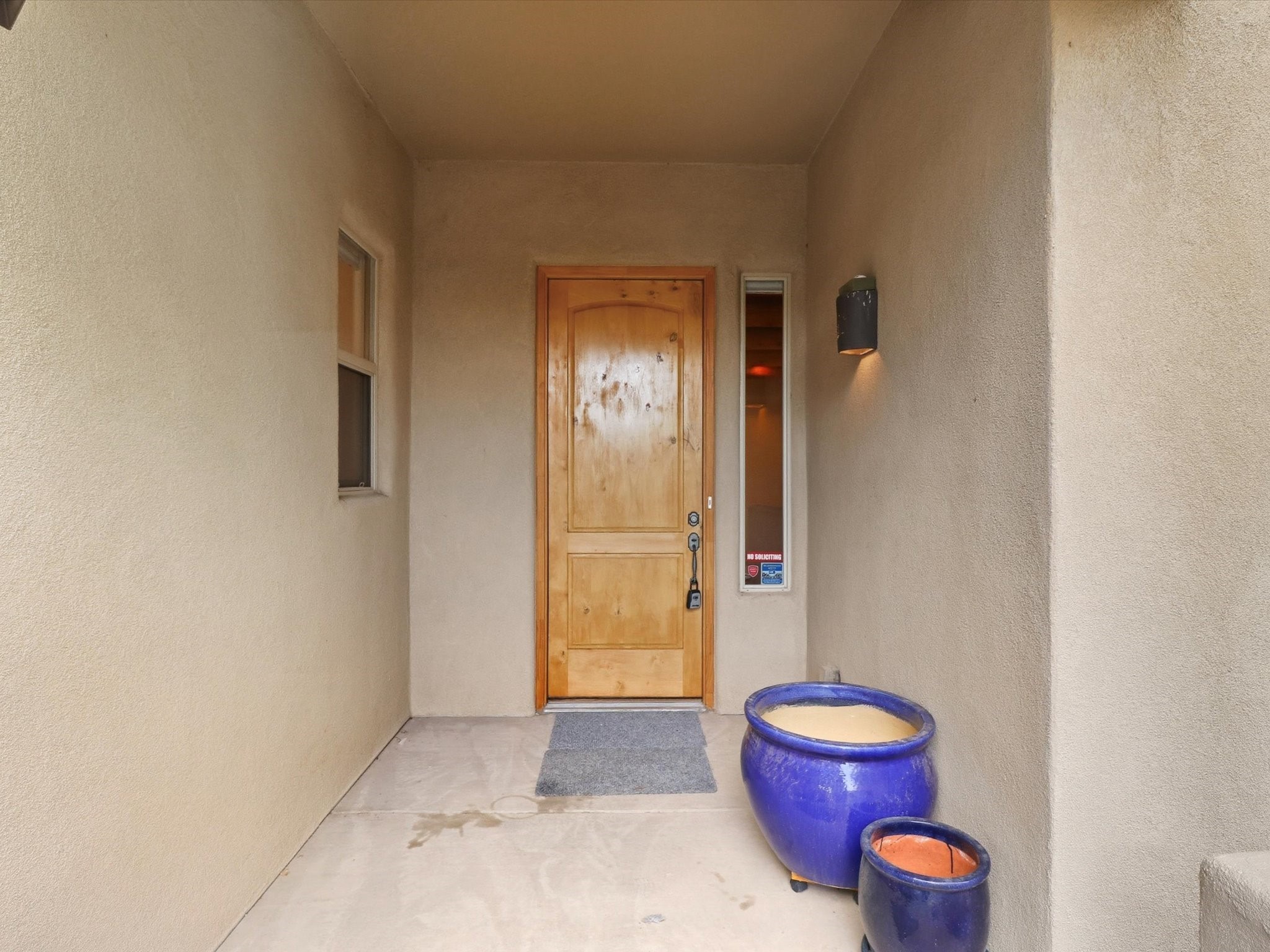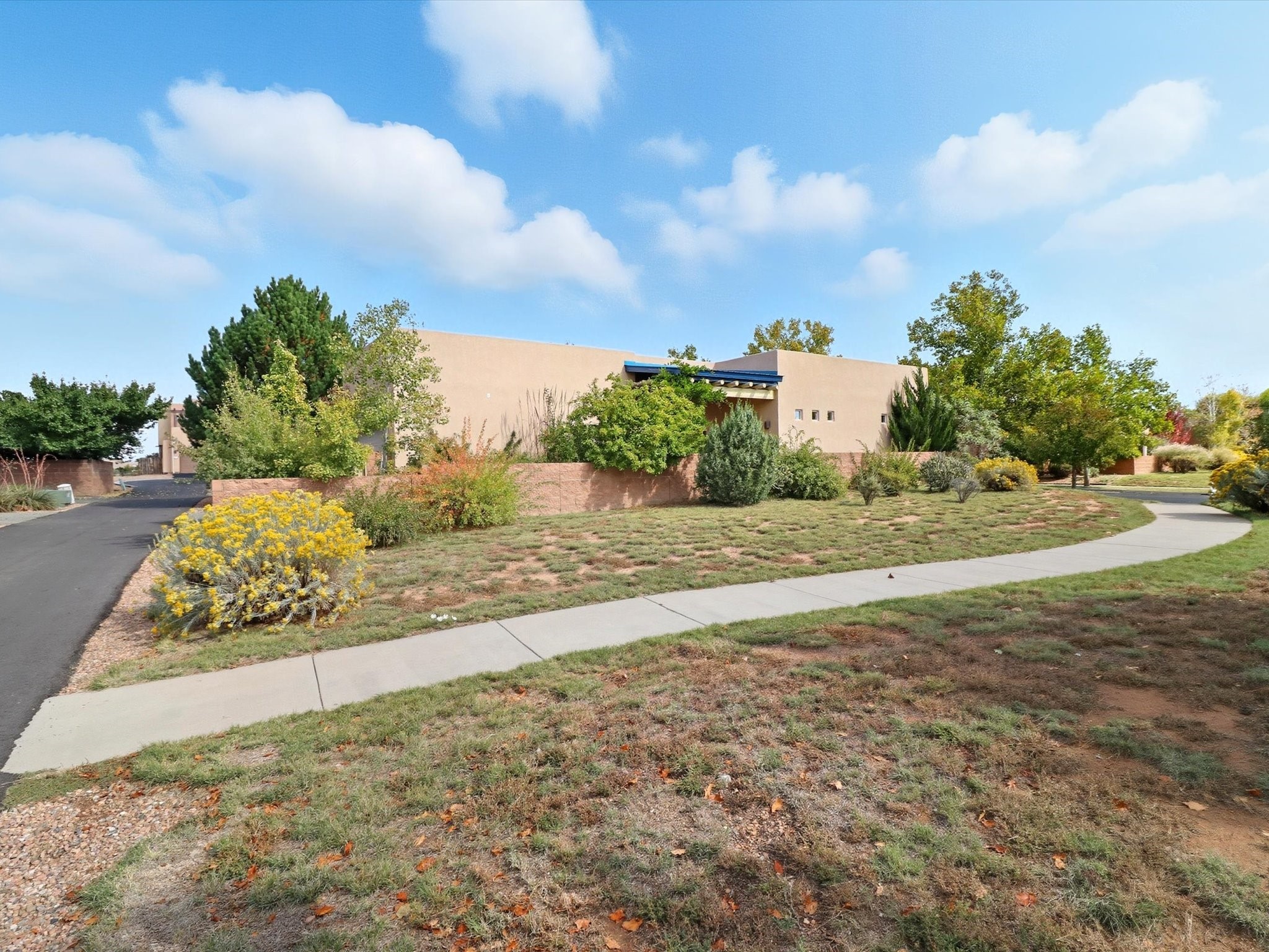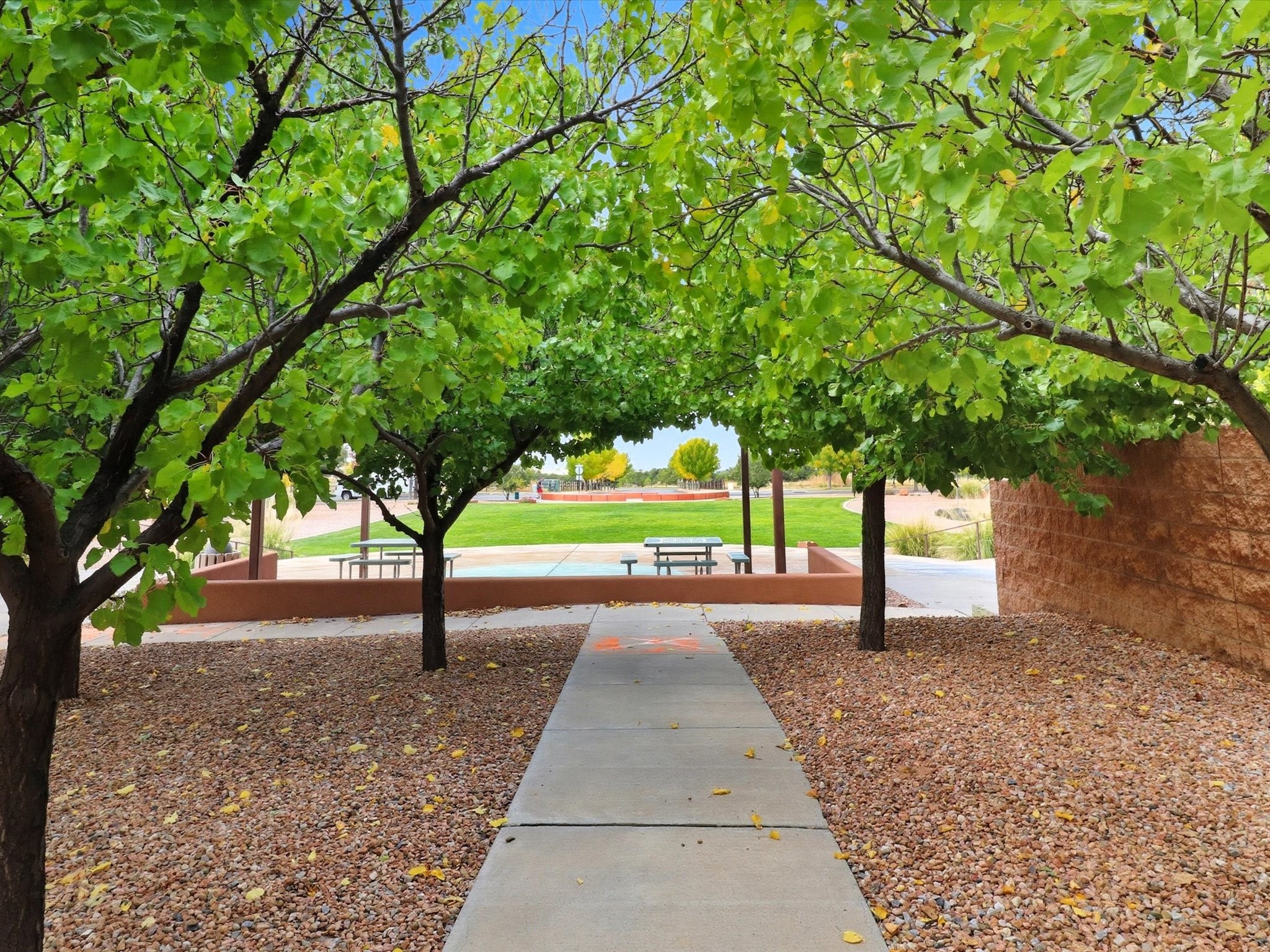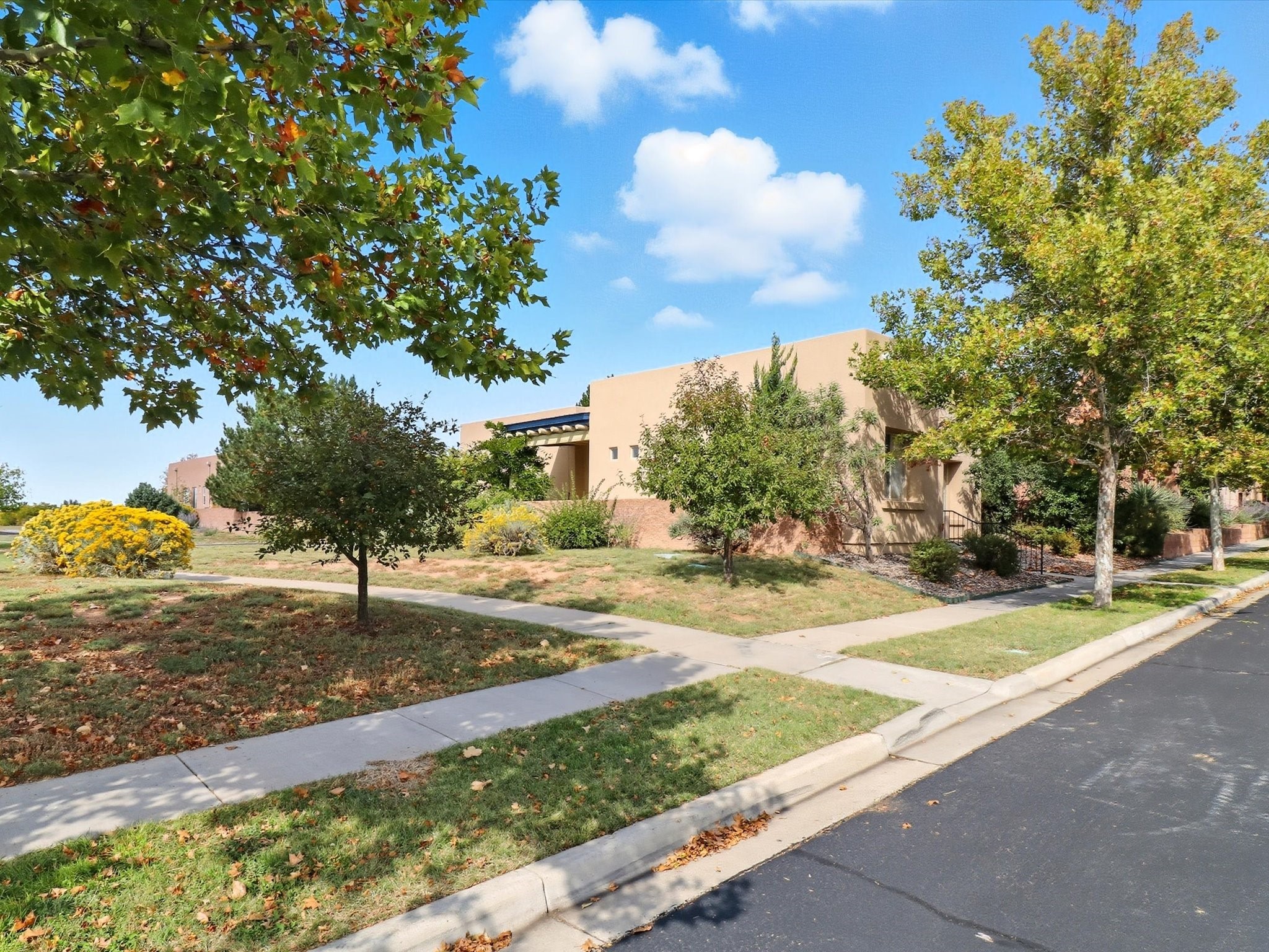 Step inside and be greeted by a stunning living room featuring a classic viga ceiling with latilla accents and custom built-in book shelving, creating a perfect blend of character and functionality. The open-concept living and dining area offers a seamless flow, ideal for entertaining or relaxing in style.The fully equipped kitchen has stainless steel appliances, a breakfast counter, and glass door access leading to the beautiful outdoors--inviting natural light and effortless indoor-outdoor living. The bright dining area opens directly to the stone-paver patio covered by a pro-panel style roof, perfect for morning coffee or evening gatherings surrounded by a mature garden filled with roses.Enjoy the thoughtful layout that connects the backyard effortlessly to both the kitchen and primary bedroom. The primary suite is a serene retreat, featuring direct access to the outdoors, a walk-in closet, and an ensuite bath with dual sinks and an enclosed shower.Situated on the south side next to the spine park walkway, this home enjoys extra sunlight, privacy, and open space--a rare find in Rancho Viejo. The covered patio and front faade framed by mature trees add to the home's peaceful and welcoming ambiance.Whether you're relaxing in the garden, hosting guests under the covered patio, or curling up with a book in the living room, this home offers the perfect balance of style, comfort, and tranquility.