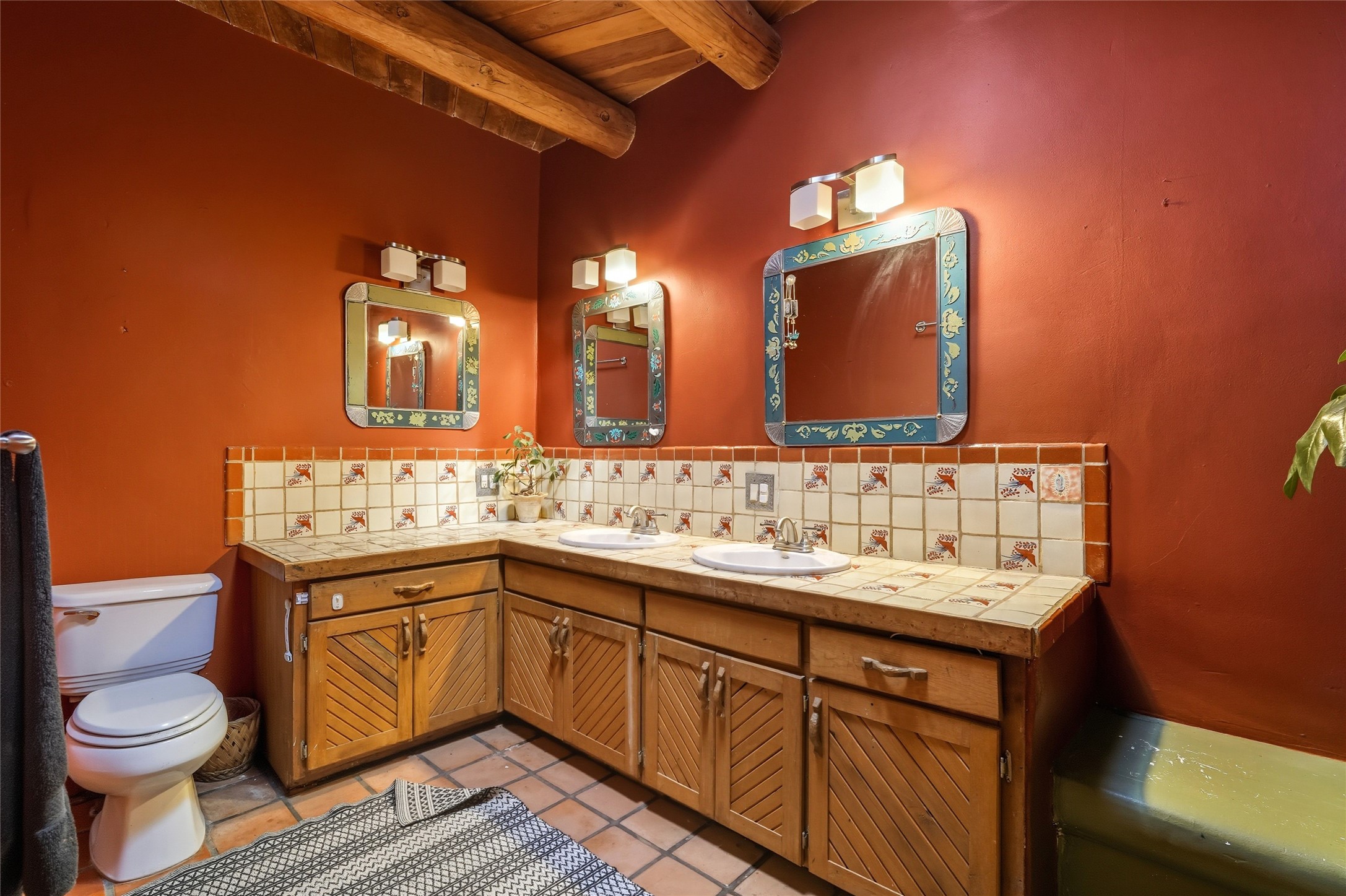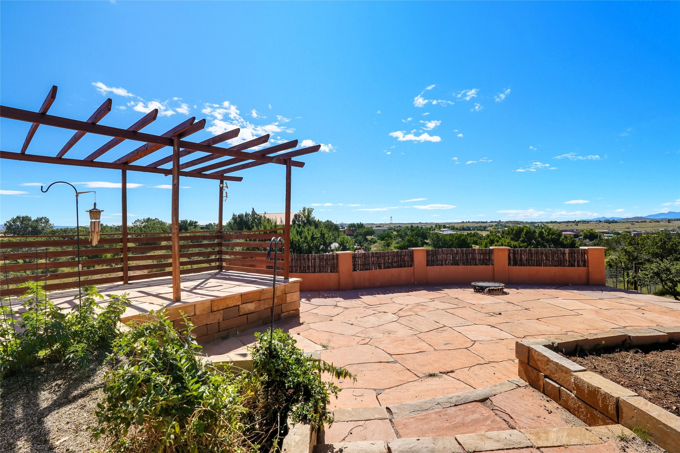Experience classic Santa Fe charm in this Pueblo-style home nestled on 2.5 acres with sweeping views. The 2-bedroom, 2-bathroom main residence spans 2,134 sq. ft. and showcases authentic Southwestern details, including vigas, a cozy kiva fireplace, and inviting living spaces designed for comfort and style. A spacious flagstone patio extends the living outdoors, offering the perfect spot for entertaining or enjoying peaceful sunsets. Gardeners will appreciate the on-site greenhouse, ideal for year-round cultivation. The property also features a 500 sq. ft. guest house with its own kitchen, bathroom, and two flexible rooms that are perfect for hosting visitors, creating an art studio, or rental. This retreat offers the rare combination of privacy, natural beauty, and convenient access to downtown Santa Fe amenities.