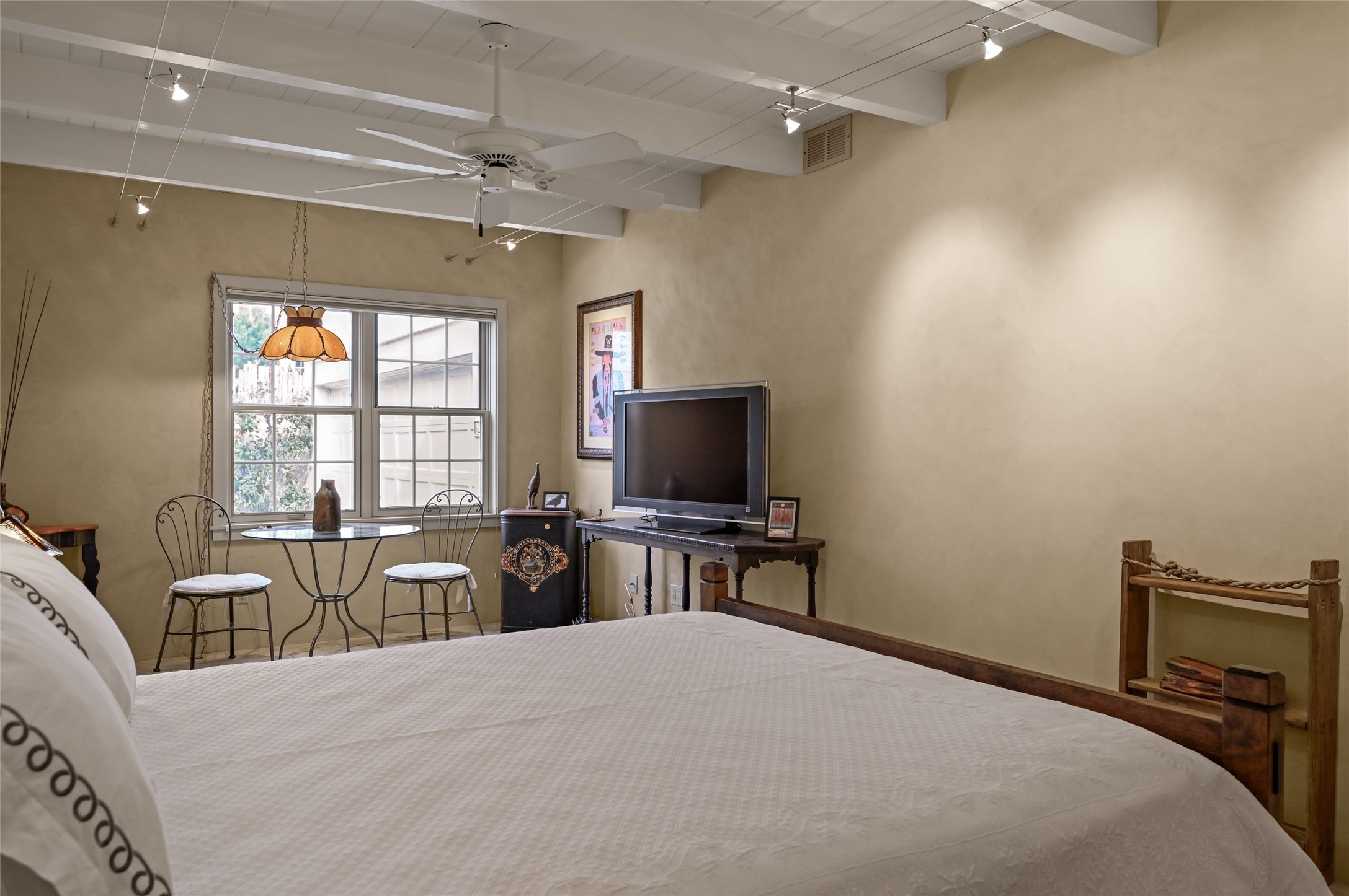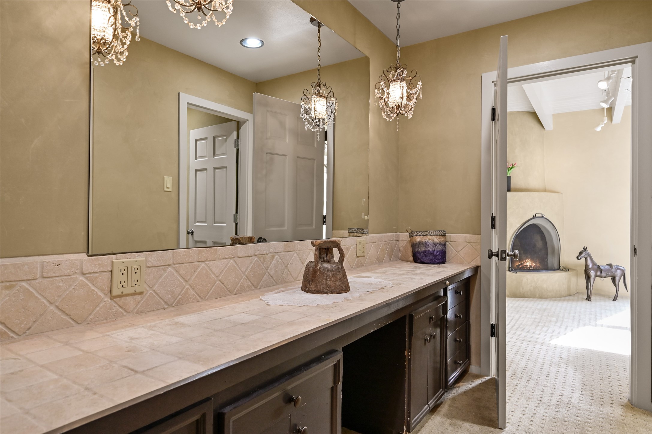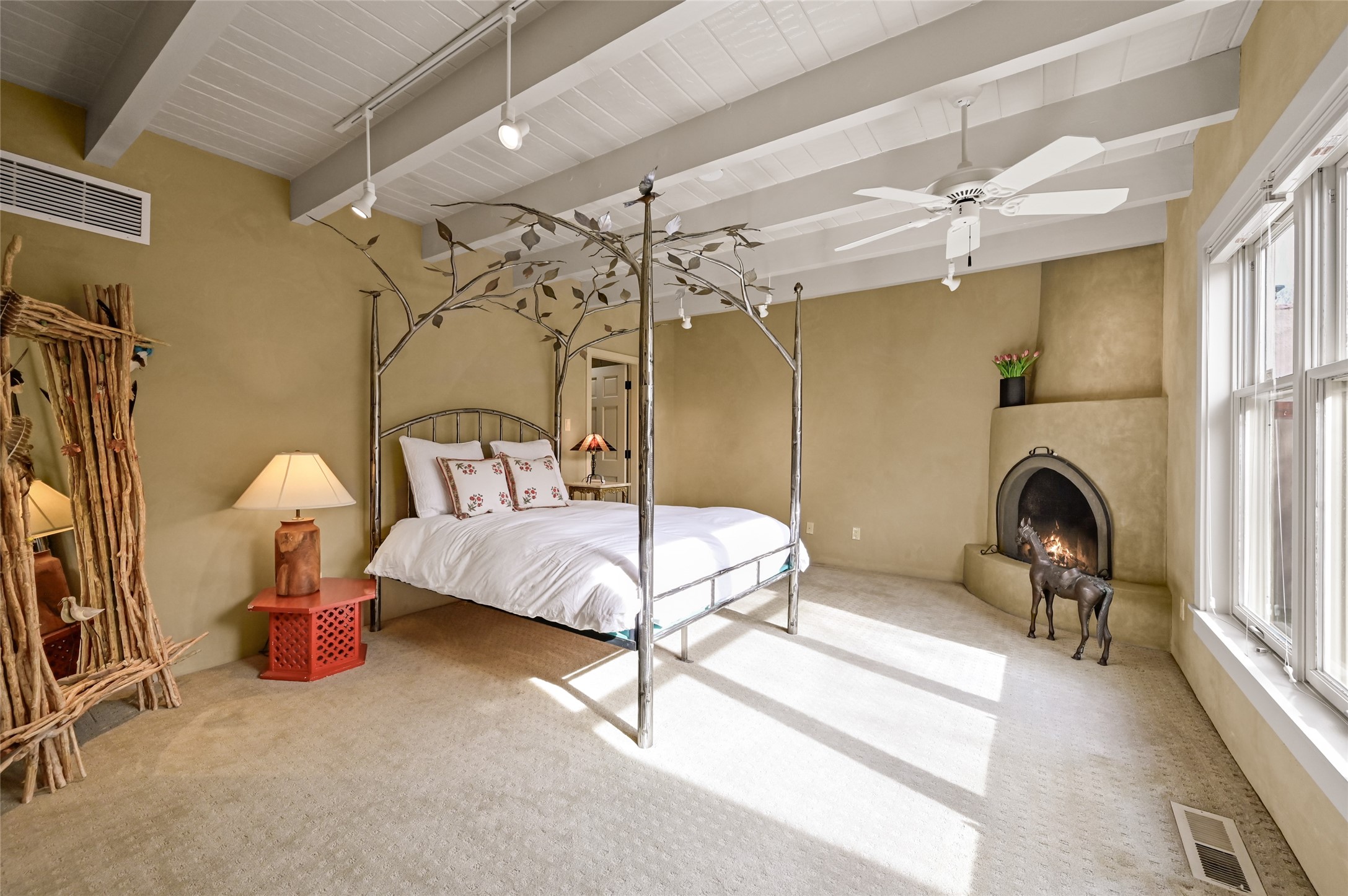 In the heart of Santa Fe, where art, culture, and cuisine intertwine, lies a hidden gem within the exclusive gates of The Compound Condos. Sheltered by graceful old trees and surrounded by lush, mature gardens, this residence offers a quiet escape moments from Canyon Road and the pulse of downtown. A private courtyard welcomes you inside, where sunlight pours through large windows and sliding doors, illuminating a warm living space anchored by a classic fireplace. Here, mornings begin with the scent of brewed coffee and evenings drift easily into fireside conversations. The open country kitchen, complete with generous counter space, vigas, and skylights, feels like the heart of the home. The primary suite, which captures the soft glow of the eastern light includes a kiva fireplace, a spacious dressing area, laundry, and full bath. A comfortable guest suite with walk-in closet and 3/4 bath ensures everyone feels at home. A heated two-car garage with an extra storage room adds practicality to this serene and private haven. A rare offering, where every detail reflects the timeless charm and understated feel of Santa Fe living.