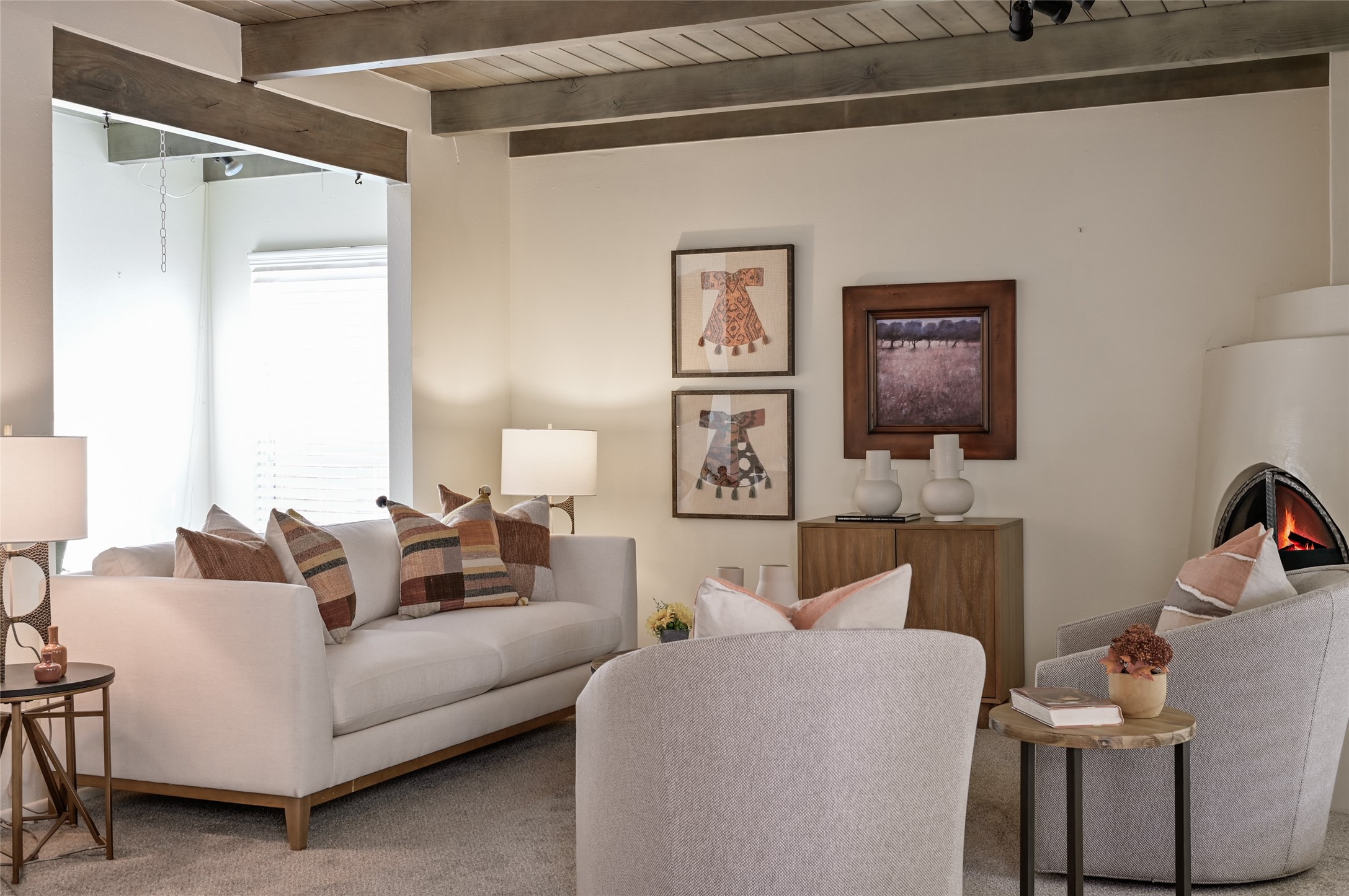 Step into this charming 2-bedroom, 2-bath retreat of approximately 1,384 sq ft in the desirable Park Plazas neighborhood of Santa Fe. This home offers an exceptional blend of comfort, potential and outdoor space.Inside, the residence showcases a flowing open-living concept anchored by a living room with a kiva fireplace and rich New Mexico character. The adjacent kitchen and dining area afford functionality and ease for daily living and entertaining. Two well-sized bedrooms provide room for guests, a home-office or creative studio, and the full bath completes the thoughtfully arranged floorplan.Outside, the expansive lot offers unique potential-- imagine a private terrace or garden oasis, within a serene, tucked-away setting yet minutes from city conveniences. Walkable trails, community green space and an active HOA atmosphere make Park Plazas a unique address in the Santa Fe market.