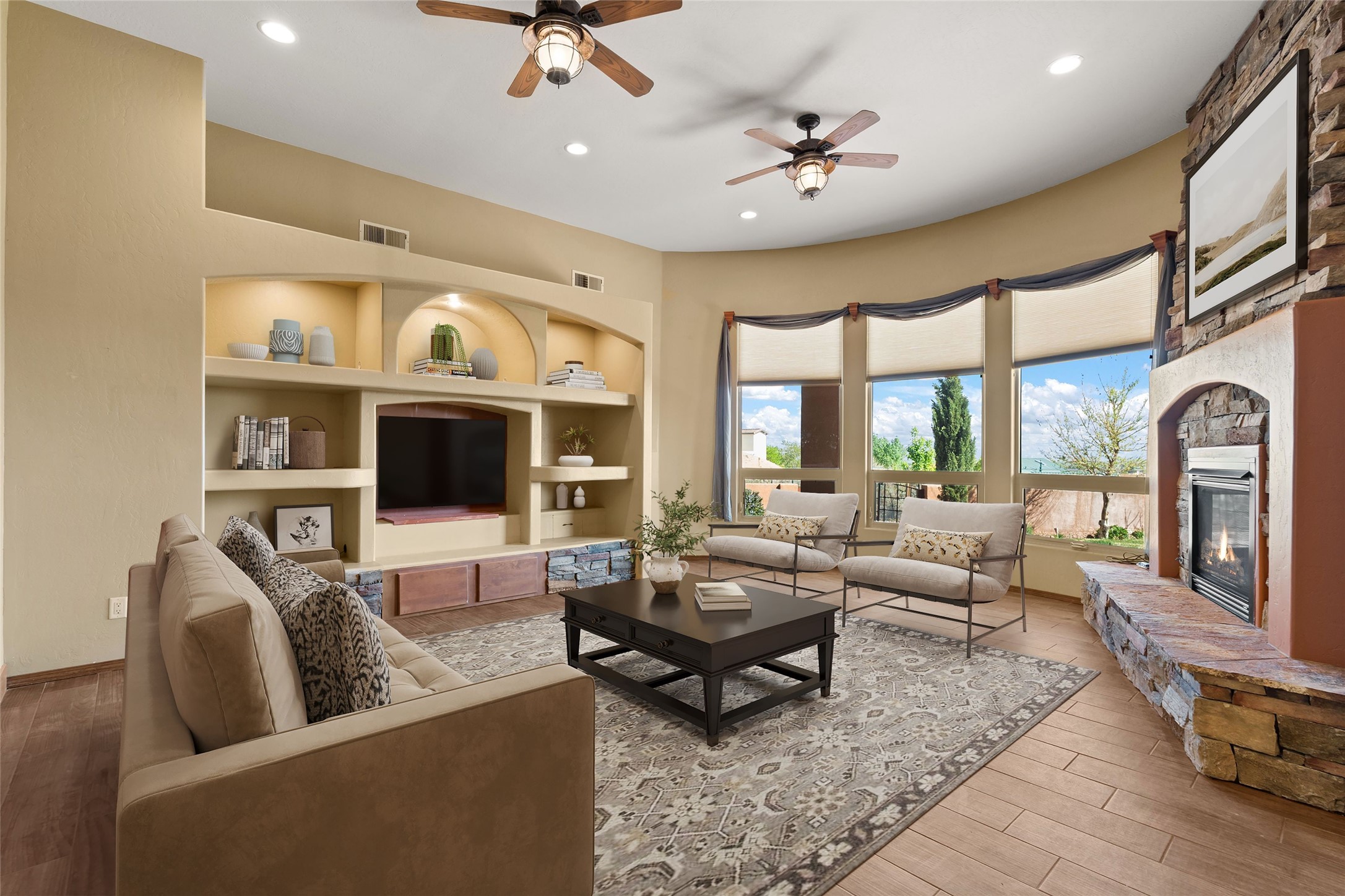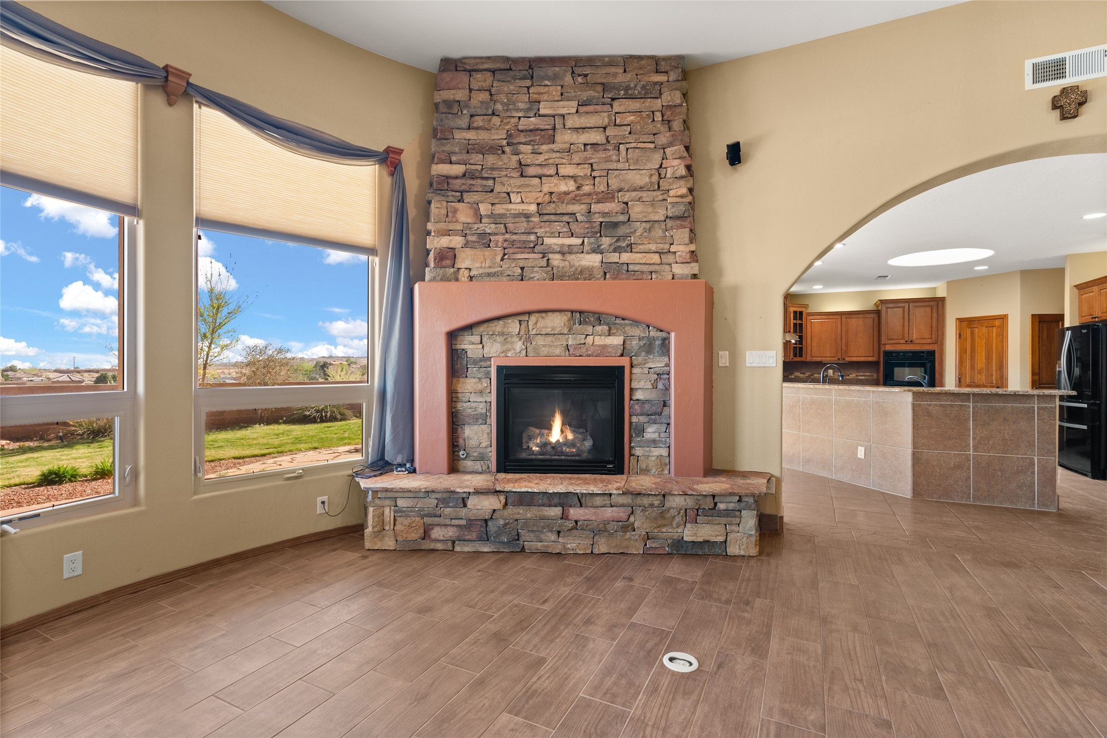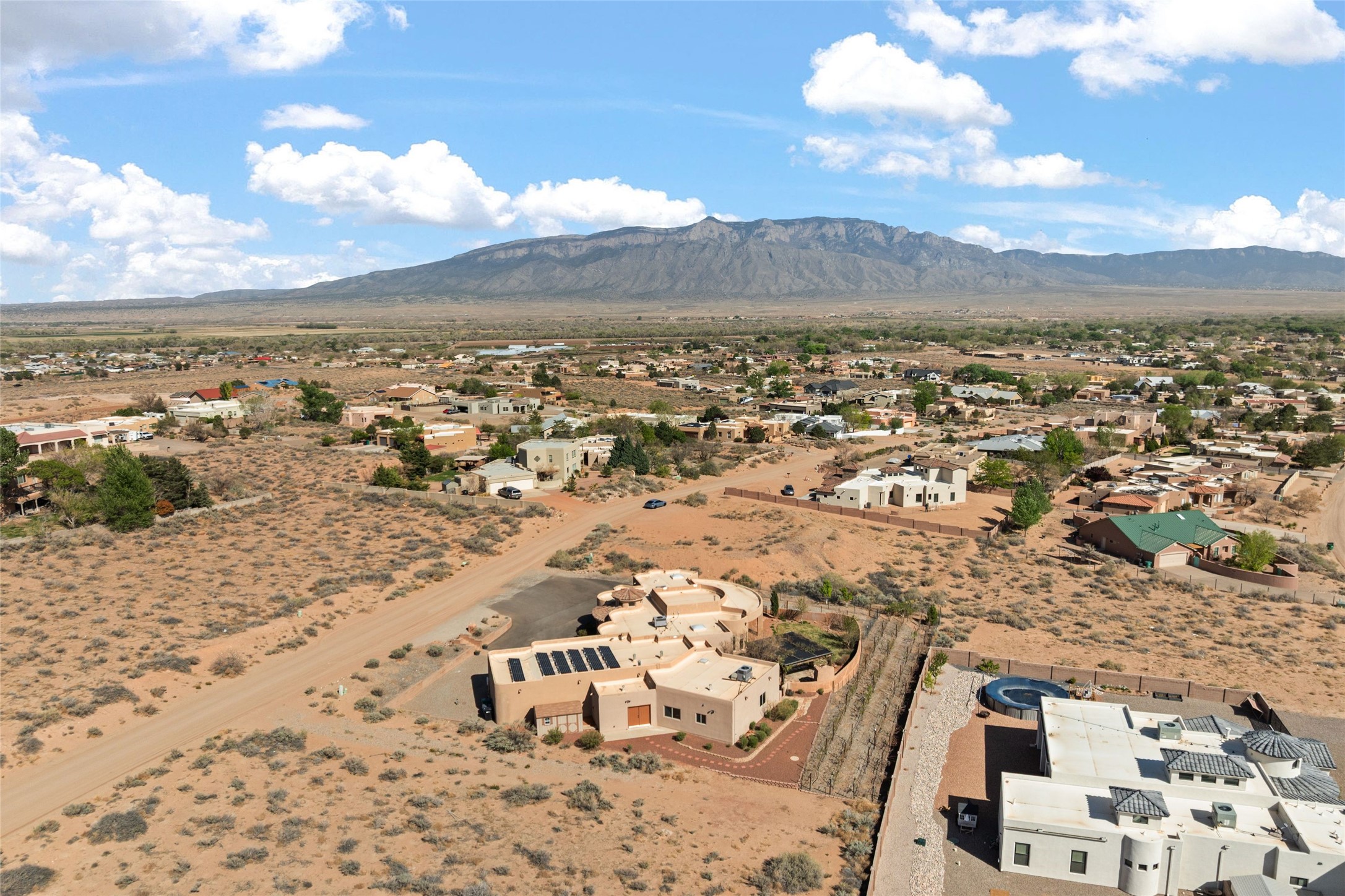 Seller owned solar and a private well! Enjoy the space without the high costs. Nestled on a lush and generous .52-acre lot in Rio Rancho, this property delivers expansive indoor-outdoor living, and countless features including a separate living area/casita. The home includes an oversized 3-car garage (1,488 SF) with extended depth, a dedicated hobby/game room, a 10x15 woodworking space, and a separate storage shed -- perfect for every project or pastime. The main house is designed with community and comfort in mind. The chef's kitchen boasts a gas cooktop, double convection ovens, dual sinks, a walk-in pantry, and flows effortlessly into the dining and living areas -- perfect for entertaining.A stacked stone custom gas log fireplace with banco seating adds cozy ambiance. The primary suite features southern views and private access to the extended covered back patio, a snail shower, garden tub, dual sinks, and a walk-in closet. Three additional bedrooms and two bathrooms provide ample room for children, guests, or office space.18-panel owned solar system installed in 2016. A central vacuum system adds further convenience. A standout feature is the spacious attached 800 SF casita, offering a full kitchen, living room, walk-in closet, and ensuite bathroom with linen storage. All on one level with no carpet, this private space is ideal for in-laws, guests, or even potential rental income.Outdoors, create unforgettable memories in the pergola-covered patio wrapped in grapevines, with a custom wood-burning fireplace and banco seating -- ideal for BBQs, al fresco dinners, and relaxing evenings. The property's mature vineyard includes Cabernet Sauvignon, Chardonnay, and more. Owners and past owners have previously had local farmers care for the grapes in exchange for the fruit at harvest time making this lush landscaping easy to enjoy.Edible landscaping surrounds you with fruit trees and raised garden beds for vegetables and herbs. New roof (2019).