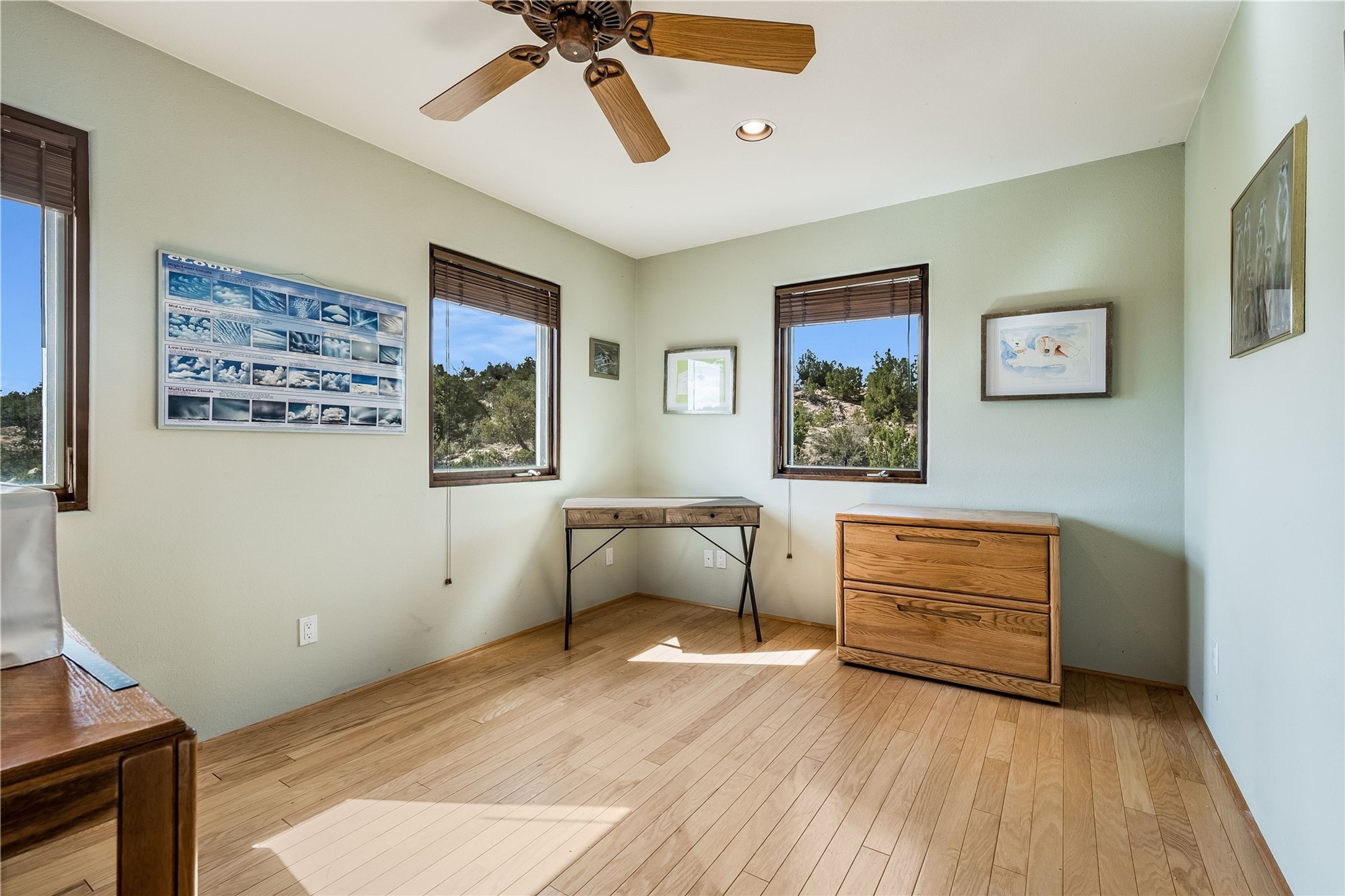 Welcome to your private Southwestern sanctuary--an enchanting 3-bedroom, 2-bathroom retreat nestled on 6.5 acres of beautifully landscaped land. Horses allowed! Acreage backs to preserved land. From the moment you step inside, you're greeted by the warmth of traditional wood vigas and the inviting glow of a kiva fireplace.The thoughtfully designed layout offers two spacious bedrooms and a full bathroom on the main level, perfect for guests or family. A bonus living area opens to a gated courtyard, creating a peaceful space for morning coffee or evening gatherings under the stars. Upstairs, the primary suite is a true haven, featuring a wood-lined deck with breathtaking mountain views and a bonus room ideal for an art studio, yoga space, or home office.Outside the magic continues to a shaded gazebo, perfect for relaxing or entertaining. A separate outbuilding offers endless possibilities--whether you dream of a workshop, creative studio, or guest space. The covered carport includes additional storage. There is no HOA.This property is more than a home--it's a lifestyle. A rare opportunity to embrace tranquility, creativity, and the natural beauty of New Mexico, all within your own private oasis.