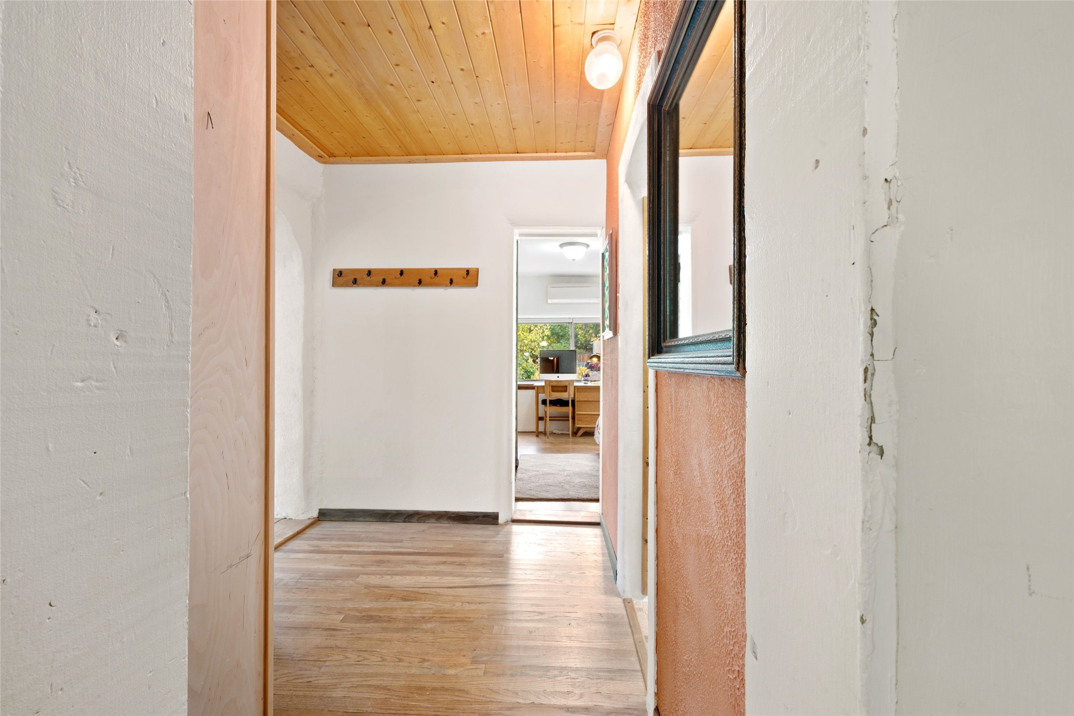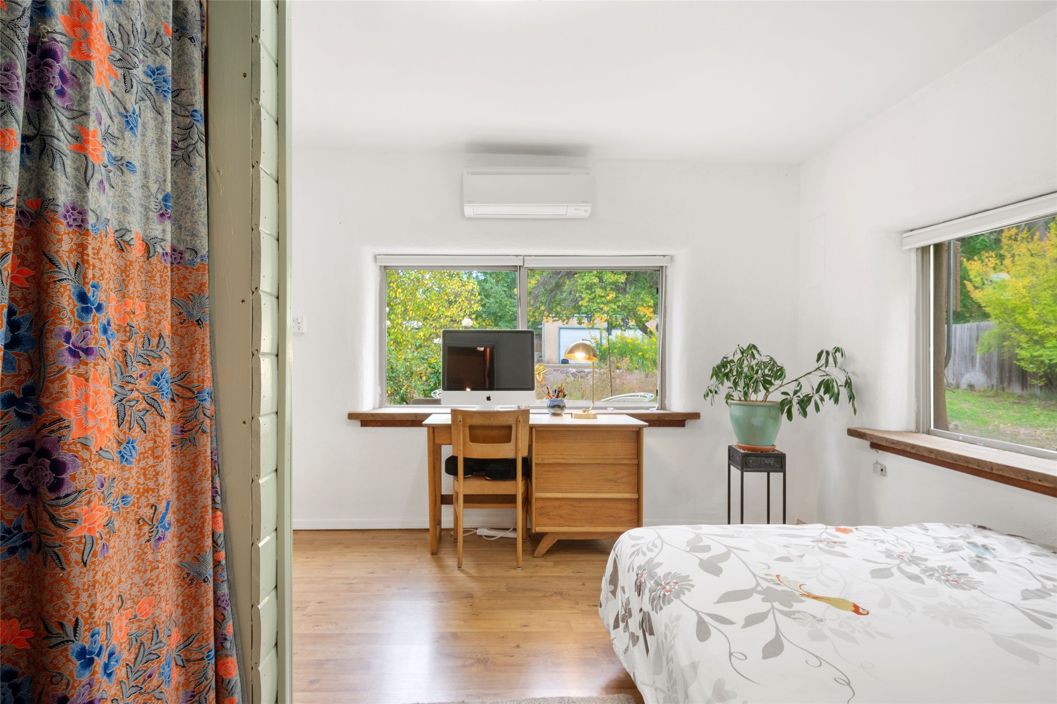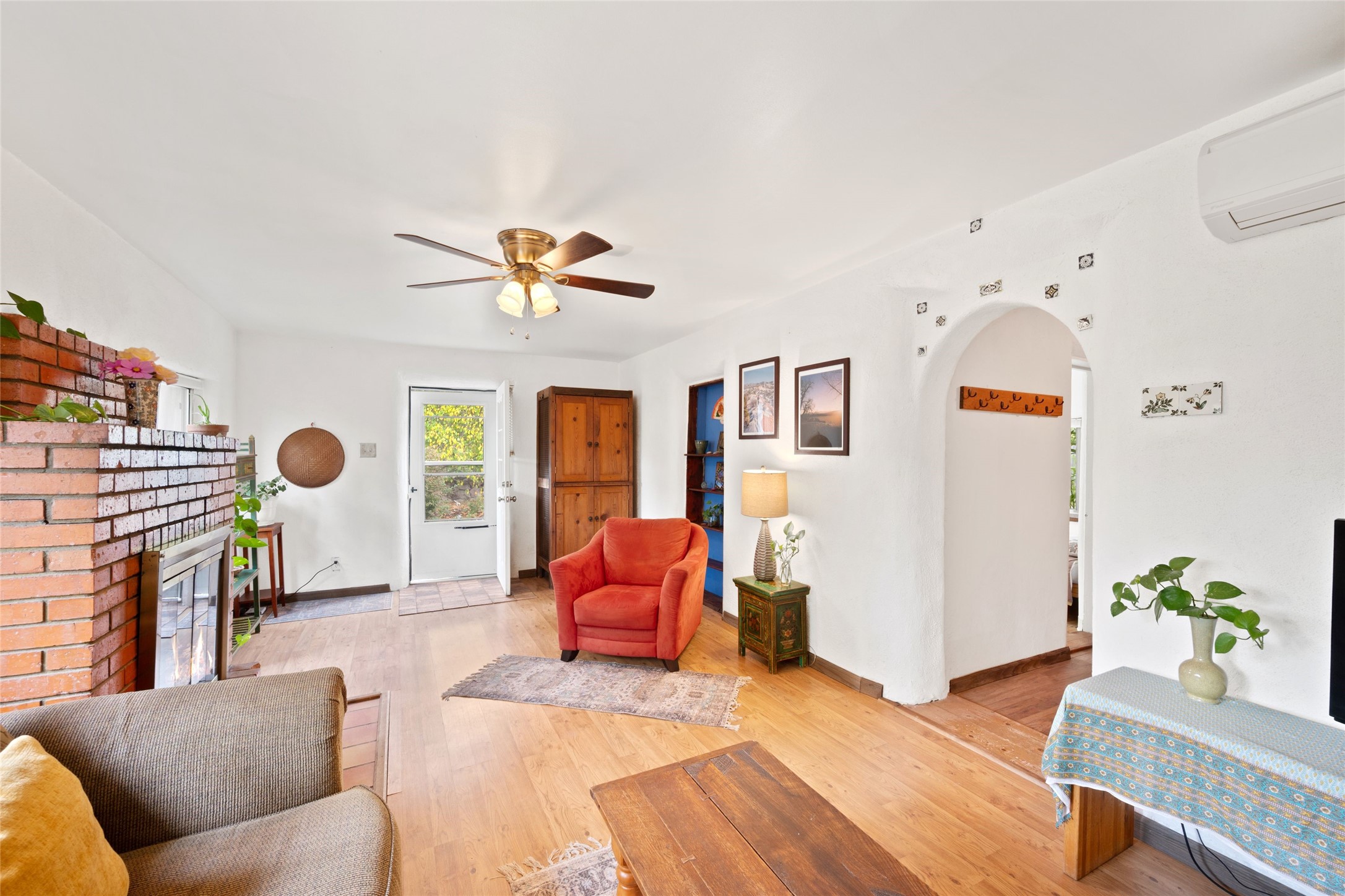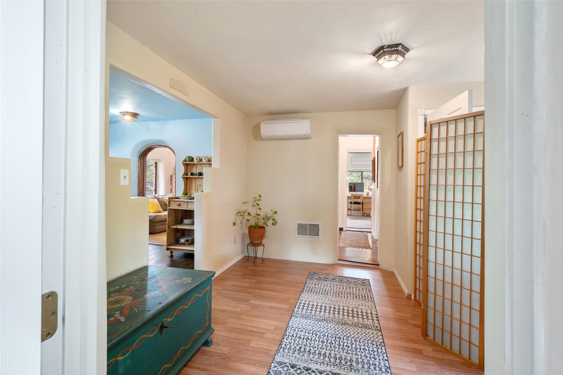 Inviting single-level home located in the town of Alcalde, within the beautiful Rio Grande Valley, on approximately one acre of land with acequia surface water rights. This 2-bedroom, 1-bath property offers about 1,200 square feet of comfortable living space with a relaxed country feel. Featuring classic Adobe and frame construction, the home showcases timeless Santa Fe style.Enjoy outdoor living under the long portal, perfect for relaxing or entertaining amid peaceful surroundings and taking in the lovely views from the backyard. The fully fenced property includes gardens and fruit trees, with plenty of space for additional gardening or outdoor projects. Mini splits provide efficient heating and cooling throughout.The detached two-car garage offers excellent storage or workshop potential. Originally built around 1970, the home has seen several thoughtful improvements since 2021, combining functionality and charm in a peaceful setting.