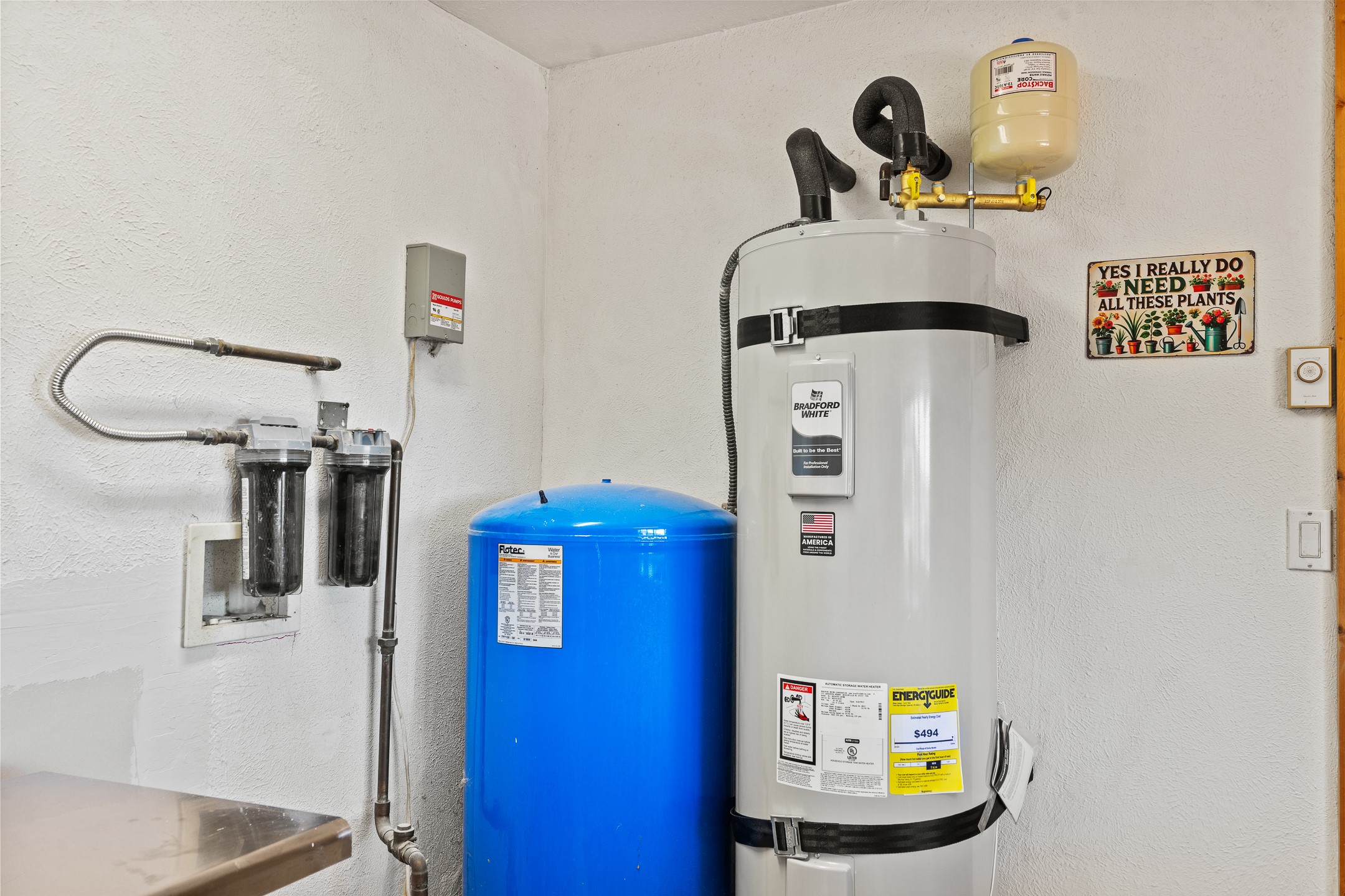 Nestled beside a picturesque canyon, part of the historic San Antonio de Las Huertas Land Grant, and near National Forest access, this charming adobe home--dating back to the 1940s--sits on two tranquil acres surrounded by sweeping mountain views. Thoughtfully updated to preserve its authentic Southwestern character, the home features traditional vigas and wood plank ceilings that create a warm, inviting atmosphere. Step onto the spacious covered portal, complete with vigas and a brick floor, and take in the serene vistas of the Sandia and Jemez mountains--an ideal setting for outdoor dining or entertaining. The main portal opens into a cozy living room with pellet stove and beautifully plastered adobe walls. The remodeled kitchen blends rustic charm with modern convenience, offering a country-style farm sink, quartz countertops, and a butcher block island. Both bedrooms are generously sized. Pella windows and patio door. Recent upgrades include a new roof system, new hot water heater, and new main electric panel service, all installed in September 2025. 320-square-foot workshop, 108-square-foot storage shed, and a large, fenced yard perfect for dogs. An older addition presents exciting possibilities--building plans available to convert to dining room. $9600 bid to turn it in to another portal. $10,000 credit to Buyer for old addition.