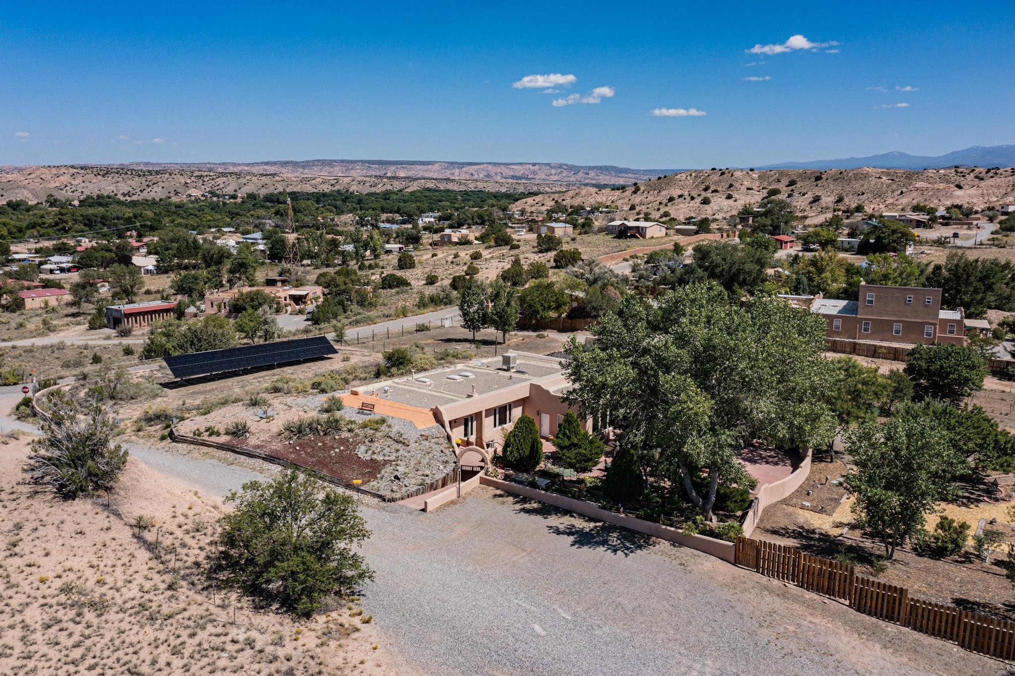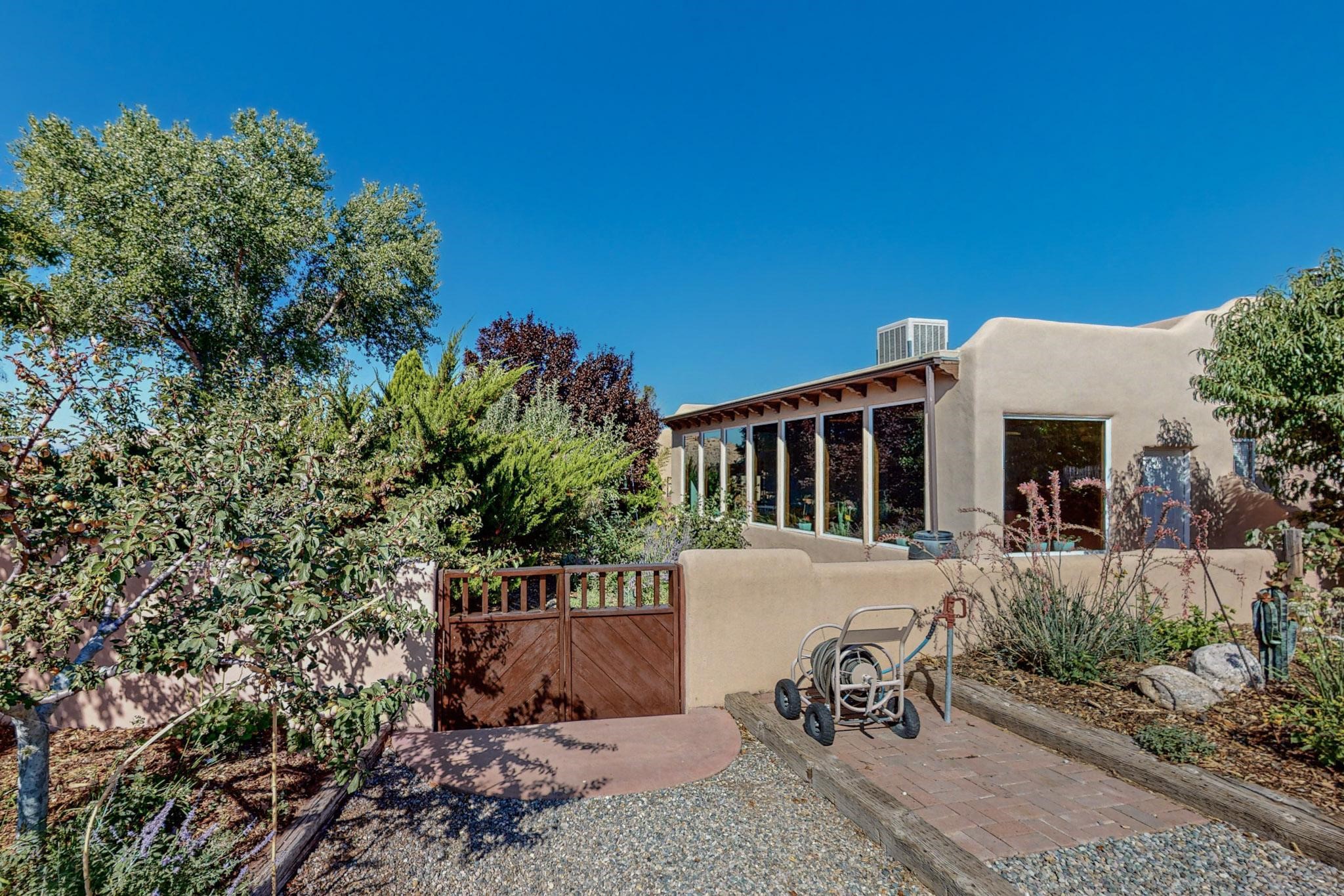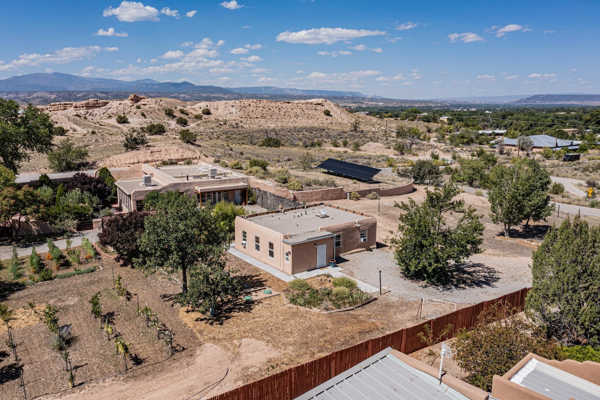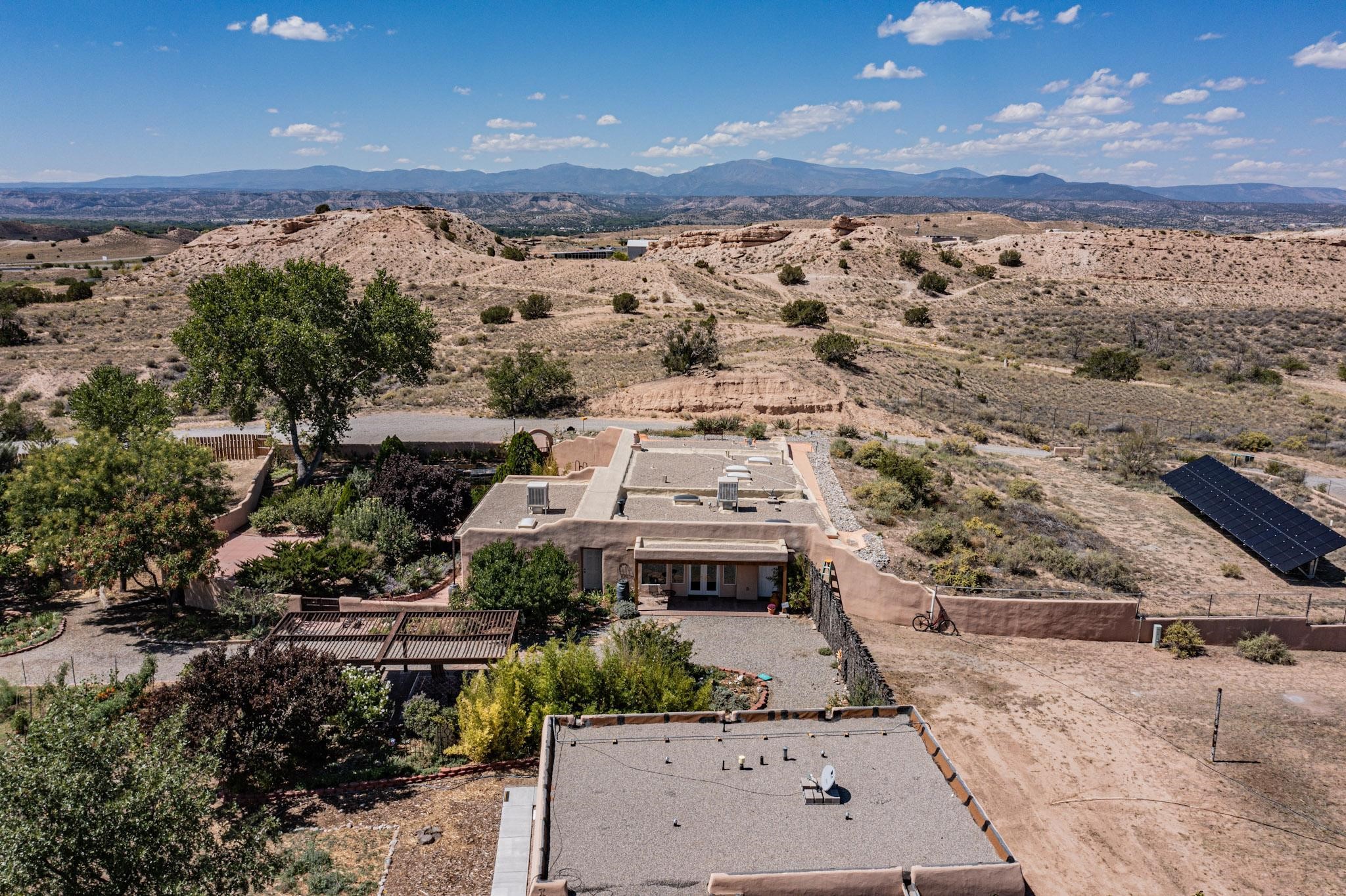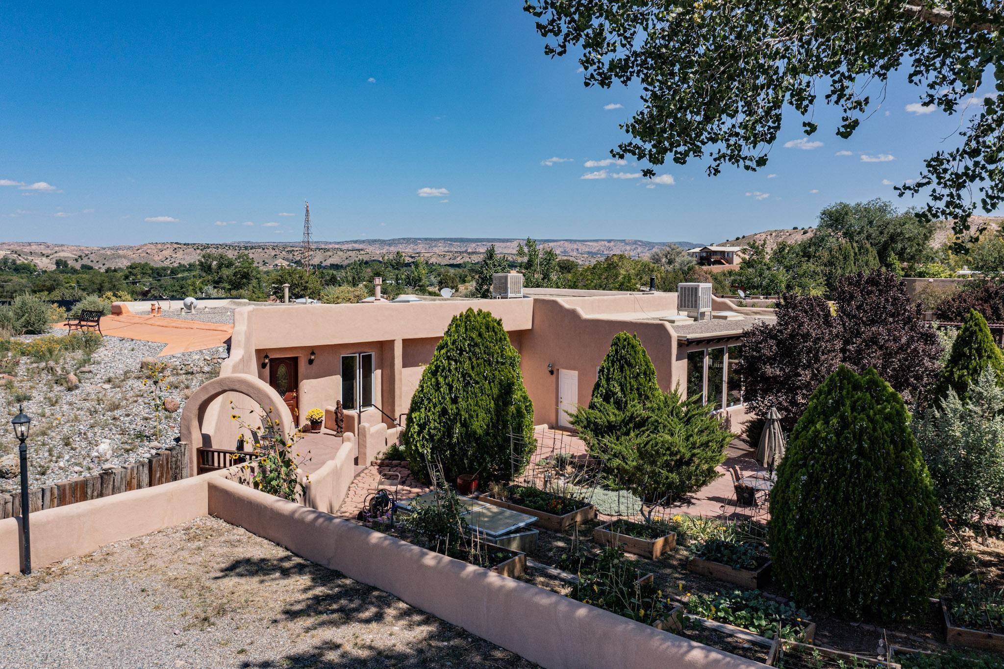 A rare offering in Northern Santa Fe County, this solar-powered berm home and guest house sit on two acres beside protected public land, where expansive views, established gardens, and access to nearby trails define the setting. Located approximately 30 minutes from Santa Fe and Los Alamos, the property blends Southwest architectural character with a thoughtfully cultivated landscape.Gardens lovingly tended for more than two decades surround the home with fruit trees, vegetables, flowering plants, and open skies. The property includes approximately 5,300 square feet of living space with a main residence and a separate guest house, offering a total of 7 bedrooms and 4 bathrooms. The guest house includes 3 bedrooms and 1 bath and may provide flexible use for guests, multi-generations, or as a rental.The south-facing main residence features an open-concept great room and kitchen with custom handmade cabinetry, skylights, traditional vigas, Saltillo tile flooring, a large walk-in pantry with full-size refrigerator, and a newer dishwasher. A spacious 700-square-foot studio/sunroom with high ceilings and 7-foot south-facing windows overlooks a courtyard garden.The main level includes one bedroom and one full bath, while the lower level offers three bedrooms, two bathrooms, and additional storage. The primary bath features a Jacuzzi tub.The main home was constructed as a solar-powered berm home which provides natural energy efficiency and stable interior temperatures throughout the year. Additional features include evaporative cooling, wall-mounted panel heaters, a Scandinavian wood stove, and a gas-powered Adobelite kiva fireplace.Outdoor spaces include expansive views, a rooftop seating area, and an established orchard and gardens supported by a 10,000-gallon rainwater catchment cistern with automated drip irrigation. A new septic tank and leach field were installed in August 2024. Zoned Traditional Community: potential for multiple dwellings or retreat center.