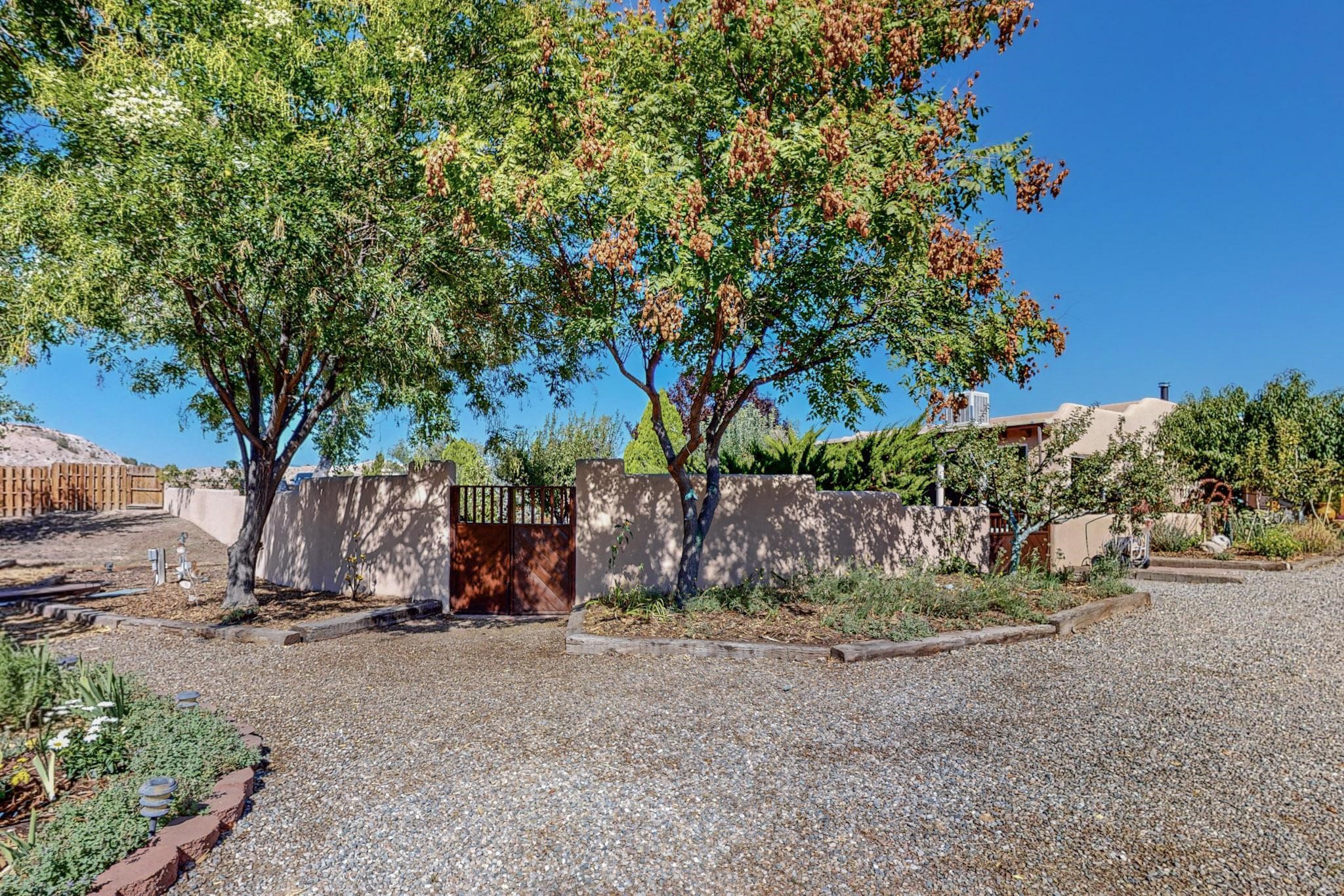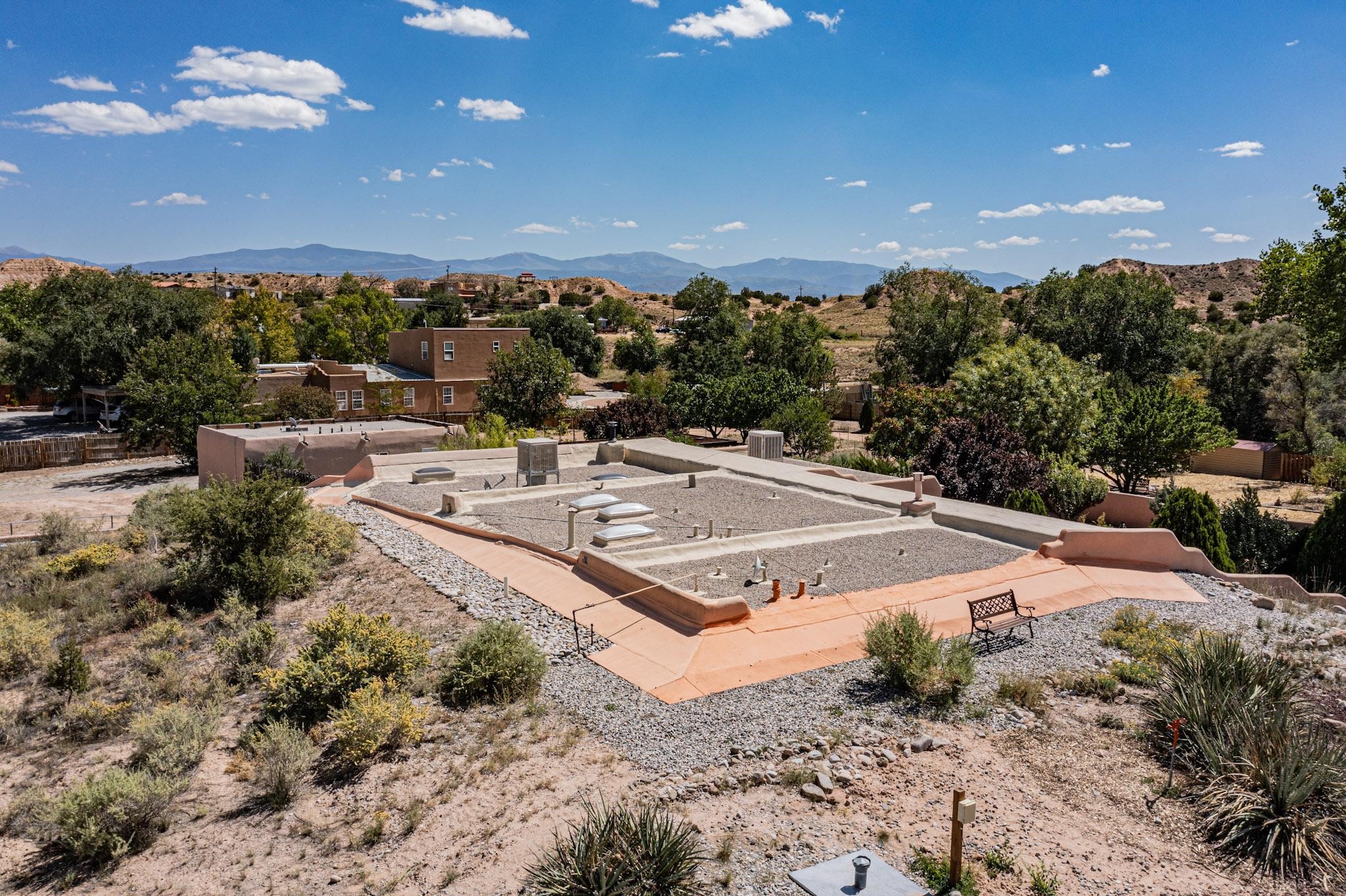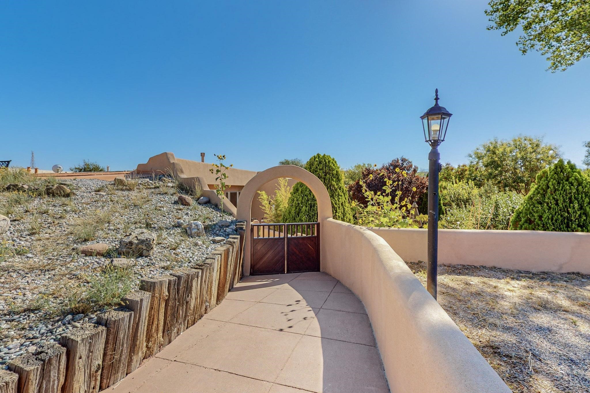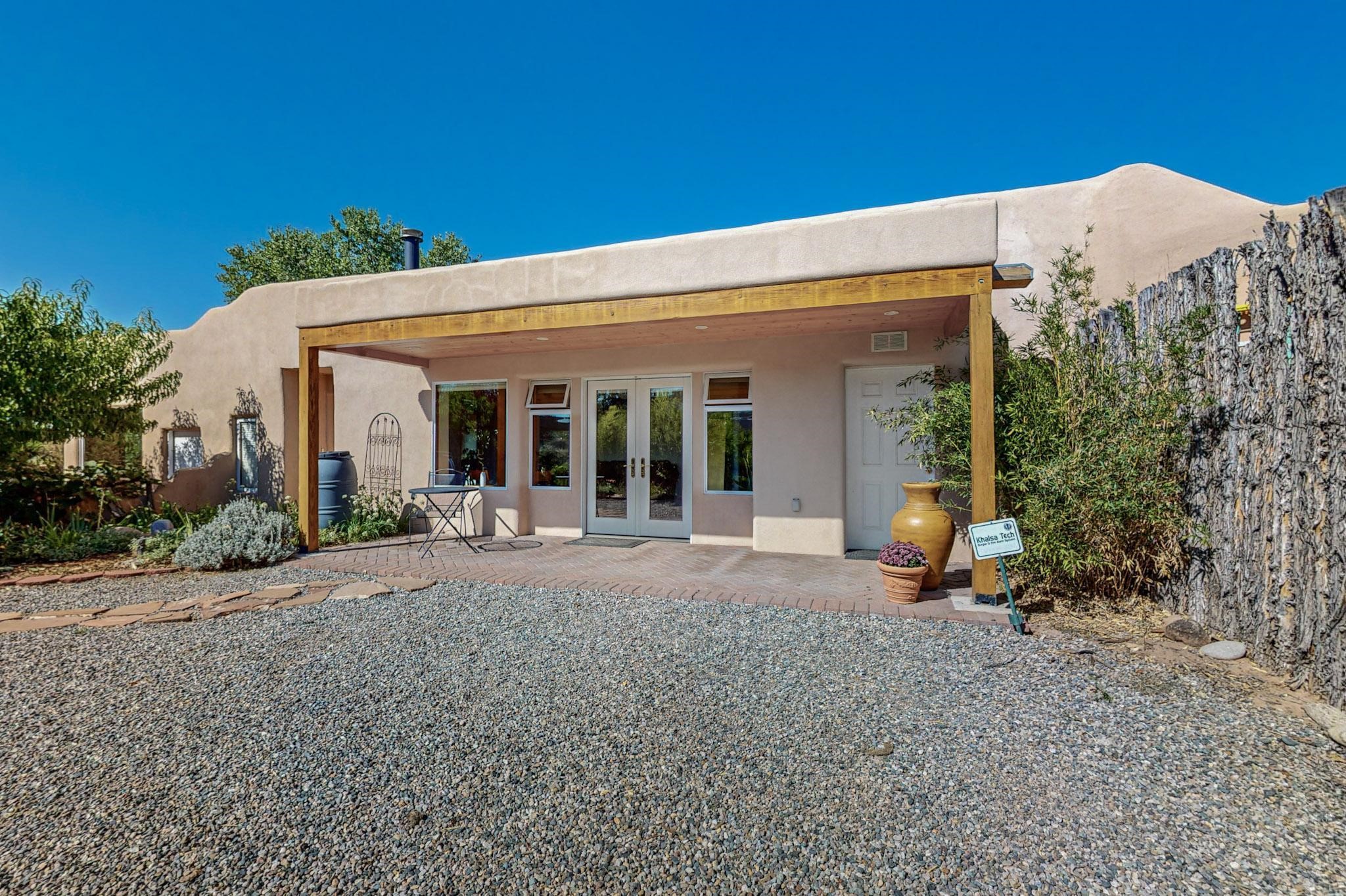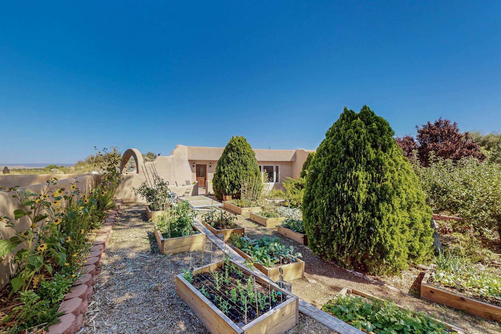 A rare offering in Northern Santa Fe County, this solar-powered berm home and guest house sit on two acres beside protected public land, where expansive views, established gardens, and access to nearby trails define the setting. Located approximately 30 minutes from Santa Fe and Los Alamos, the property blends Southwest architectural character with a thoughtfully cultivated landscape.Gardens lovingly tended for more than two decades surround the home with fruit trees, vegetables, flowering plants, and open skies. The property includes approximately 5,300 square feet of living space with a main residence and a separate guest house, offering a total of 7 bedrooms and 4 bathrooms. The guest house includes 3 bedrooms and 1 bath and may provide flexible use for guests, multi-generations, or as a rental.The south-facing main residence features an open-concept great room and kitchen with custom handmade cabinetry, skylights, traditional vigas, Saltillo tile flooring, a large walk-in pantry with full-size refrigerator, and a newer dishwasher. A spacious 700-square-foot studio/sunroom with high ceilings and 7-foot south-facing windows overlooks a courtyard garden.The main level includes one bedroom and one full bath, while the lower level offers three bedrooms, two bathrooms, and additional storage. The primary bath features a Jacuzzi tub.The main home was constructed as a solar-powered berm home which provides natural energy efficiency and stable interior temperatures throughout the year. Additional features include evaporative cooling, wall-mounted panel heaters, a Scandinavian wood stove, and a gas-powered Adobelite kiva fireplace.Outdoor spaces include expansive views, a rooftop seating area, and an established orchard and gardens supported by a 10,000-gallon rainwater catchment cistern with automated drip irrigation. A new septic tank and leach field were installed in August 2024. Zoned Traditional Community: potential for multiple dwellings or retreat center.
