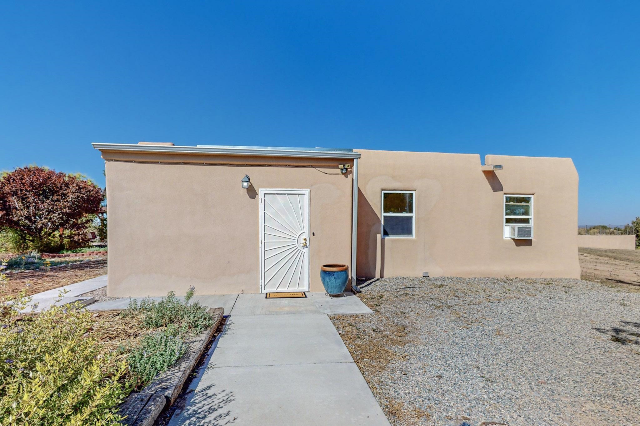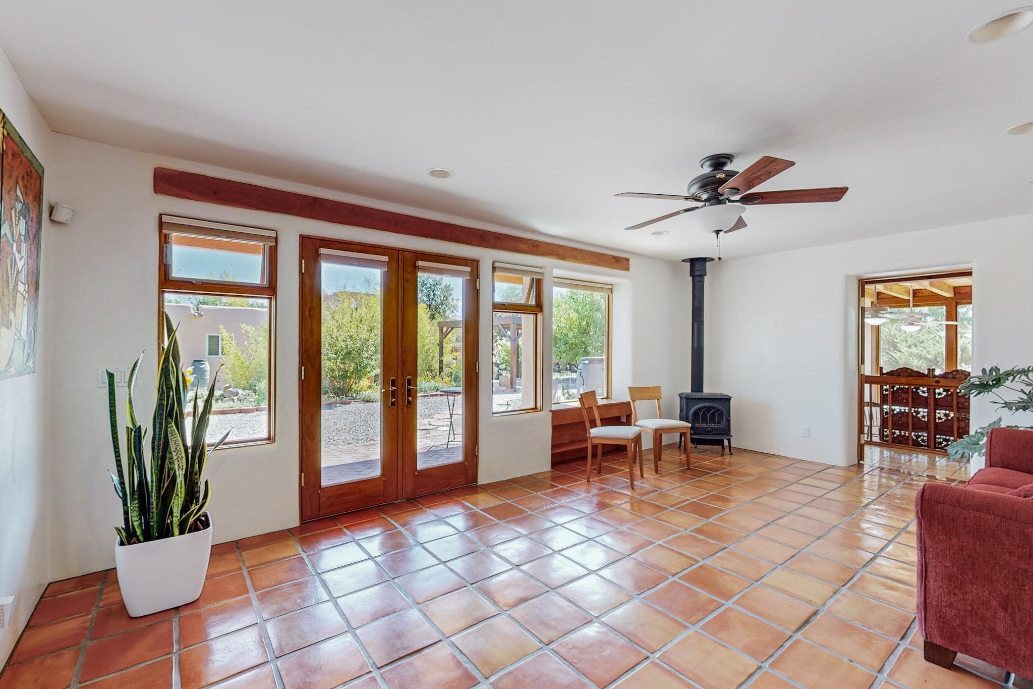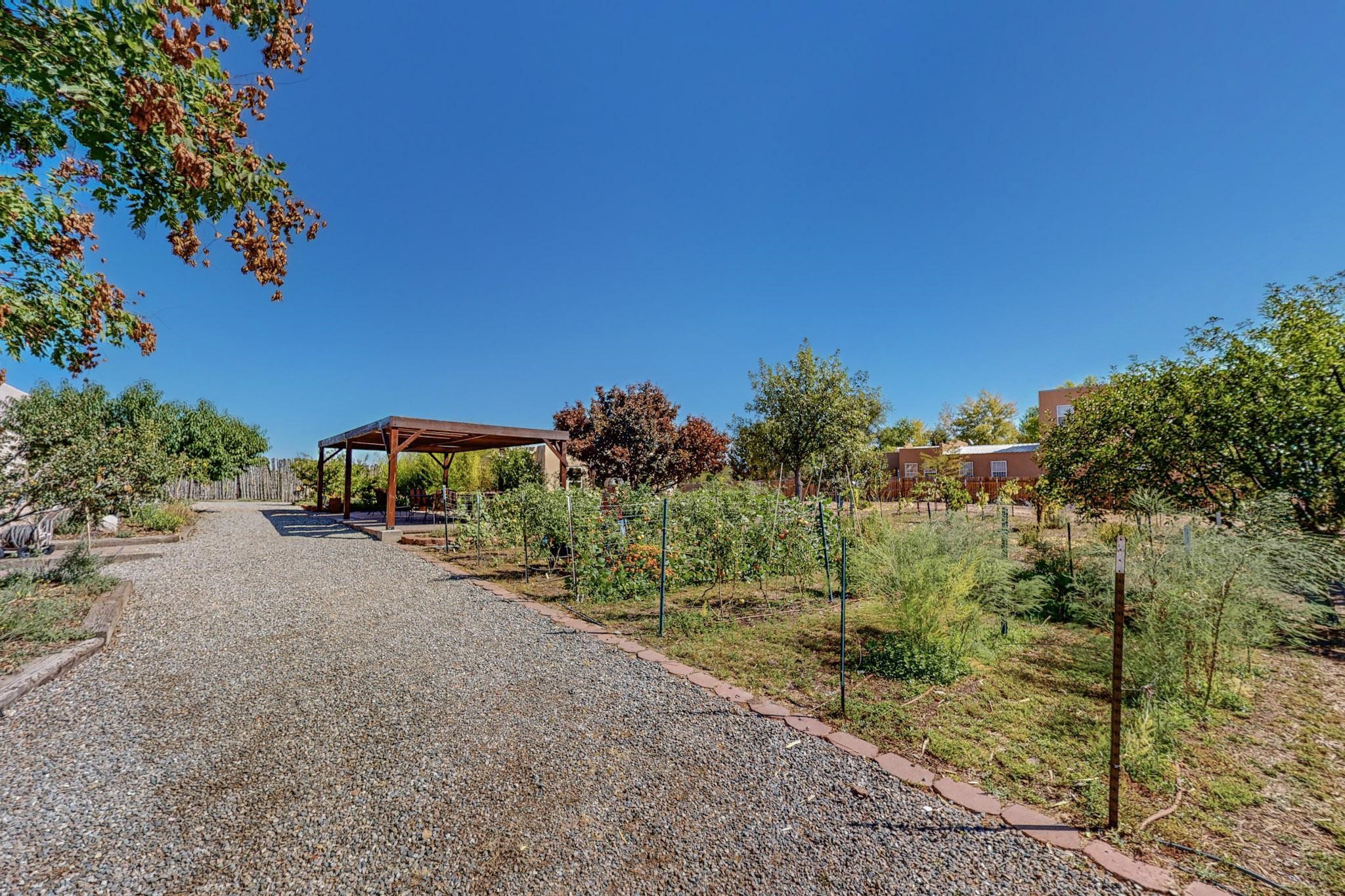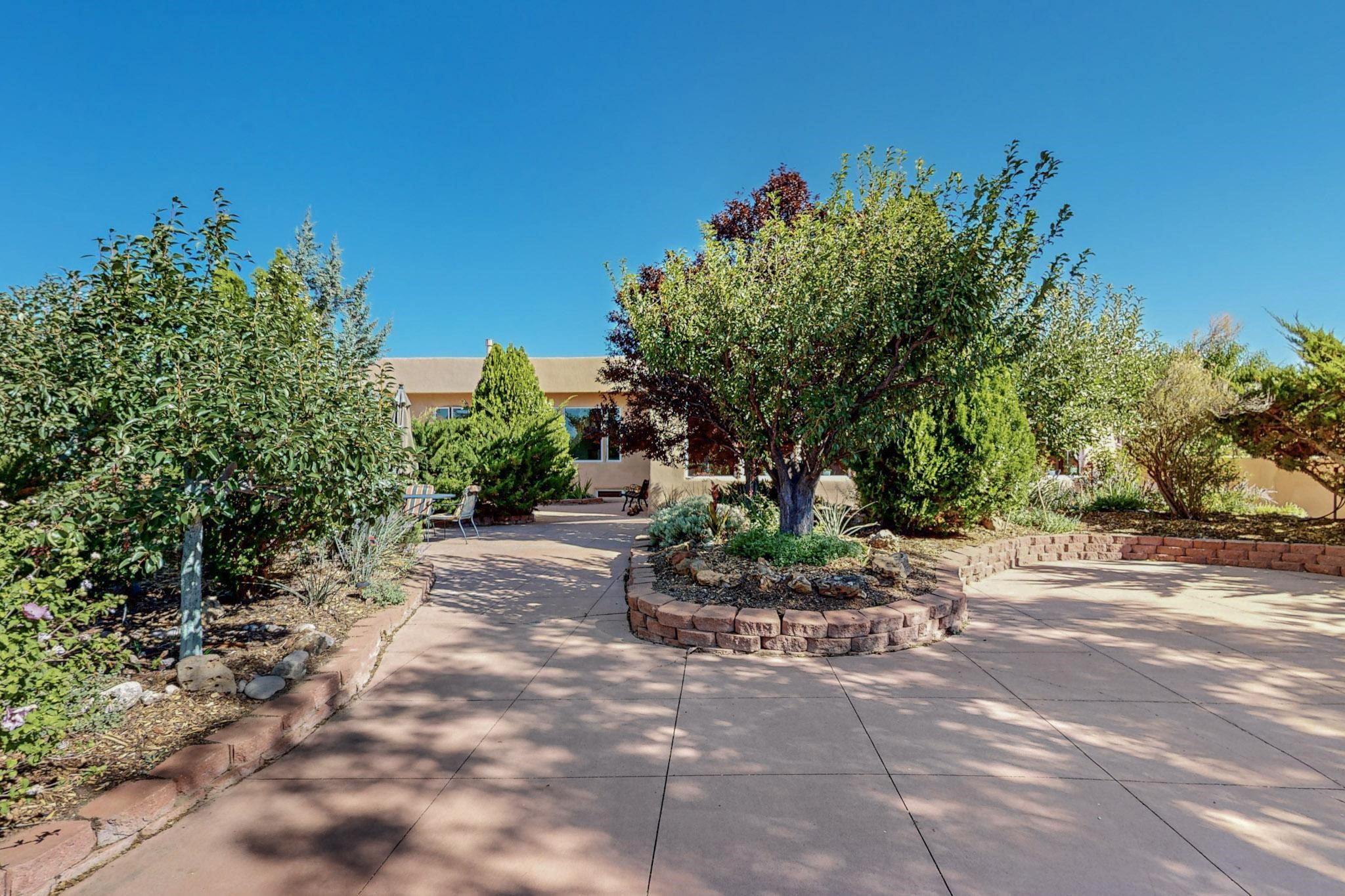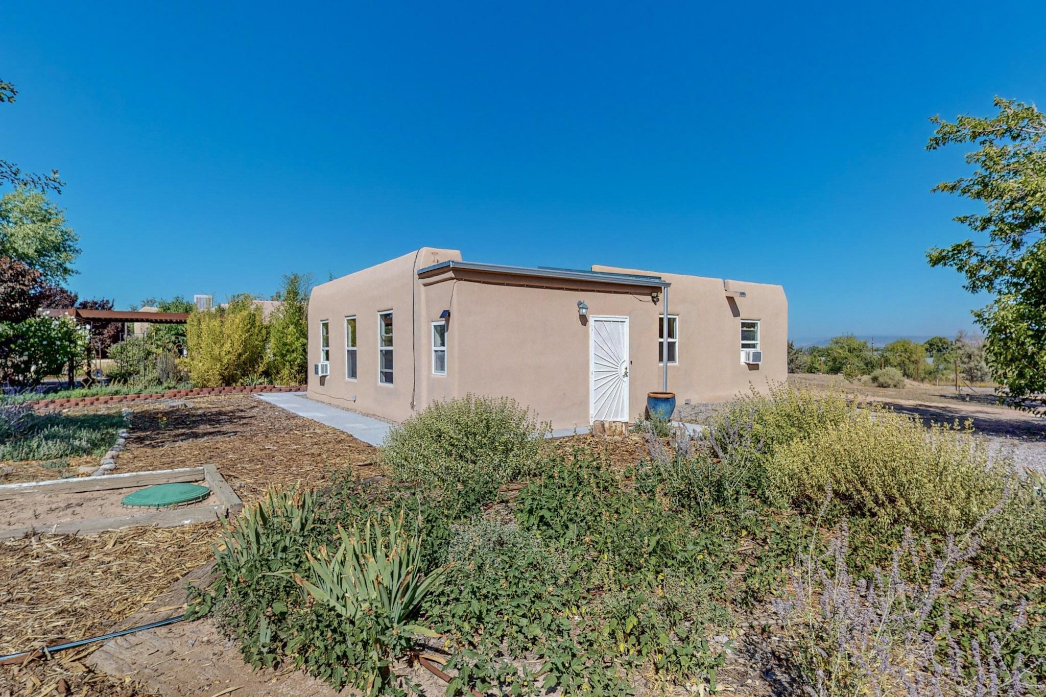 A rare offering in Northern Santa Fe County, this solar-powered berm home and guest house sit on two acres beside protected public land, where expansive views, established gardens, and access to nearby trails define the setting. Located approximately 30 minutes from Santa Fe and Los Alamos, the property blends Southwest architectural character with a thoughtfully cultivated landscape.Gardens lovingly tended for more than two decades surround the home with fruit trees, vegetables, flowering plants, and open skies. The property includes approximately 5,300 square feet of living space with a main residence and a separate guest house, offering a total of 7 bedrooms and 4 bathrooms. The guest house includes 3 bedrooms and 1 bath and may provide flexible use for guests, multi-generations, or as a rental.The south-facing main residence features an open-concept great room and kitchen with custom handmade cabinetry, skylights, traditional vigas, Saltillo tile flooring, a large walk-in pantry with full-size refrigerator, and a newer dishwasher. A spacious 700-square-foot studio/sunroom with high ceilings and 7-foot south-facing windows overlooks a courtyard garden.The main level includes one bedroom and one full bath, while the lower level offers three bedrooms, two bathrooms, and additional storage. The primary bath features a Jacuzzi tub.The main home was constructed as a solar-powered berm home which provides natural energy efficiency and stable interior temperatures throughout the year. Additional features include evaporative cooling, wall-mounted panel heaters, a Scandinavian wood stove, and a gas-powered Adobelite kiva fireplace.Outdoor spaces include expansive views, a rooftop seating area, and an established orchard and gardens supported by a 10,000-gallon rainwater catchment cistern with automated drip irrigation. A new septic tank and leach field were installed in August 2024. Zoned Traditional Community: potential for multiple dwellings or retreat center.