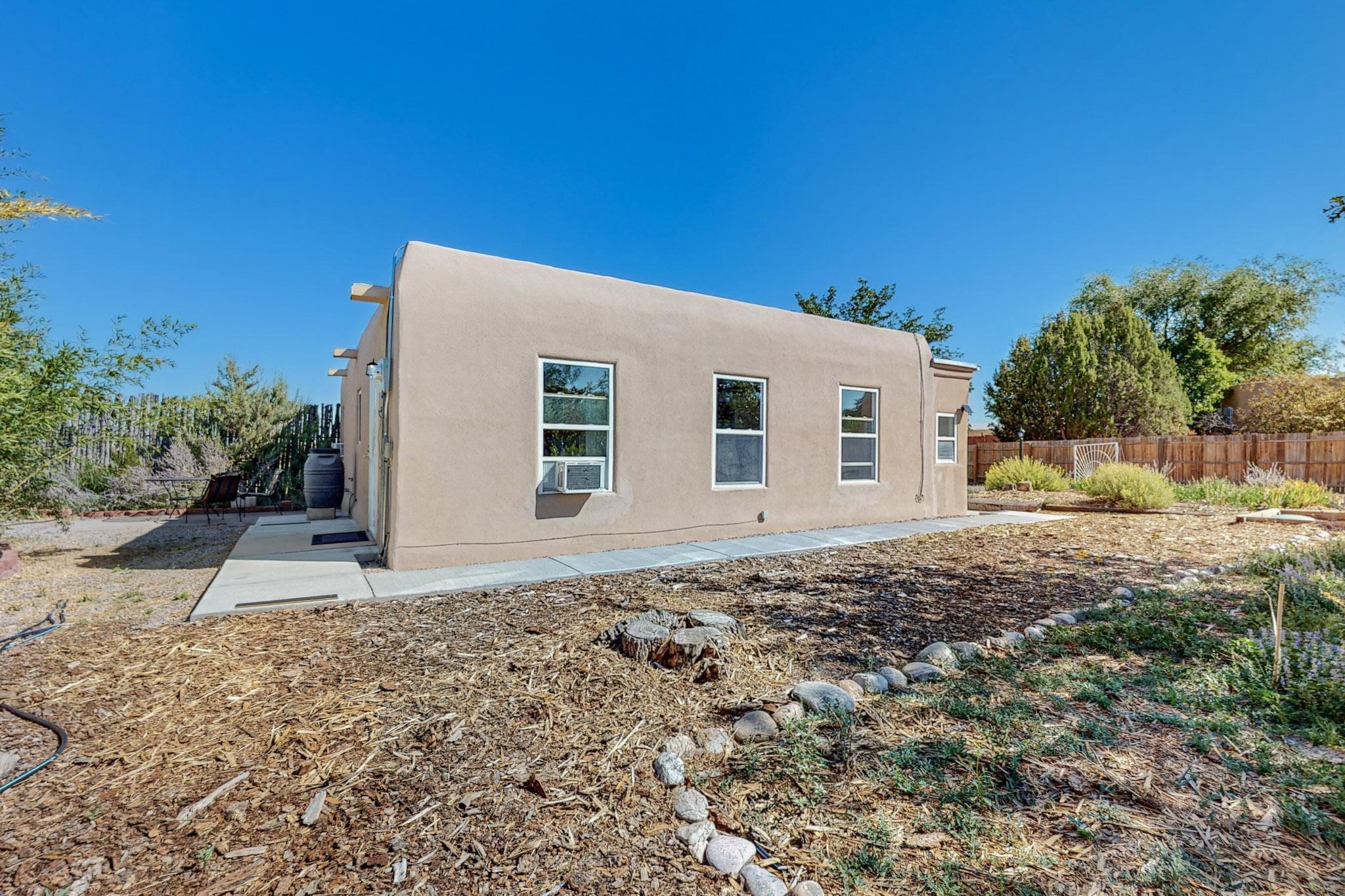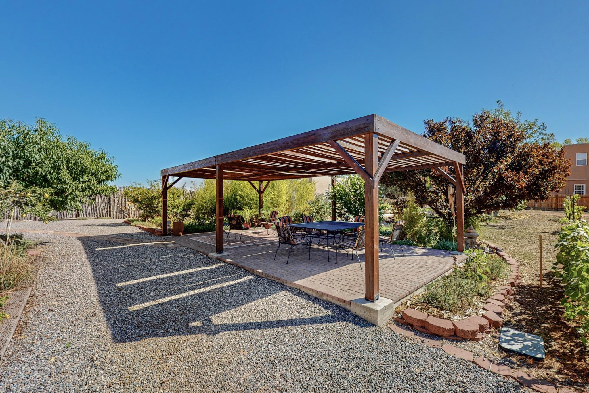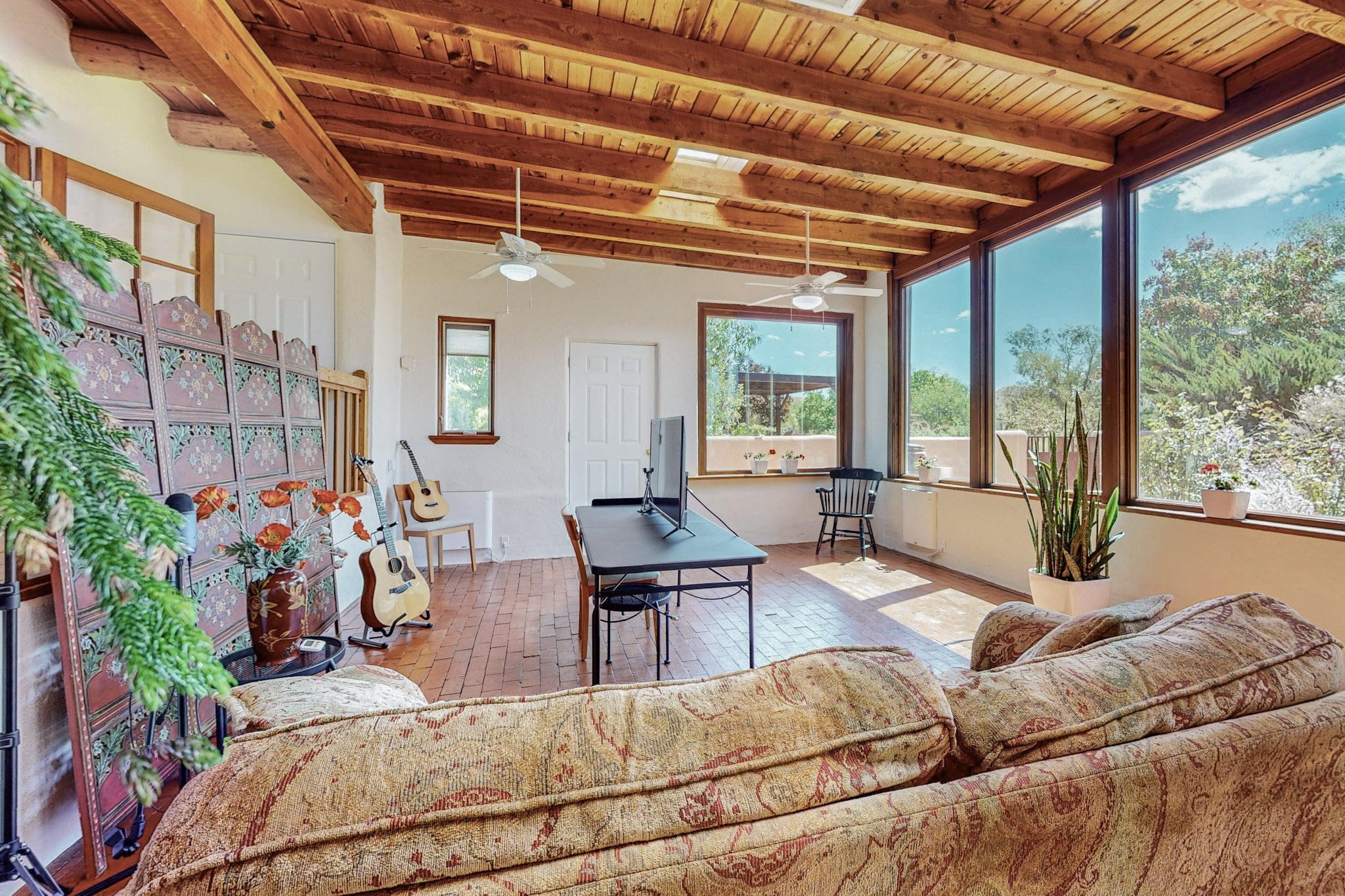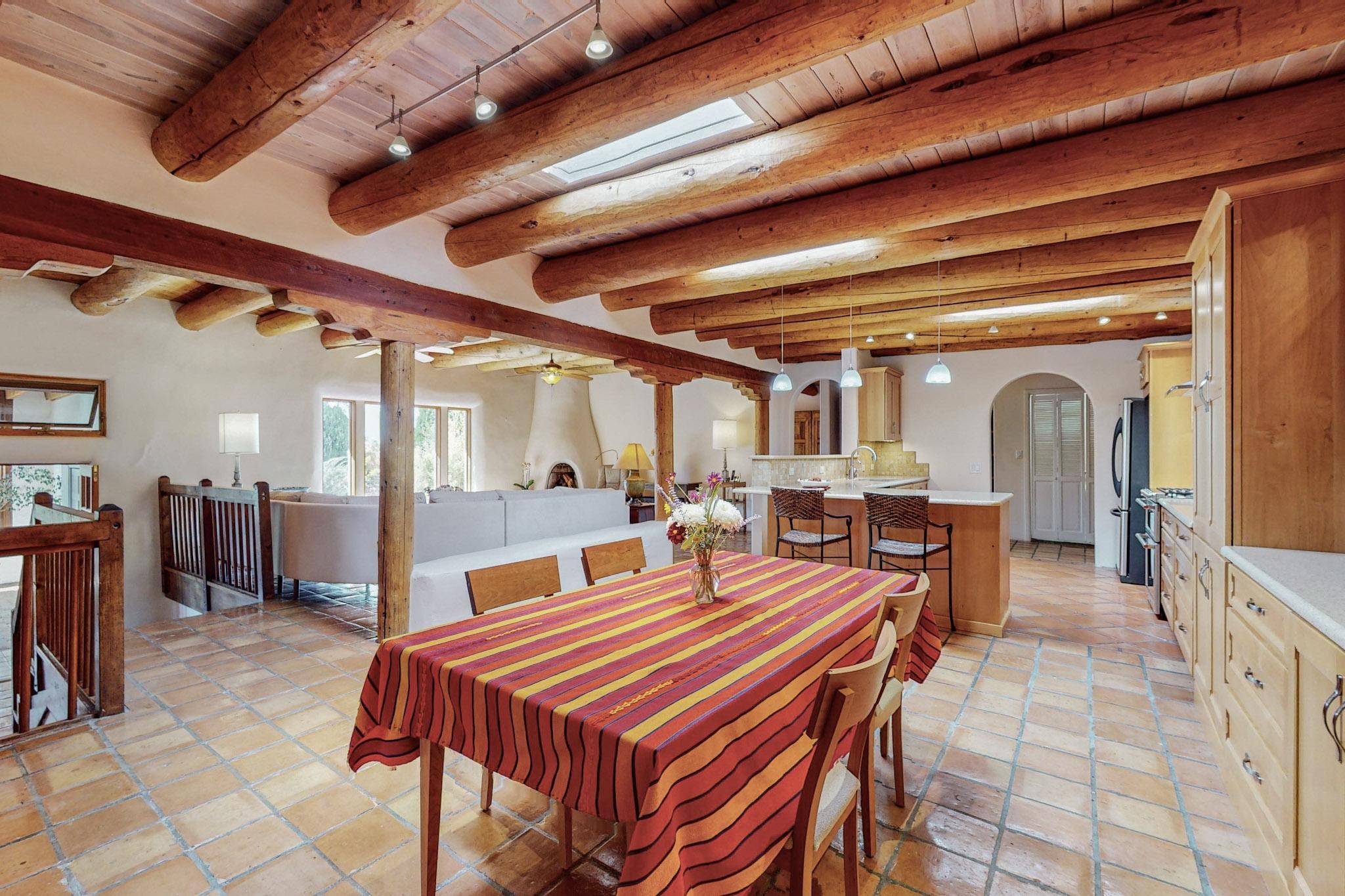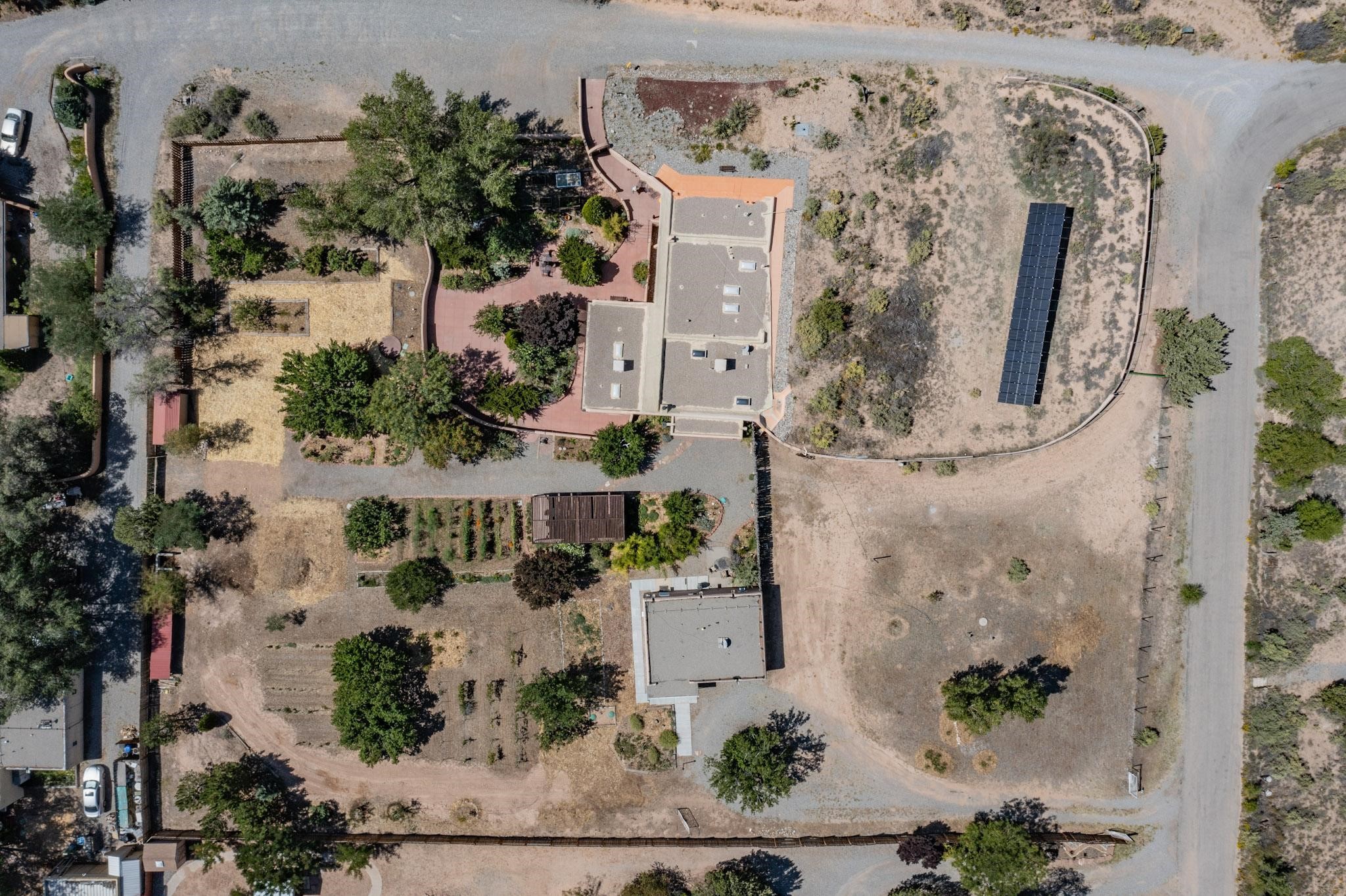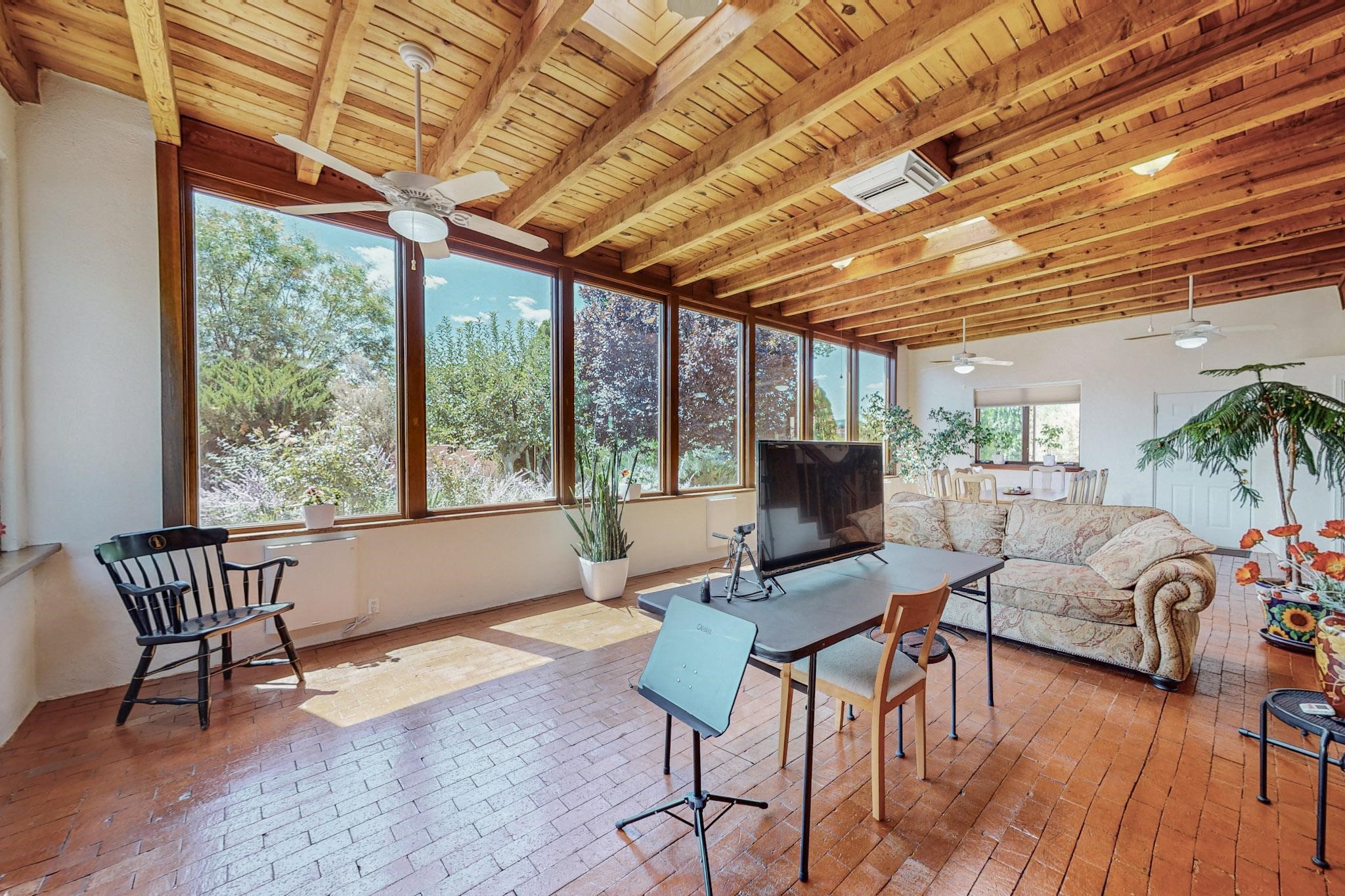 A rare offering in Northern Santa Fe County, this solar-powered berm home and guest house sit on two acres beside protected public land, where expansive views, established gardens, and access to nearby trails define the setting. Located approximately 30 minutes from Santa Fe and Los Alamos, the property blends Southwest architectural character with a thoughtfully cultivated landscape.Gardens lovingly tended for more than two decades surround the home with fruit trees, vegetables, flowering plants, and open skies. The property includes approximately 5,300 square feet of living space with a main residence and a separate guest house, offering a total of 7 bedrooms and 4 bathrooms. The guest house includes 3 bedrooms and 1 bath and may provide flexible use for guests, multi-generations, or as a rental.The south-facing main residence features an open-concept great room and kitchen with custom handmade cabinetry, skylights, traditional vigas, Saltillo tile flooring, a large walk-in pantry with full-size refrigerator, and a newer dishwasher. A spacious 700-square-foot studio/sunroom with high ceilings and 7-foot south-facing windows overlooks a courtyard garden.The main level includes one bedroom and one full bath, while the lower level offers three bedrooms, two bathrooms, and additional storage. The primary bath features a Jacuzzi tub.The main home was constructed as a solar-powered berm home which provides natural energy efficiency and stable interior temperatures throughout the year. Additional features include evaporative cooling, wall-mounted panel heaters, a Scandinavian wood stove, and a gas-powered Adobelite kiva fireplace.Outdoor spaces include expansive views, a rooftop seating area, and an established orchard and gardens supported by a 10,000-gallon rainwater catchment cistern with automated drip irrigation. A new septic tank and leach field were installed in August 2024. Zoned Traditional Community: potential for multiple dwellings or retreat center.