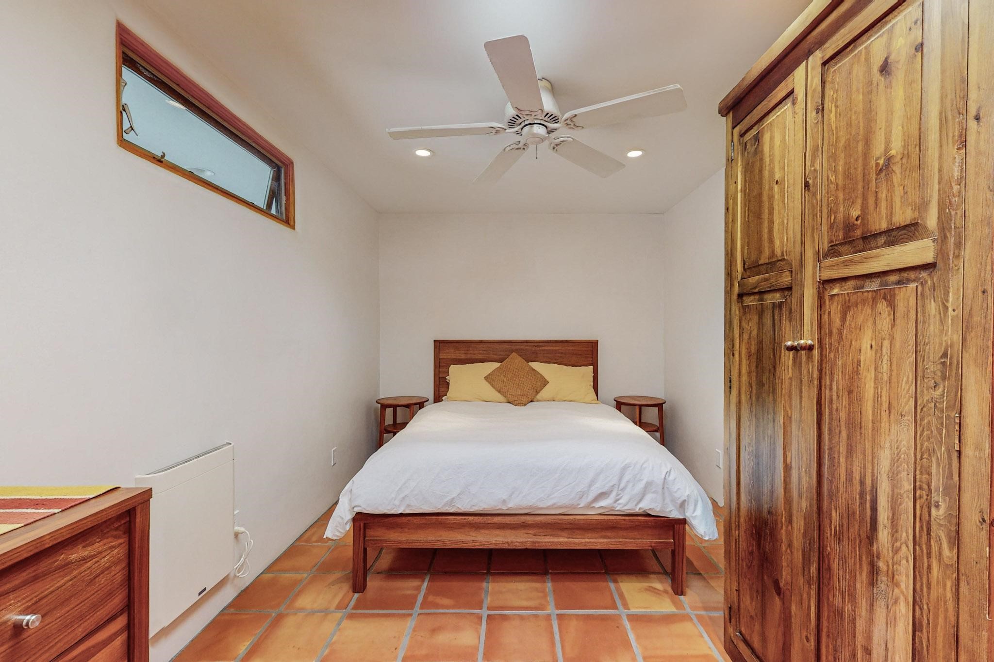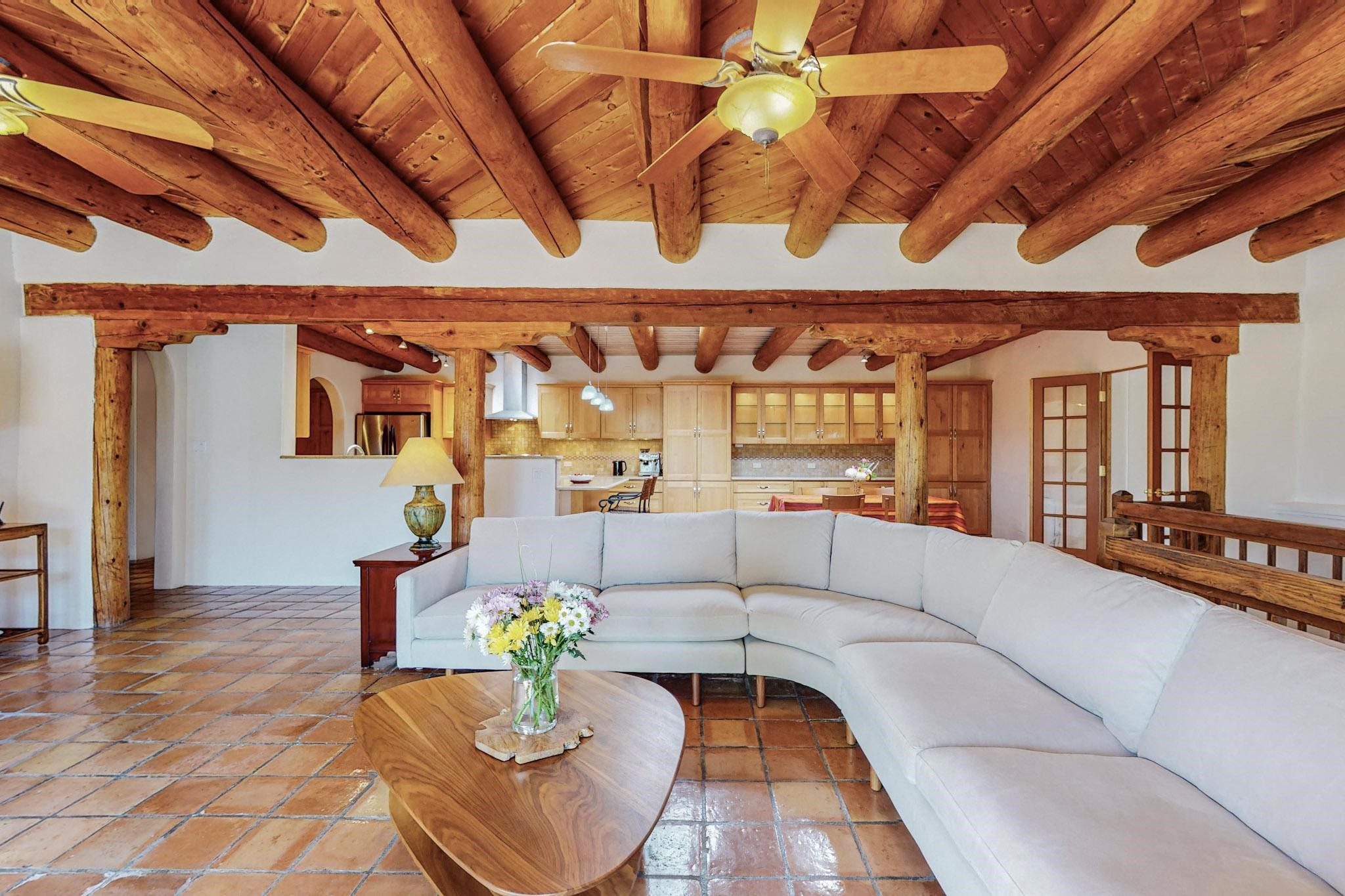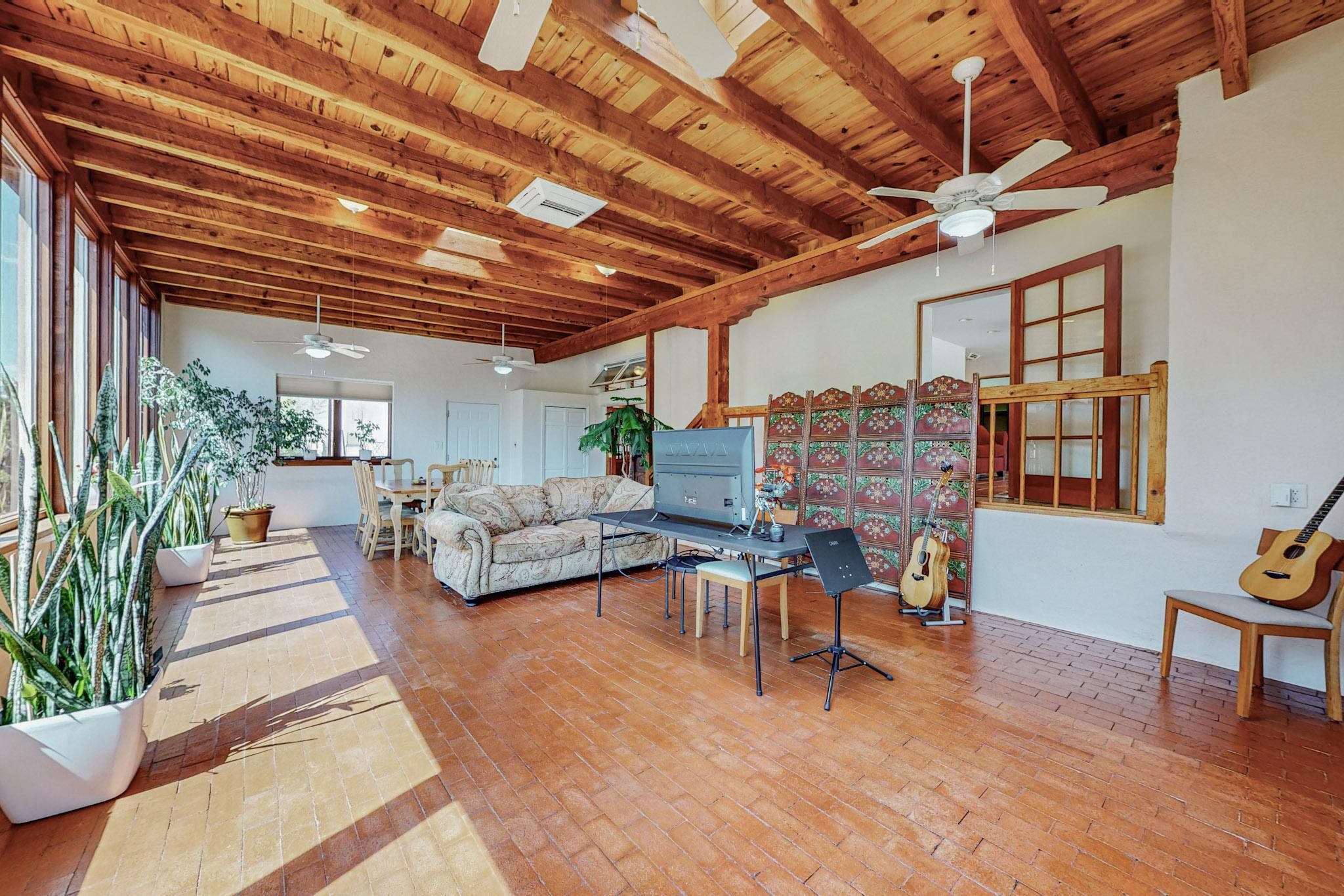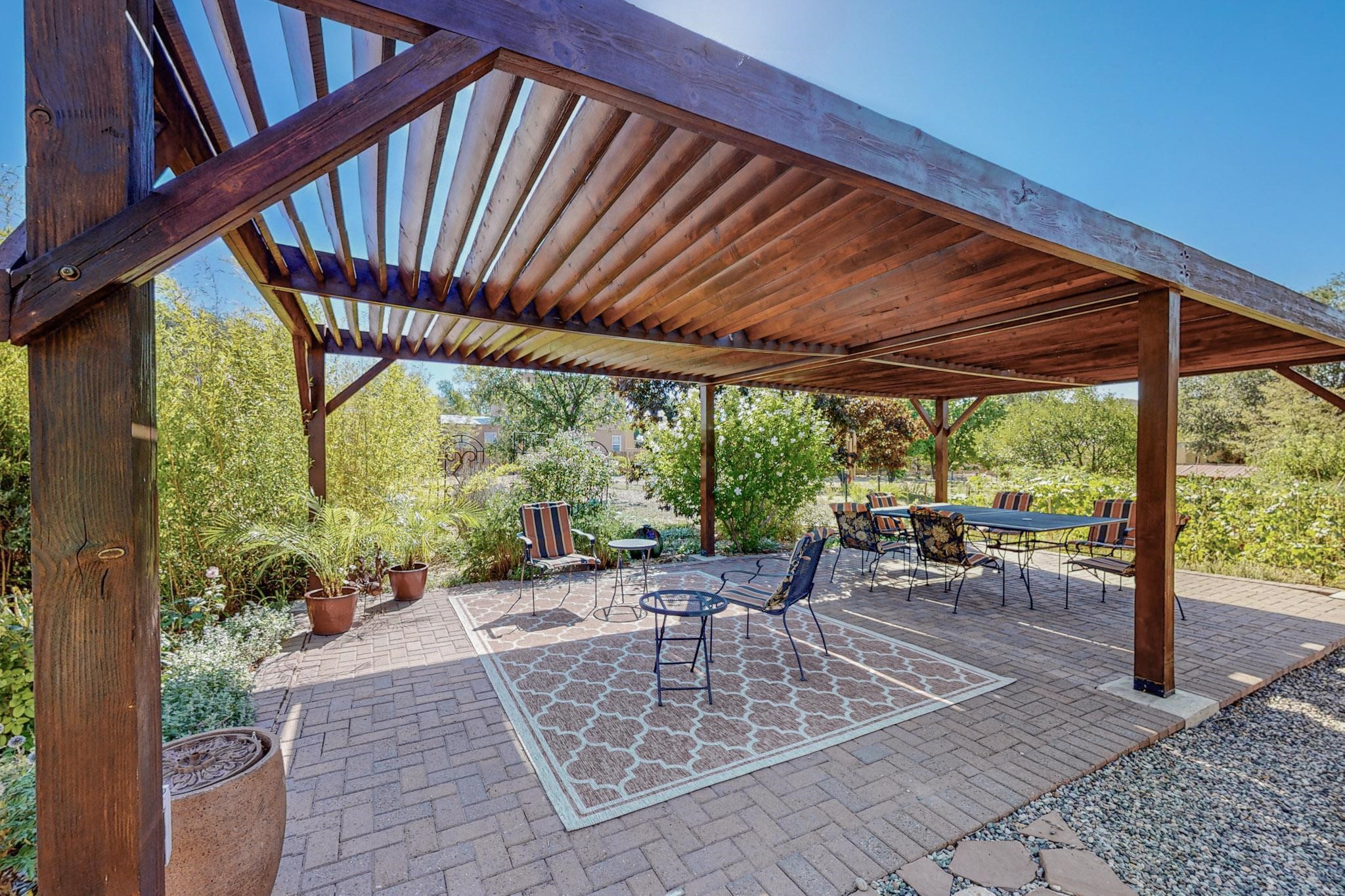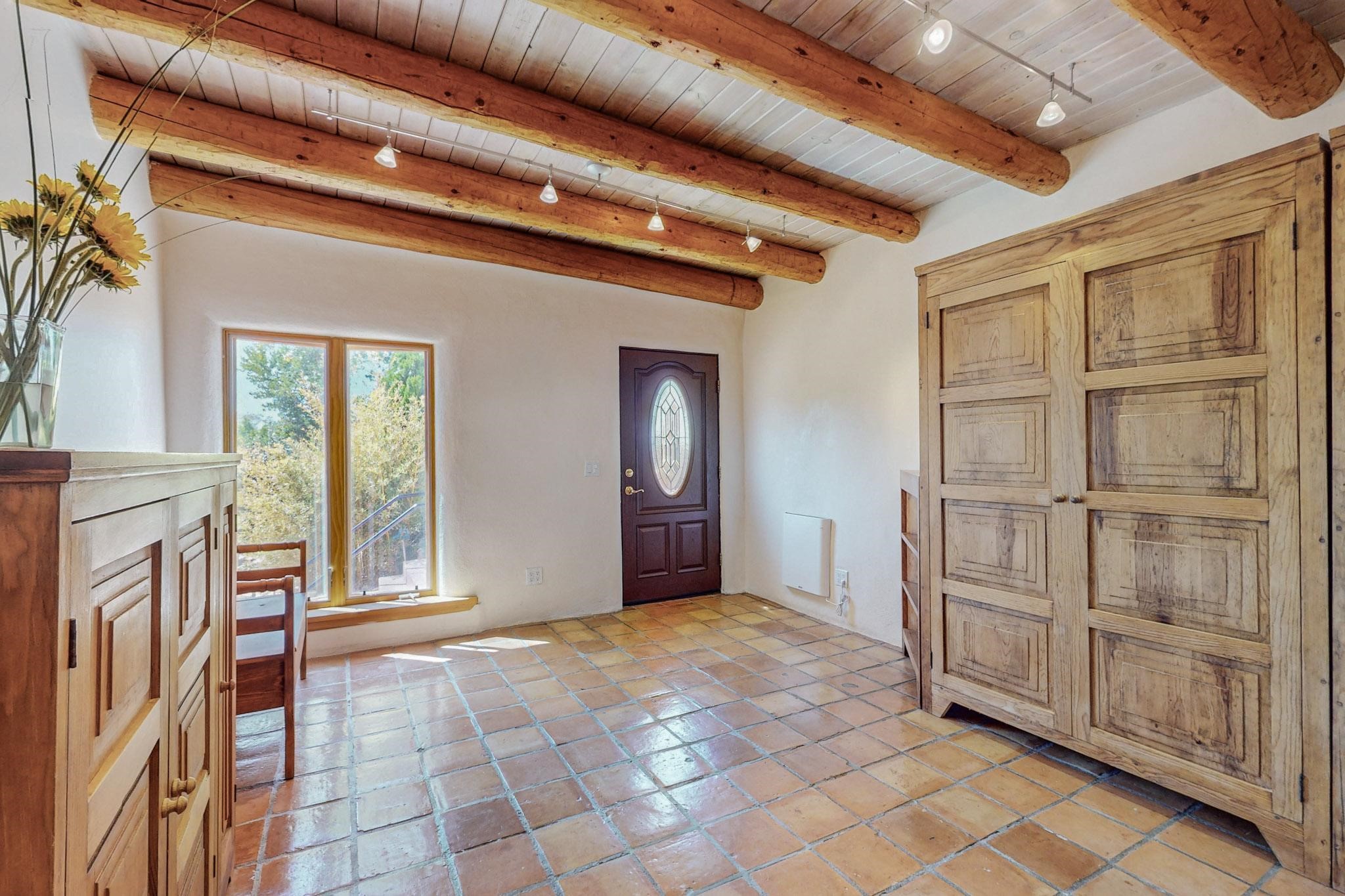 A rare offering in Northern Santa Fe County, this solar-powered berm home and guest house sit on two acres beside protected public land, where expansive views, established gardens, and access to nearby trails define the setting. Located approximately 30 minutes from Santa Fe and Los Alamos, the property blends Southwest architectural character with a thoughtfully cultivated landscape.Gardens lovingly tended for more than two decades surround the home with fruit trees, vegetables, flowering plants, and open skies. The property includes approximately 5,300 square feet of living space with a main residence and a separate guest house, offering a total of 7 bedrooms and 4 bathrooms. The guest house includes 3 bedrooms and 1 bath and may provide flexible use for guests, multi-generations, or as a rental.The south-facing main residence features an open-concept great room and kitchen with custom handmade cabinetry, skylights, traditional vigas, Saltillo tile flooring, a large walk-in pantry with full-size refrigerator, and a newer dishwasher. A spacious 700-square-foot studio/sunroom with high ceilings and 7-foot south-facing windows overlooks a courtyard garden.The main level includes one bedroom and one full bath, while the lower level offers three bedrooms, two bathrooms, and additional storage. The primary bath features a Jacuzzi tub.The main home was constructed as a solar-powered berm home which provides natural energy efficiency and stable interior temperatures throughout the year. Additional features include evaporative cooling, wall-mounted panel heaters, a Scandinavian wood stove, and a gas-powered Adobelite kiva fireplace.Outdoor spaces include expansive views, a rooftop seating area, and an established orchard and gardens supported by a 10,000-gallon rainwater catchment cistern with automated drip irrigation. A new septic tank and leach field were installed in August 2024. Zoned Traditional Community: potential for multiple dwellings or retreat center.
