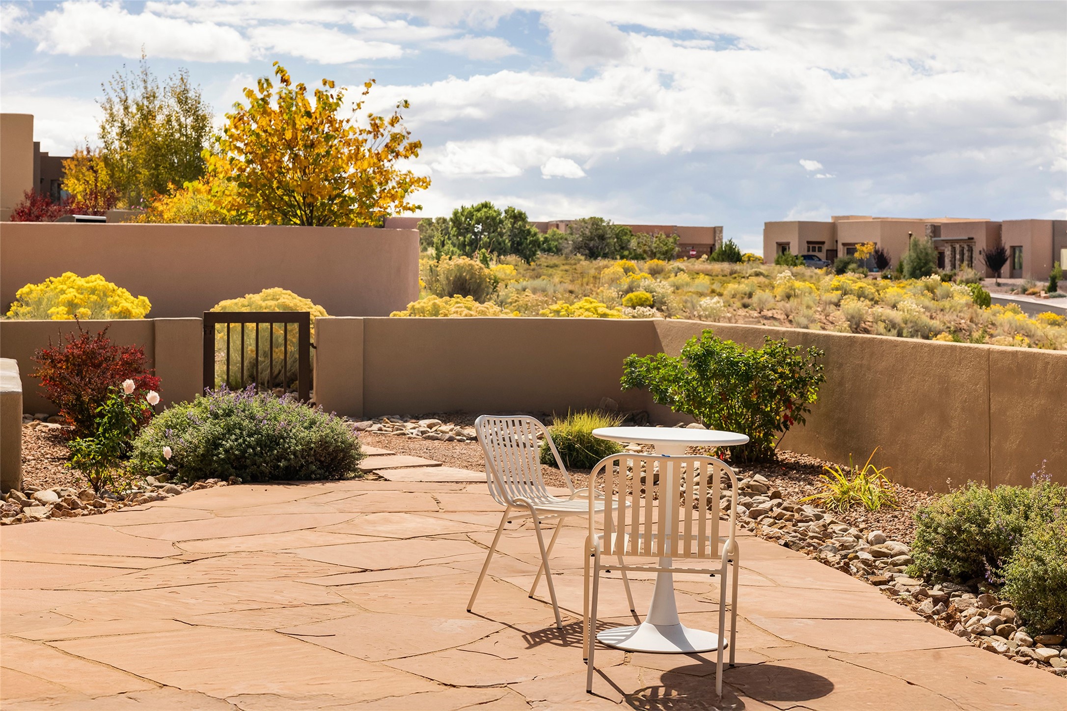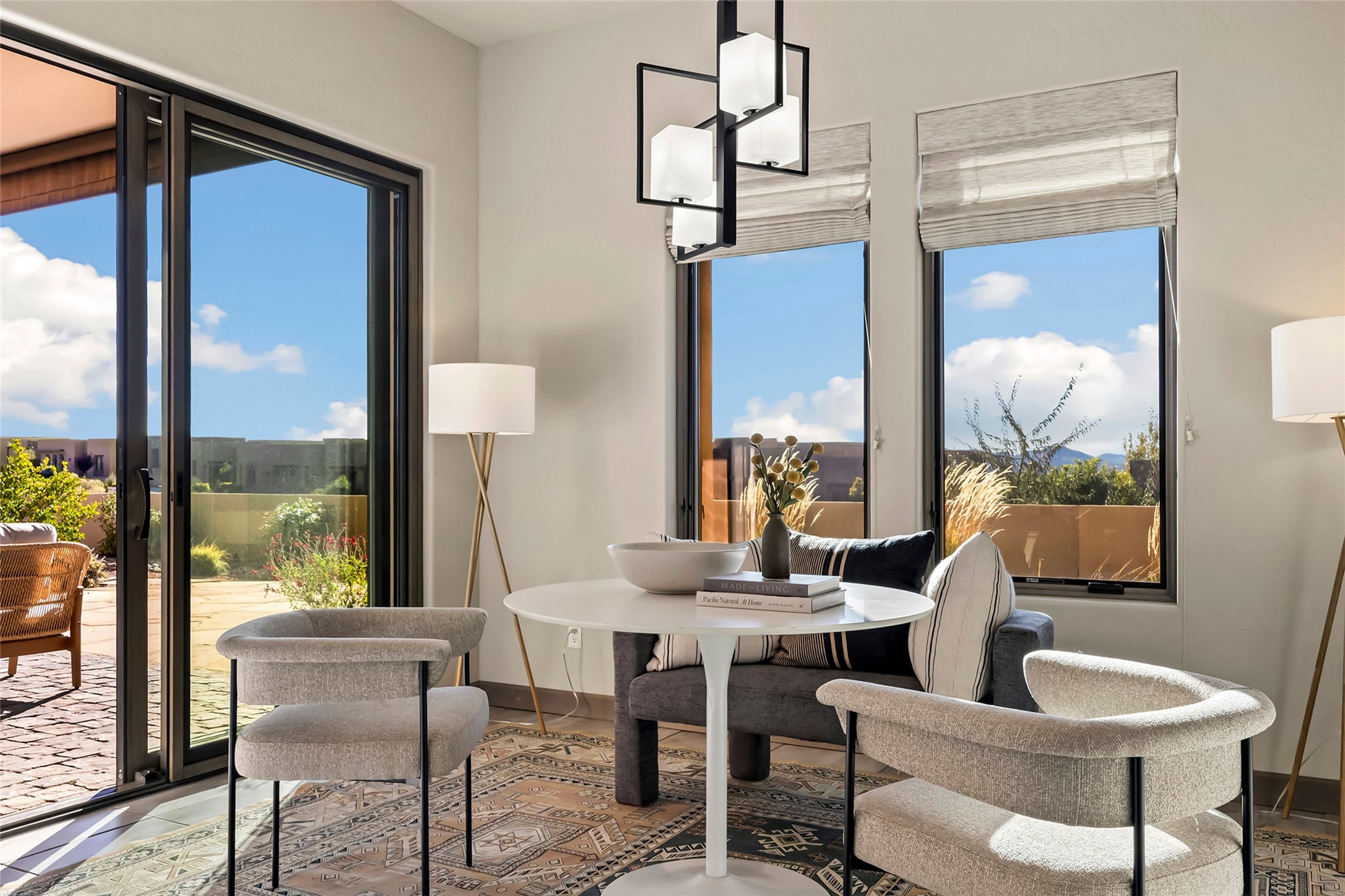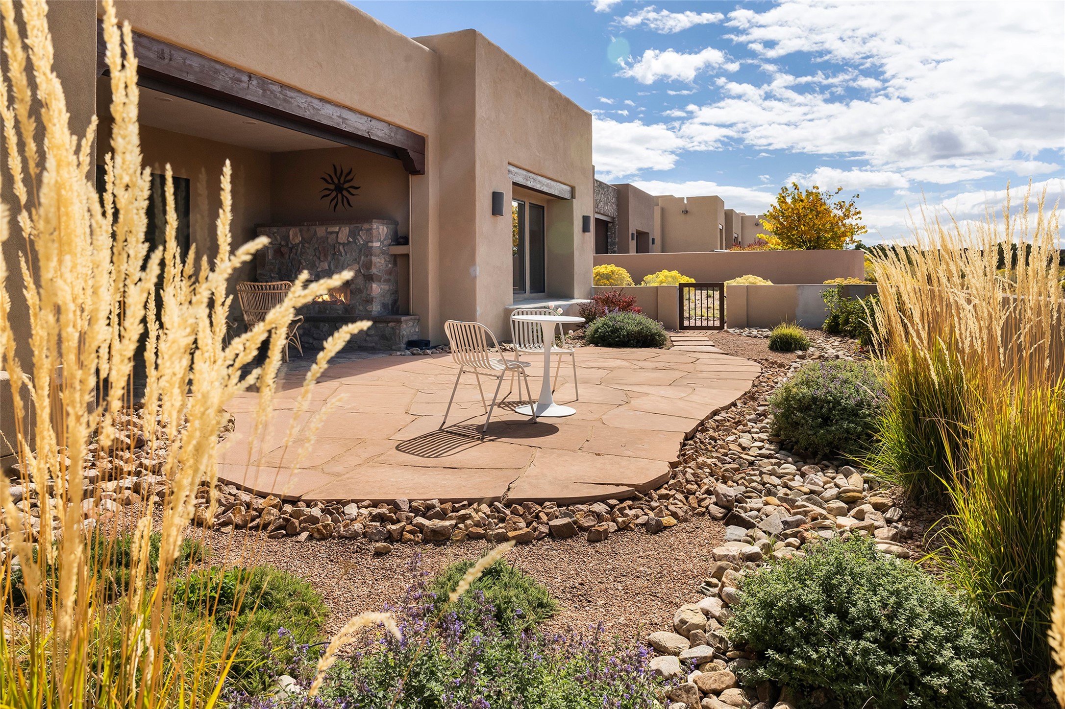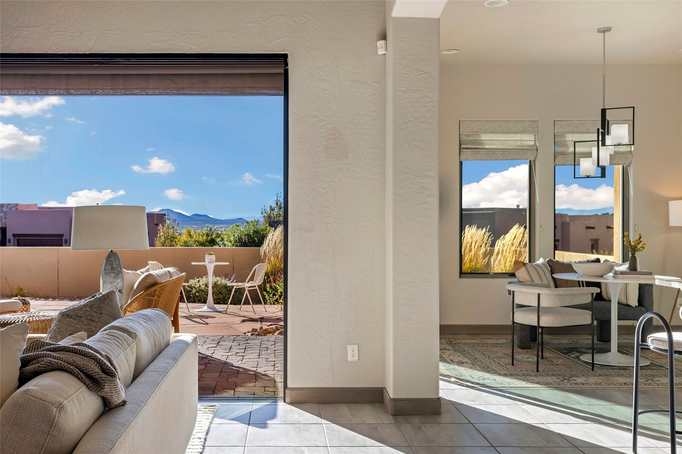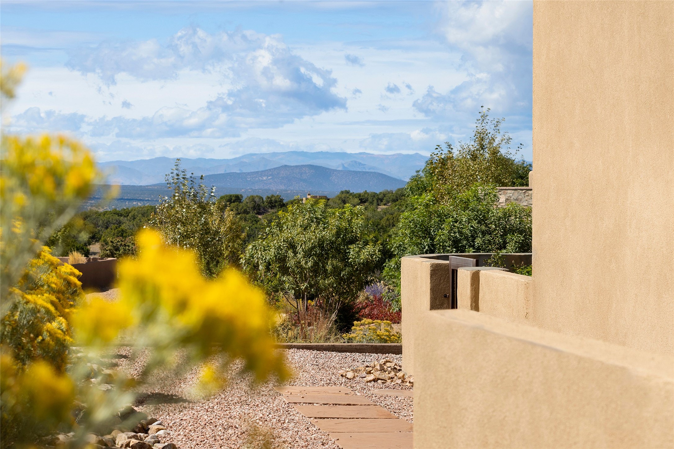 Live the Ultimate Las Campanas Lifestyle. Beautifully sited on a premier elevated corner lot, this exceptional 4-bedroom residence captures breathtaking Jemez Mountain and dramatic sunset views. Located within walking distance of The Club at Las Campanas, this home perfectly blends sophisticated modern design with the timeless essence of Santa Fe. The thoughtfully designed floor plan impresses from the moment you enter, featuring a spectacular living room ideal for both relaxed living and grand entertaining. Western views frame the space, while a modern gas fireplace with stone surround and mantle, and retractable glass doors, create a seamless indoor-outdoor living experience. The chef's island kitchen delights with a generous natural stone breakfast bar, modern appliances, and a large walk-in pantry. This culinary haven flows effortlessly into both a gracious formal dining room and a casual dining area--each with mountain views, designer lighting, and portal access for al fresco dining. The private, luxurious primary suite offers Jemez Mountain views, a cozy sitting area, and a spa-inspired bath with a spacious walk-in shower, dual vanities, and an expansive walk-in closet. Separate from the main living areas, the light-filled office (or 4th bedroom) with glass French doors provides the perfect work-from-home retreat. Two additional guest suites, each with ensuite baths, share a comfortable secondary living area or media room. The outdoor living experience is elevated with vast entertaining areas, a covered portal, an outdoor fireplace, and tranquil landscaping that enhances the home's serene ambiance. With its quality finishes, soft natural light, welcoming gated front entrance courtyard, newly installed carpet and a neutral palette throughout, this special Las Campanas home defines refined living and represents an exceptional value--move-in ready and not to be missed. The owner's Equity Golf Membership to The Club at Las Campanas is available for purchase.
