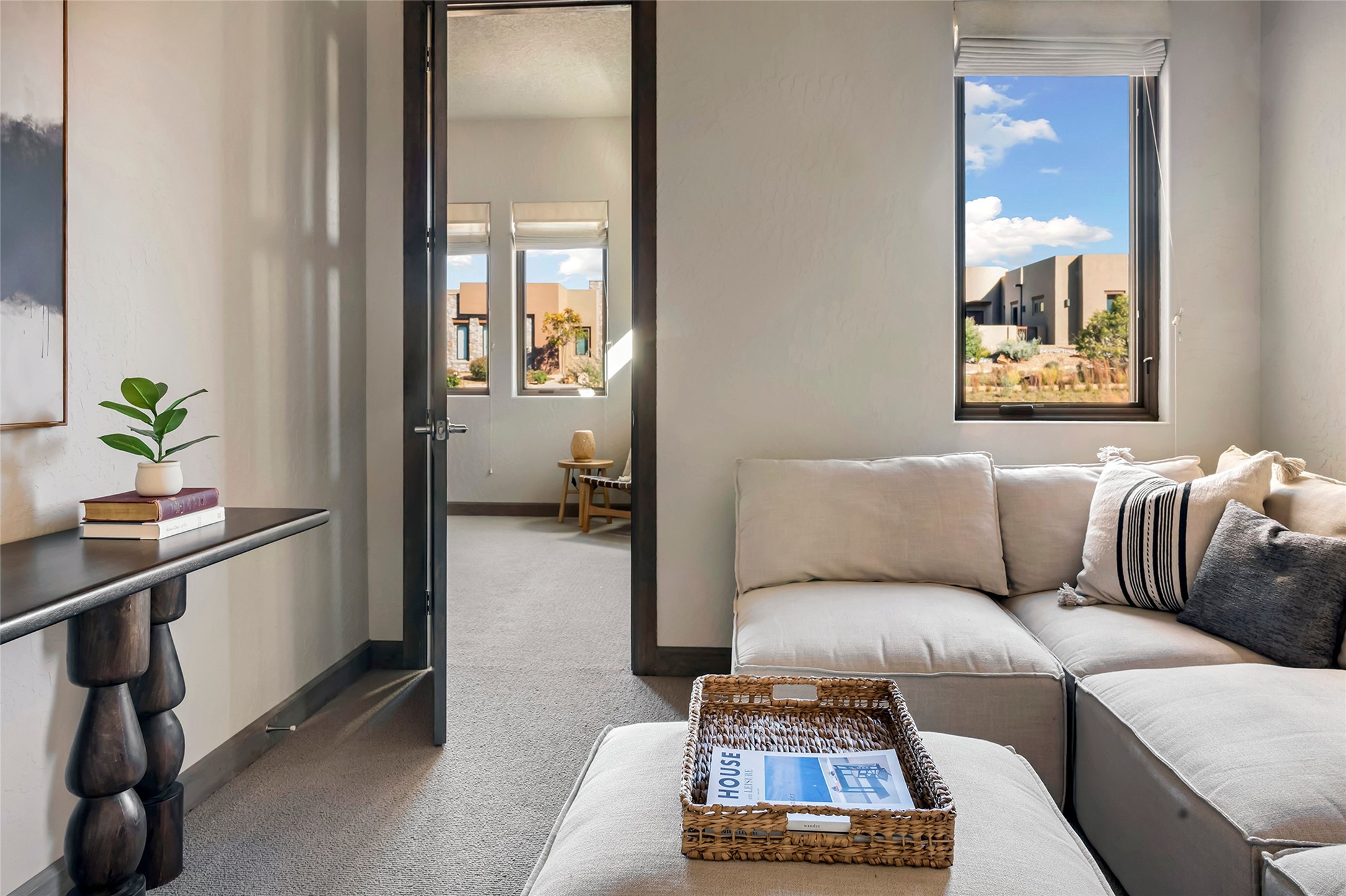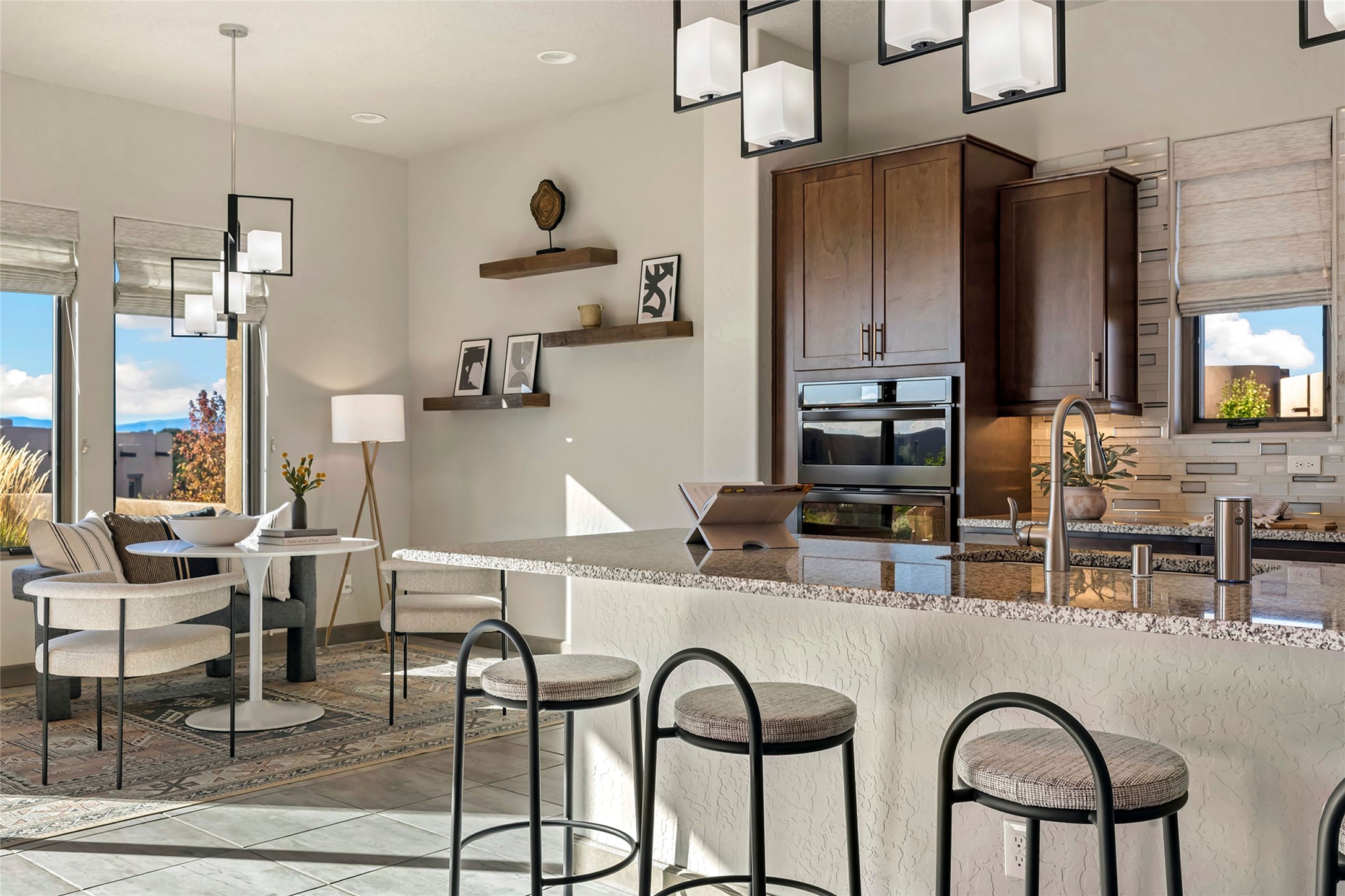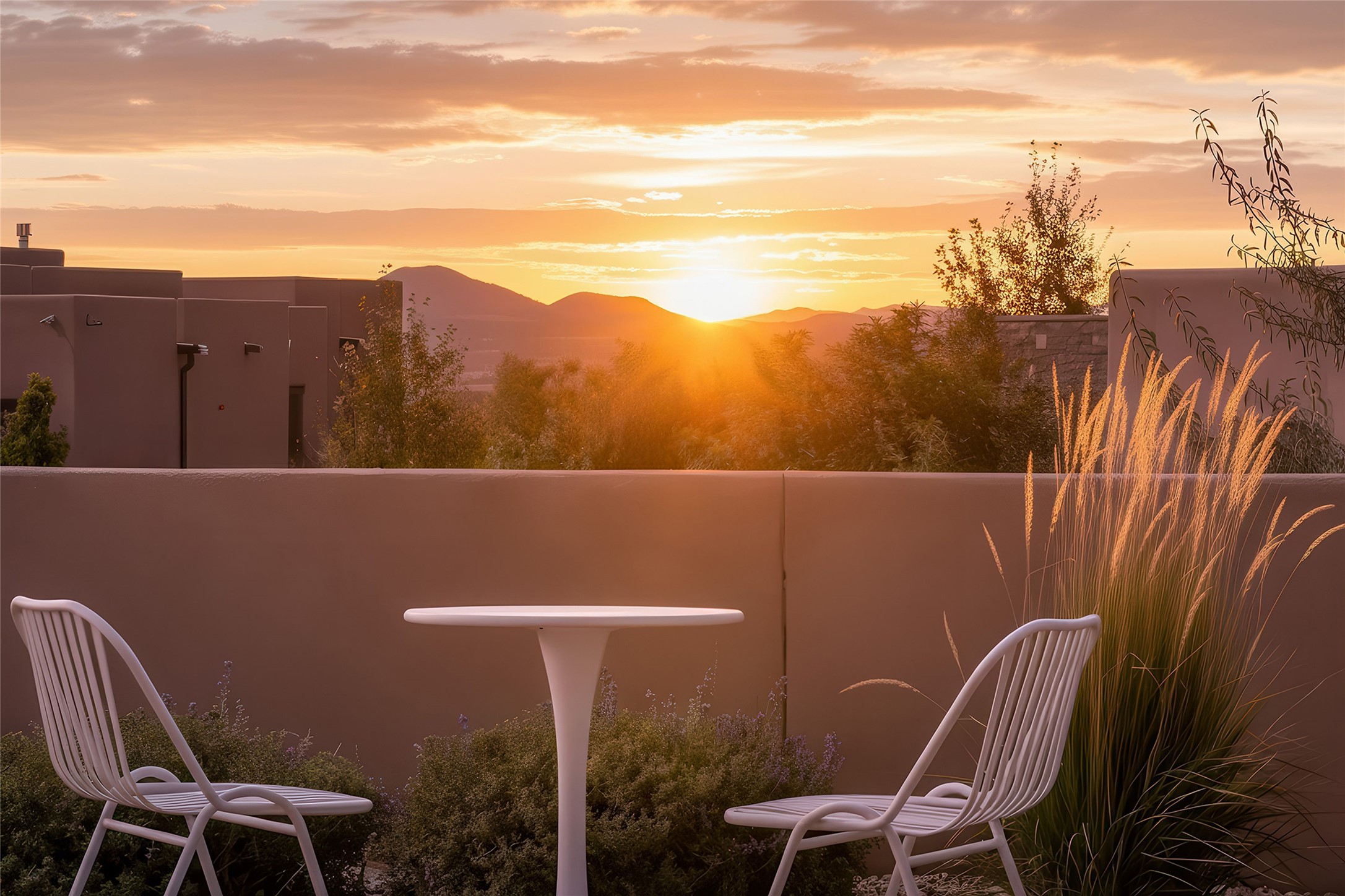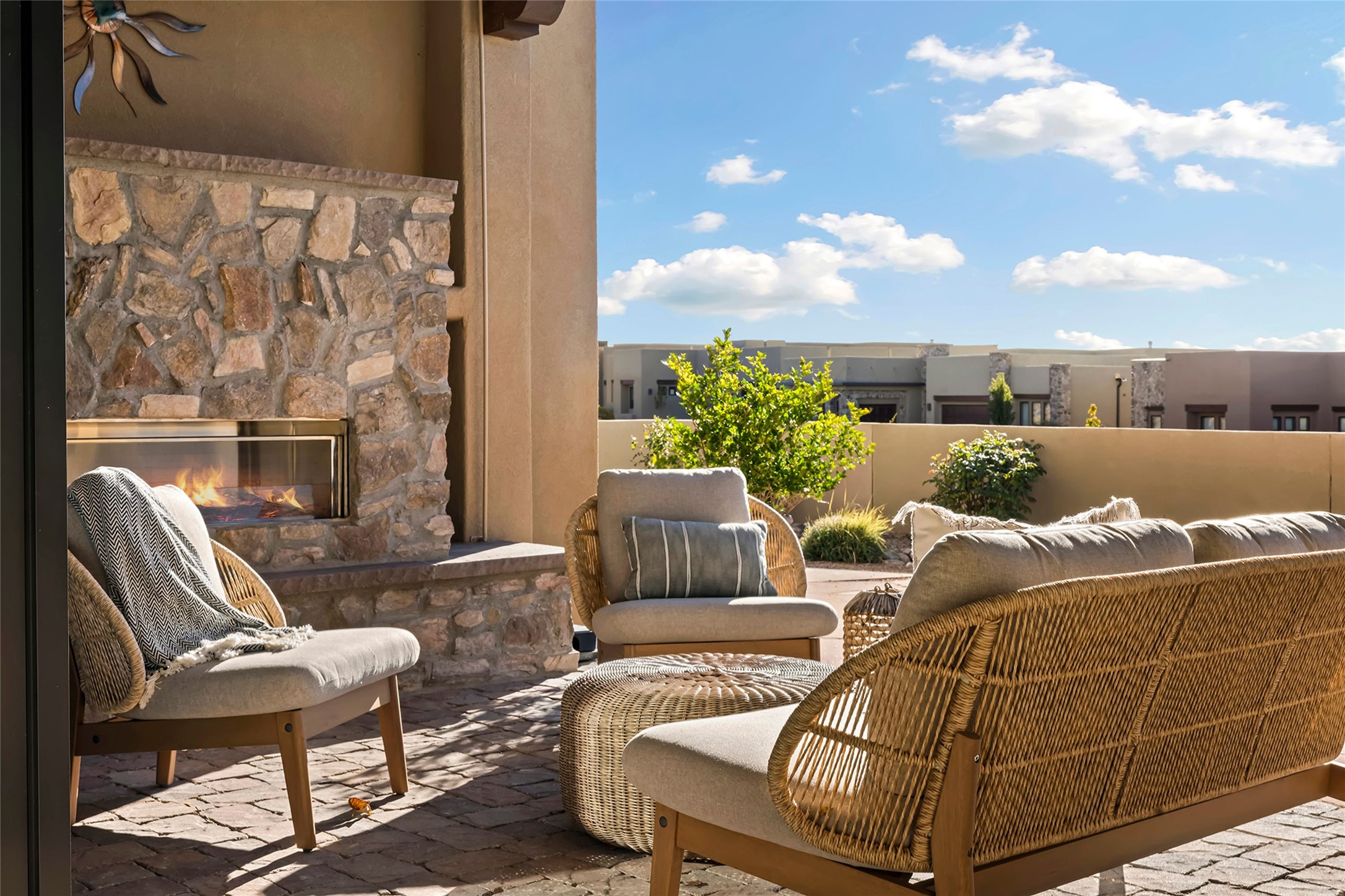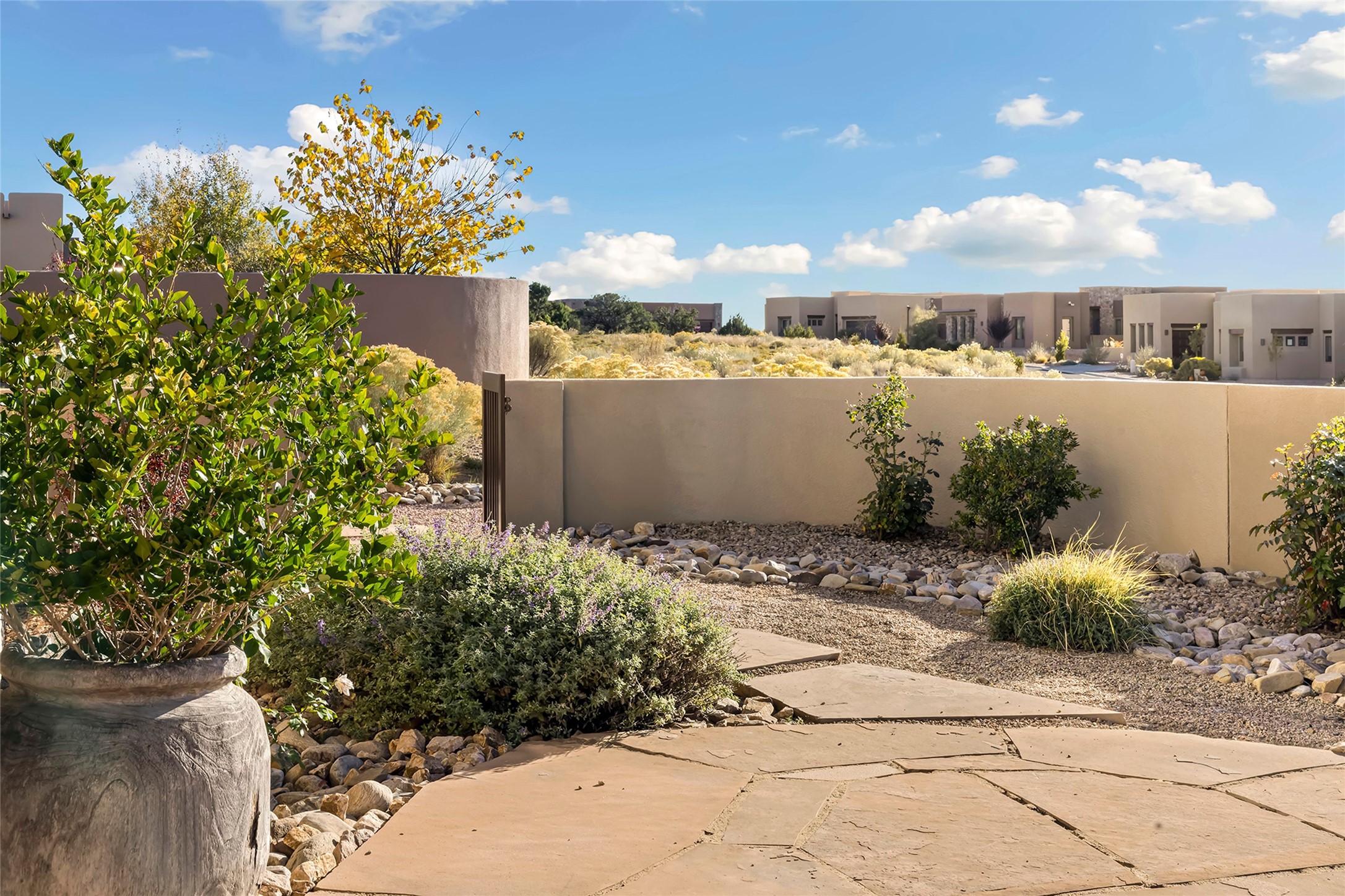 Live the Ultimate Las Campanas Lifestyle. Beautifully sited on a premier elevated corner lot, this exceptional 4-bedroom residence captures breathtaking Jemez Mountain and dramatic sunset views. Located within walking distance of The Club at Las Campanas, this home perfectly blends sophisticated modern design with the timeless essence of Santa Fe. The thoughtfully designed floor plan impresses from the moment you enter, featuring a spectacular living room ideal for both relaxed living and grand entertaining. Western views frame the space, while a modern gas fireplace with stone surround and mantle, and retractable glass doors, create a seamless indoor-outdoor living experience. The chef's island kitchen delights with a generous natural stone breakfast bar, modern appliances, and a large walk-in pantry. This culinary haven flows effortlessly into both a gracious formal dining room and a casual dining area--each with mountain views, designer lighting, and portal access for al fresco dining. The private, luxurious primary suite offers Jemez Mountain views, a cozy sitting area, and a spa-inspired bath with a spacious walk-in shower, dual vanities, and an expansive walk-in closet. Separate from the main living areas, the light-filled office (or 4th bedroom) with glass French doors provides the perfect work-from-home retreat. Two additional guest suites, each with ensuite baths, share a comfortable secondary living area or media room. The outdoor living experience is elevated with vast entertaining areas, a covered portal, an outdoor fireplace, and tranquil landscaping that enhances the home's serene ambiance. With its quality finishes, soft natural light, welcoming gated front entrance courtyard, newly installed carpet and a neutral palette throughout, this special Las Campanas home defines refined living and represents an exceptional value--move-in ready and not to be missed. The owner's Equity Golf Membership to The Club at Las Campanas is available for purchase.