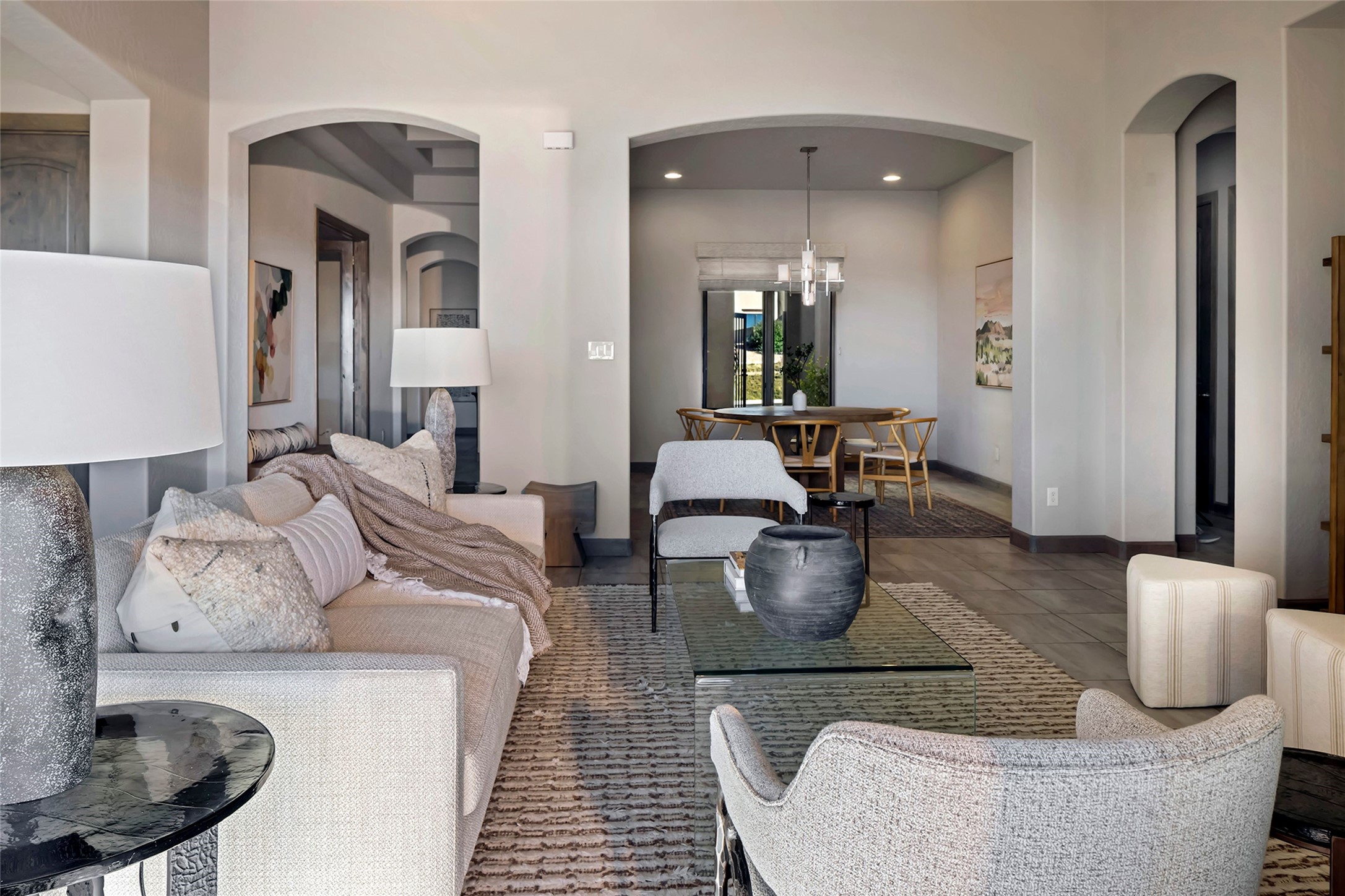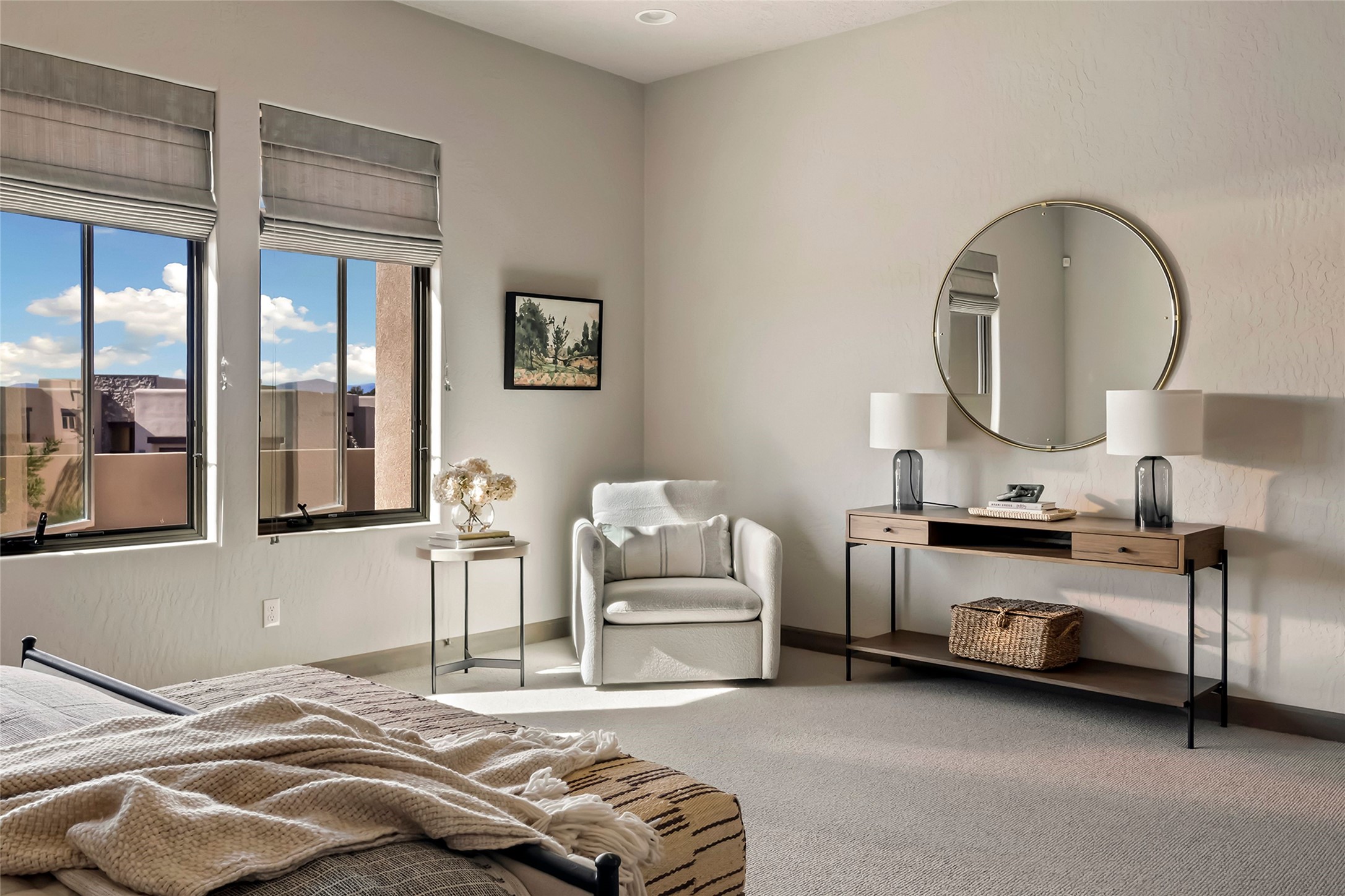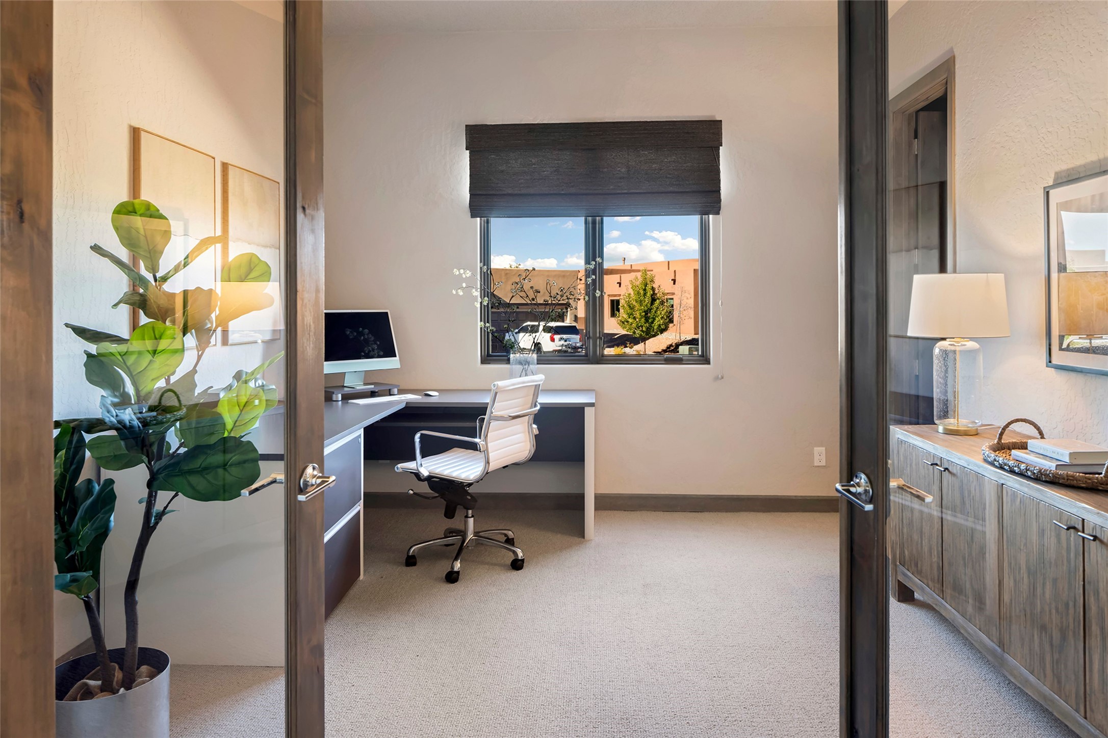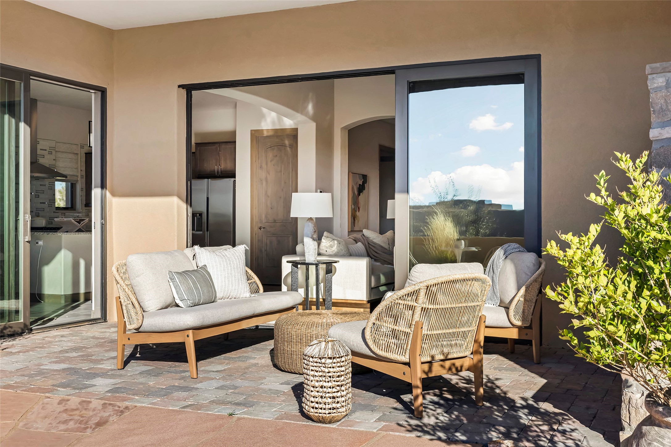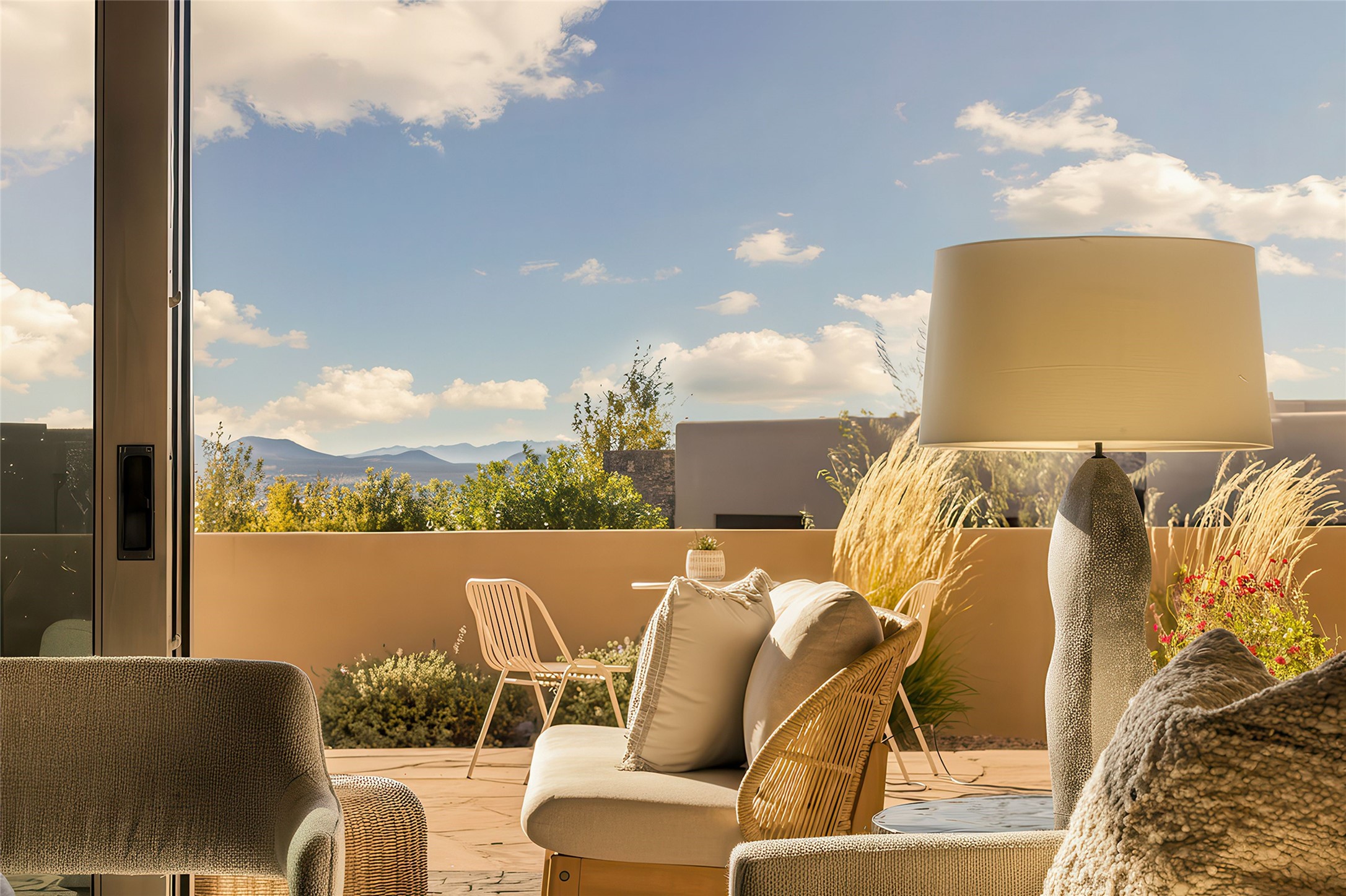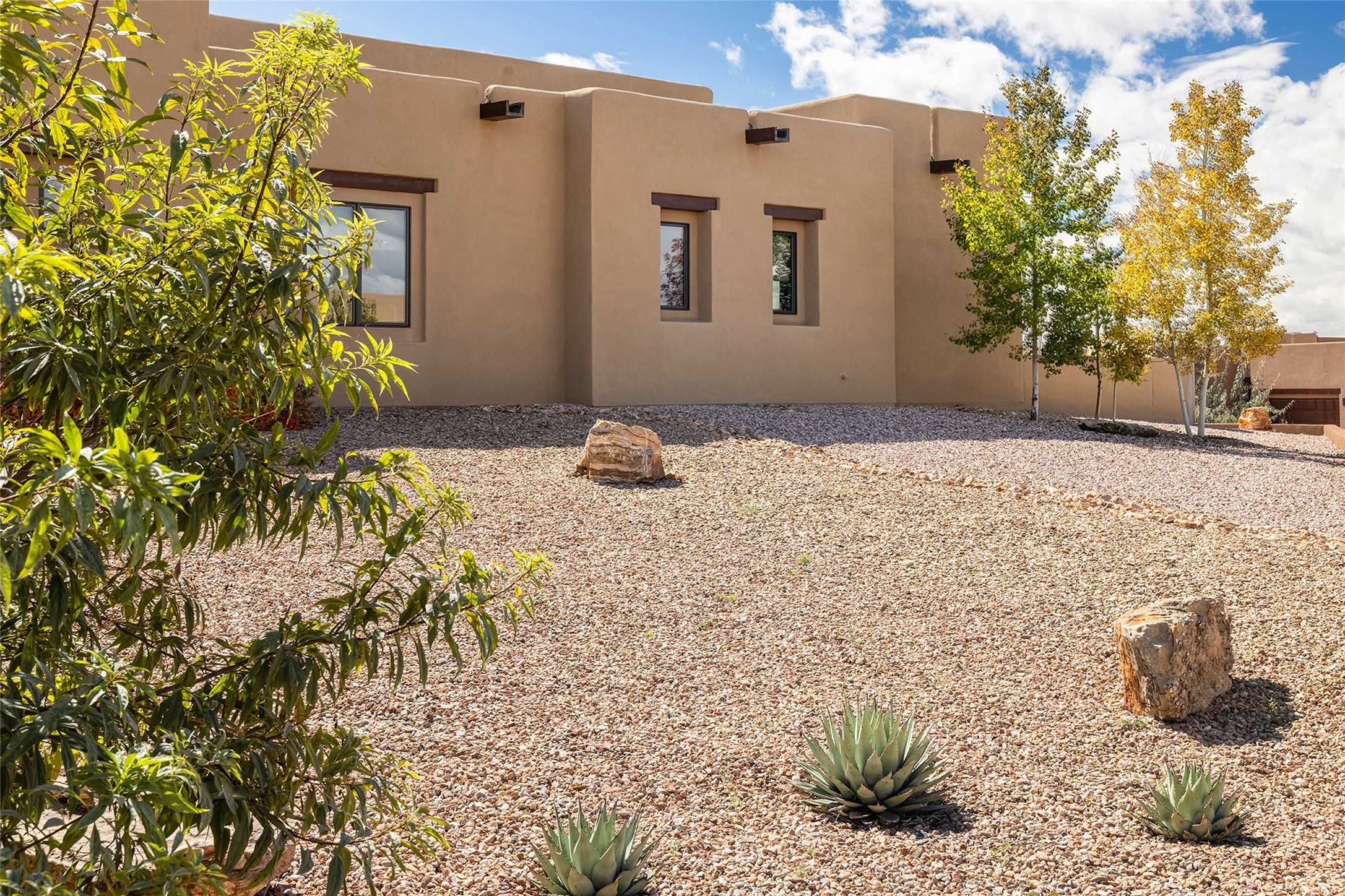 Live the Ultimate Las Campanas Lifestyle. Beautifully sited on a premier elevated corner lot, this exceptional 4-bedroom residence captures breathtaking Jemez Mountain and dramatic sunset views. Located within walking distance of The Club at Las Campanas, this home perfectly blends sophisticated modern design with the timeless essence of Santa Fe. The thoughtfully designed floor plan impresses from the moment you enter, featuring a spectacular living room ideal for both relaxed living and grand entertaining. Western views frame the space, while a modern gas fireplace with stone surround and mantle, and retractable glass doors, create a seamless indoor-outdoor living experience. The chef's island kitchen delights with a generous natural stone breakfast bar, modern appliances, and a large walk-in pantry. This culinary haven flows effortlessly into both a gracious formal dining room and a casual dining area--each with mountain views, designer lighting, and portal access for al fresco dining. The private, luxurious primary suite offers Jemez Mountain views, a cozy sitting area, and a spa-inspired bath with a spacious walk-in shower, dual vanities, and an expansive walk-in closet. Separate from the main living areas, the light-filled office (or 4th bedroom) with glass French doors provides the perfect work-from-home retreat. Two additional guest suites, each with ensuite baths, share a comfortable secondary living area or media room. The outdoor living experience is elevated with vast entertaining areas, a covered portal, an outdoor fireplace, and tranquil landscaping that enhances the home's serene ambiance. With its quality finishes, soft natural light, welcoming gated front entrance courtyard, newly installed carpet and a neutral palette throughout, this special Las Campanas home defines refined living and represents an exceptional value--move-in ready and not to be missed. The owner's Equity Golf Membership to The Club at Las Campanas is available for purchase.