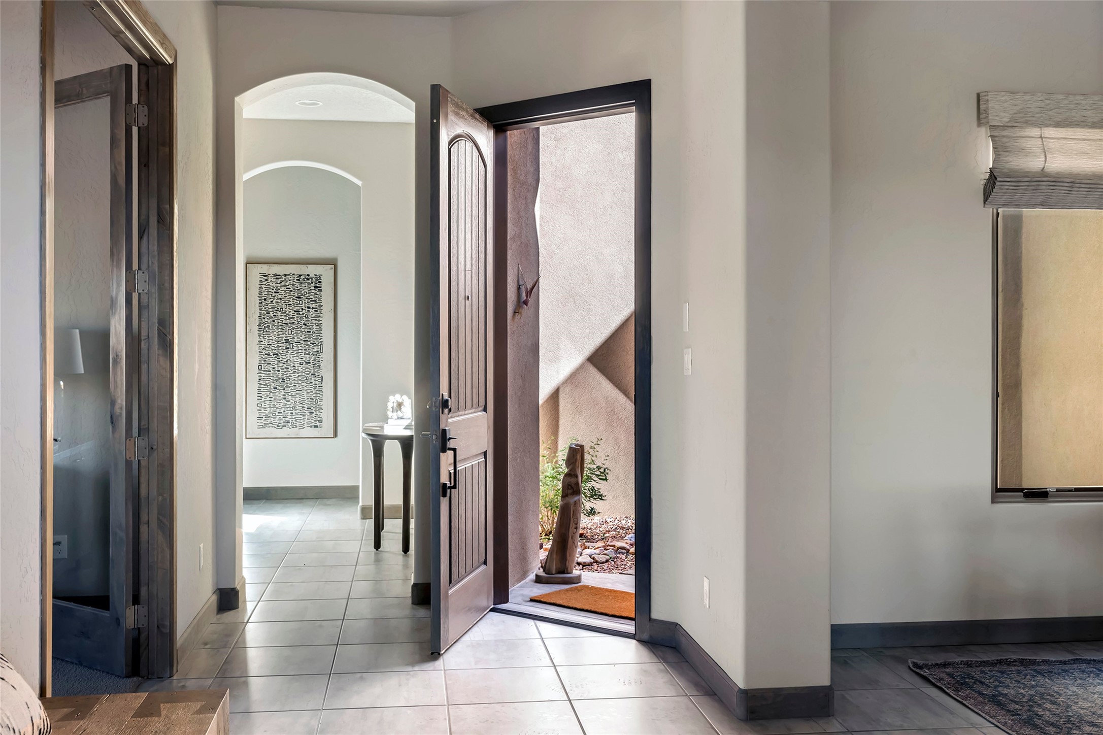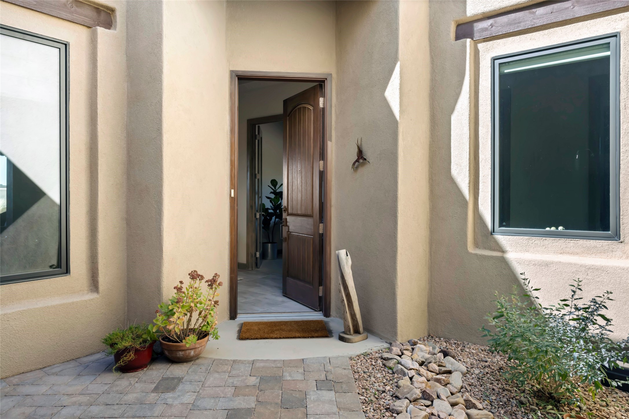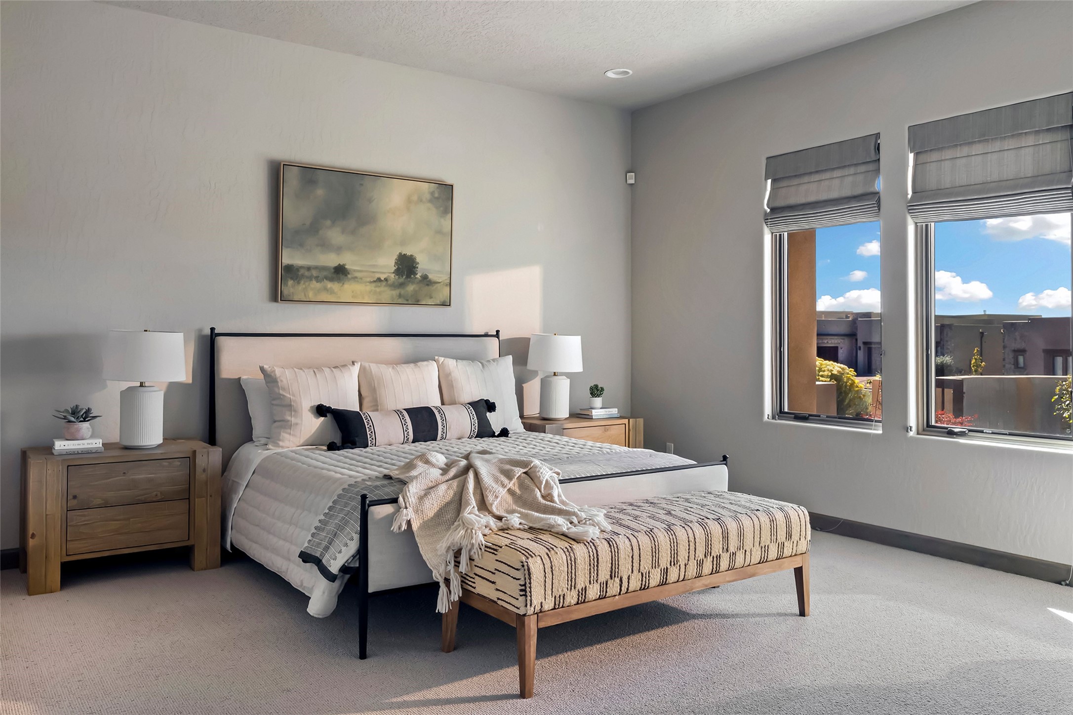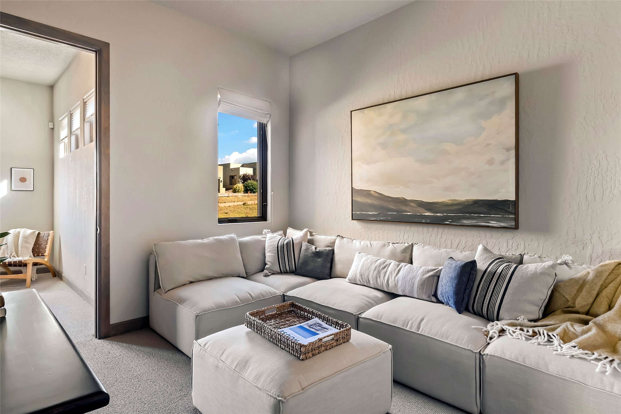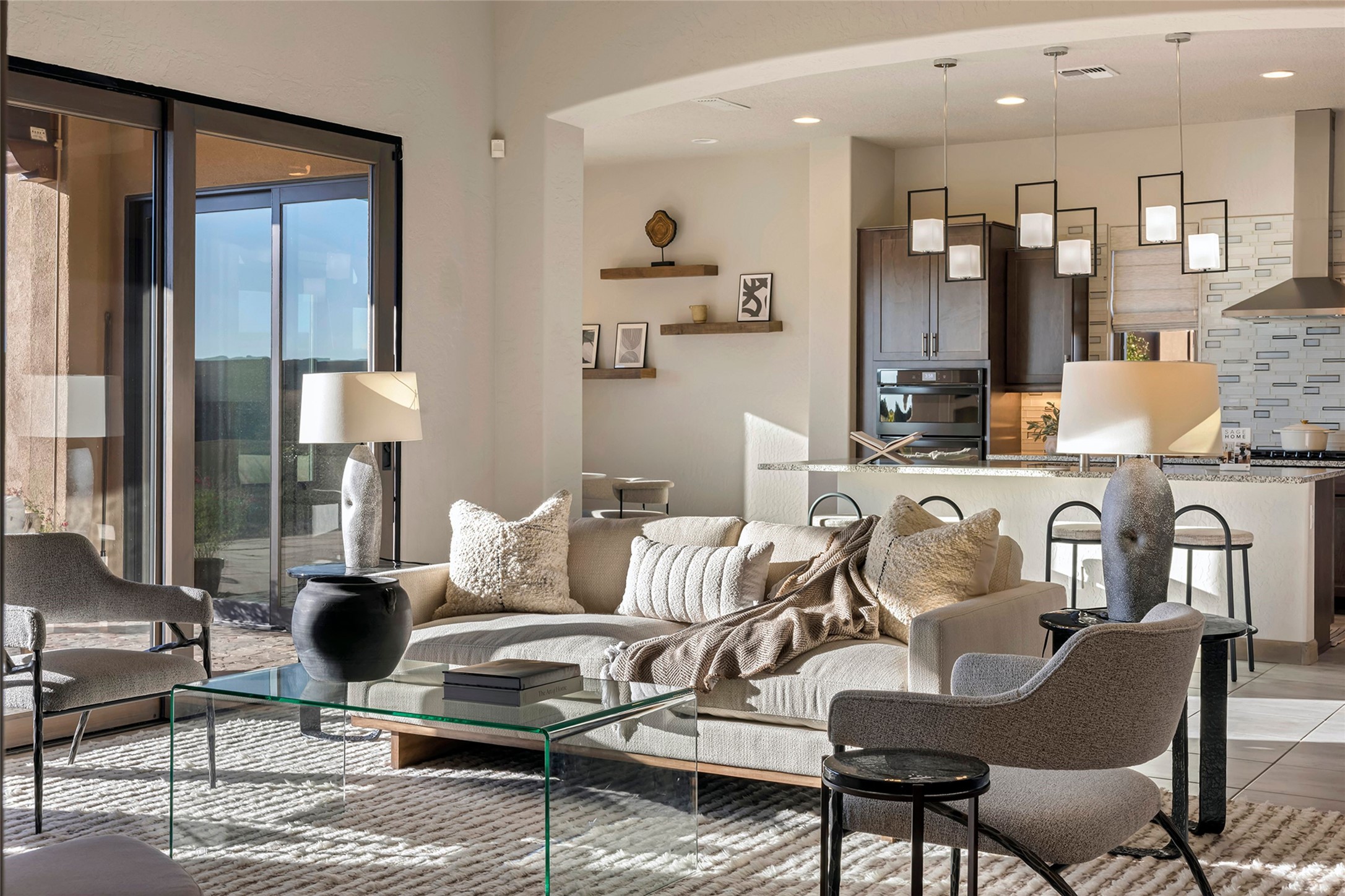 Live the Ultimate Las Campanas Lifestyle. Beautifully sited on a premier elevated corner lot, this exceptional 4-bedroom residence captures breathtaking Jemez Mountain and dramatic sunset views. Located within walking distance of The Club at Las Campanas, this home perfectly blends sophisticated modern design with the timeless essence of Santa Fe. The thoughtfully designed floor plan impresses from the moment you enter, featuring a spectacular living room ideal for both relaxed living and grand entertaining. Western views frame the space, while a modern gas fireplace with stone surround and mantle, and retractable glass doors, create a seamless indoor-outdoor living experience. The chef's island kitchen delights with a generous natural stone breakfast bar, modern appliances, and a large walk-in pantry. This culinary haven flows effortlessly into both a gracious formal dining room and a casual dining area--each with mountain views, designer lighting, and portal access for al fresco dining. The private, luxurious primary suite offers Jemez Mountain views, a cozy sitting area, and a spa-inspired bath with a spacious walk-in shower, dual vanities, and an expansive walk-in closet. Separate from the main living areas, the light-filled office (or 4th bedroom) with glass French doors provides the perfect work-from-home retreat. Two additional guest suites, each with ensuite baths, share a comfortable secondary living area or media room. The outdoor living experience is elevated with vast entertaining areas, a covered portal, an outdoor fireplace, and tranquil landscaping that enhances the home's serene ambiance. With its quality finishes, soft natural light, welcoming gated front entrance courtyard, newly installed carpet and a neutral palette throughout, this special Las Campanas home defines refined living and represents an exceptional value--move-in ready and not to be missed. The owner's Equity Golf Membership to The Club at Las Campanas is available for purchase.